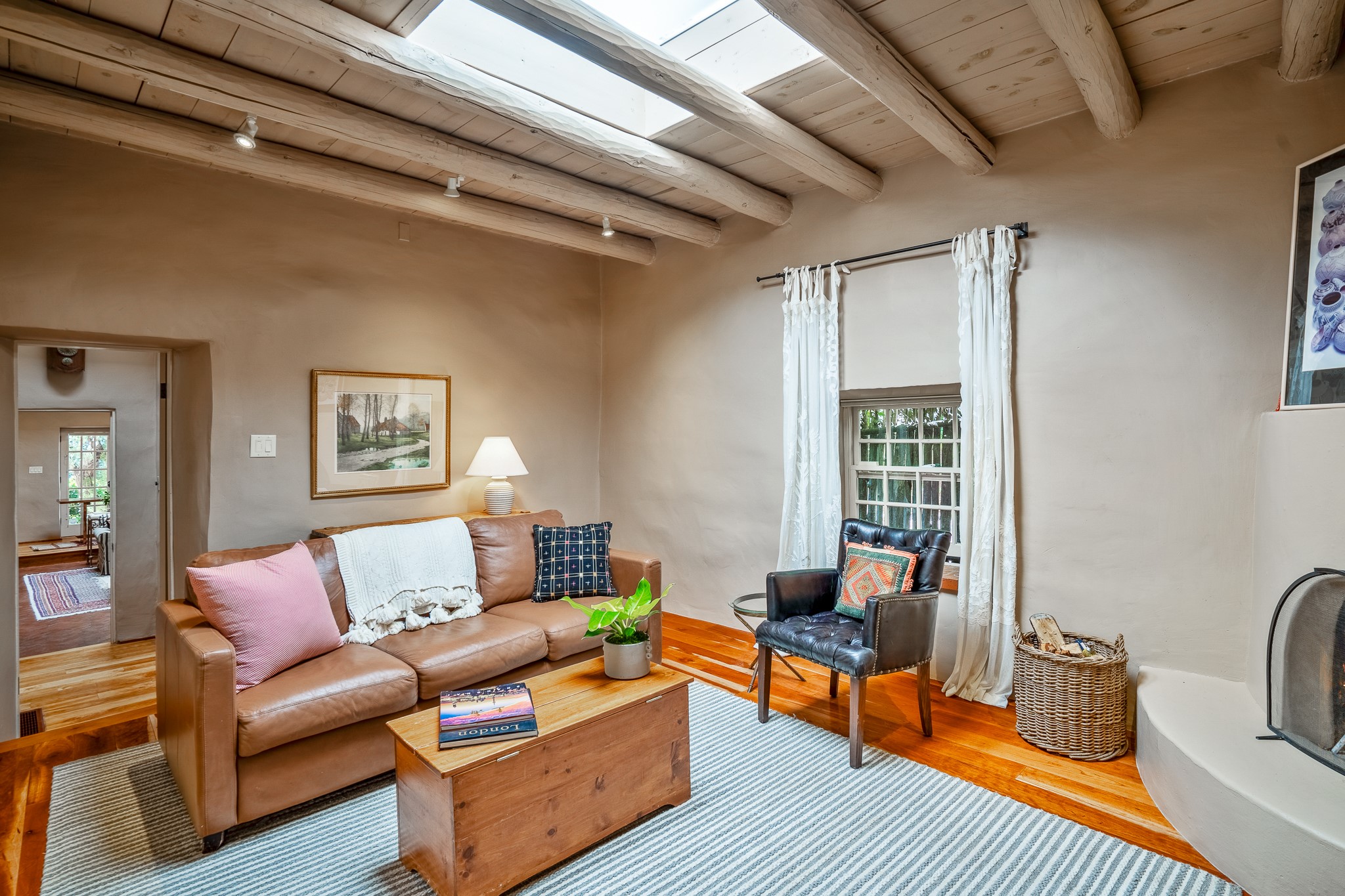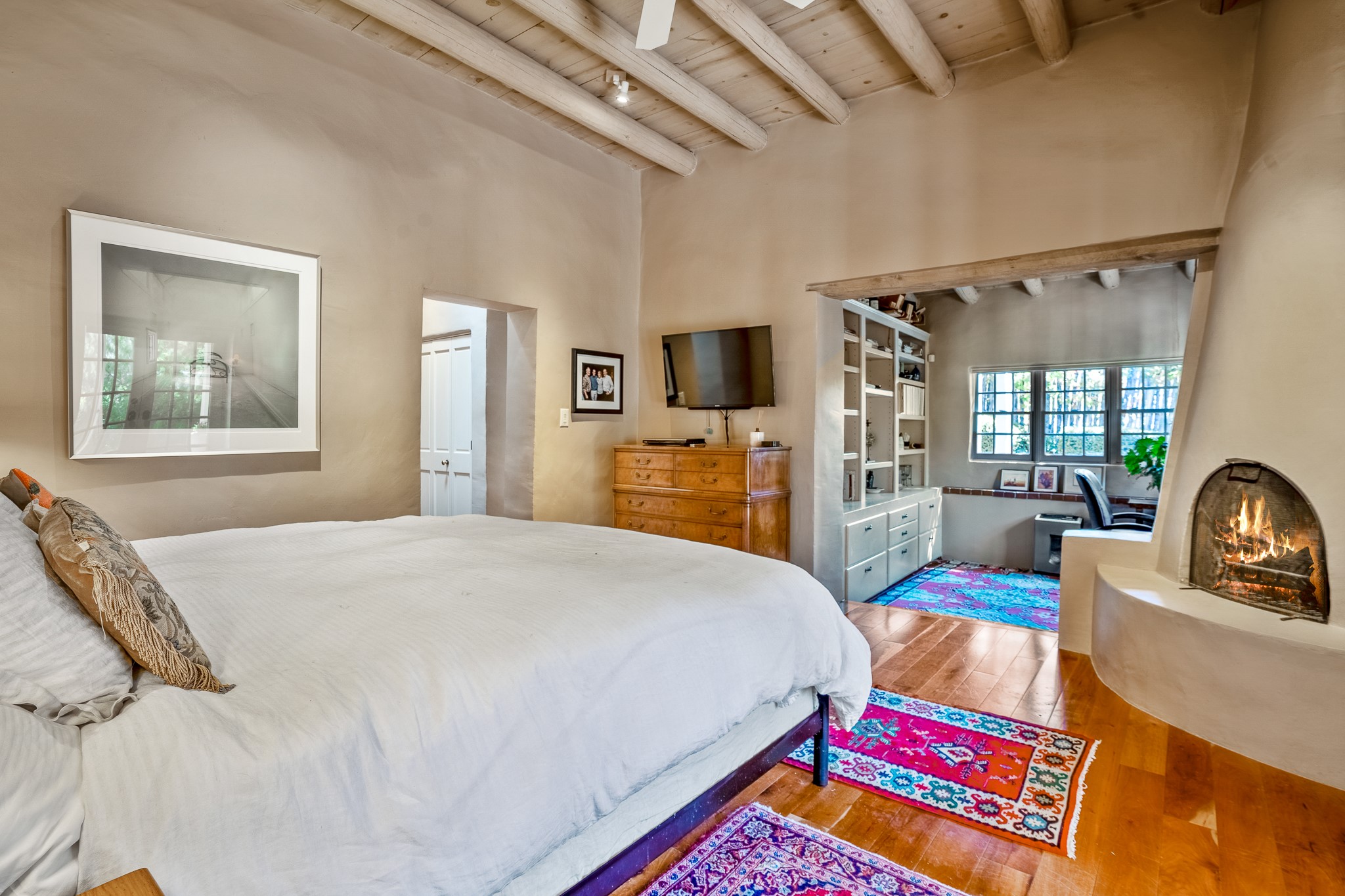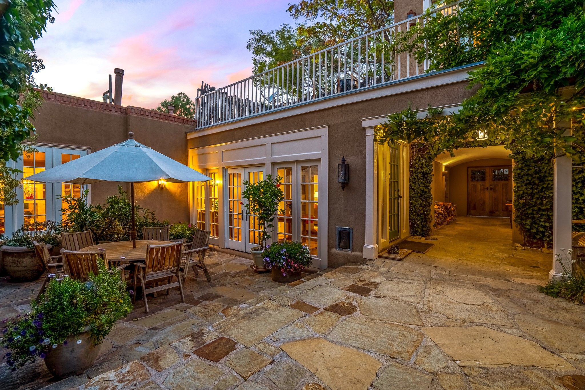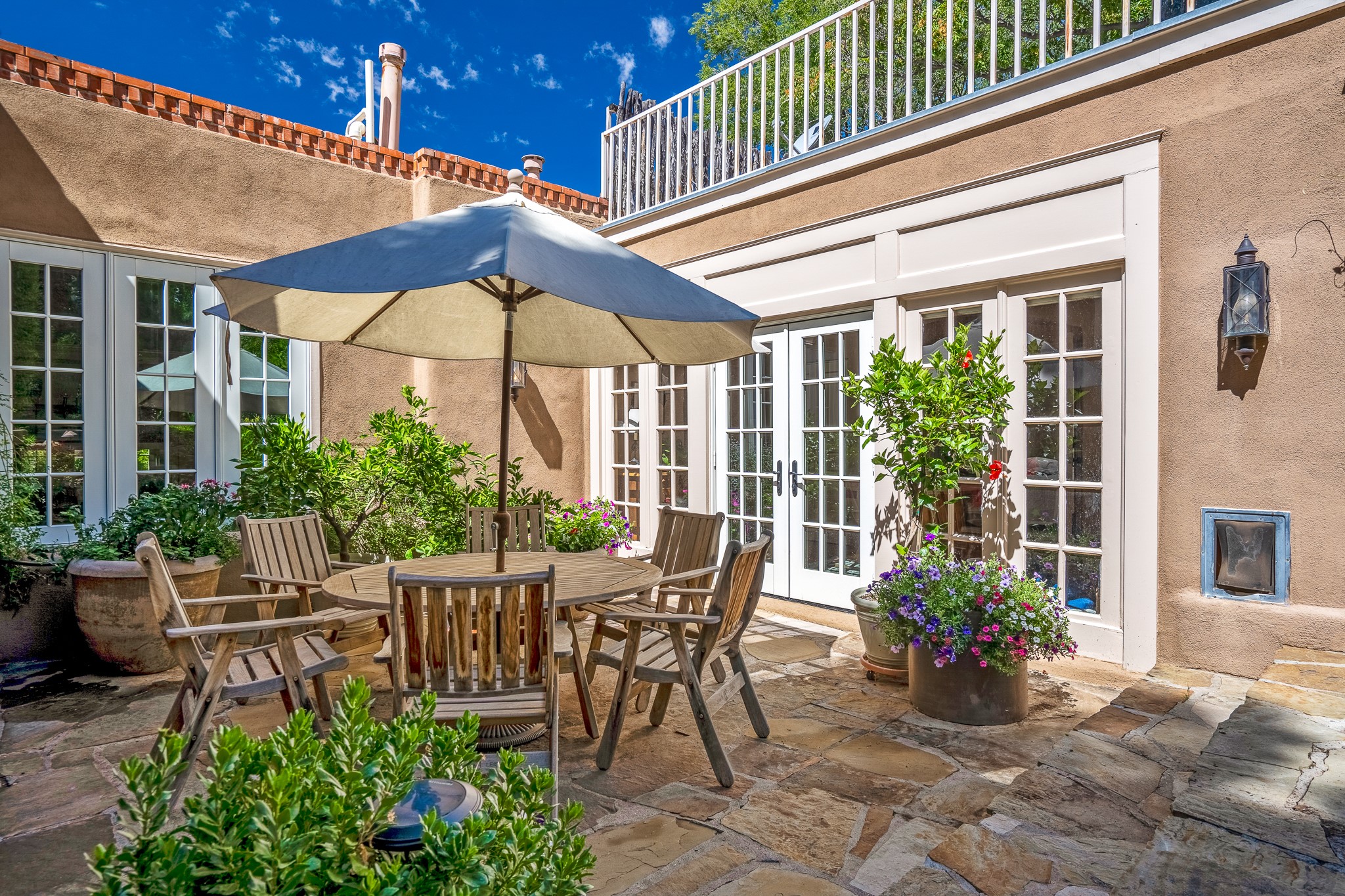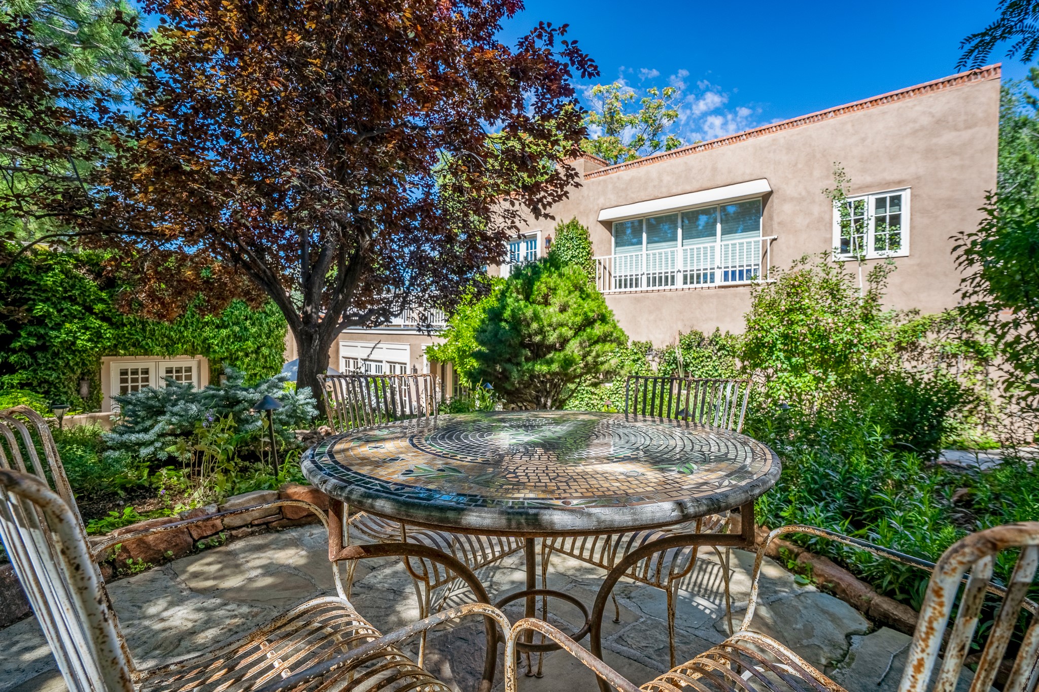 Welcome to the charming Eastside of Santa Fe, where history and beauty converge. Nestled within this enchanting neighborhood, we have an exquisite home that captures the essence of Santa Fe's rich heritage. This 4 bedroom, 4 bath residence boasts authentic Southwestern territorial architecture with traditional vigas and 5 fireplaces. With approximately 2,600 square feet of living space in the main home, there is ample room for comfortable living. The cozy living areas feature high, wood-beamed ceilings and skylights with french doors that open up onto private patios and courtyards, creating an open and airy feel. The kitchen has been tastefully updated with modern appliances while preserving its rustic charm. A private Casita with its own entrance has 1 bedroom and a 3 / 4 bathroom with a 2nd room that could serve as an office or studio. The kitchen opens up to a spacious living room with a large fireplace and grand windows that overlook the lush courtyard. There is a 2 car garage with two large walk-in closets for ample storage and a third room with laundry and a built-in dog wash tub. The outdoor spaces are a true private oasis, featuring multiple courtyards filled with vibrant landscaping and a serene fountain, perfect for relaxing or entertaining. You'll also find a covered portal, providing a shaded respite during sunny Santa Fe days. As you exit the private compound onto the quiet tree lined East Palace Avenue, walk a few blocks to the historic Santa Fe Plaza and immerse yourself in the city's vibrant culture, art galleries, and world-class dining. This is a rare opportunity to own a piece of Santa Fe's history in one of its most coveted neighborhoods. Don't miss your chance to experience the magic of this historic home. Contact us today for a private showing and step into the timeless beauty of Santa Fe's past.