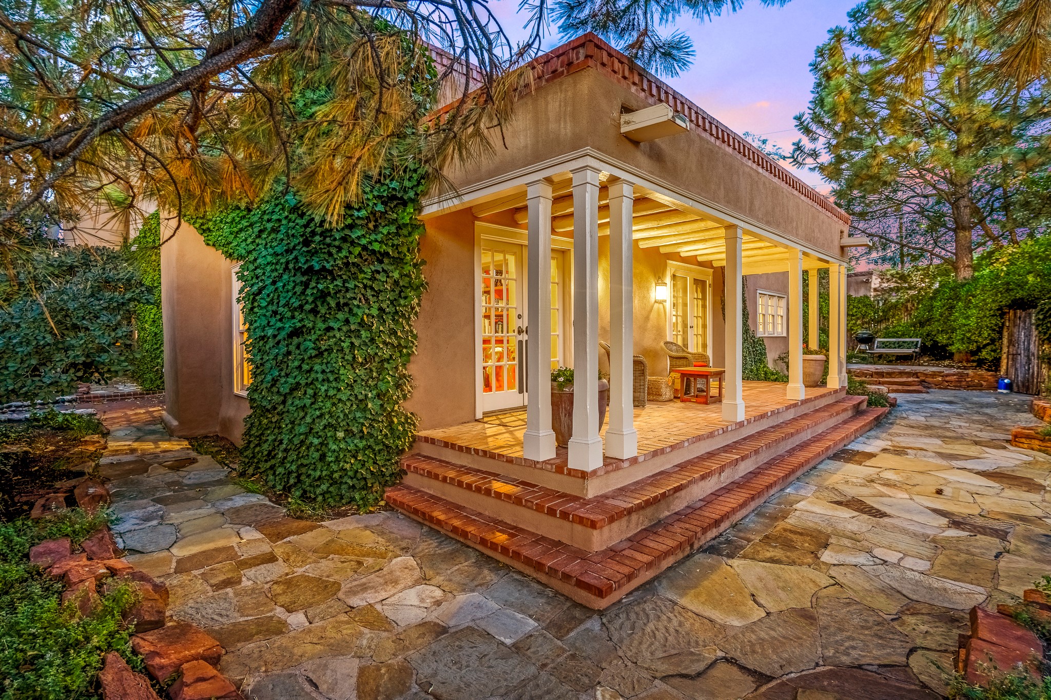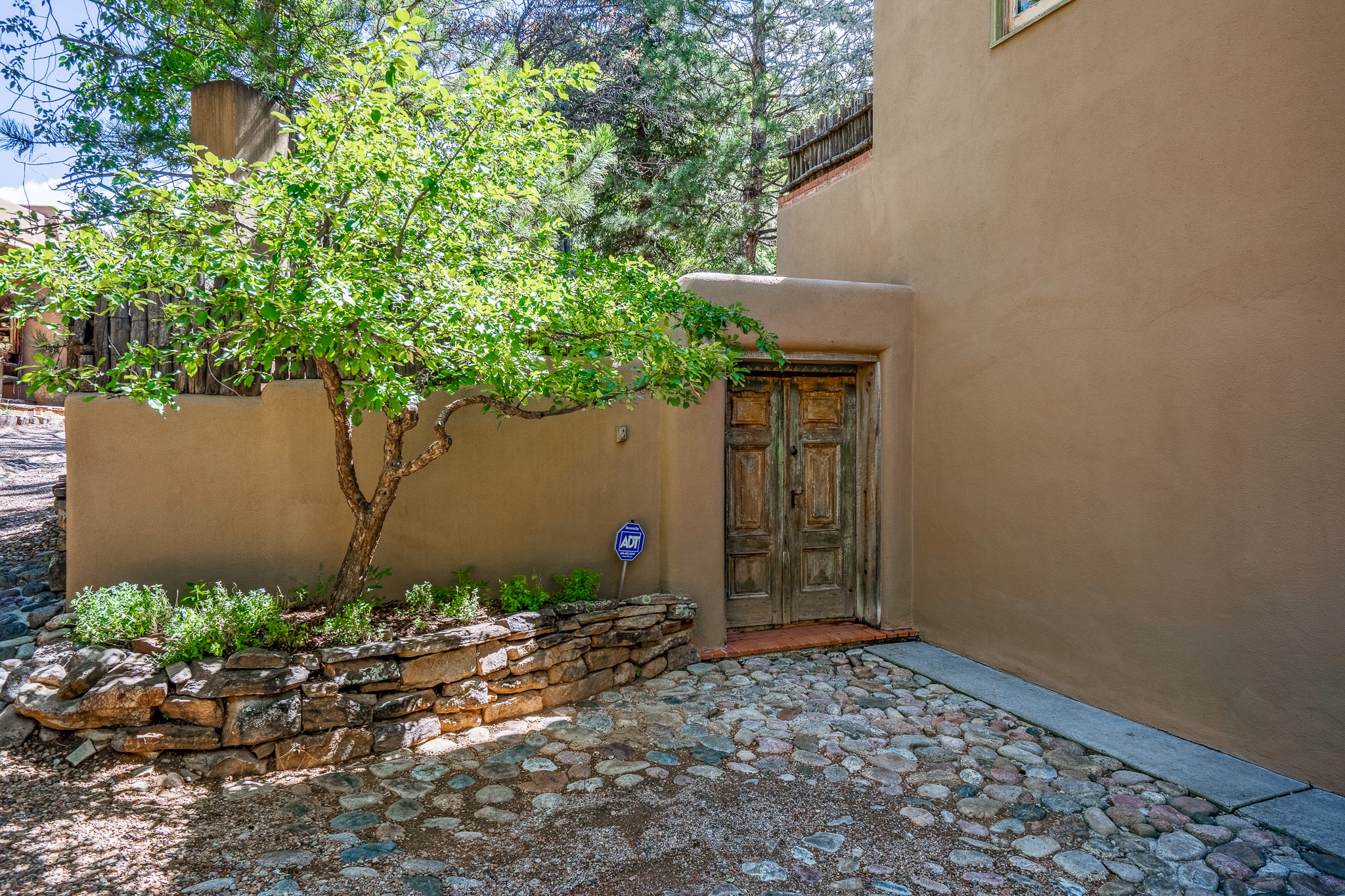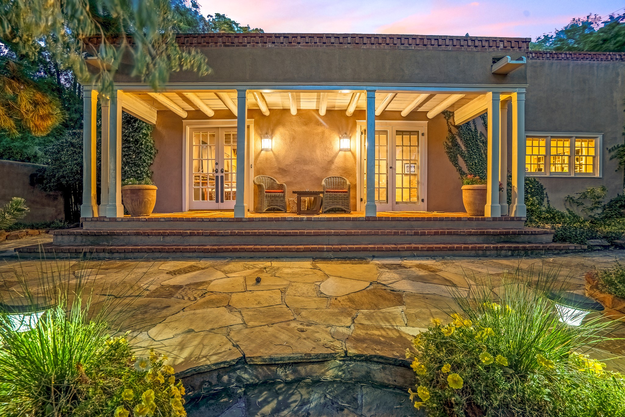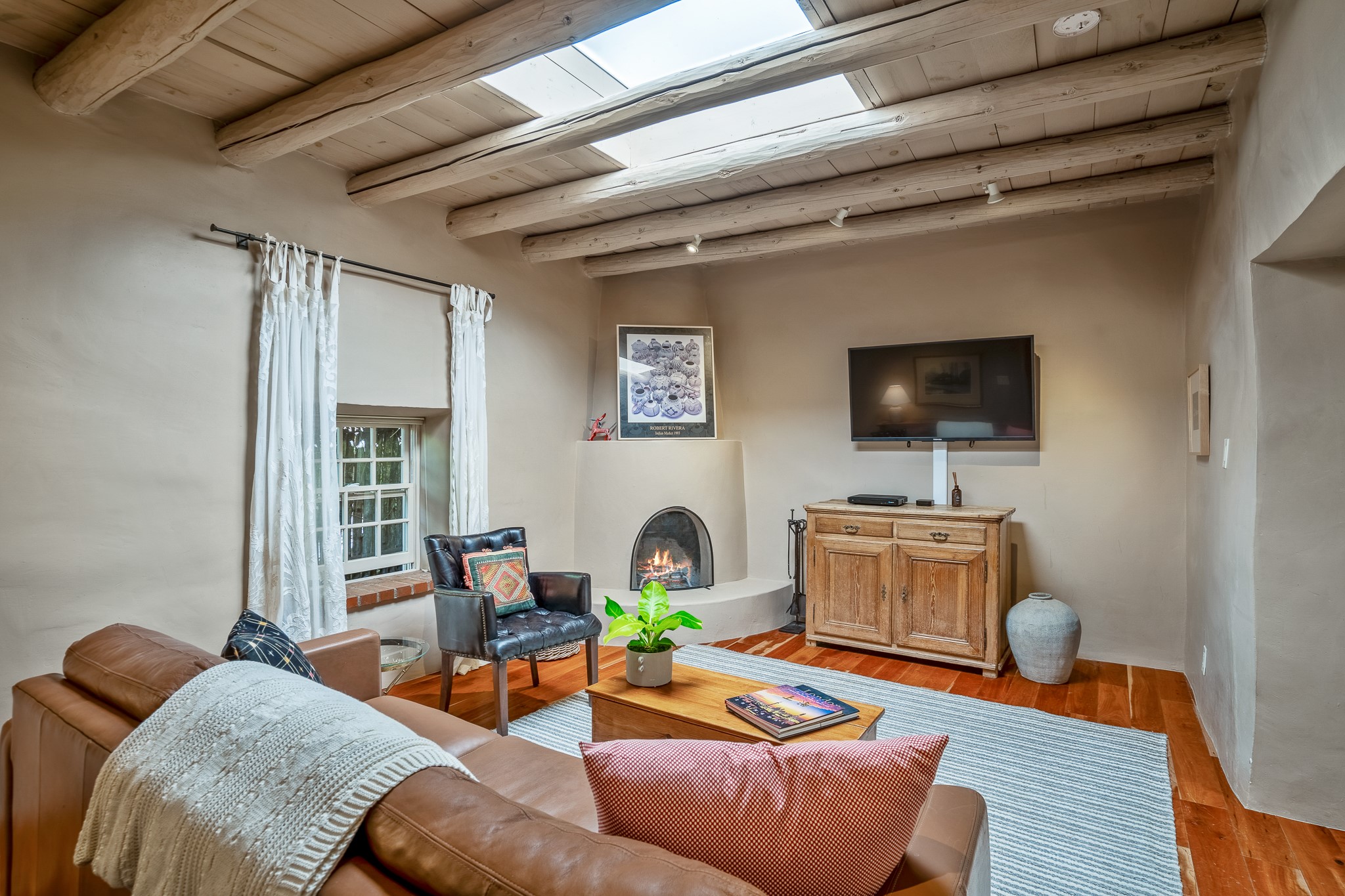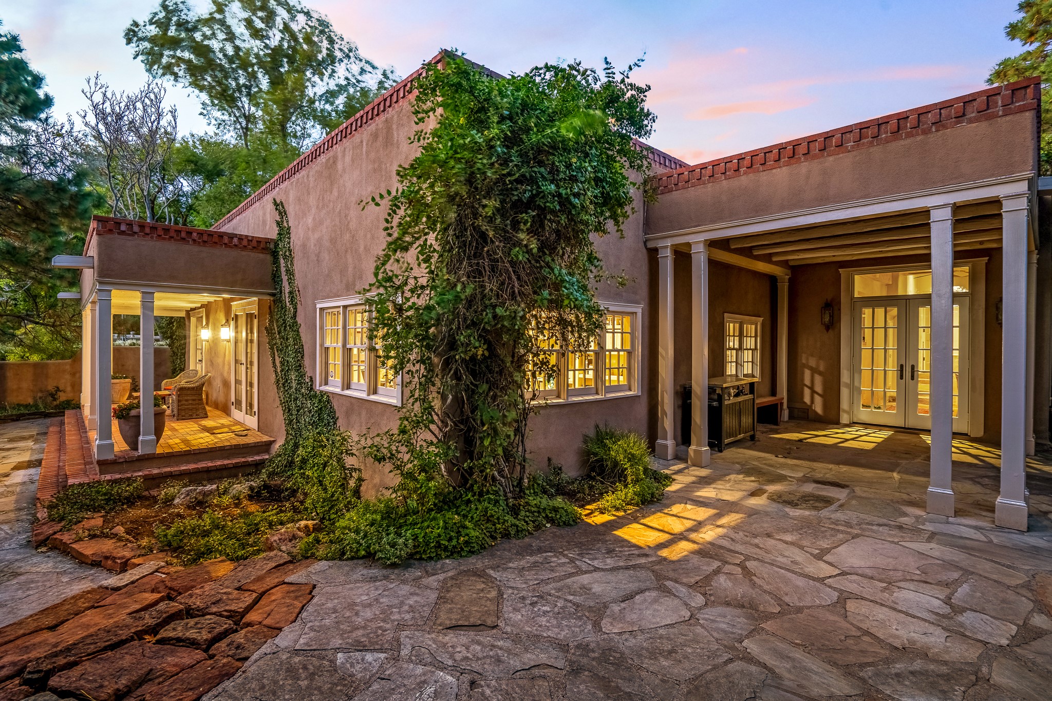 Welcome to the charming Eastside of Santa Fe, where history and beauty converge. Nestled within this enchanting neighborhood, we have an exquisite home that captures the essence of Santa Fe's rich heritage. This 4 bedroom, 4 bath residence boasts authentic Southwestern territorial architecture with traditional vigas and 5 fireplaces. With approximately 2,600 square feet of living space in the main home, there is ample room for comfortable living. The cozy living areas feature high, wood-beamed ceilings and skylights with french doors that open up onto private patios and courtyards, creating an open and airy feel. The kitchen has been tastefully updated with modern appliances while preserving its rustic charm. A private Casita with its own entrance has 1 bedroom and a 3 / 4 bathroom with a 2nd room that could serve as an office or studio. The kitchen opens up to a spacious living room with a large fireplace and grand windows that overlook the lush courtyard. There is a 2 car garage with two large walk-in closets for ample storage and a third room with laundry and a built-in dog wash tub. The outdoor spaces are a true private oasis, featuring multiple courtyards filled with vibrant landscaping and a serene fountain, perfect for relaxing or entertaining. You'll also find a covered portal, providing a shaded respite during sunny Santa Fe days. As you exit the private compound onto the quiet tree lined East Palace Avenue, walk a few blocks to the historic Santa Fe Plaza and immerse yourself in the city's vibrant culture, art galleries, and world-class dining. This is a rare opportunity to own a piece of Santa Fe's history in one of its most coveted neighborhoods. Don't miss your chance to experience the magic of this historic home. Contact us today for a private showing and step into the timeless beauty of Santa Fe's past.