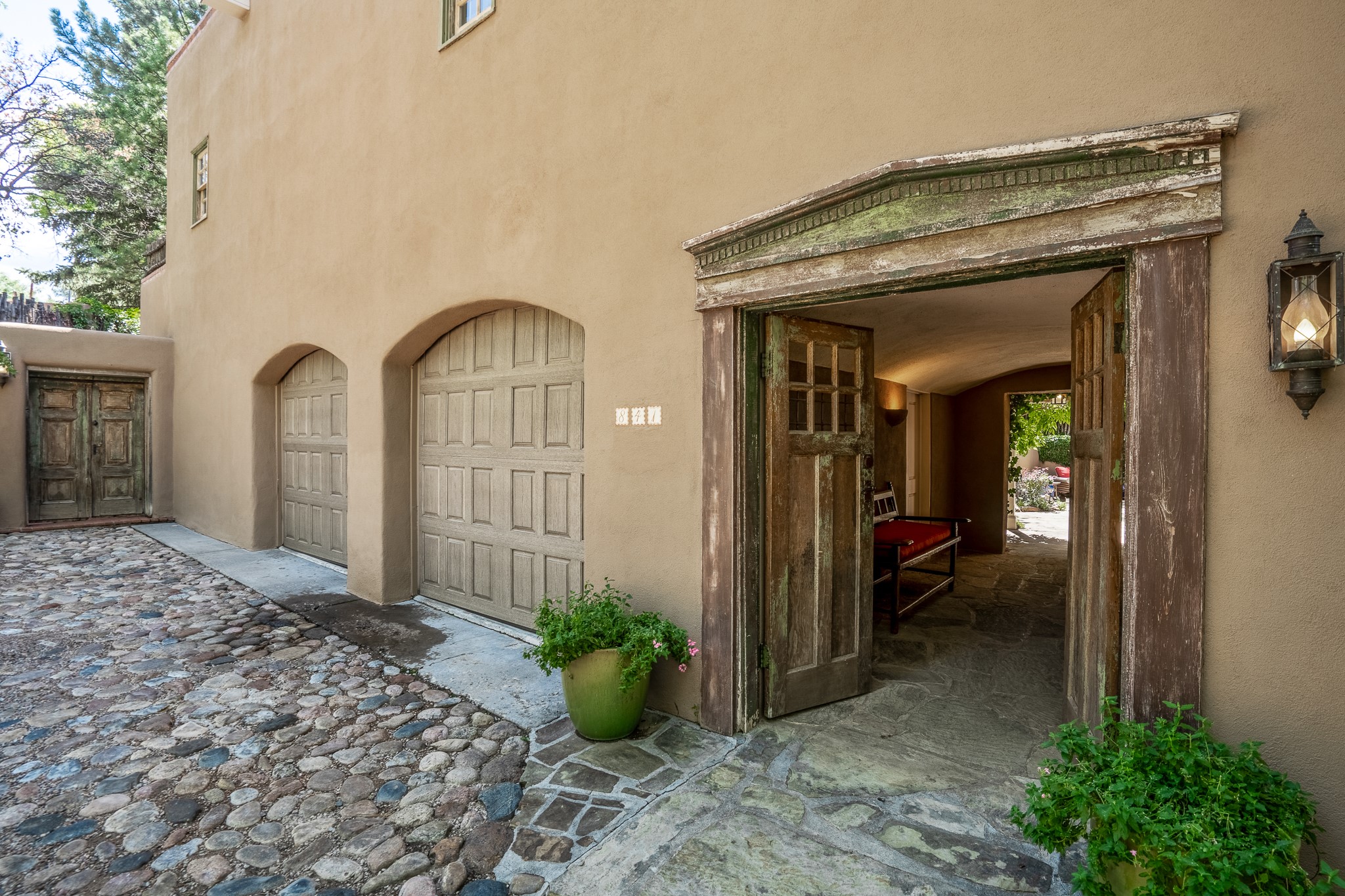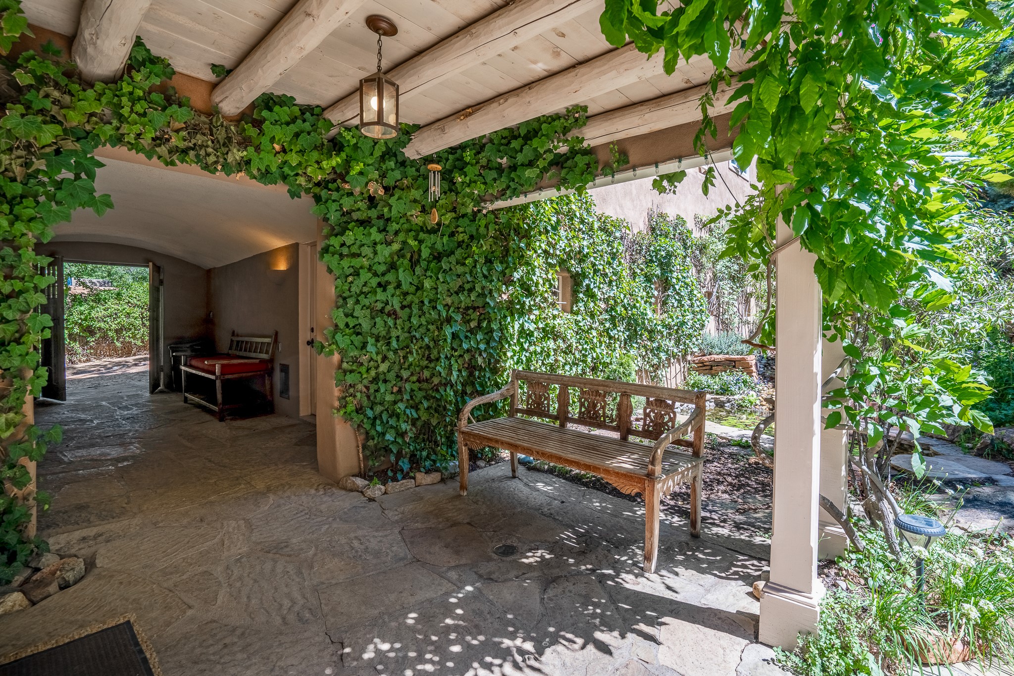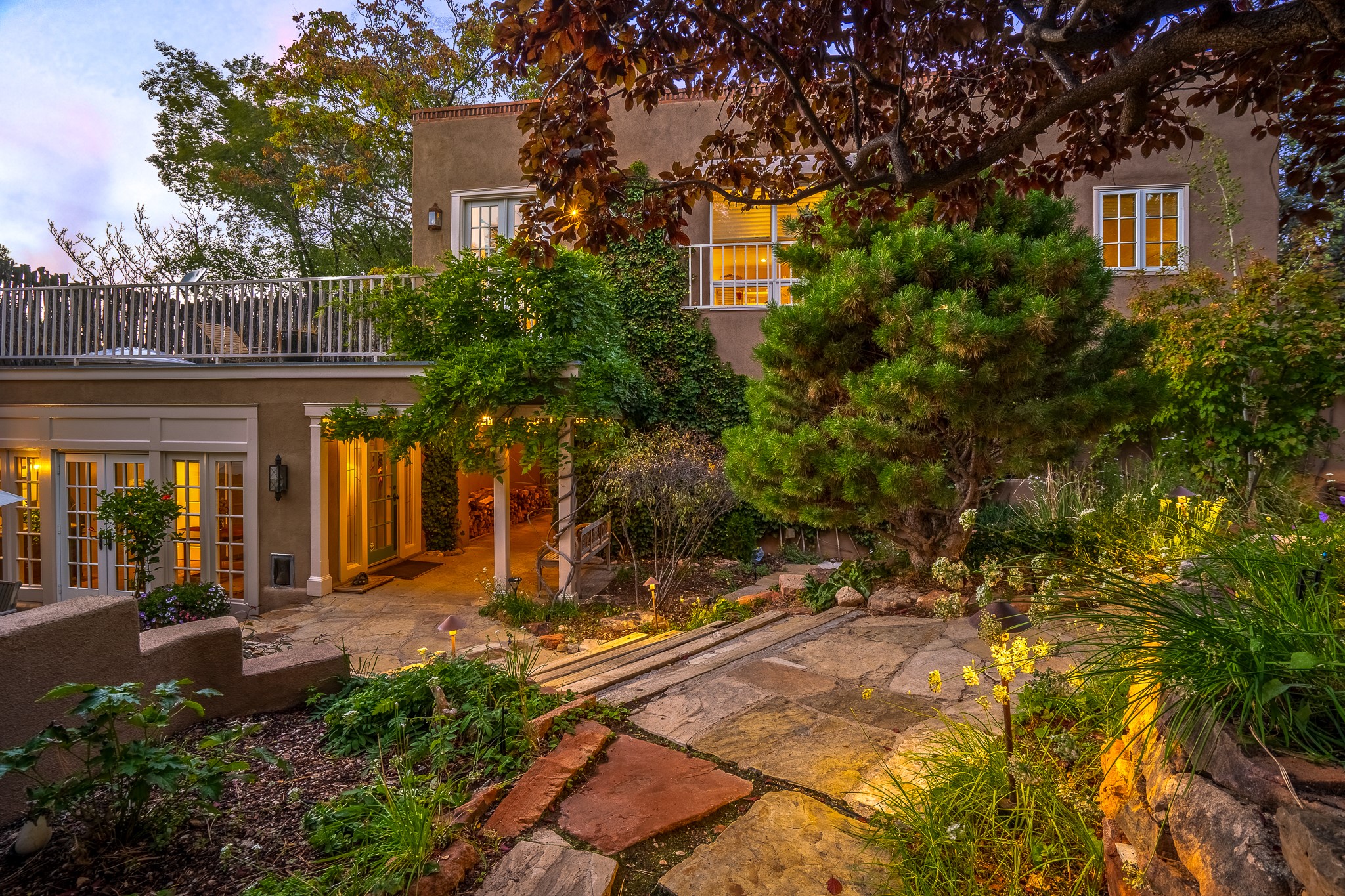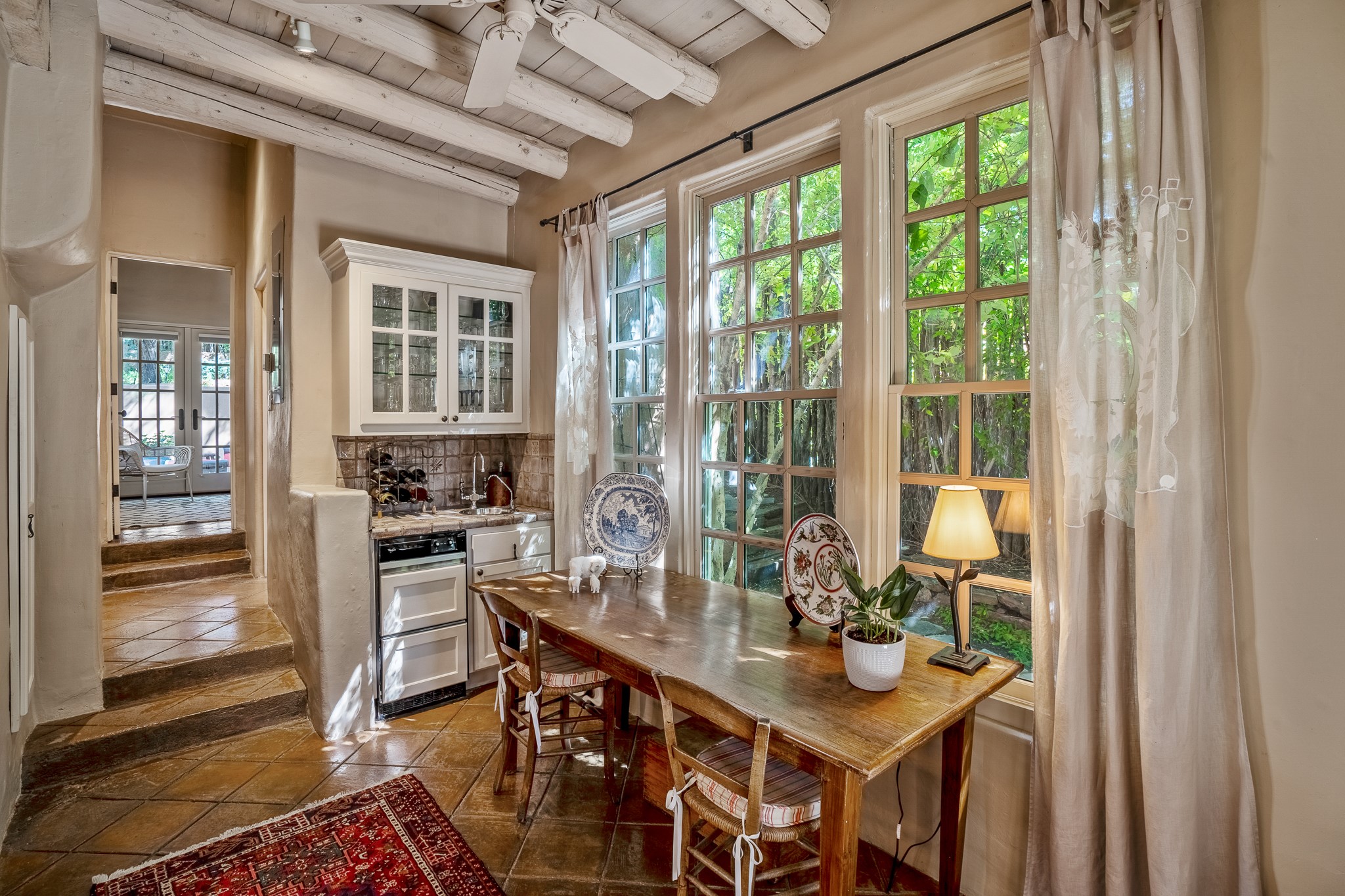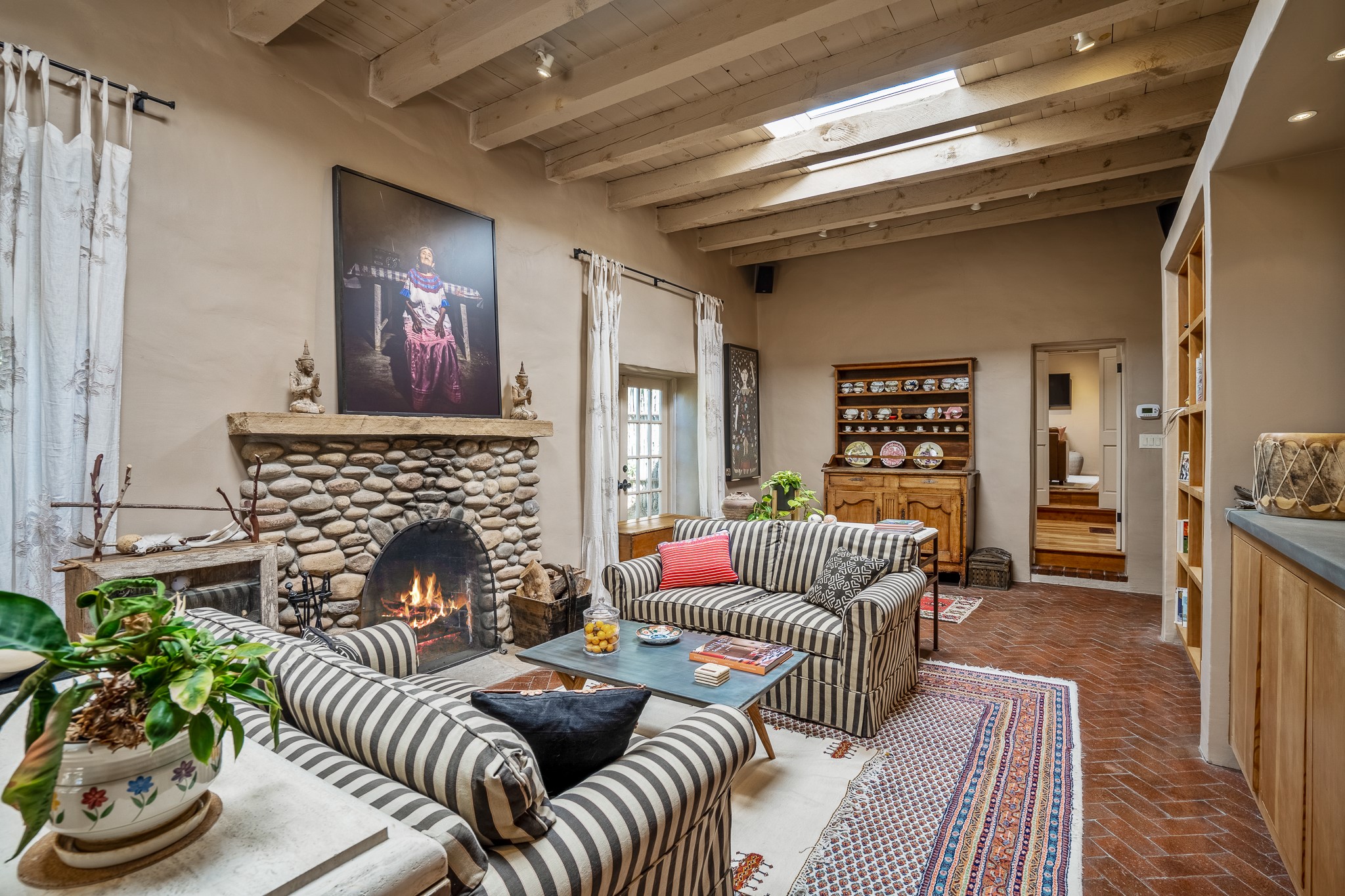 Welcome to the charming Eastside of Santa Fe, where history and beauty converge. Nestled within this enchanting neighborhood, we have an exquisite home that captures the essence of Santa Fe's rich heritage. This 4 bedroom, 4 bath residence boasts authentic Southwestern territorial architecture with traditional vigas and 5 fireplaces. With approximately 2,600 square feet of living space in the main home, there is ample room for comfortable living. The cozy living areas feature high, wood-beamed ceilings and skylights with french doors that open up onto private patios and courtyards, creating an open and airy feel. The kitchen has been tastefully updated with modern appliances while preserving its rustic charm. A private Casita with its own entrance has 1 bedroom and a 3 / 4 bathroom with a 2nd room that could serve as an office or studio. The kitchen opens up to a spacious living room with a large fireplace and grand windows that overlook the lush courtyard. There is a 2 car garage with two large walk-in closets for ample storage and a third room with laundry and a built-in dog wash tub. The outdoor spaces are a true private oasis, featuring multiple courtyards filled with vibrant landscaping and a serene fountain, perfect for relaxing or entertaining. You'll also find a covered portal, providing a shaded respite during sunny Santa Fe days. As you exit the private compound onto the quiet tree lined East Palace Avenue, walk a few blocks to the historic Santa Fe Plaza and immerse yourself in the city's vibrant culture, art galleries, and world-class dining. This is a rare opportunity to own a piece of Santa Fe's history in one of its most coveted neighborhoods. Don't miss your chance to experience the magic of this historic home. Contact us today for a private showing and step into the timeless beauty of Santa Fe's past.