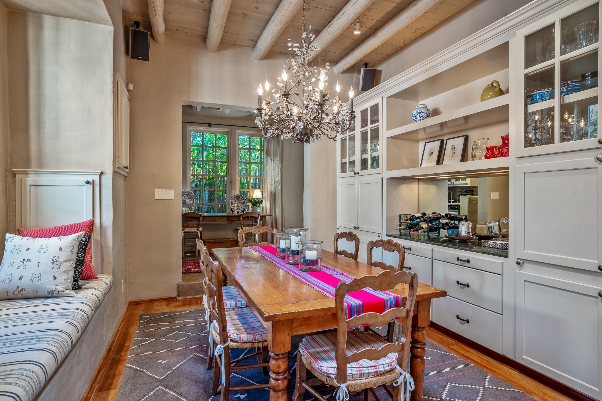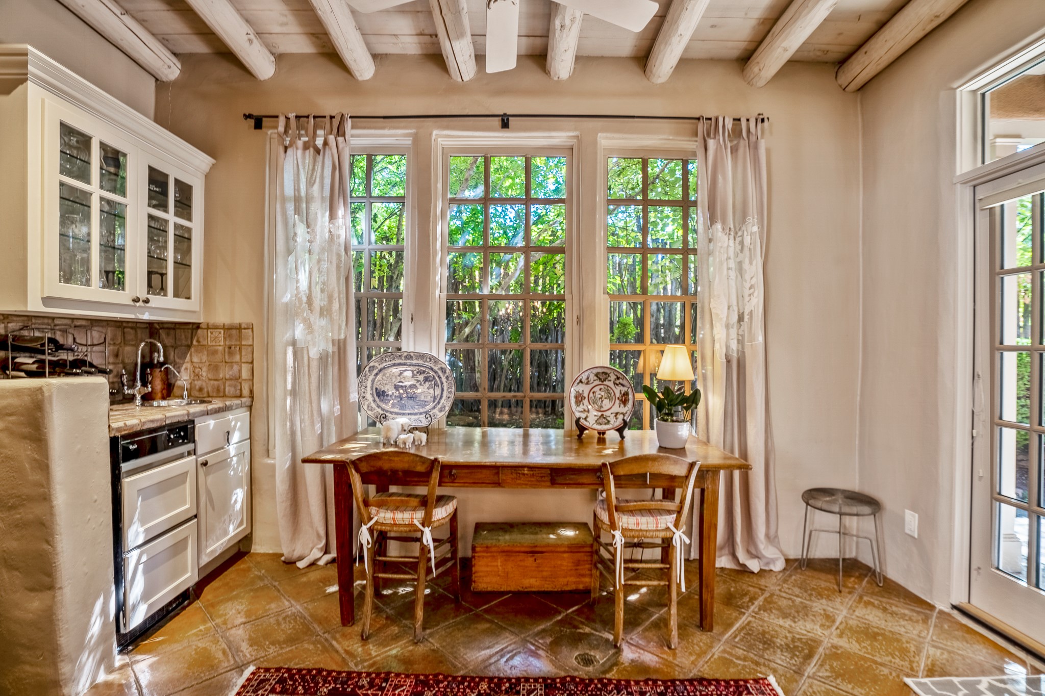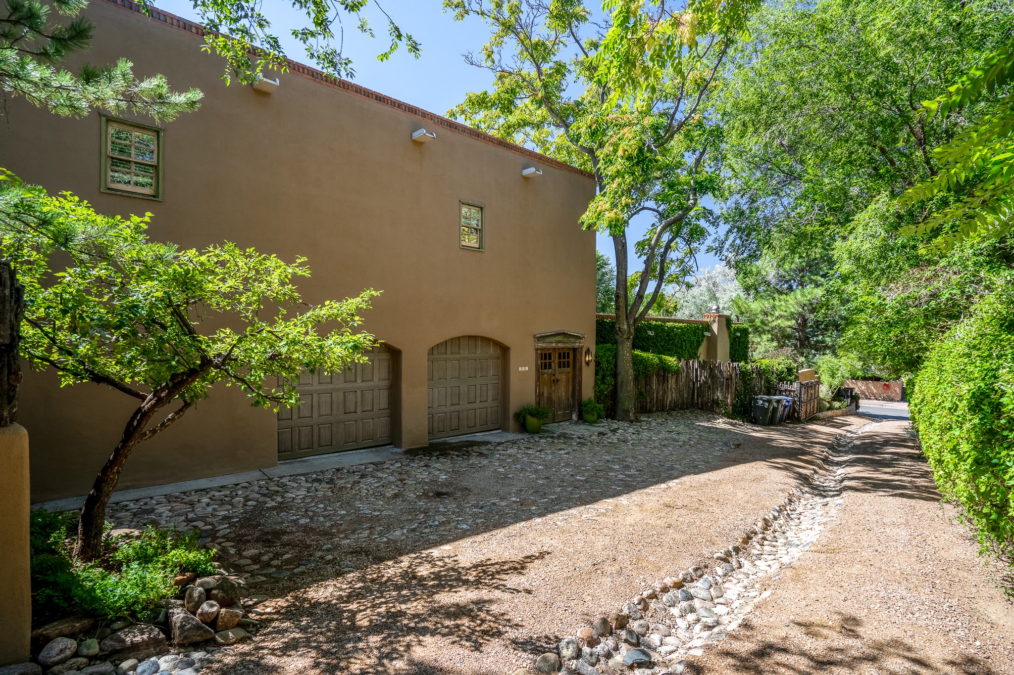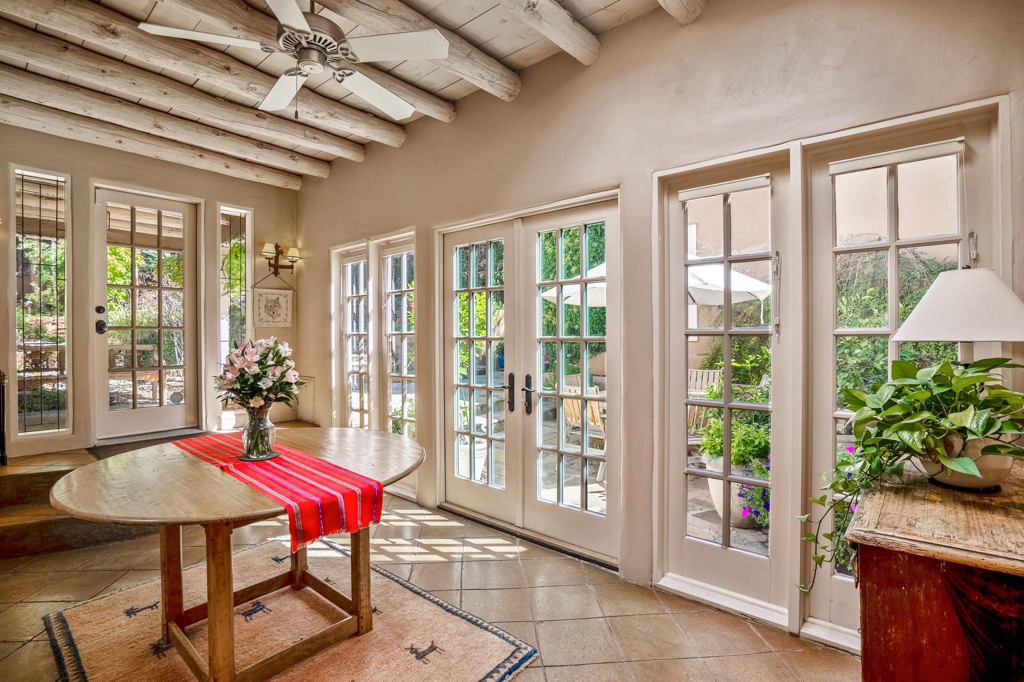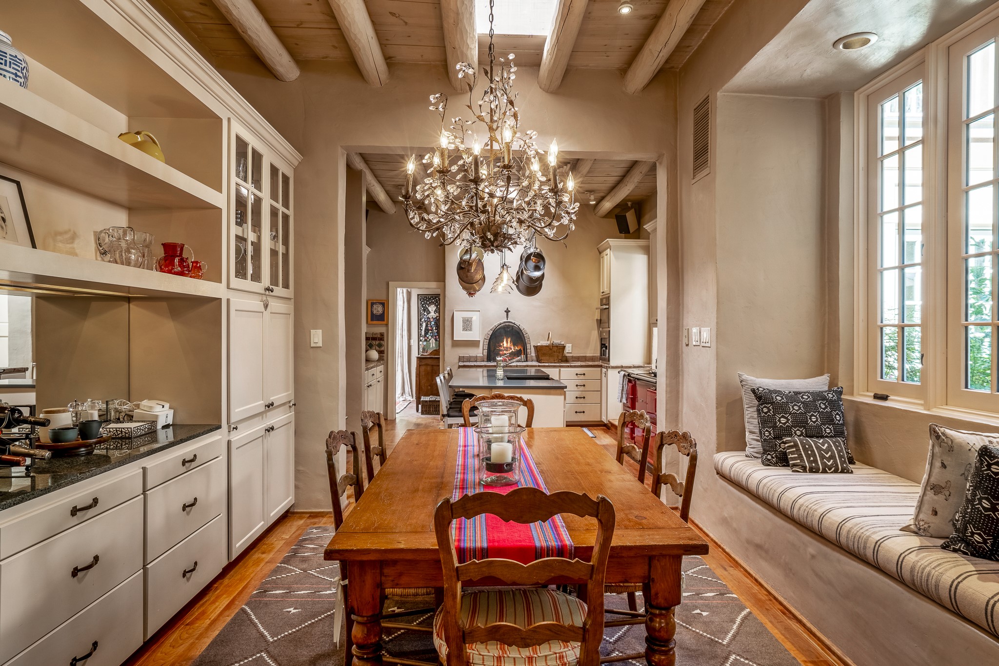 Welcome to the charming Eastside of Santa Fe, where history and beauty converge. Nestled within this enchanting neighborhood, we have an exquisite home that captures the essence of Santa Fe's rich heritage. This 4 bedroom, 4 bath residence boasts authentic Southwestern territorial architecture with traditional vigas and 5 fireplaces. With approximately 2,600 square feet of living space in the main home, there is ample room for comfortable living. The cozy living areas feature high, wood-beamed ceilings and skylights with french doors that open up onto private patios and courtyards, creating an open and airy feel. The kitchen has been tastefully updated with modern appliances while preserving its rustic charm. A private Casita with its own entrance has 1 bedroom and a 3 / 4 bathroom with a 2nd room that could serve as an office or studio. The kitchen opens up to a spacious living room with a large fireplace and grand windows that overlook the lush courtyard. There is a 2 car garage with two large walk-in closets for ample storage and a third room with laundry and a built-in dog wash tub. The outdoor spaces are a true private oasis, featuring multiple courtyards filled with vibrant landscaping and a serene fountain, perfect for relaxing or entertaining. You'll also find a covered portal, providing a shaded respite during sunny Santa Fe days. As you exit the private compound onto the quiet tree lined East Palace Avenue, walk a few blocks to the historic Santa Fe Plaza and immerse yourself in the city's vibrant culture, art galleries, and world-class dining. This is a rare opportunity to own a piece of Santa Fe's history in one of its most coveted neighborhoods. Don't miss your chance to experience the magic of this historic home. Contact us today for a private showing and step into the timeless beauty of Santa Fe's past.