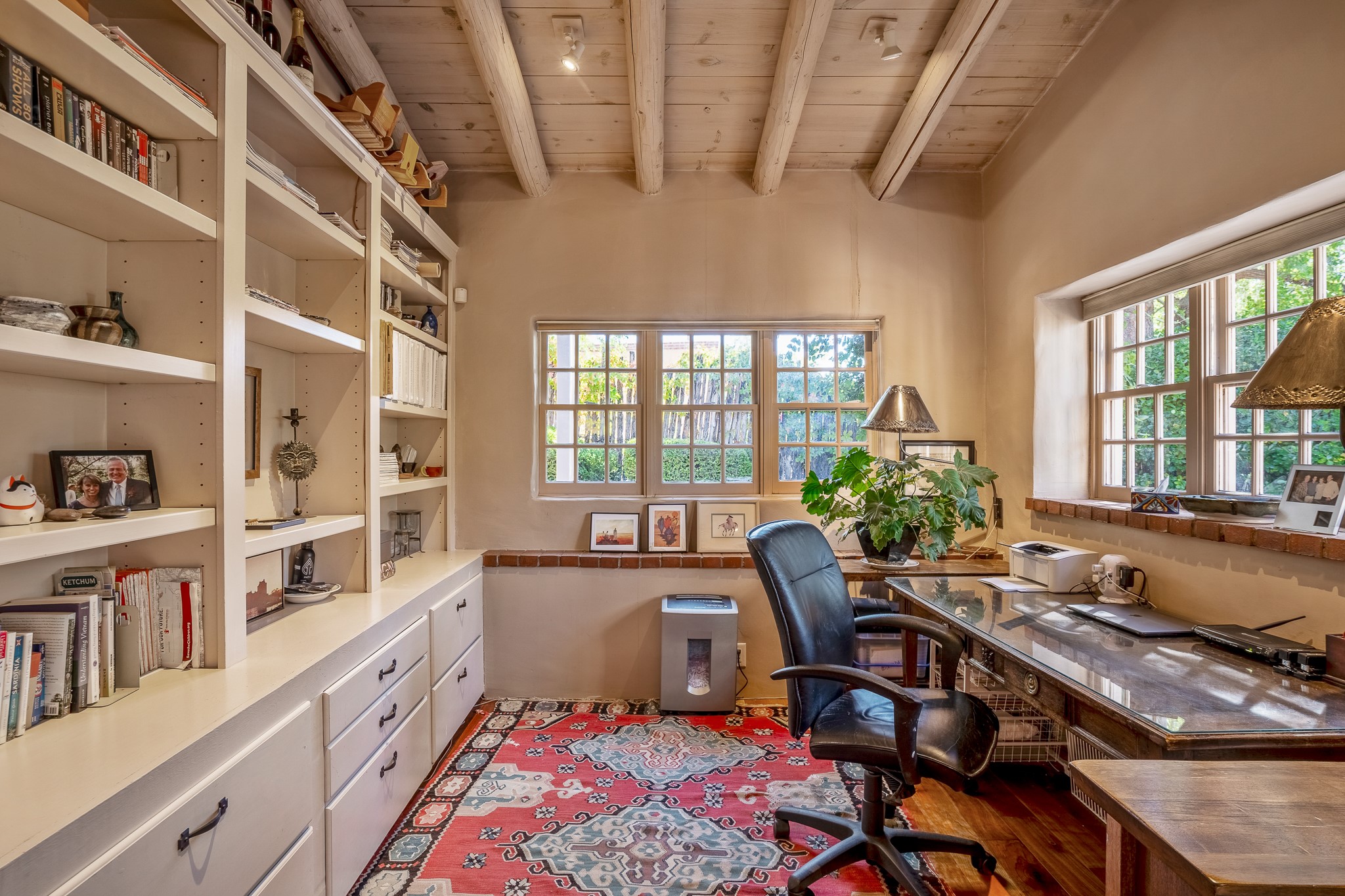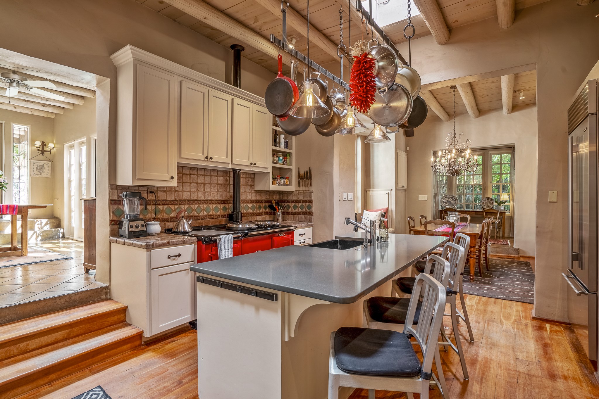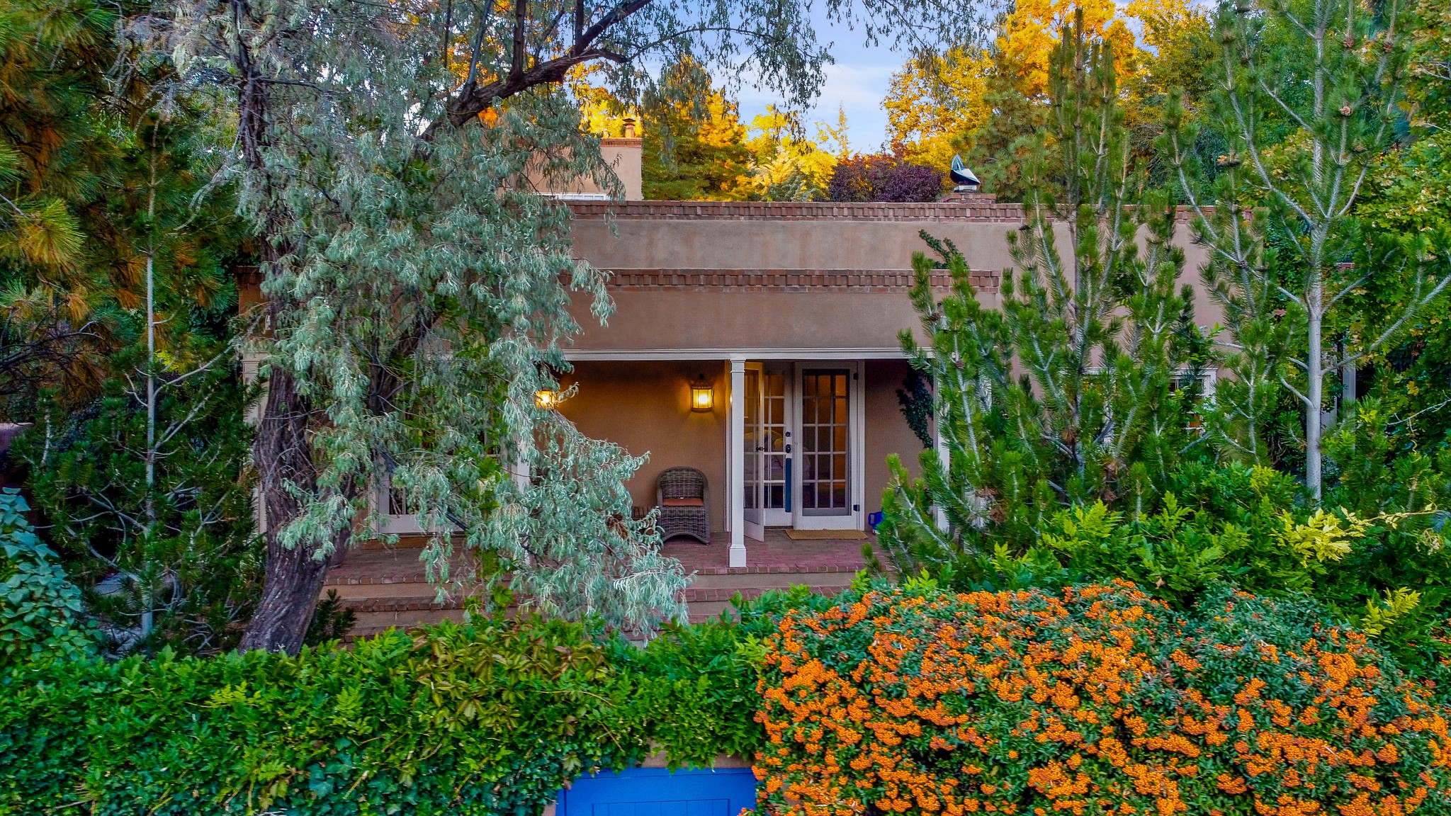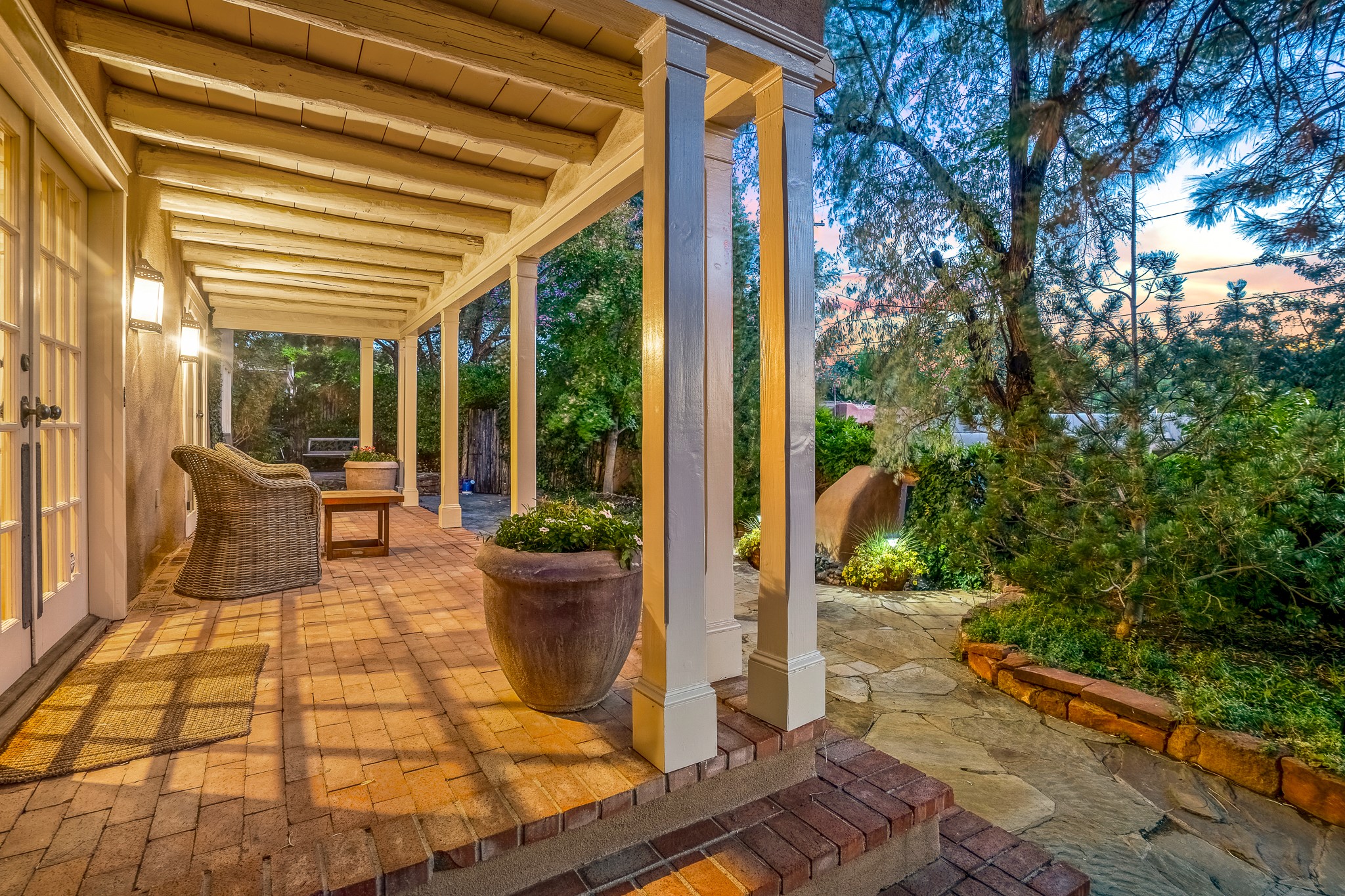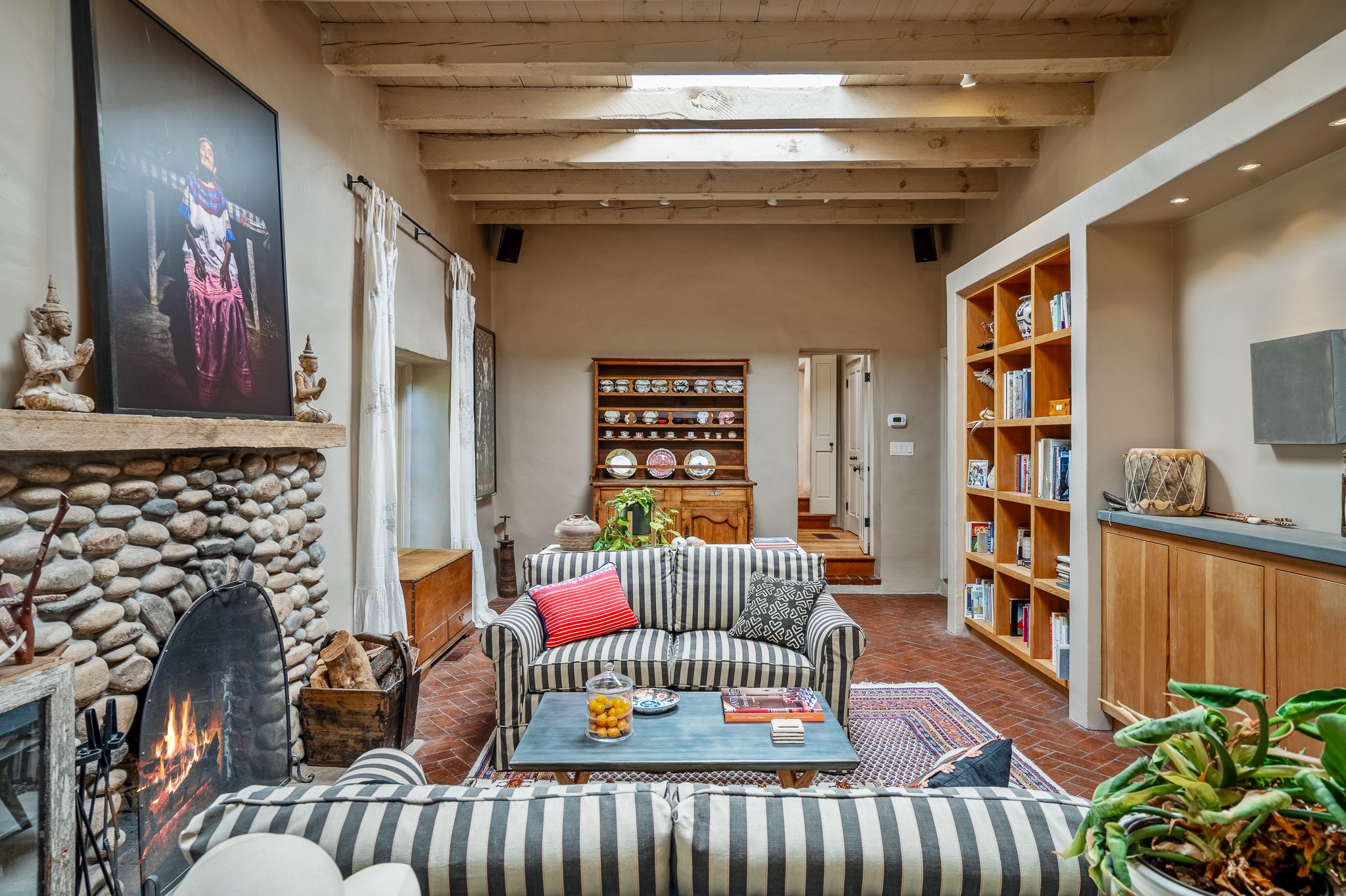 Welcome to the charming Eastside of Santa Fe, where history and beauty converge. Nestled within this enchanting neighborhood, we have an exquisite home that captures the essence of Santa Fe's rich heritage. This 4 bedroom, 4 bath residence boasts authentic Southwestern territorial architecture with traditional vigas and 5 fireplaces. With approximately 2,600 square feet of living space in the main home, there is ample room for comfortable living. The cozy living areas feature high, wood-beamed ceilings and skylights with french doors that open up onto private patios and courtyards, creating an open and airy feel. The kitchen has been tastefully updated with modern appliances while preserving its rustic charm. A private Casita with its own entrance has 1 bedroom and a 3 / 4 bathroom with a 2nd room that could serve as an office or studio. The kitchen opens up to a spacious living room with a large fireplace and grand windows that overlook the lush courtyard. There is a 2 car garage with two large walk-in closets for ample storage and a third room with laundry and a built-in dog wash tub. The outdoor spaces are a true private oasis, featuring multiple courtyards filled with vibrant landscaping and a serene fountain, perfect for relaxing or entertaining. You'll also find a covered portal, providing a shaded respite during sunny Santa Fe days. As you exit the private compound onto the quiet tree lined East Palace Avenue, walk a few blocks to the historic Santa Fe Plaza and immerse yourself in the city's vibrant culture, art galleries, and world-class dining. This is a rare opportunity to own a piece of Santa Fe's history in one of its most coveted neighborhoods. Don't miss your chance to experience the magic of this historic home. Contact us today for a private showing and step into the timeless beauty of Santa Fe's past.