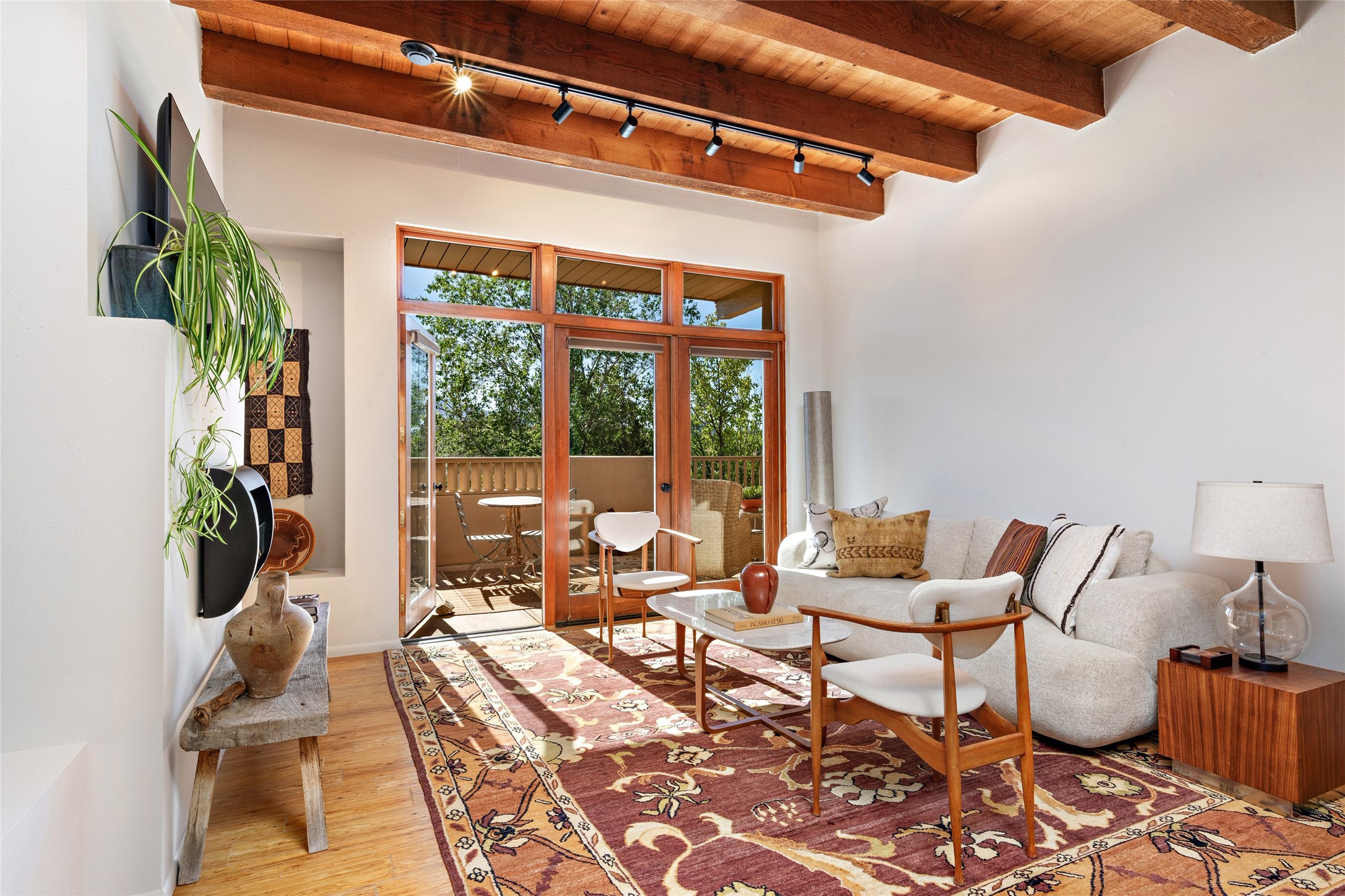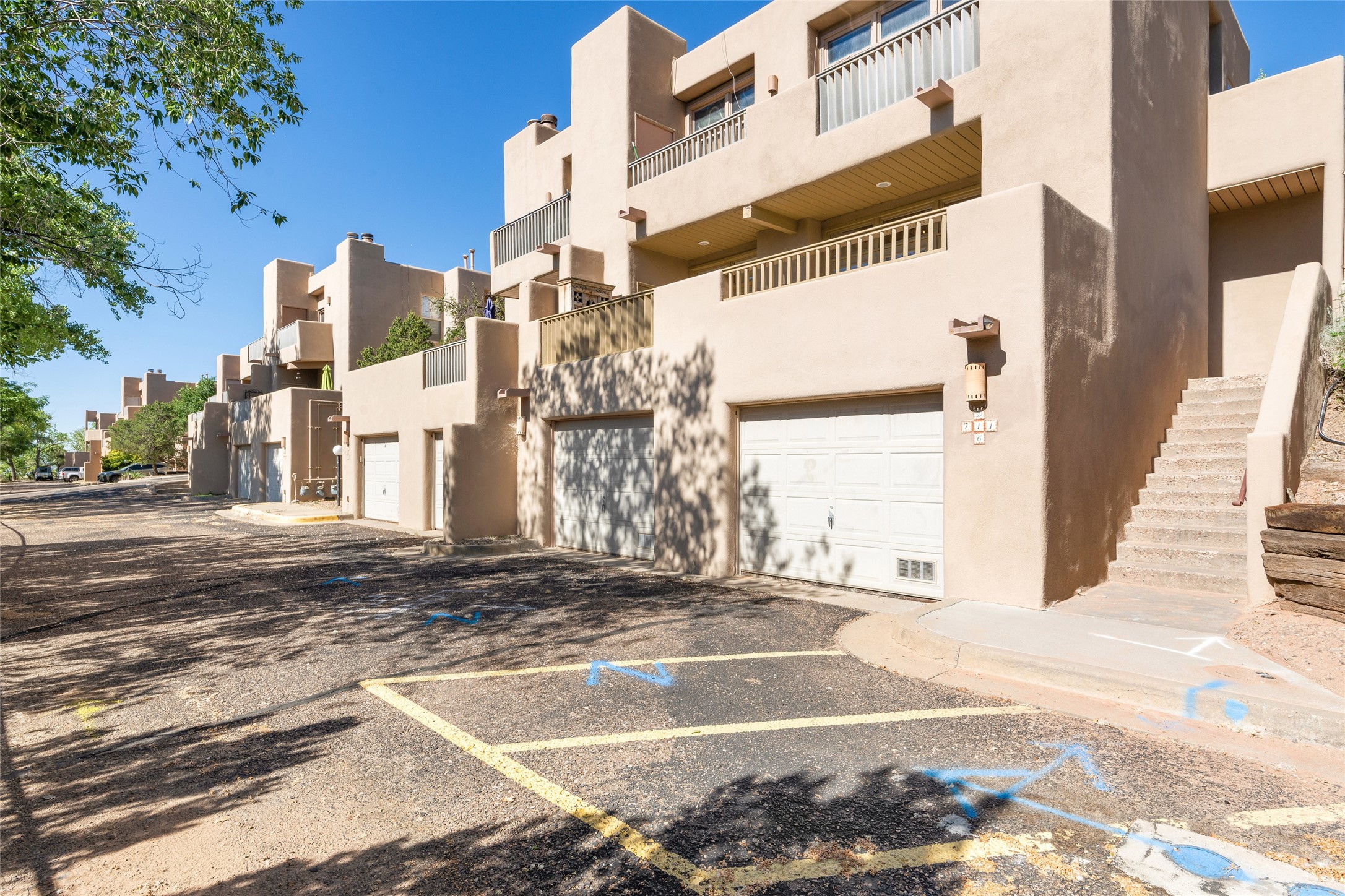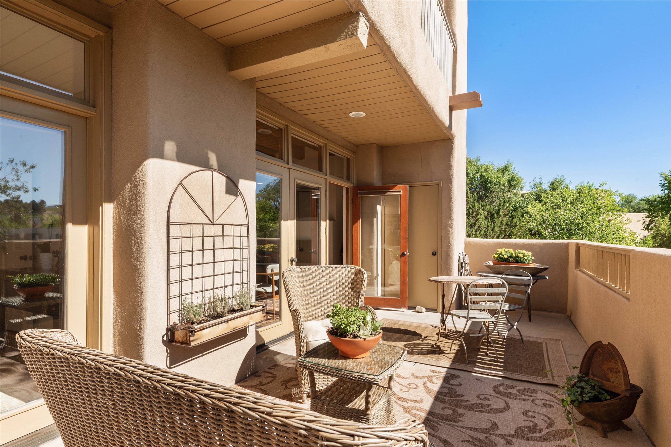 What is not to like about this crisp, compact, newly refurbished condominium in a superb location just minutes from the heart of Santa Fe? At the end unit of the Vieto del Norte complex, the sweet home enjoys the advantage of no neighbors on the north side; hence, more windows for better light and extra views. A bright interior flows seamlessly into the large balcony off both the living room and bedroom, nearly doubling the enjoyable space for entertaining and peaceful relaxation. Wood floors, plank and square cut beam ceilings, and wood frame glass paned doors offer a handsome counterpoint to the lighter touch given to the rest of the dcor. The kitchen and dining spaces are cozy yet fully functional with renovated shelves and countertops as well as new appliances. The bathroom has been completely renovated and the space maximized by installing a large reach-in closet. A stacked washer/dryer lives in the kitchen pantry/storage closet and a downstairs garage provides room for one vehicle and additional storage. A perfect home for quick and easy access to all of Santa Fe's special summer fairs and festivals and an equally easy spot to languish in after long winter days spent at the ski basin. Whether looking for an easy seasonal foothold in Santa Fe, a profitable rental property, or a charming carefree home in a prime part of Santa Fe, this special unit should not be missed.