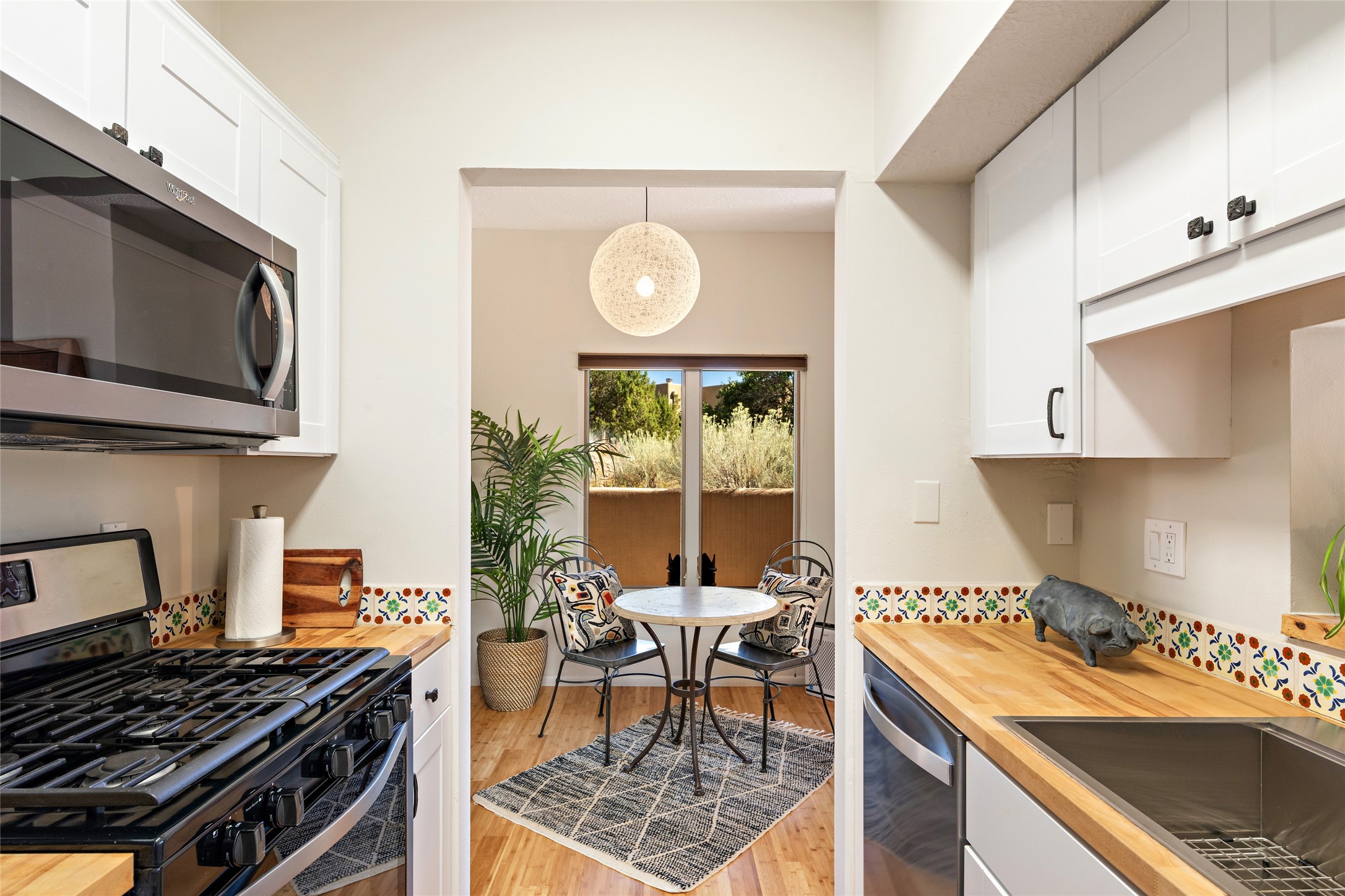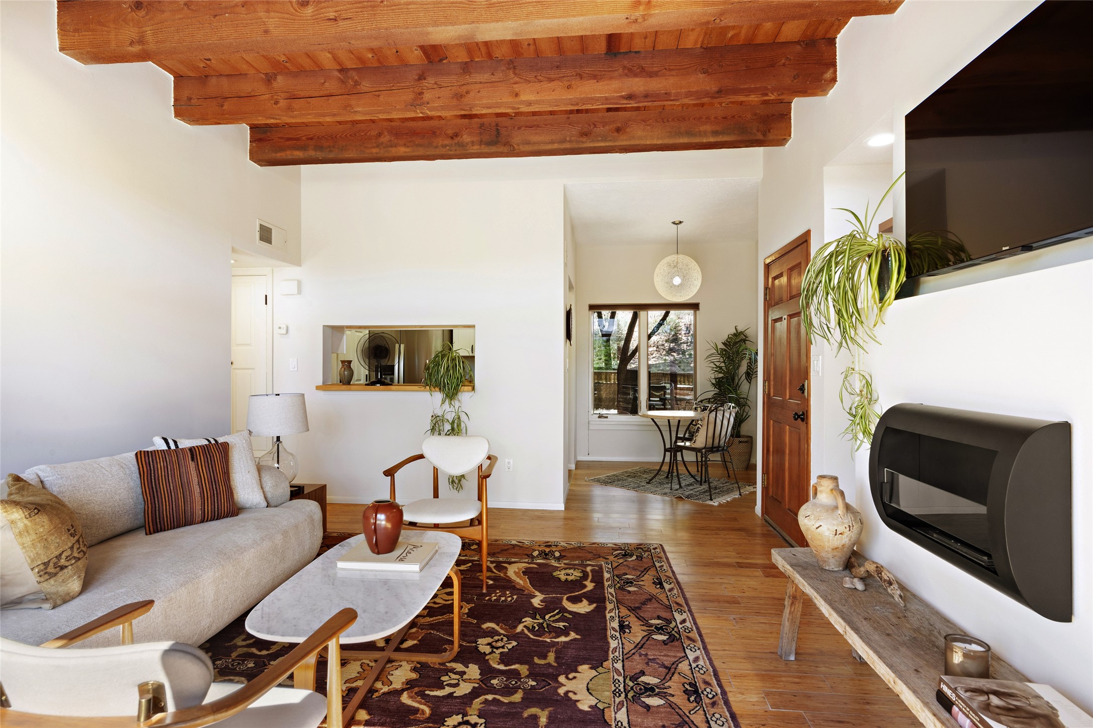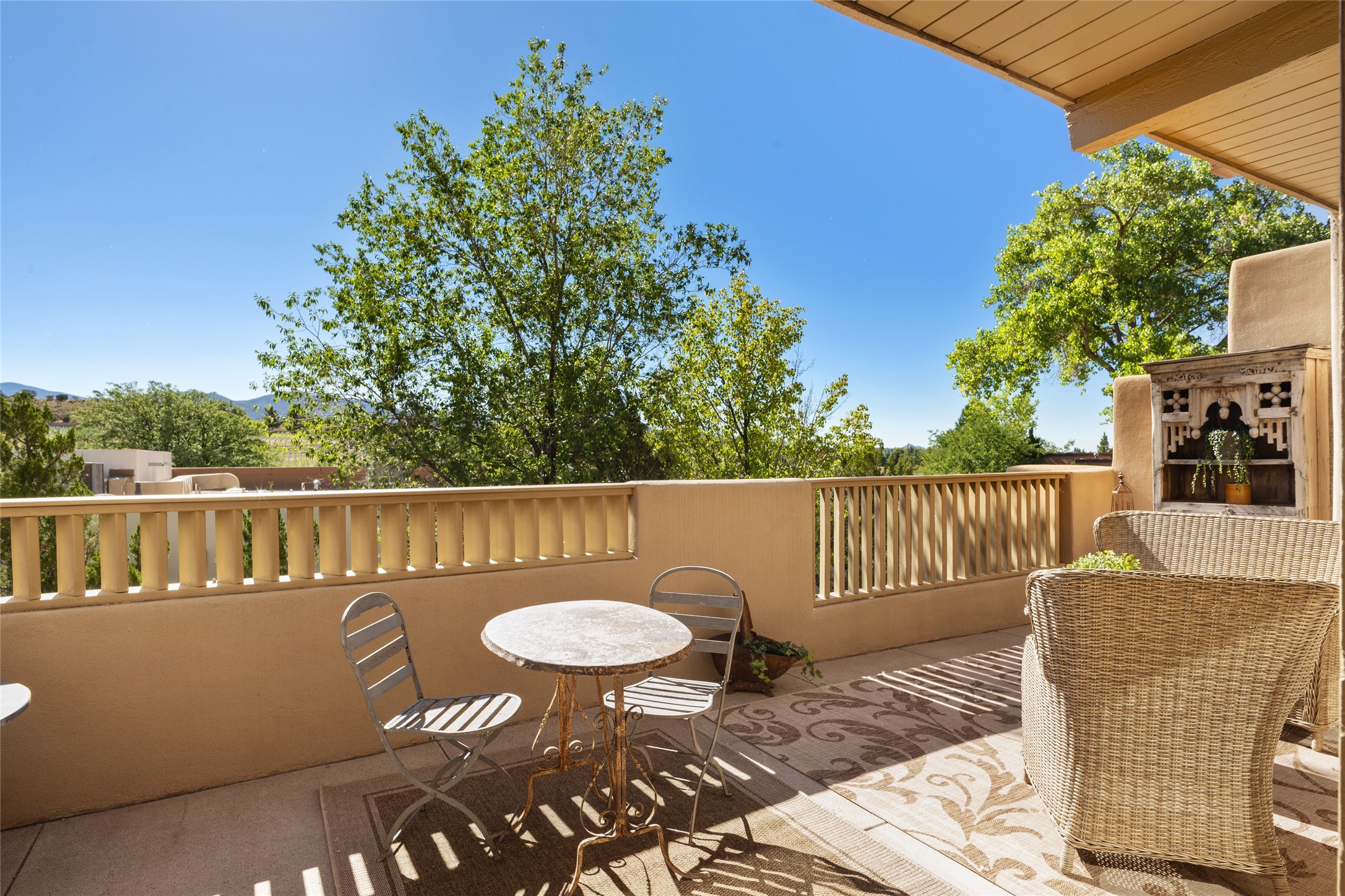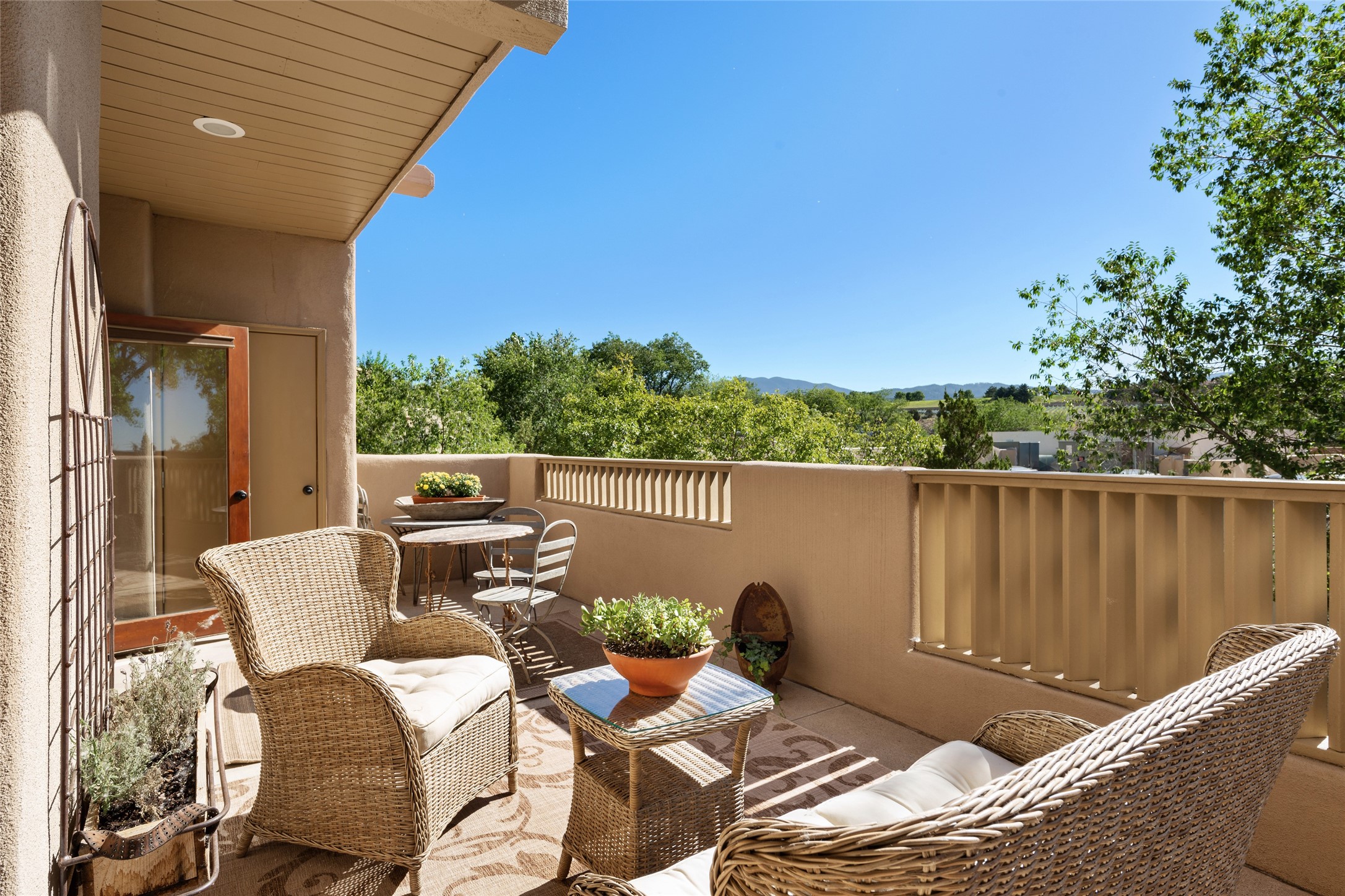 What is not to like about this crisp, compact, newly refurbished condominium in a superb location just minutes from the heart of Santa Fe? At the end unit of the Vieto del Norte complex, the sweet home enjoys the advantage of no neighbors on the north side; hence, more windows for better light and extra views. A bright interior flows seamlessly into the large balcony off both the living room and bedroom, nearly doubling the enjoyable space for entertaining and peaceful relaxation. Wood floors, plank and square cut beam ceilings, and wood frame glass paned doors offer a handsome counterpoint to the lighter touch given to the rest of the dcor. The kitchen and dining spaces are cozy yet fully functional with renovated shelves and countertops as well as new appliances. The bathroom has been completely renovated and the space maximized by installing a large reach-in closet. A stacked washer/dryer lives in the kitchen pantry/storage closet and a downstairs garage provides room for one vehicle and additional storage. A perfect home for quick and easy access to all of Santa Fe's special summer fairs and festivals and an equally easy spot to languish in after long winter days spent at the ski basin. Whether looking for an easy seasonal foothold in Santa Fe, a profitable rental property, or a charming carefree home in a prime part of Santa Fe, this special unit should not be missed.