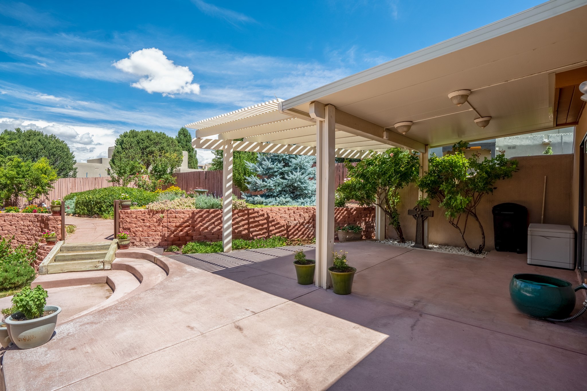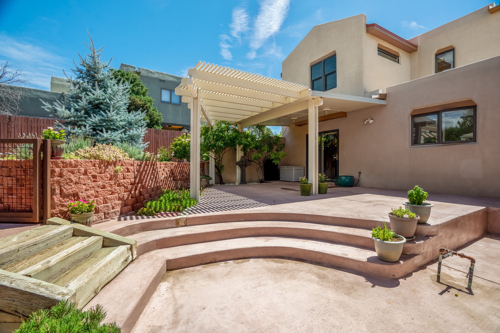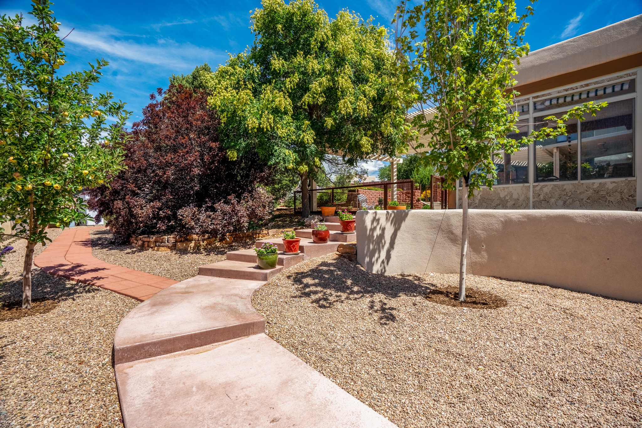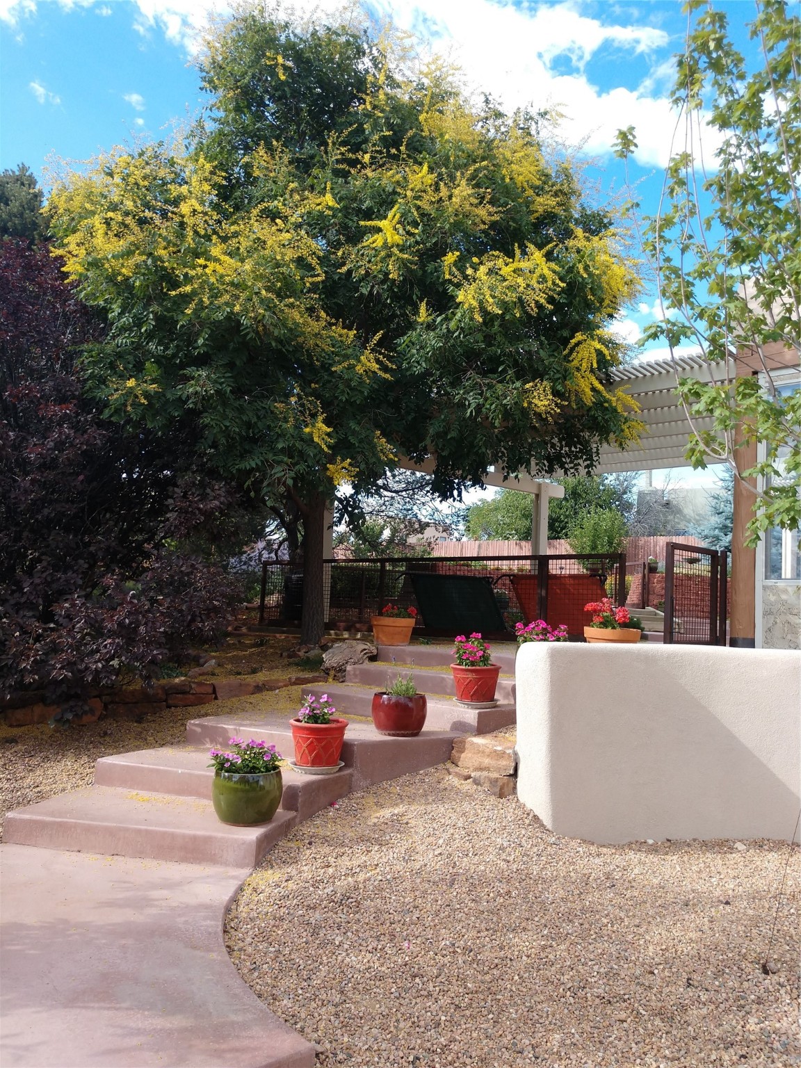 Experience Villa Caballero, a highly sought-after neighborhood known for quiet living, great location, and oversize lots. The area is particularly admired for its marvelous blend of natural beauty and charming residential spaces. One sweet gem is this multi-level home with a flexible floor plan featuring three bedrooms upstairs plus an office/den off the Primary Suite. An optional fourth bedroom is on the main level with access to the backyard pergola offering flexibility in living spaces. All bedrooms are spacious and feature stunning views. This Santa Fe style home is complete with beautiful vigas, nichos, and kiva fireplace on the main floor with plenty of space to entertain. The spacious primary bedroom suite offers a comfortable retreat, including a large bath with jetted tub and a separate office/sitting space and a view deck to enjoy sunsets and mountain views. The separated bedroom plan ensures privacy for everyone in the household and includes an additional view deck. The kitchen is spacious including an island and access to a huge utility/laundry room. A flexible family/dining/tv room with access to the back pergola is just off the kitchen in one direction and the formal dining and living room are off the other direction. This is truly a fabulous home for ease of entertaining. In addition, the views out virtually every window allow enjoyment of the breathtaking scenery and views, and invite you to soak in the surrounding beauty.Speaking of beauty, the lush and mature landscaping of this home boasts wonderful pathways meandering through multiple fruit trees, flowering beds, and shrubs. The thoughtful design creates a serene and inviting atmosphere. To add to the tranquility, there's even a large backyard pergola, perfect for peaceful entertaining and relaxation with wonderful architectural plays of shadow and light.Not only will you feel at peace in this home, but the lush landscaping will also attract birds and bees, creating a haven for wildlife enthusiasts and nature lovers alike. It truly is a wonderful environment to appreciate the harmony of nature and a great place to call home.