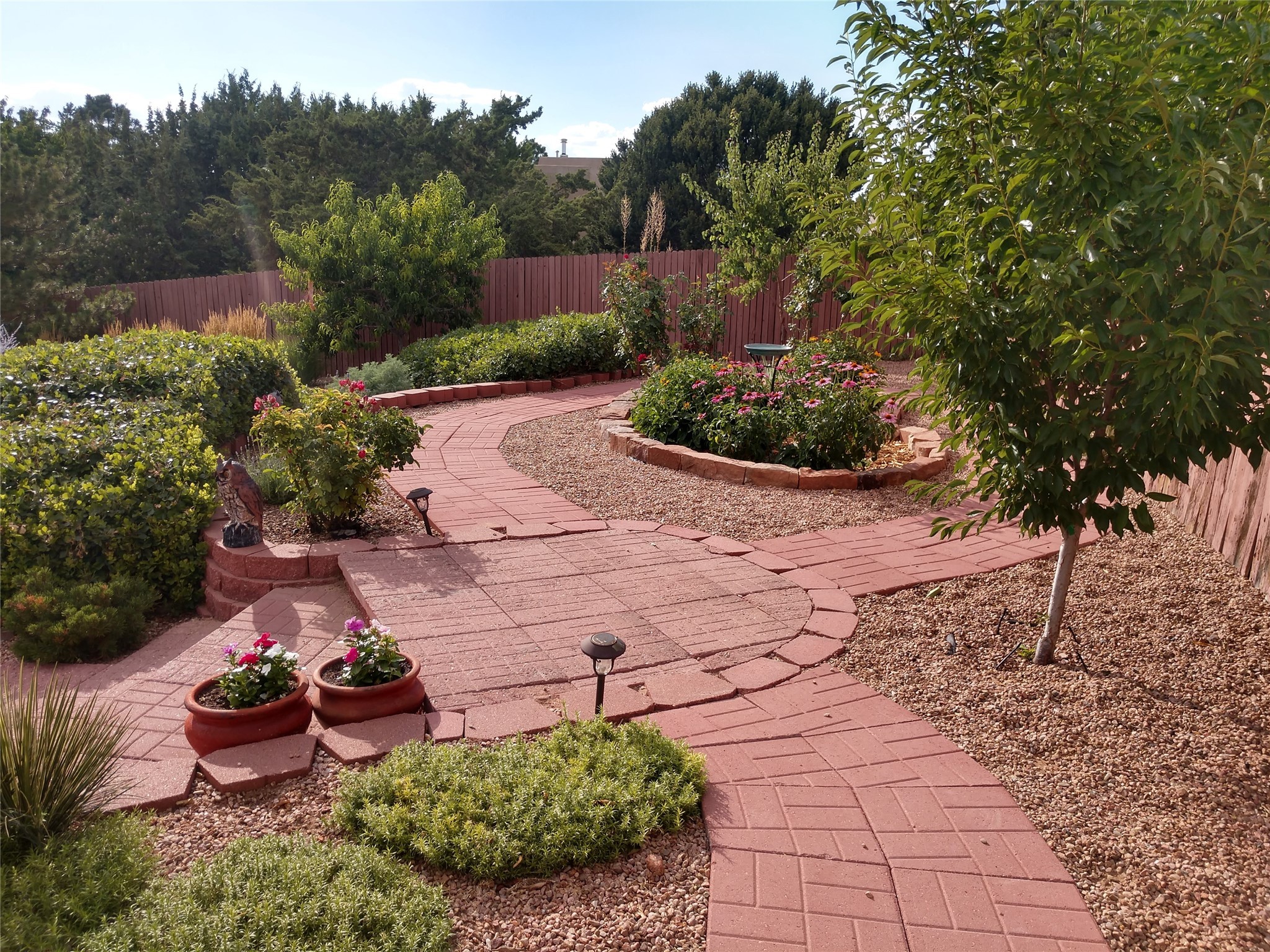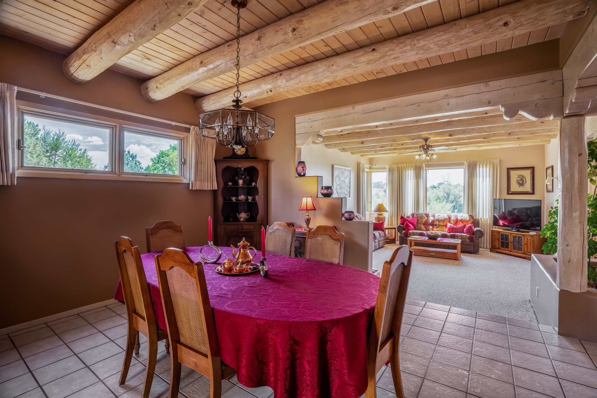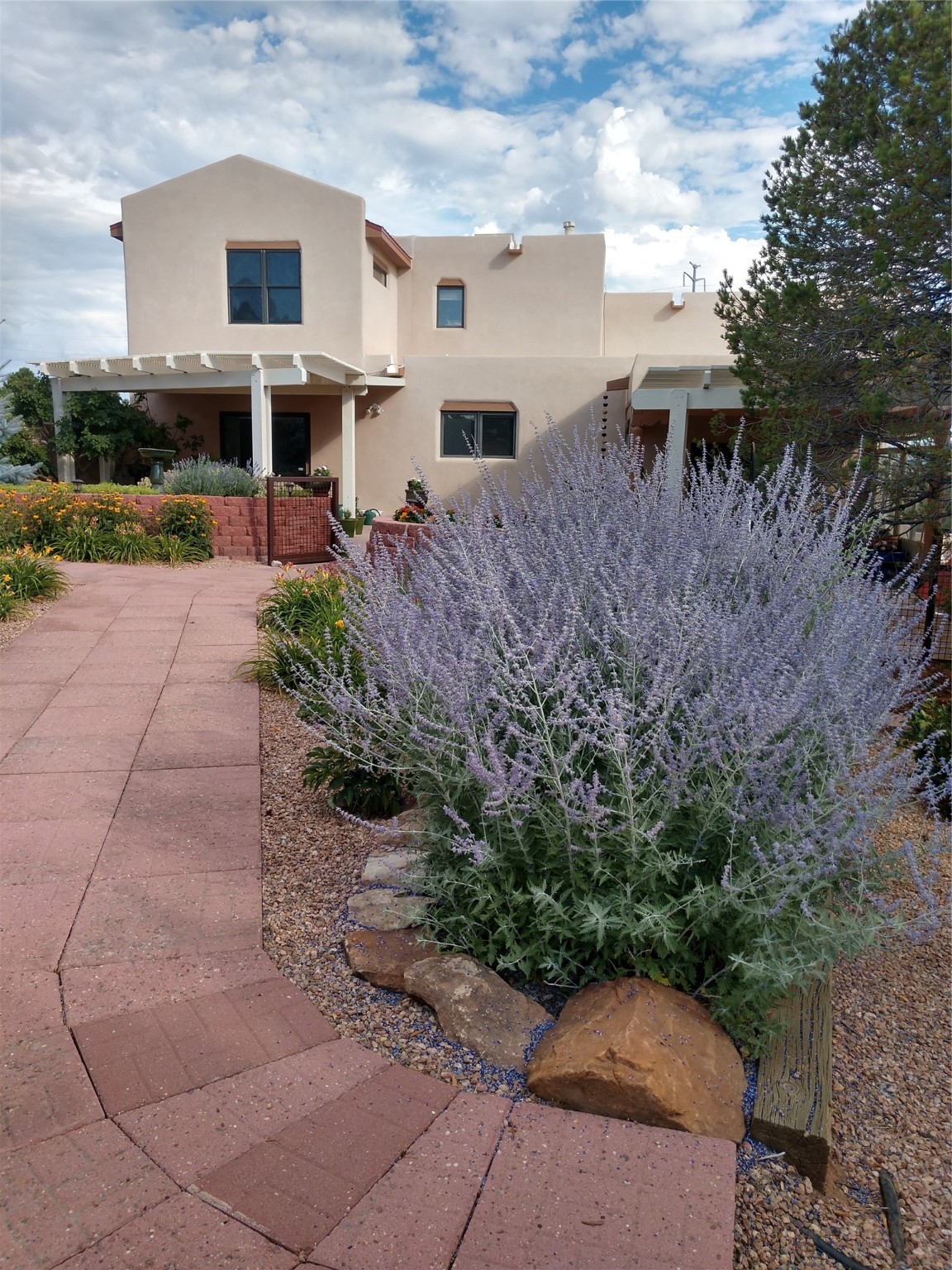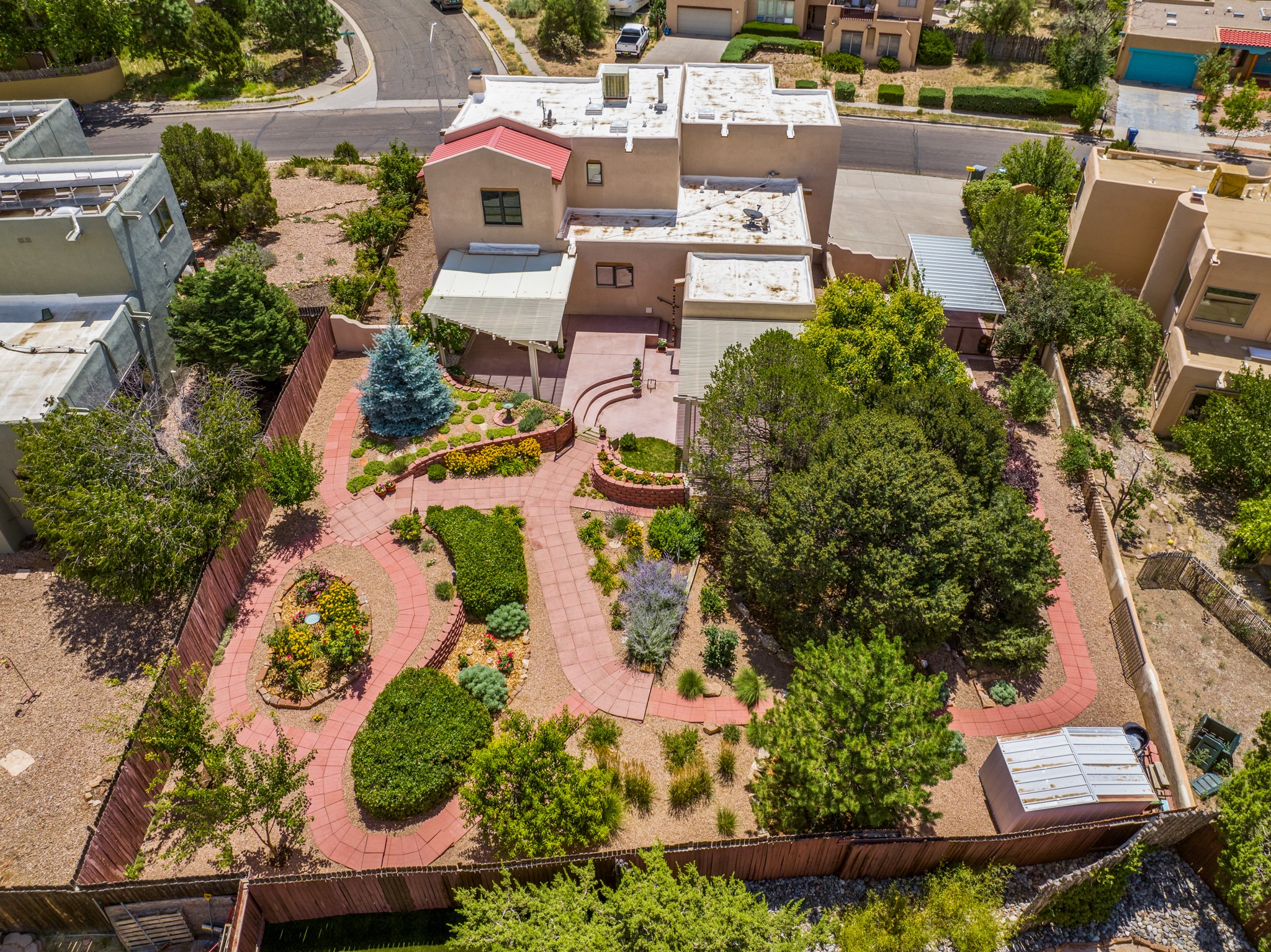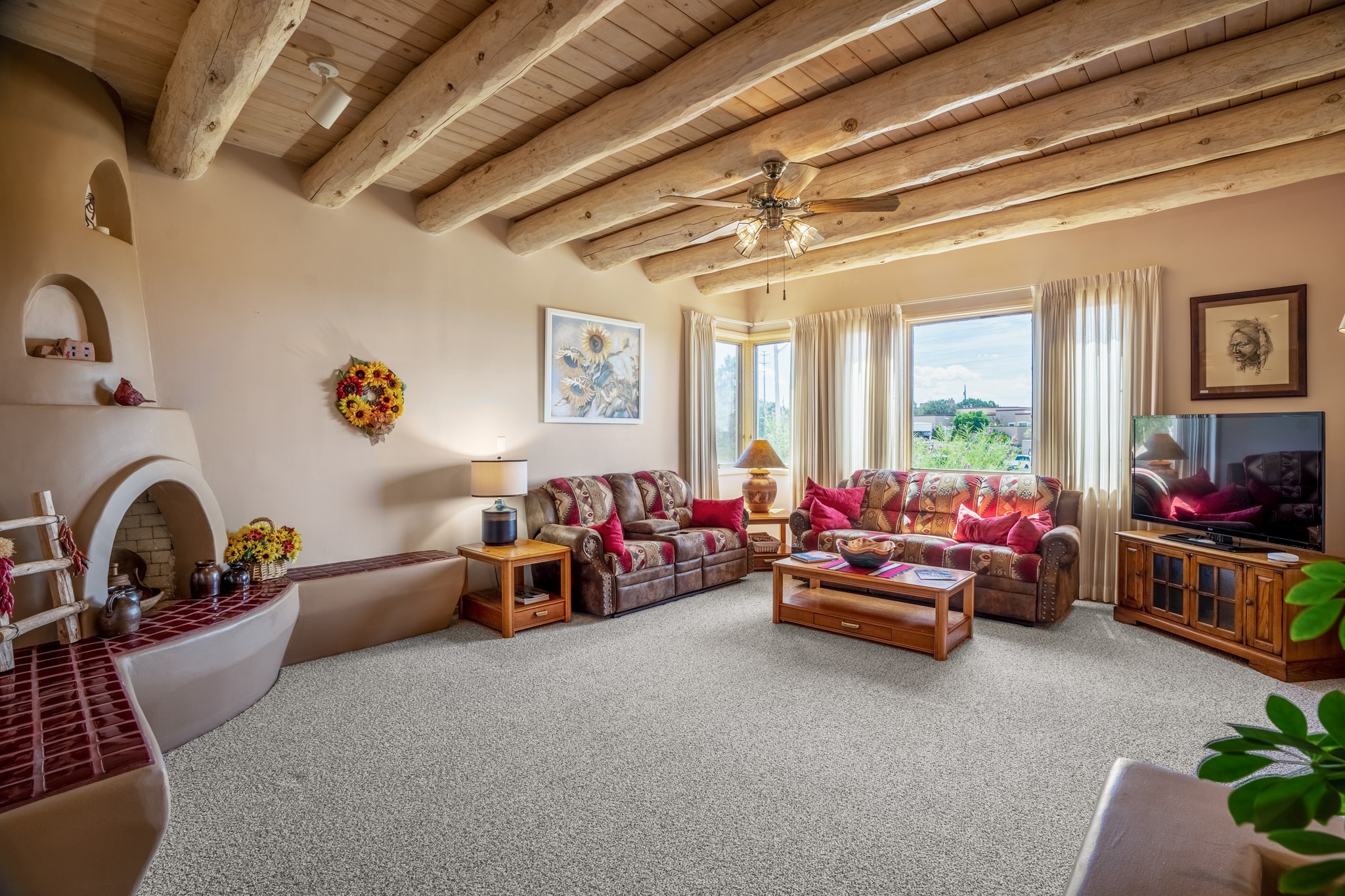 Experience Villa Caballero, a highly sought-after neighborhood known for quiet living, great location, and oversize lots. The area is particularly admired for its marvelous blend of natural beauty and charming residential spaces. One sweet gem is this multi-level home with a flexible floor plan featuring three bedrooms upstairs plus an office/den off the Primary Suite. An optional fourth bedroom is on the main level with access to the backyard pergola offering flexibility in living spaces. All bedrooms are spacious and feature stunning views. This Santa Fe style home is complete with beautiful vigas, nichos, and kiva fireplace on the main floor with plenty of space to entertain. The spacious primary bedroom suite offers a comfortable retreat, including a large bath with jetted tub and a separate office/sitting space and a view deck to enjoy sunsets and mountain views. The separated bedroom plan ensures privacy for everyone in the household and includes an additional view deck. The kitchen is spacious including an island and access to a huge utility/laundry room. A flexible family/dining/tv room with access to the back pergola is just off the kitchen in one direction and the formal dining and living room are off the other direction. This is truly a fabulous home for ease of entertaining. In addition, the views out virtually every window allow enjoyment of the breathtaking scenery and views, and invite you to soak in the surrounding beauty.Speaking of beauty, the lush and mature landscaping of this home boasts wonderful pathways meandering through multiple fruit trees, flowering beds, and shrubs. The thoughtful design creates a serene and inviting atmosphere. To add to the tranquility, there's even a large backyard pergola, perfect for peaceful entertaining and relaxation with wonderful architectural plays of shadow and light.Not only will you feel at peace in this home, but the lush landscaping will also attract birds and bees, creating a haven for wildlife enthusiasts and nature lovers alike. It truly is a wonderful environment to appreciate the harmony of nature and a great place to call home.