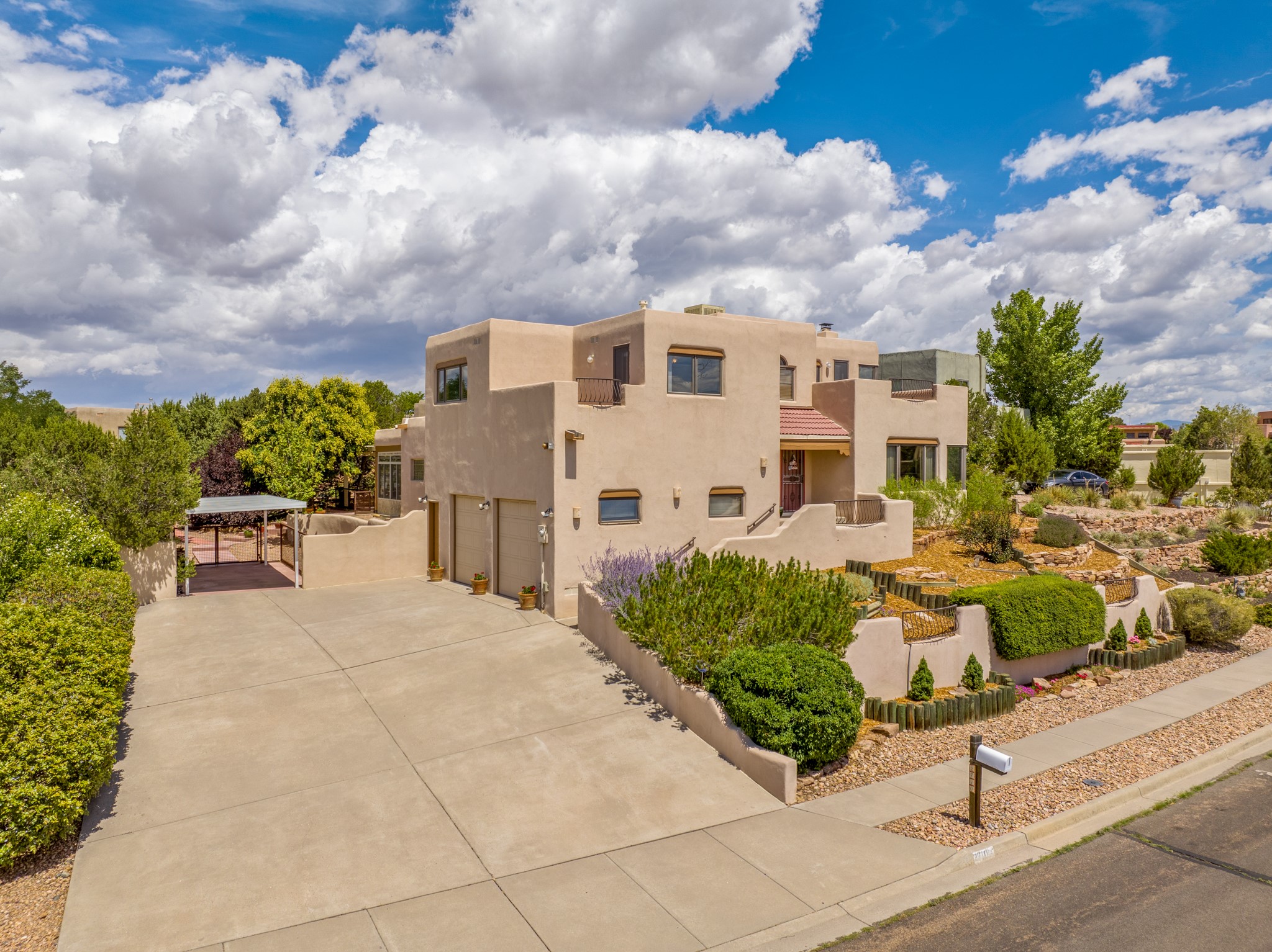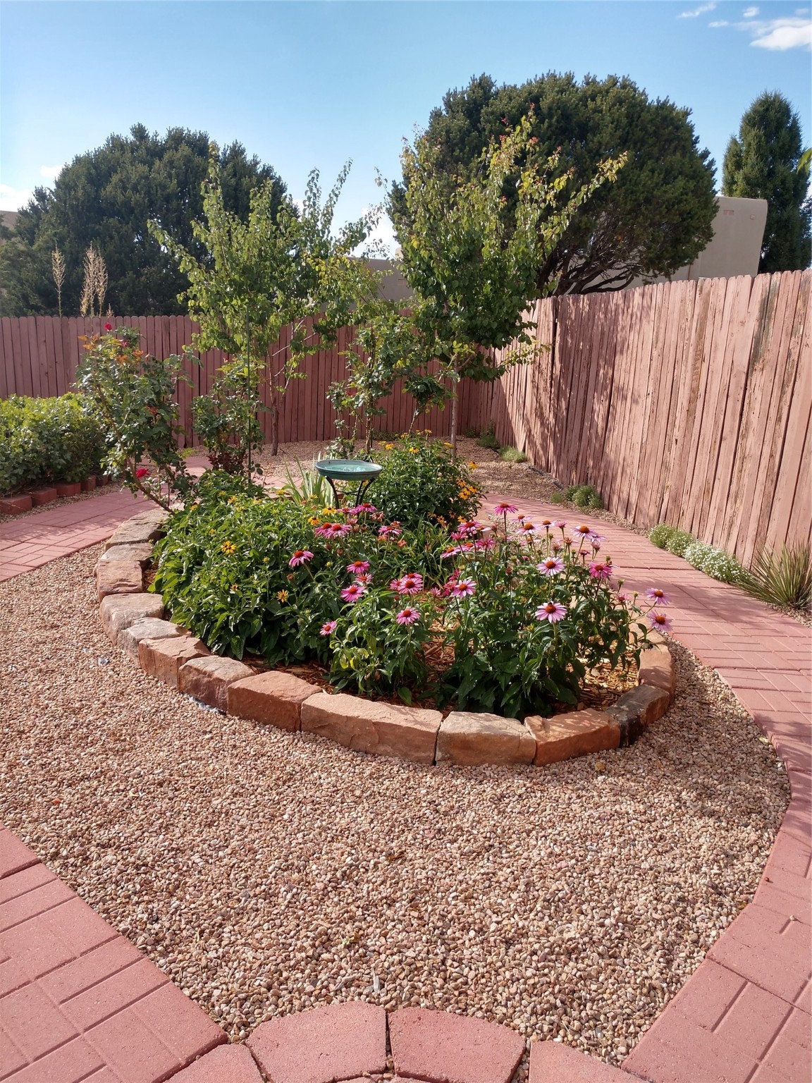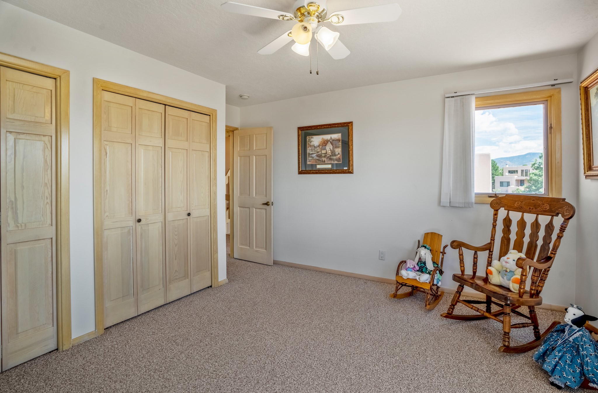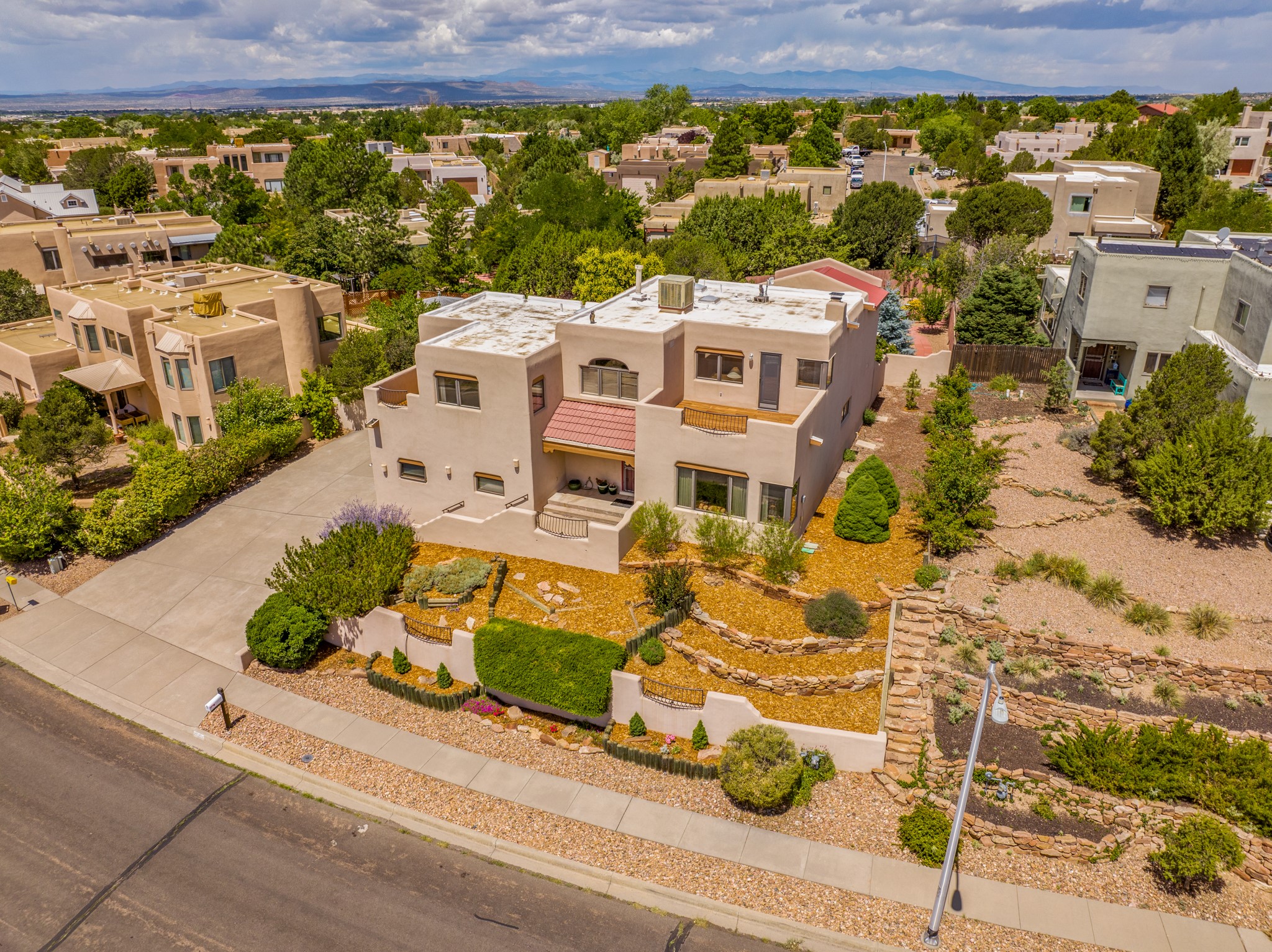 Experience Villa Caballero, a highly sought-after neighborhood known for quiet living, great location, and oversize lots. The area is particularly admired for its marvelous blend of natural beauty and charming residential spaces. One sweet gem is this multi-level home with a flexible floor plan featuring three bedrooms upstairs plus an office/den off the Primary Suite. An optional fourth bedroom is on the main level with access to the backyard pergola offering flexibility in living spaces. All bedrooms are spacious and feature stunning views. This Santa Fe style home is complete with beautiful vigas, nichos, and kiva fireplace on the main floor with plenty of space to entertain. The spacious primary bedroom suite offers a comfortable retreat, including a large bath with jetted tub and a separate office/sitting space and a view deck to enjoy sunsets and mountain views. The separated bedroom plan ensures privacy for everyone in the household and includes an additional view deck. The kitchen is spacious including an island and access to a huge utility/laundry room. A flexible family/dining/tv room with access to the back pergola is just off the kitchen in one direction and the formal dining and living room are off the other direction. This is truly a fabulous home for ease of entertaining. In addition, the views out virtually every window allow enjoyment of the breathtaking scenery and views, and invite you to soak in the surrounding beauty.Speaking of beauty, the lush and mature landscaping of this home boasts wonderful pathways meandering through multiple fruit trees, flowering beds, and shrubs. The thoughtful design creates a serene and inviting atmosphere. To add to the tranquility, there's even a large backyard pergola, perfect for peaceful entertaining and relaxation with wonderful architectural plays of shadow and light.Not only will you feel at peace in this home, but the lush landscaping will also attract birds and bees, creating a haven for wildlife enthusiasts and nature lovers alike. It truly is a wonderful environment to appreciate the harmony of nature and a great place to call home.