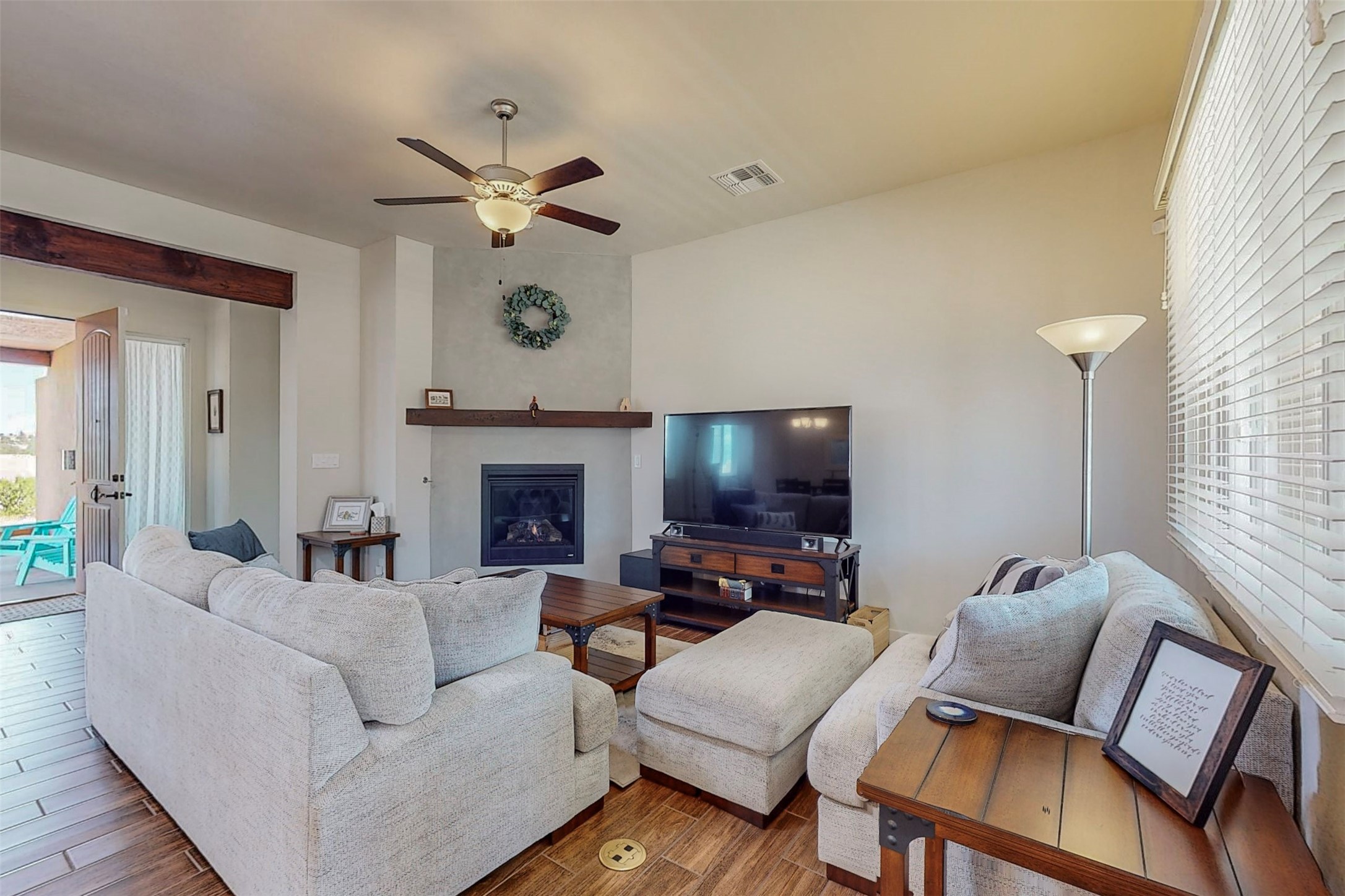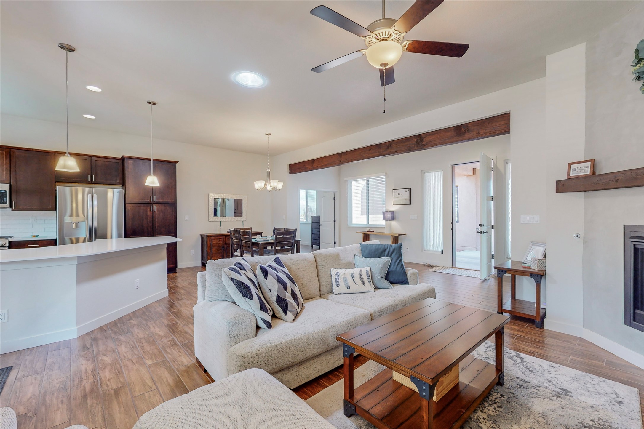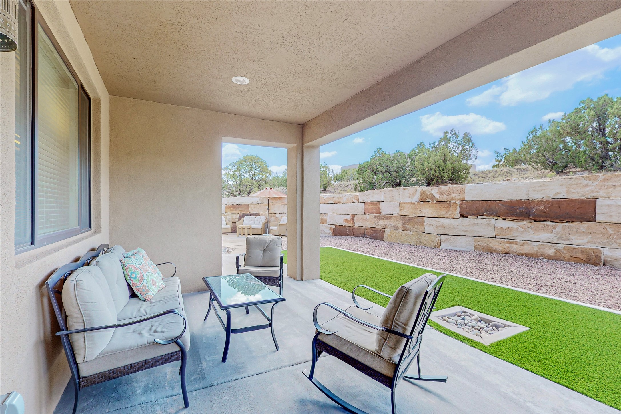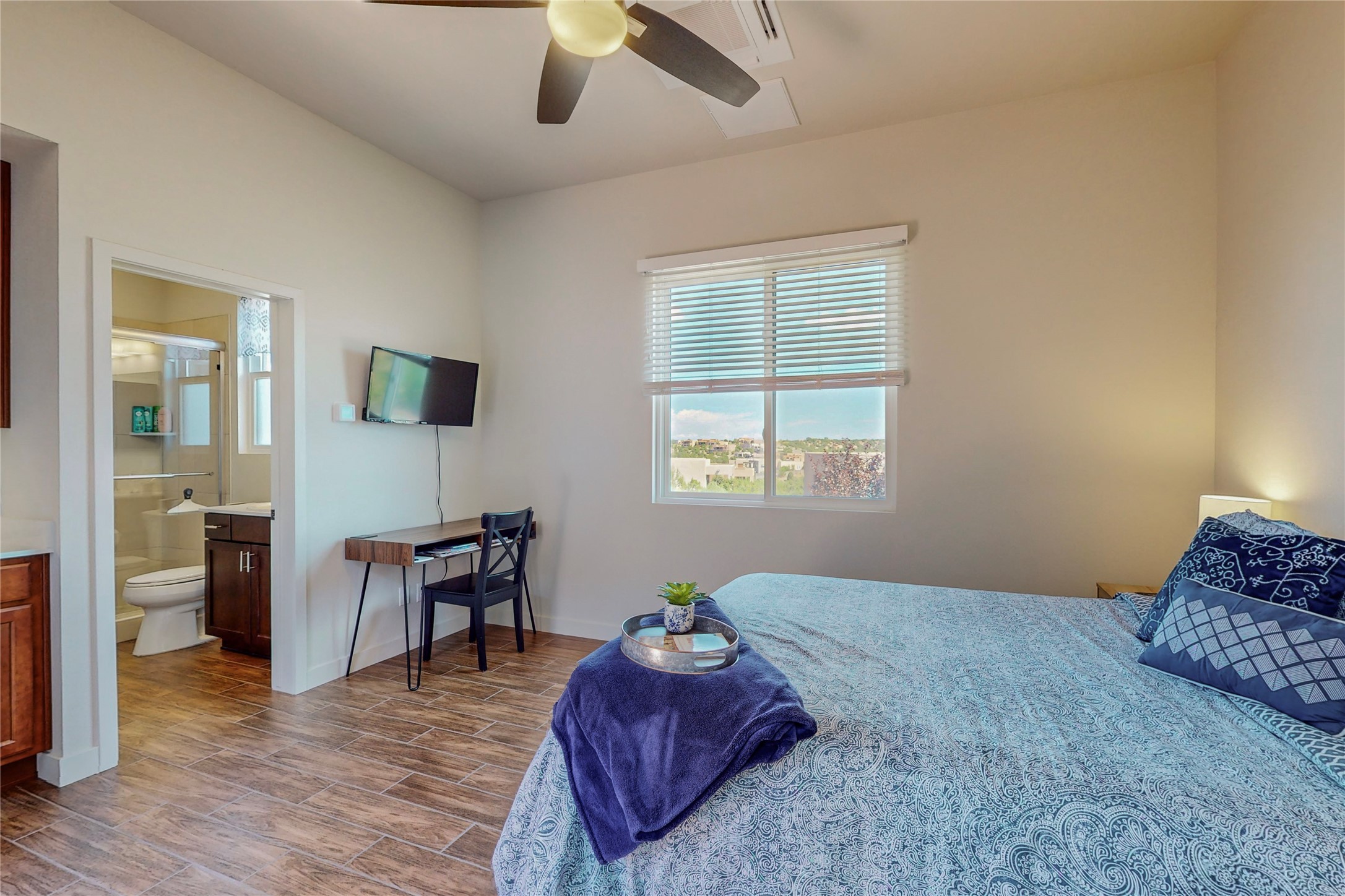 Looking for a newer single level home with a guest house and views? Welcome home to this meticulously maintained, immaculate, and warmly inviting home that was built in 2021 within the Tessera community. 7 Via Harena tastefully blends modern architecture with Santa Fe ambiance in a beautifully balanced way. The open concept floor plan permeates the Living Room, dining area and kitchen with light enhanced by high ceilings, showcasing comfortable seating areas, upgraded appliances and plenty of counter space. The two guest rooms and full bath are welcoming and nicely separated from the luxurious primary suite. Meticulousness doesn't end there as you transition to outside spaces which are aesthetically pleasing with precise landscaping, mountain views in the front and peaceful privacy in the back. Private yet easily accessible, the one-bedroom guest house with three-quarter bath is perfect for guests, a private office space or yoga studio. Added bonus features include a three-car garage, tankless hot water and a level two electric vehicle charger. Welcome home.