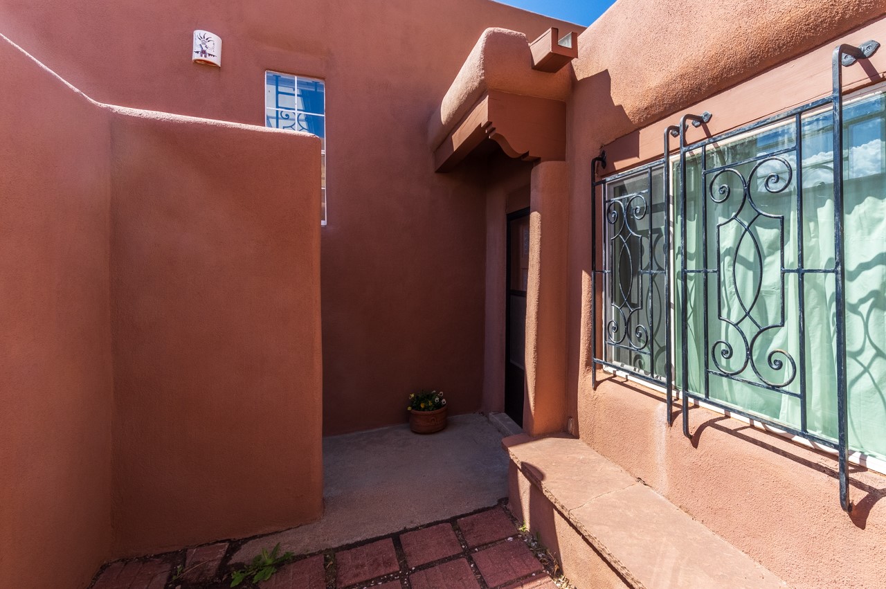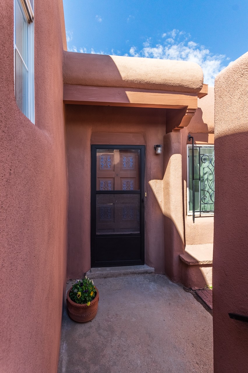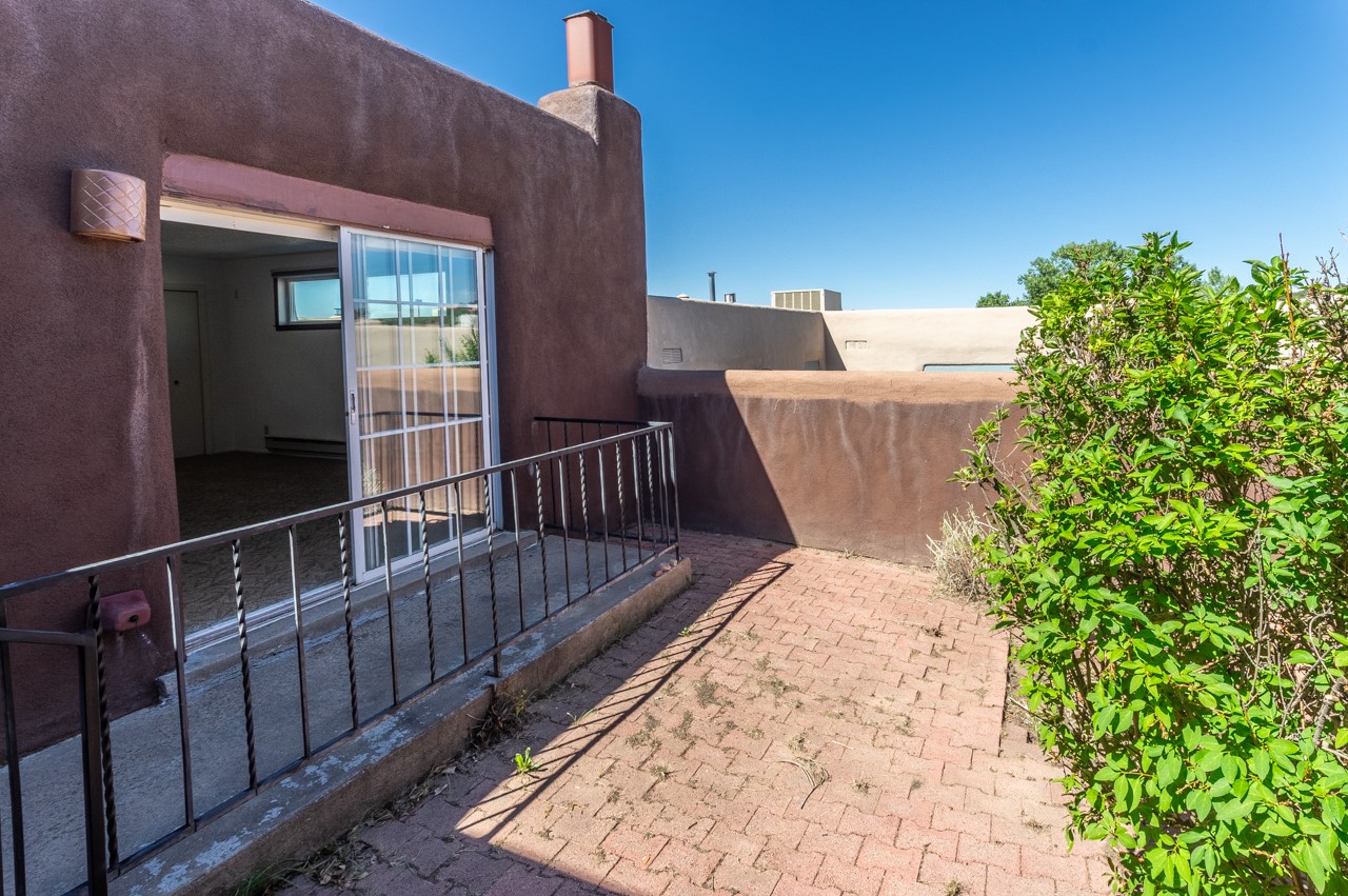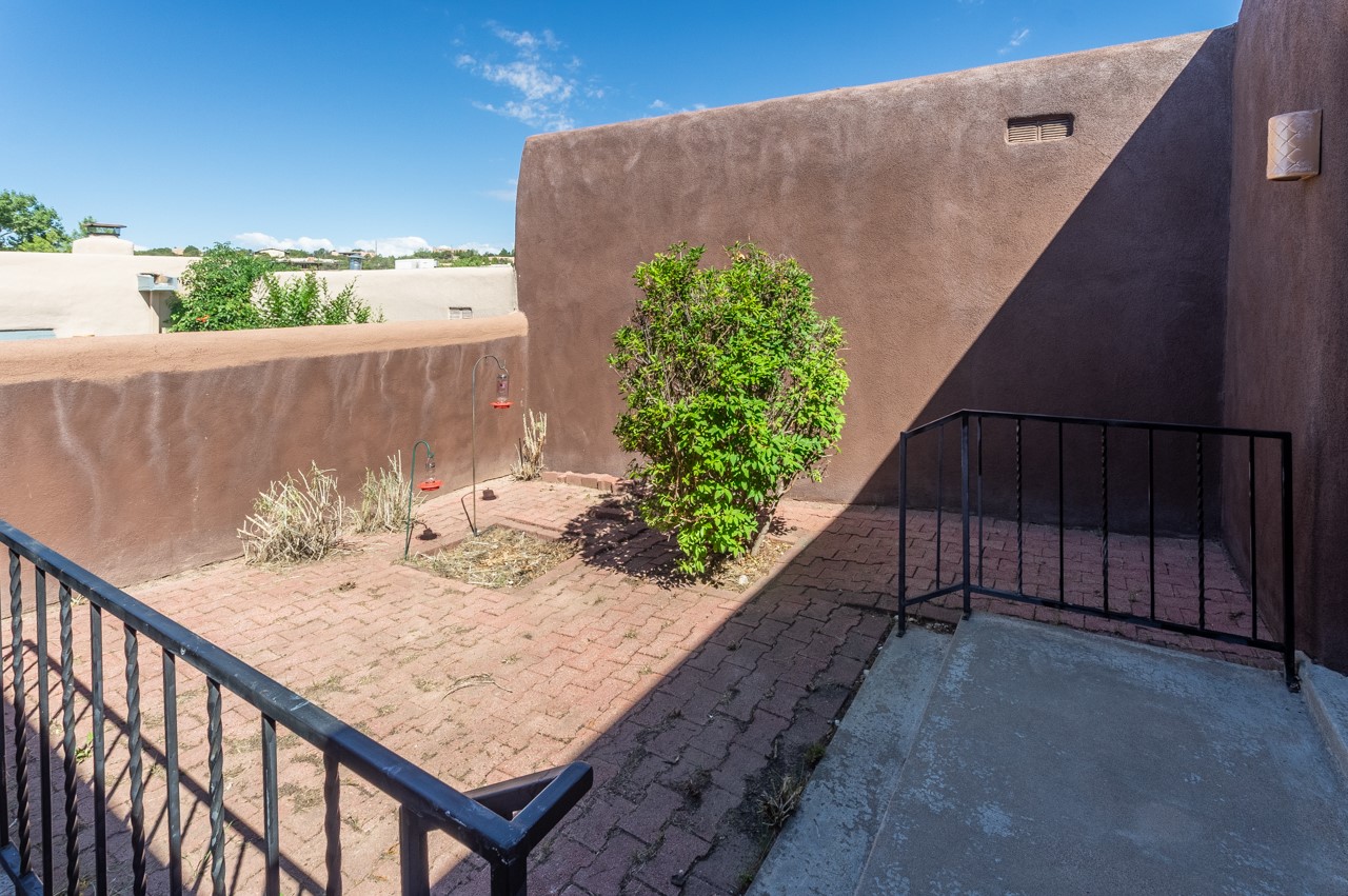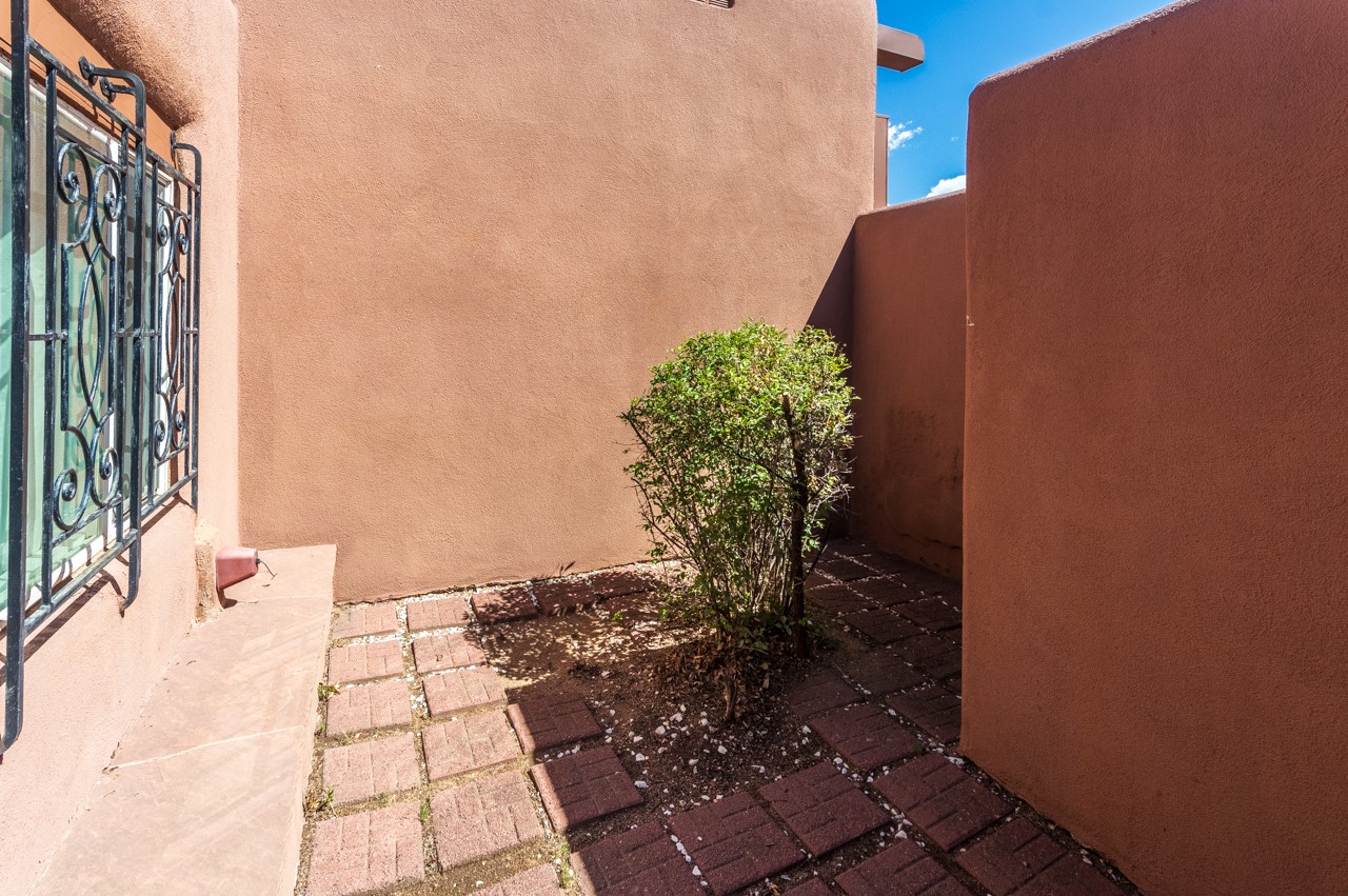 Valle del Sol townhome close to where you want to be in Santa Fe. Great walkability to downtown hot spots. The property has a private front courtyard and an enclosed back courtyard for lots of privacy while sitting out watching the sunsets.The home is ready for a fresh look but the tall ceiling in the living room has beautiful vigas and brick walls plus a kiva fireplace. The primary bedroom is oversized also with a kiva fireplace, lots of natural lighting, and a sliding door to the backyard. The secondary 3/4 bath in the hall has charming tilework and a skylight. There is also a formal dining room off the kitchen and open to the living room with one step down. The second bedroom also has a slider to the back courtyard.The kitchen has a small eating area and the laundry room is just off the kitchen with additional pantry space. It is one level in the main living space with steps down from the garage and the front entry.