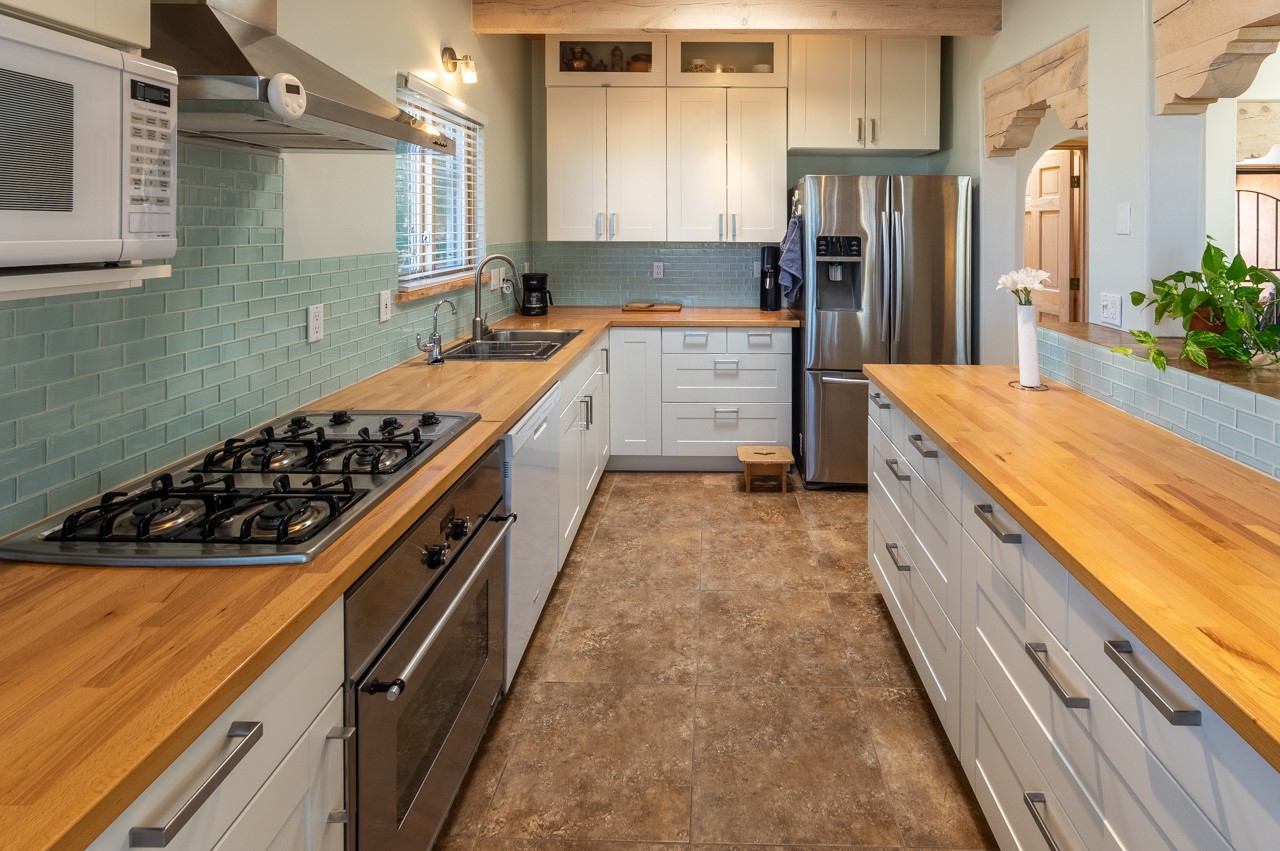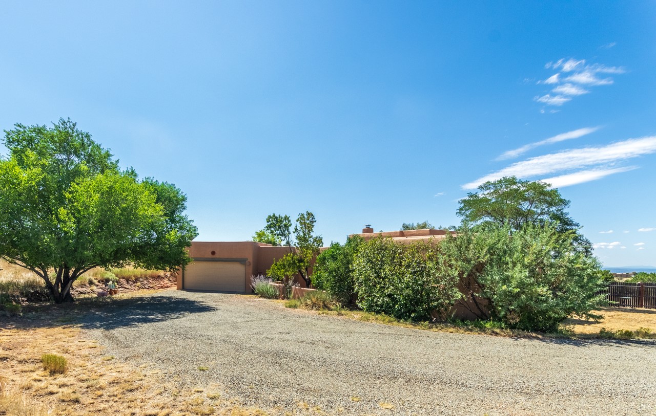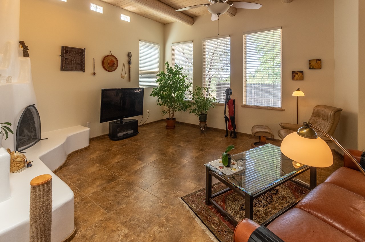Charming home move-in ready. Light and bright with a high ceiling in the main living room, kiva fireplace, and open to the kitchen. The kitchen is very inviting along with the eat-in dining space. The primary bedroom is oversized with a beautifully remodeled bath area and door to the backyard. The second bedroom is nicely sized and also has a door to the back and is set up currently as an office and exercise area. The third bedroom is cozy for guests and the hall bath has also been beautifully remodeled. The hall to the two-car garage has a stacked washer and dryer. The oversized garage has a workbench and closet containing the heating and hot water heater. The backyard facing the sunset is partially fenced for privacy and could be totally enclosed for pets.