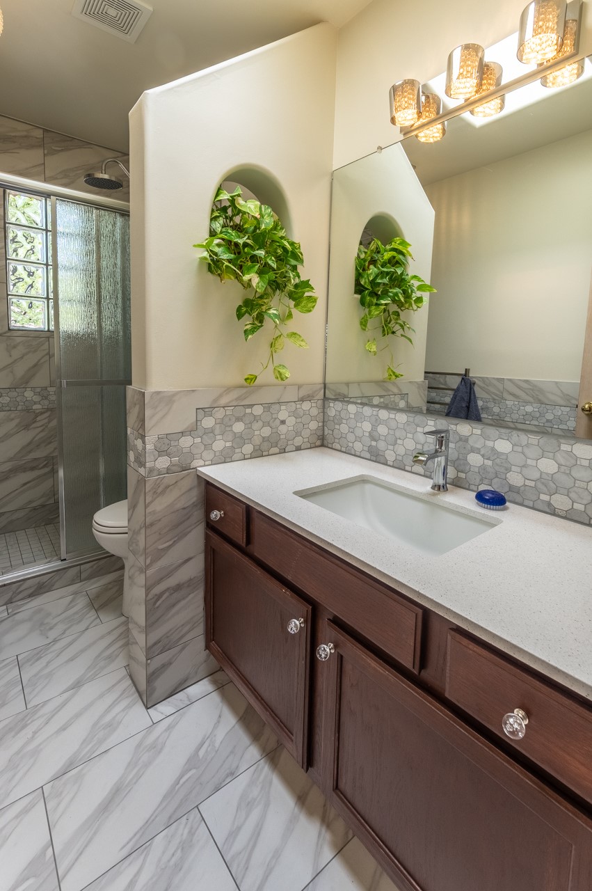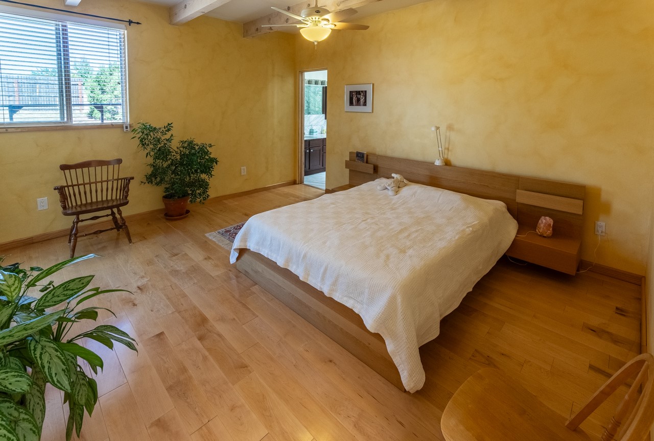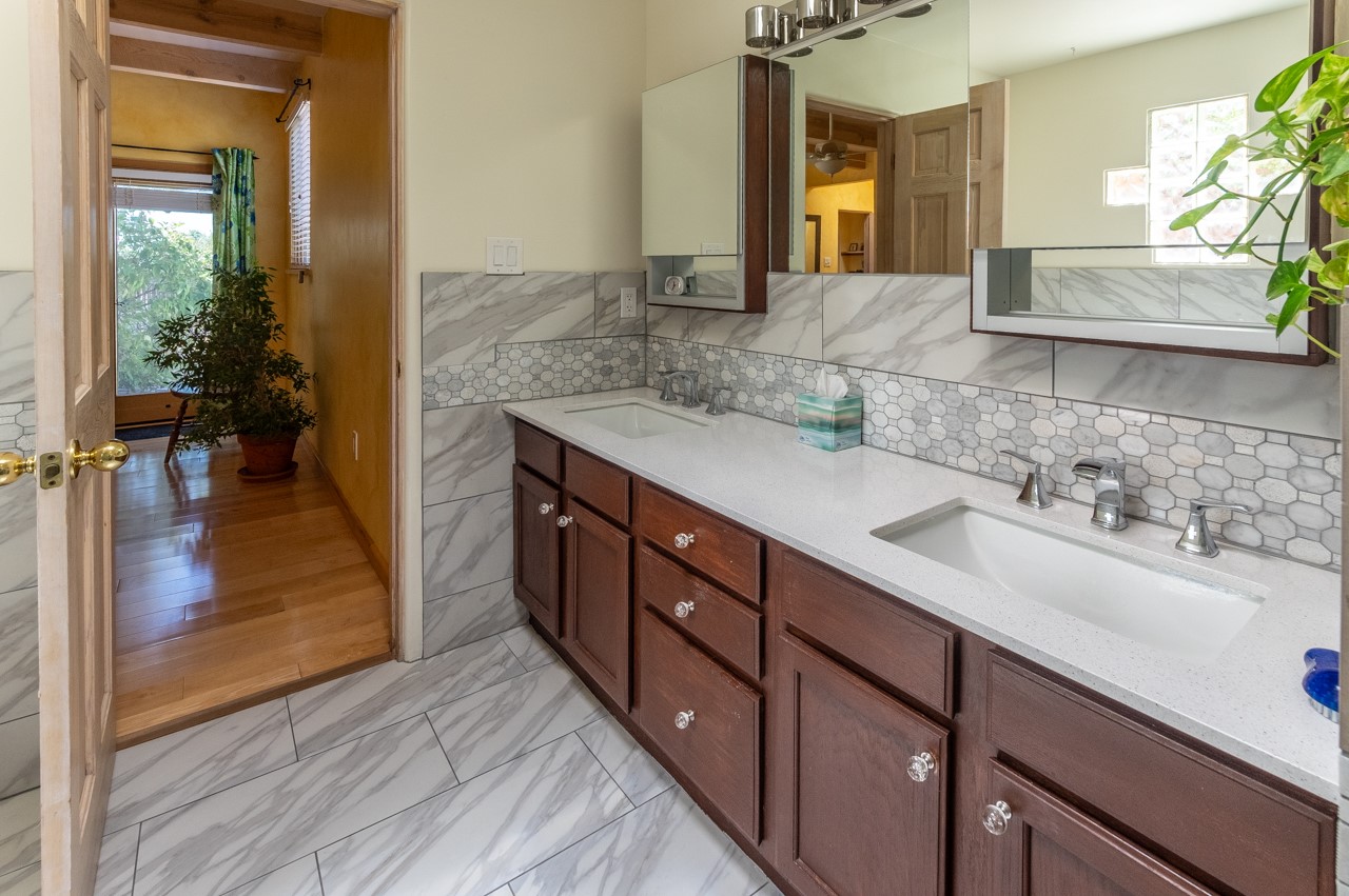 Charming home move-in ready. Light and bright with a high ceiling in the main living room, kiva fireplace, and open to the kitchen. The kitchen is very inviting along with the eat-in dining space. The primary bedroom is oversized with a beautifully remodeled bath area and door to the backyard. The second bedroom is nicely sized and also has a door to the back and is set up currently as an office and exercise area. The third bedroom is cozy for guests and the hall bath has also been beautifully remodeled. The hall to the two-car garage has a stacked washer and dryer. The oversized garage has a workbench and closet containing the heating and hot water heater. The backyard facing the sunset is partially fenced for privacy and could be totally enclosed for pets.