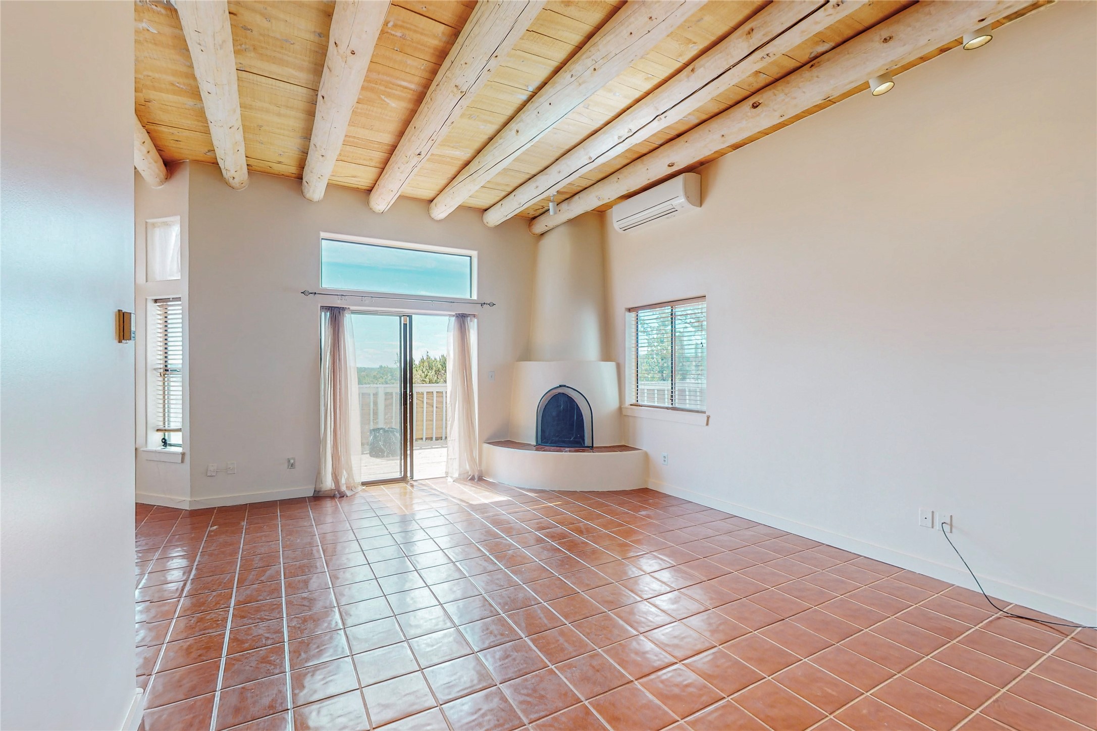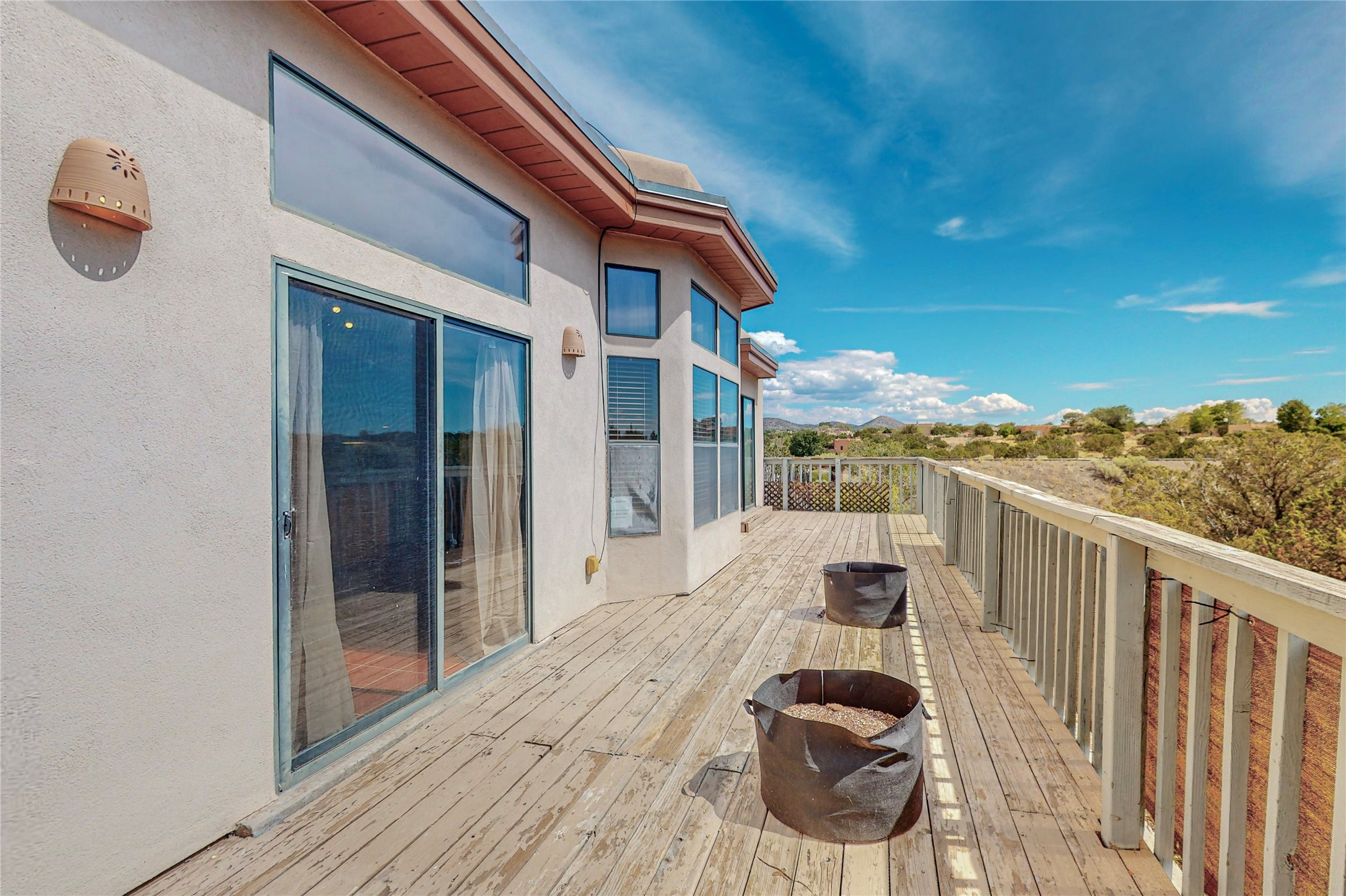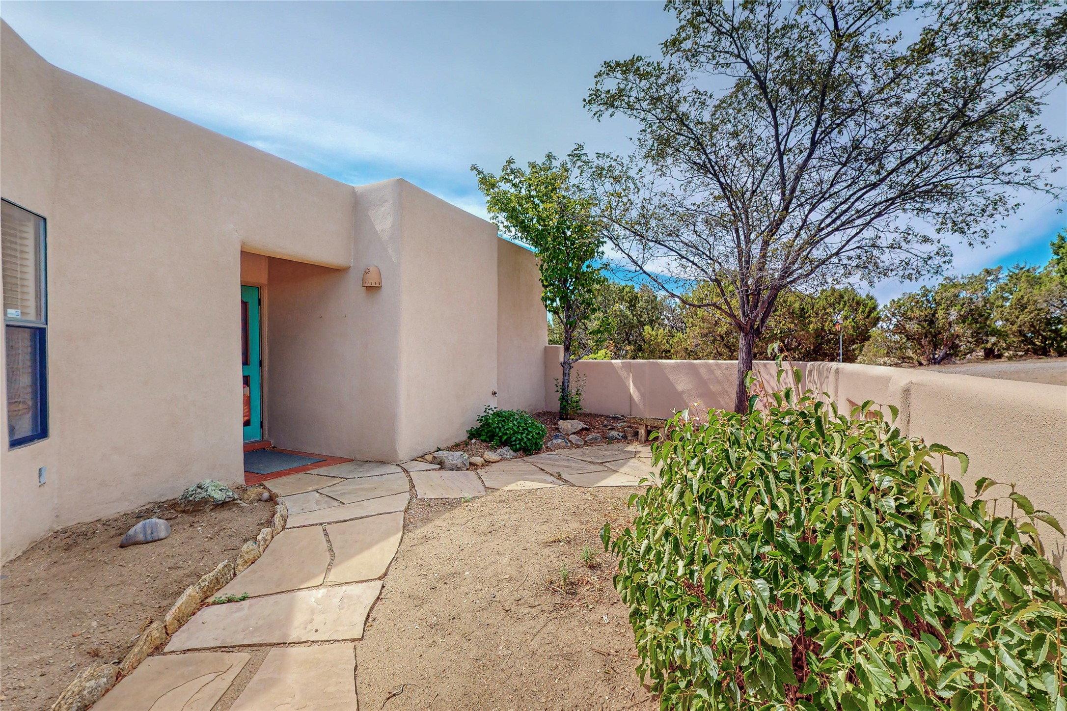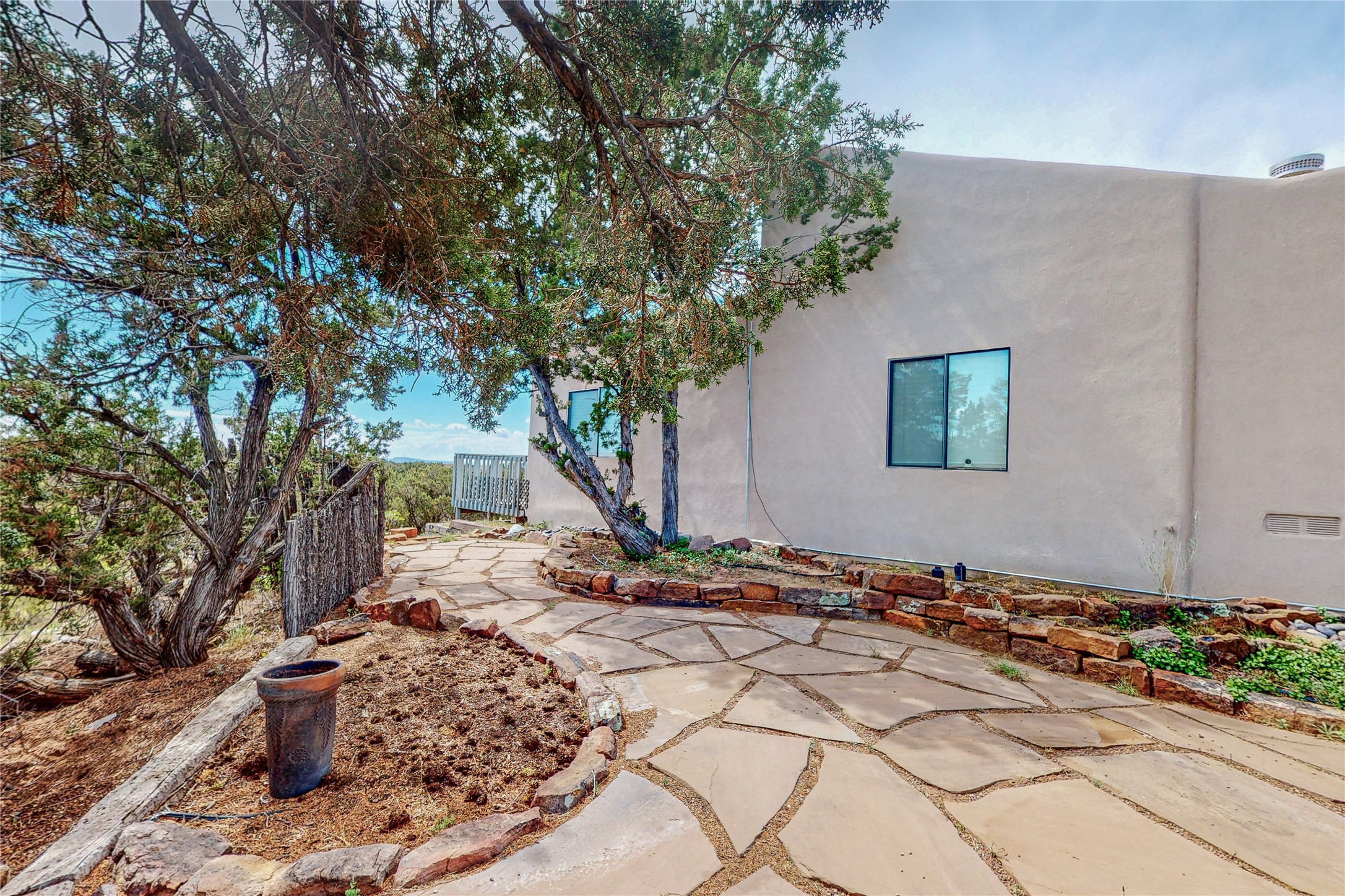 A rare exceptionally semi-private location with no thru streets and minimal ambient noise. Lot backs to a large greenbelt with direct access to social paths and the rail trail. East side of lot borders a retired historic railroad spur that runs between the Santa Fe Railyard and Lamy. The spur and subsequent train cars are occasionally used for slow-roll excursions and Hollywood movie sets (Oppenheimer). The east side of the home also features a flagstone patio with lovely views. The quaint home offers a super bright and light open flow passive solar design with high ceilings adding to spacious feel. Flexible floor plan. Great separation between owner's suite and the 2 guest bedrooms. Livingroom with corner kiva fireplace can be converted back to gas. Freshly painted throughout the interior; the canales, stucco and overhangs newly maintained. All appliances are newer, along with chef sink. New lighting in kitchen, foyer, & bathrooms.Three mini-splits were installed in 2021 for extra heating and cooling. There is a 2-car garage with circular driveway and guest parking. A large wood deck spans the length of the home. All this plus Eldorado amenities, Senior Center, Library, local shopping and only minutes into Santa Fe.