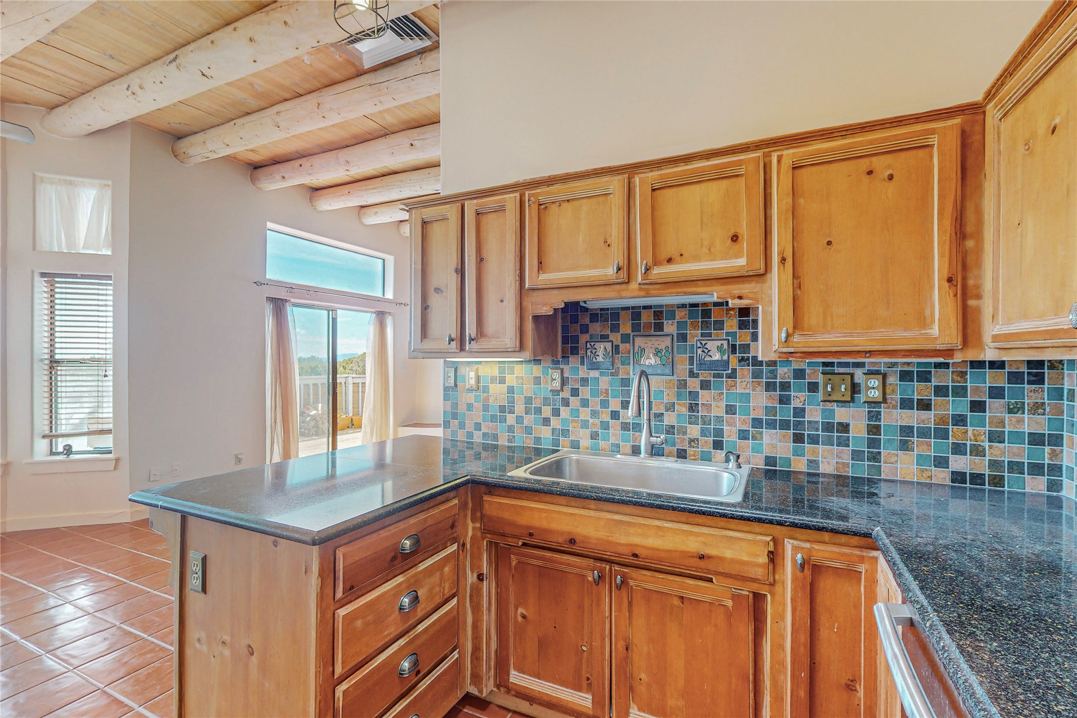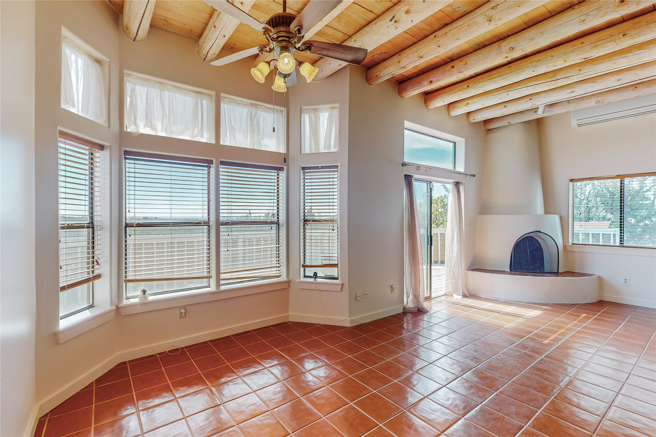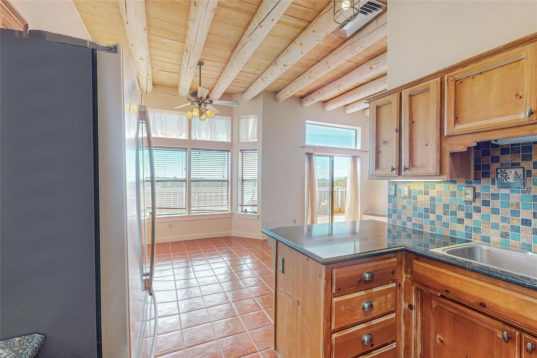 A rare exceptionally semi-private location with no thru streets and minimal ambient noise. Lot backs to a large greenbelt with direct access to social paths and the rail trail. East side of lot borders a retired historic railroad spur that runs between the Santa Fe Railyard and Lamy. The spur and subsequent train cars are occasionally used for slow-roll excursions and Hollywood movie sets (Oppenheimer). The east side of the home also features a flagstone patio with lovely views. The quaint home offers a super bright and light open flow passive solar design with high ceilings adding to spacious feel. Flexible floor plan. Great separation between owner's suite and the 2 guest bedrooms. Livingroom with corner kiva fireplace can be converted back to gas. Freshly painted throughout the interior; the canales, stucco and overhangs newly maintained. All appliances are newer, along with chef sink. New lighting in kitchen, foyer, & bathrooms.Three mini-splits were installed in 2021 for extra heating and cooling. There is a 2-car garage with circular driveway and guest parking. A large wood deck spans the length of the home. All this plus Eldorado amenities, Senior Center, Library, local shopping and only minutes into Santa Fe.
