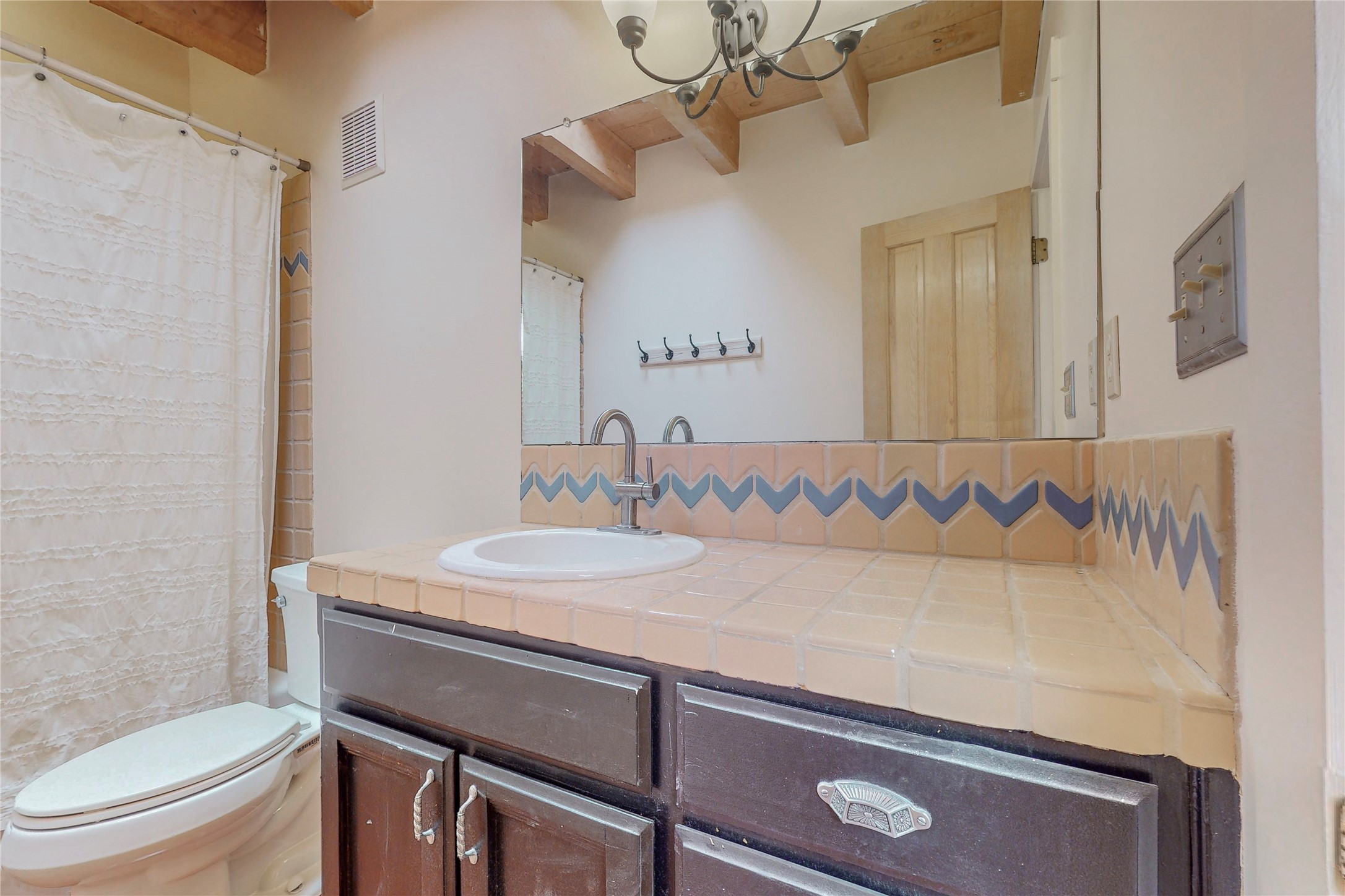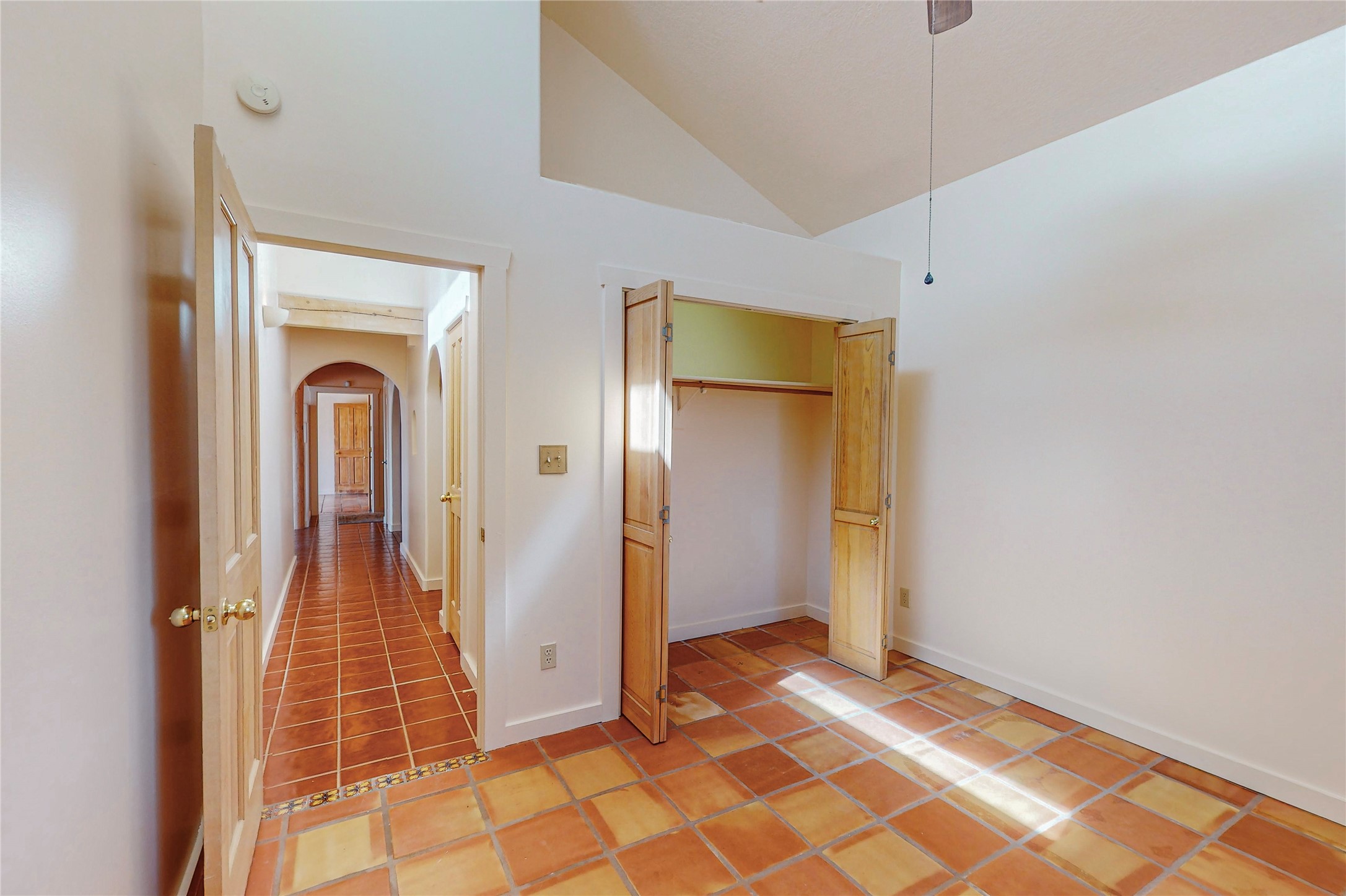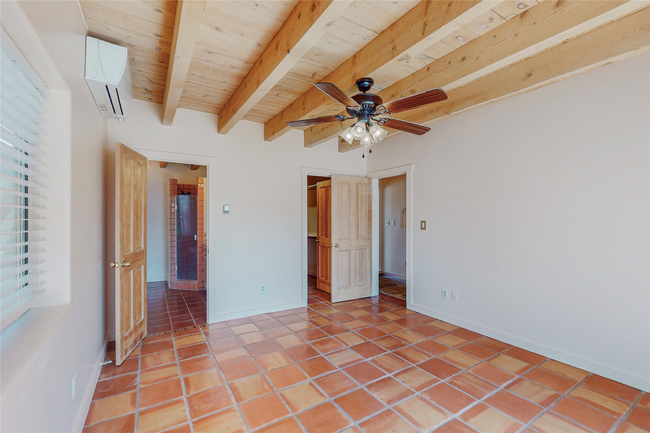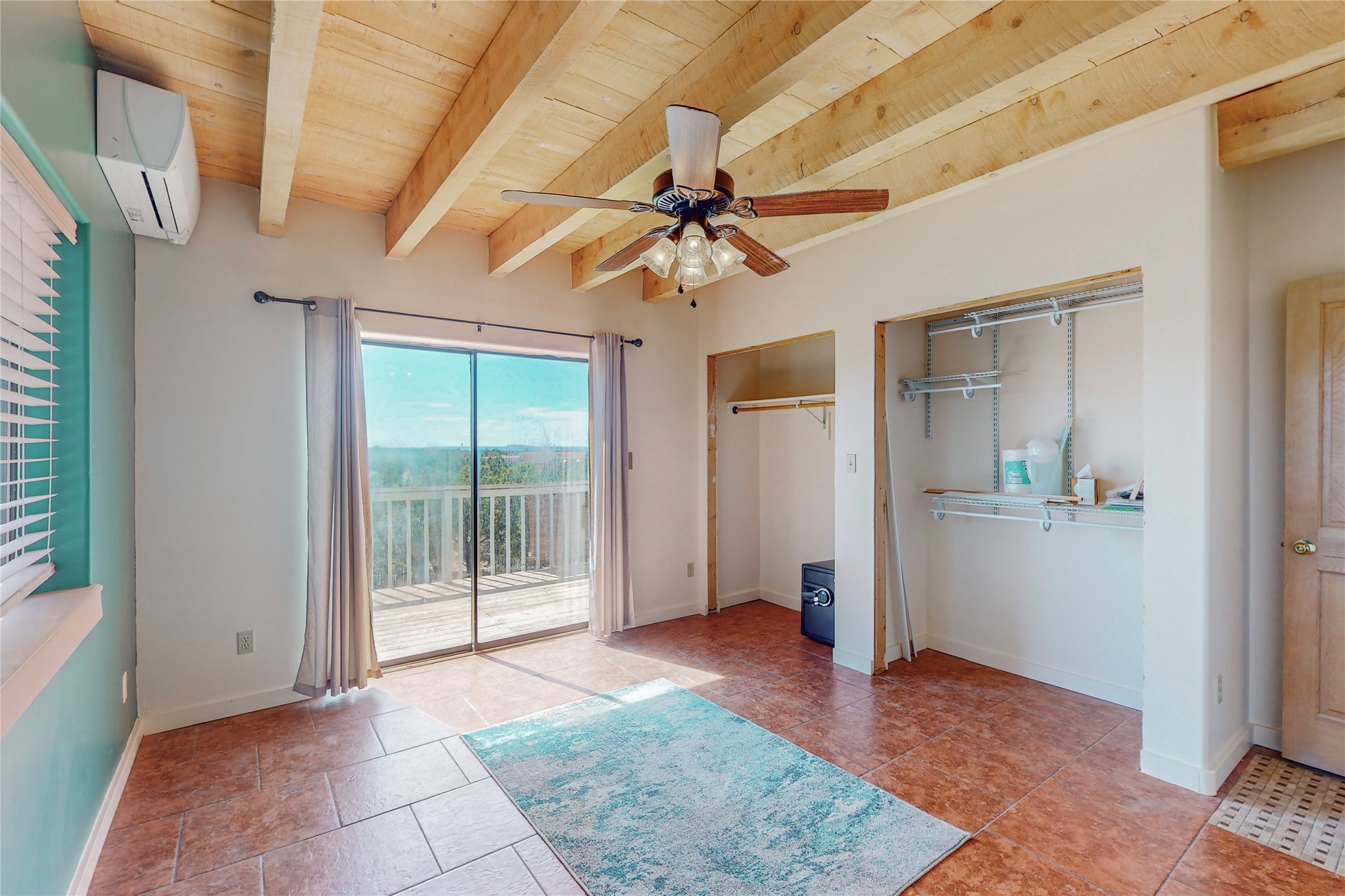A rare exceptionally semi-private location with no thru streets and minimal ambient noise. Lot backs to a large greenbelt with direct access to social paths and the rail trail. East side of lot borders a retired historic railroad spur that runs between the Santa Fe Railyard and Lamy. The spur and subsequent train cars are occasionally used for slow-roll excursions and Hollywood movie sets (Oppenheimer). The east side of the home also features a flagstone patio with lovely views. The quaint home offers a super bright and light open flow passive solar design with high ceilings adding to spacious feel. Flexible floor plan. Great separation between owner's suite and the 2 guest bedrooms. Livingroom with corner kiva fireplace can be converted back to gas. Freshly painted throughout the interior; the canales, stucco and overhangs newly maintained. All appliances are newer, along with chef sink. New lighting in kitchen, foyer, & bathrooms.Three mini-splits were installed in 2021 for extra heating and cooling. There is a 2-car garage with circular driveway and guest parking. A large wood deck spans the length of the home. All this plus Eldorado amenities, Senior Center, Library, local shopping and only minutes into Santa Fe.