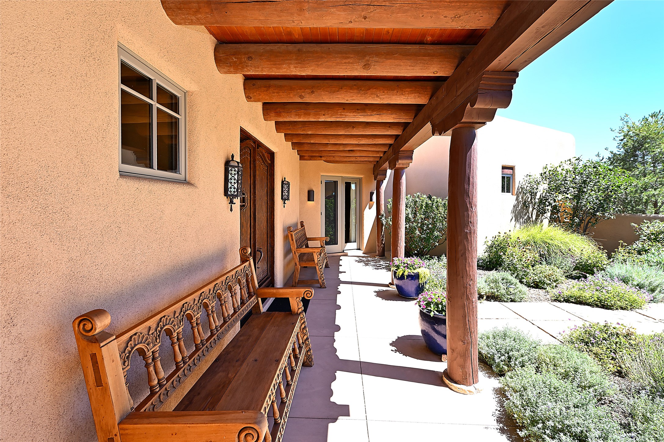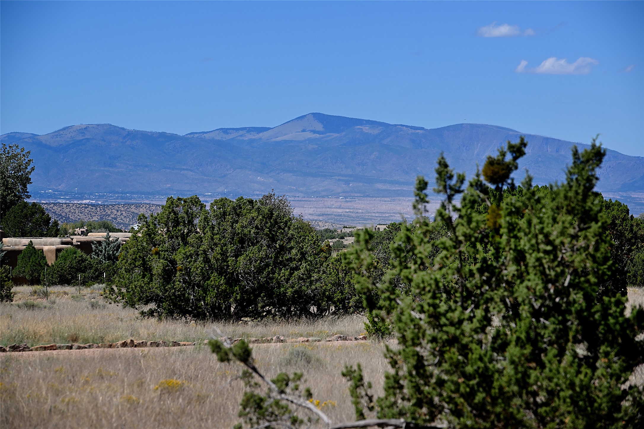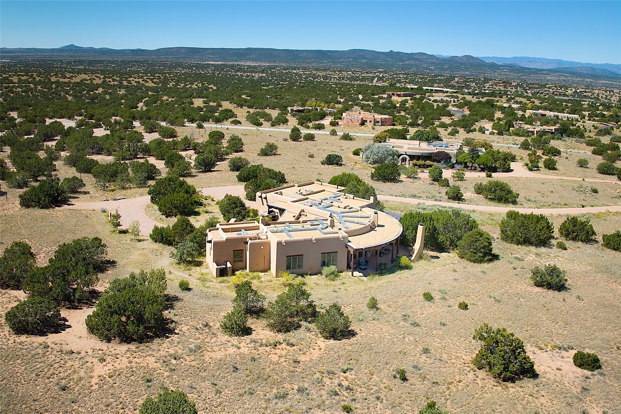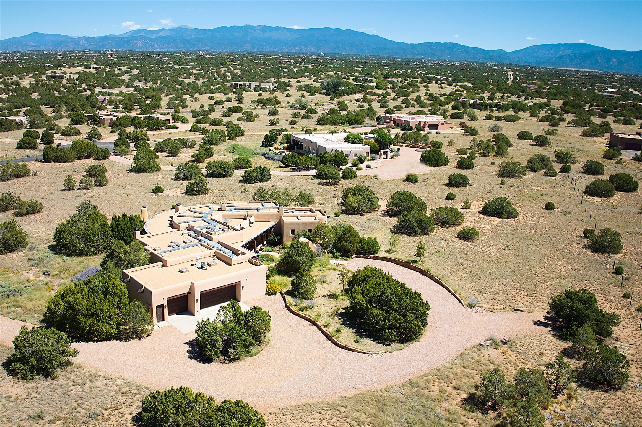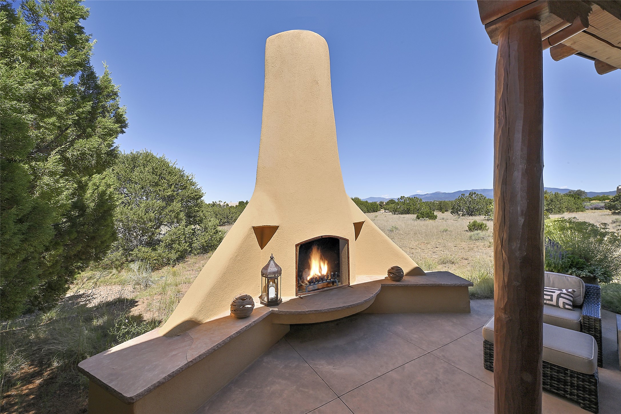 Masterfully sited 3 bedroom 2.5 bath Pueblo style home with a spectacular panorama of the Jemez and Sangre de Cristo mountains. Single level, no interior steps. Traditional Southwest ceiling treatments including radiating vigas and plastered ceilings, hand-troweled, pigmented plaster walls and skylights work in harmony to create a warm and comfortable home. Slate tile and wood floors. Double custom wood door opens to grand rotunda with 2 lighted art nichos with chiseled-edged flagstone sills. Spacious curved living/dining room providing 180-degree scenic views. Large gas-fueled fireplace with custom iron screens and beaver-chipped mantel. Chef's kitchen is appointed with ample lower/upper cabinets, granite countertops with decorative harlequin tile backsplash, Wolf double ovens and cooktop with 4 gas burners, griddle and grill, Sub-Zero refrigerator, 2 dishwashers, 2 sinks in kitchen, 2 wine fridges/racks in kitchen, and center island. Primary suite includes sitting area with kiva fireplace, a custom designed walk-in closet and luxurious bath with free-standing tub and separate walk-in shower. Split bedroom plan offers privacy for owners and guests. Separate office with built-ins and kiva fireplace. Ideal home for year-round outdoor living and dining with both winter and summer portal. Outdoor kiva and built-in grill. Enclosed entry courtyard with lush landscaping. 3-car heated garage. Convenient location with easy access to 599 and all the cultural amenities of Santa Fe.