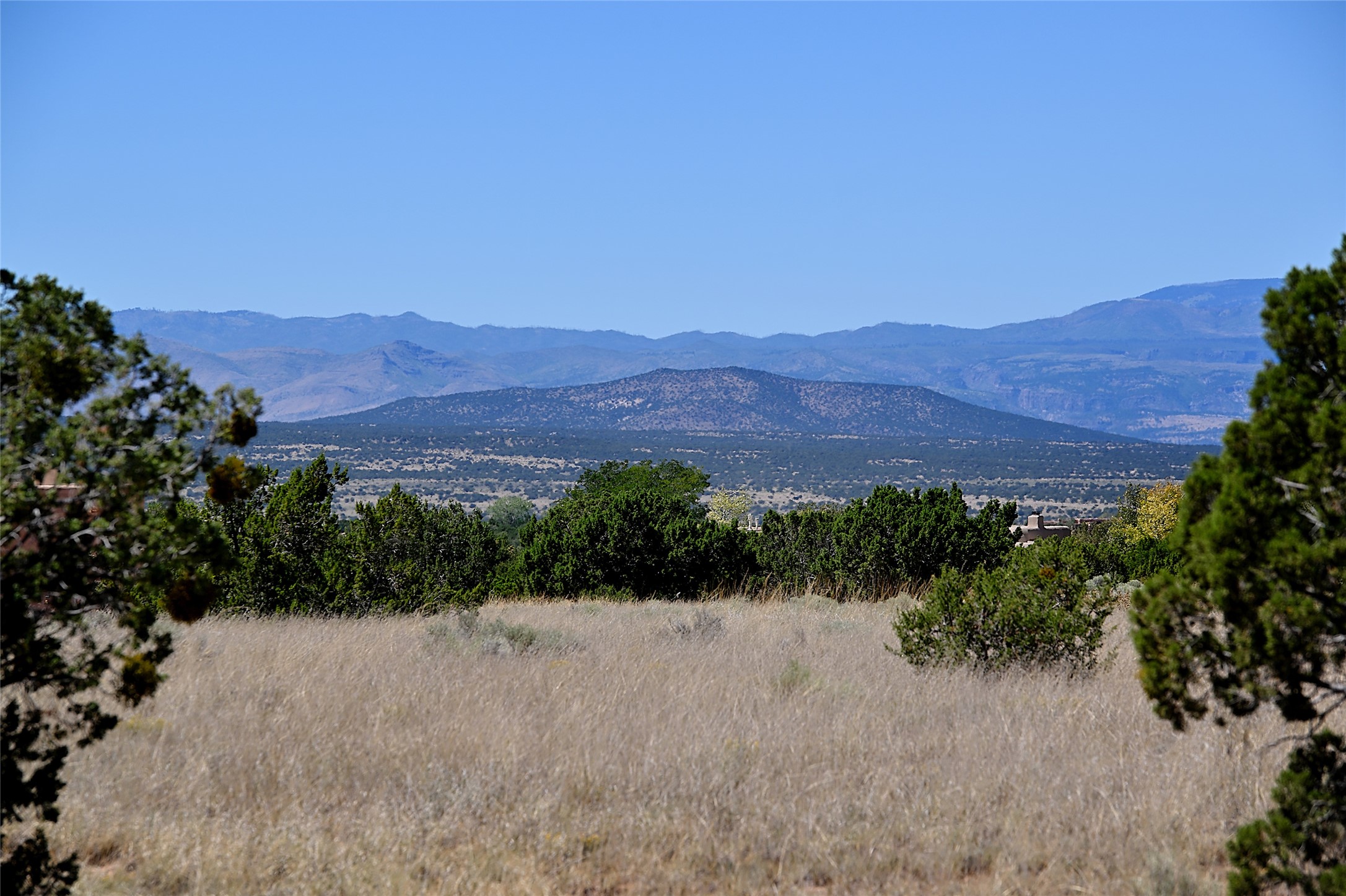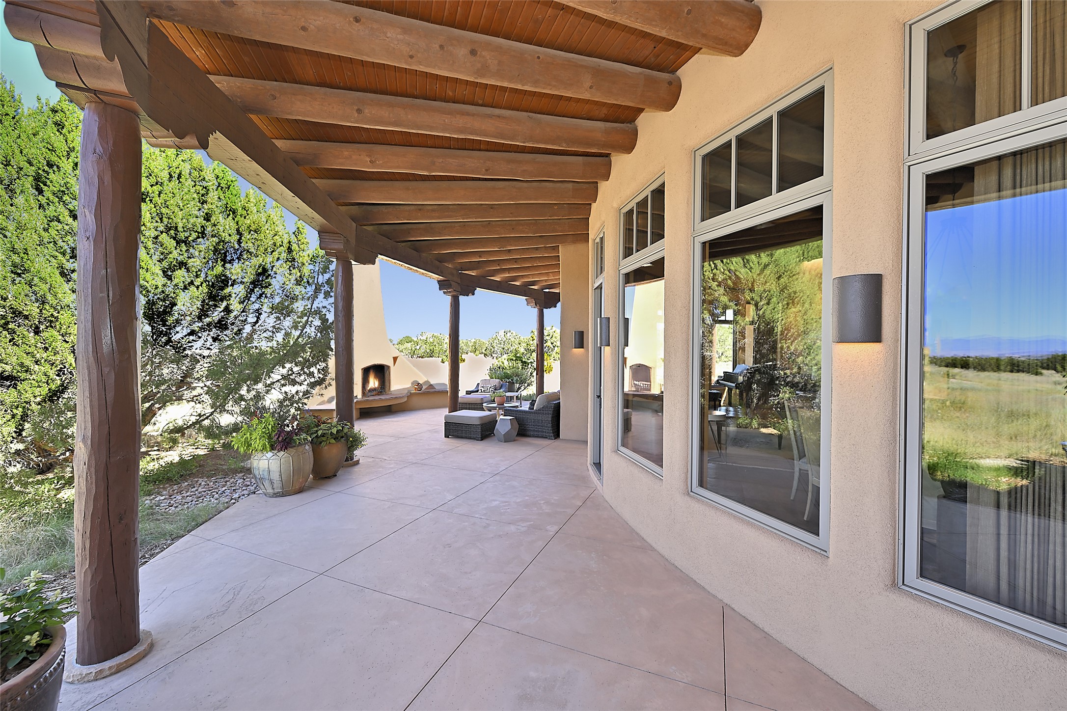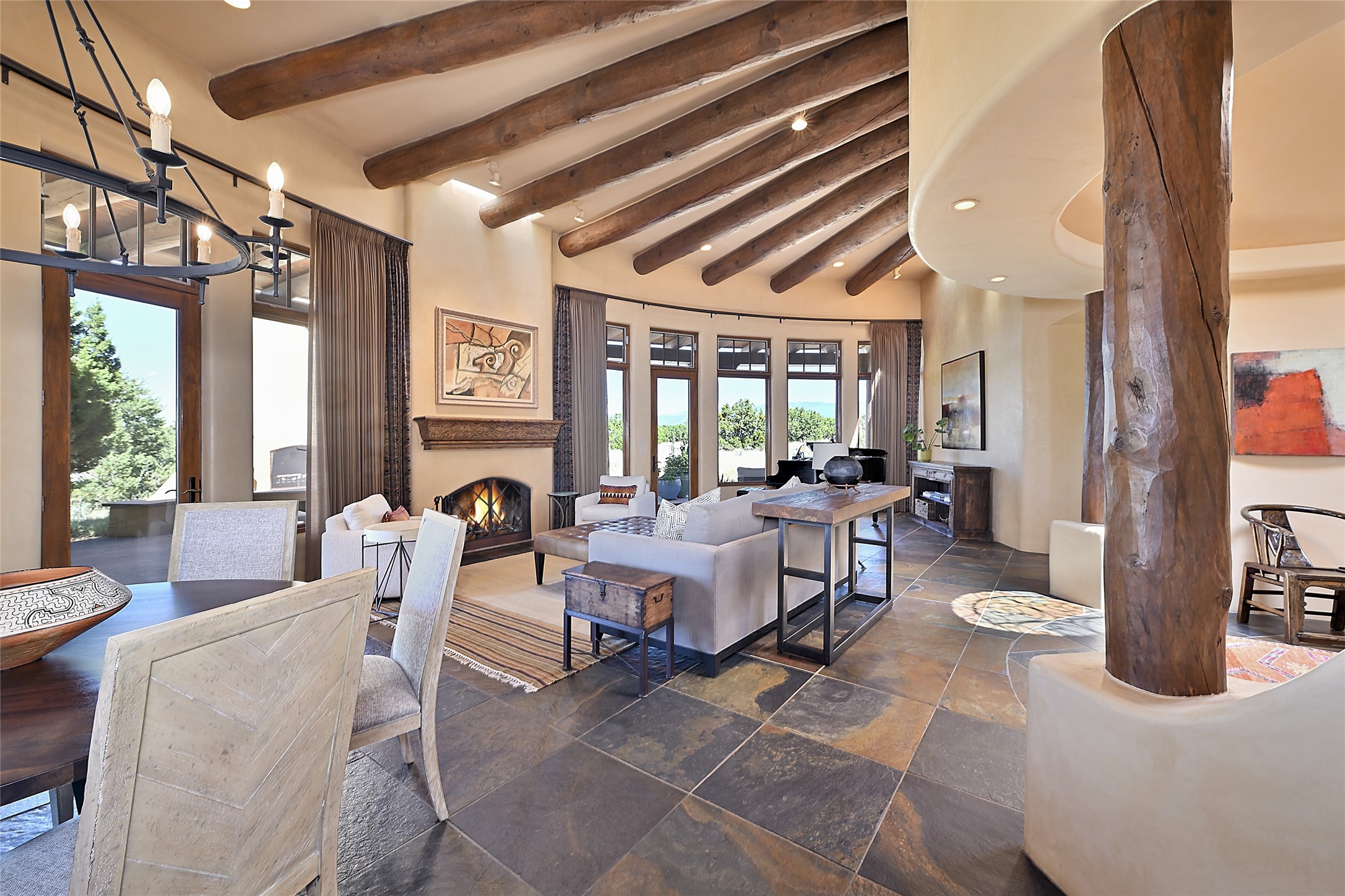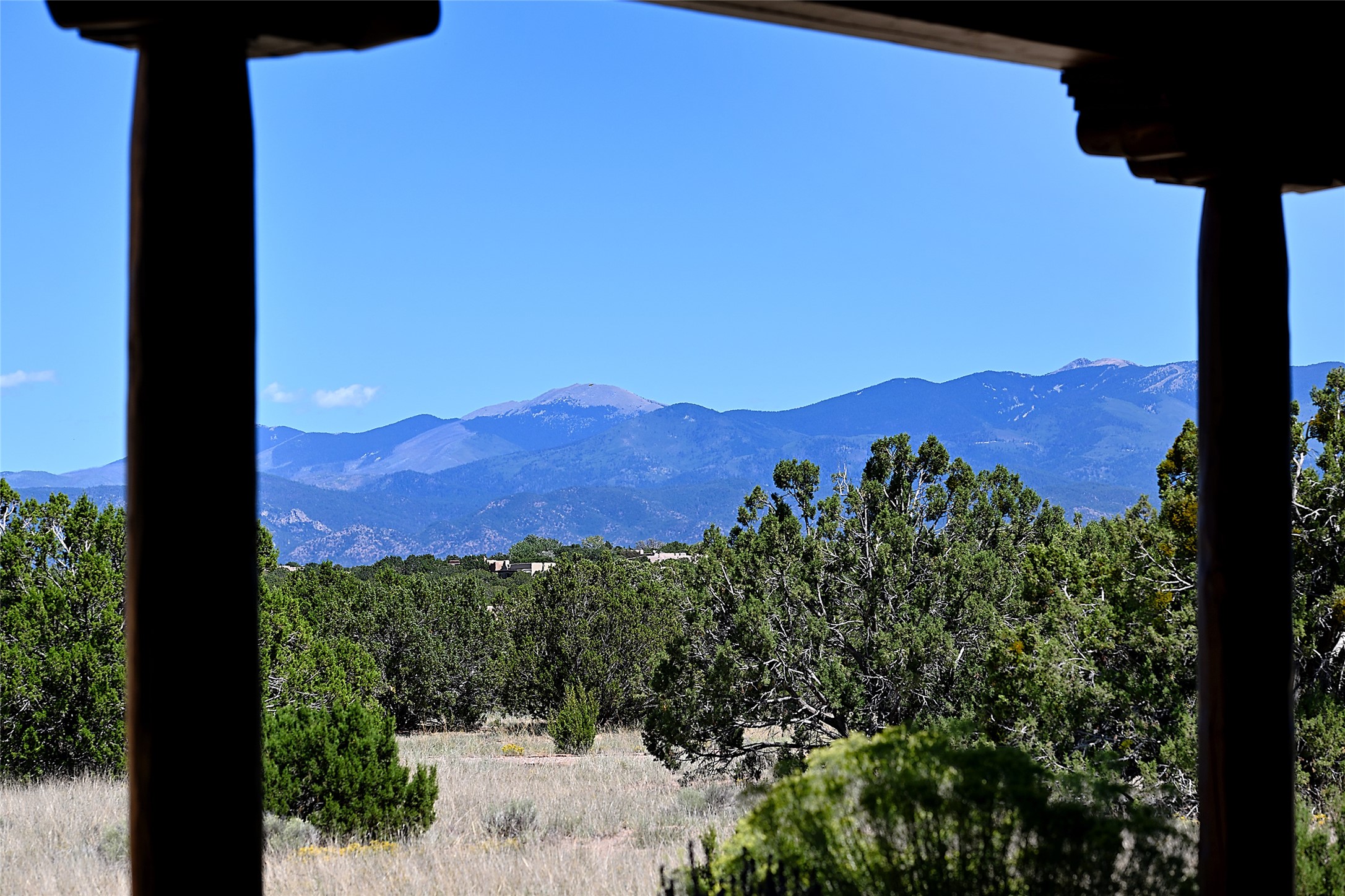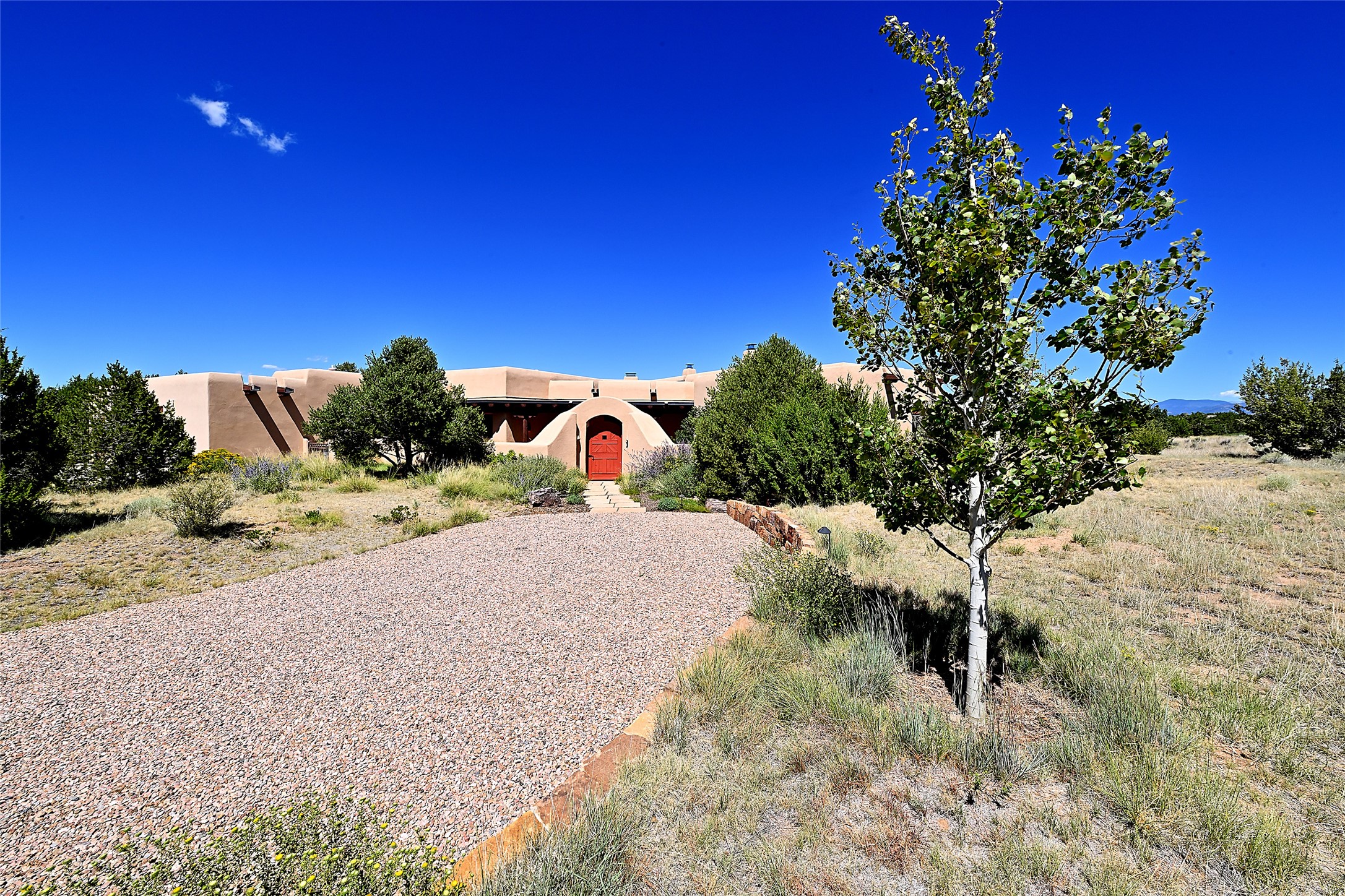 Masterfully sited 3 bedroom 2.5 bath Pueblo style home with a spectacular panorama of the Jemez and Sangre de Cristo mountains. Single level, no interior steps. Traditional Southwest ceiling treatments including radiating vigas and plastered ceilings, hand-troweled, pigmented plaster walls and skylights work in harmony to create a warm and comfortable home. Slate tile and wood floors. Double custom wood door opens to grand rotunda with 2 lighted art nichos with chiseled-edged flagstone sills. Spacious curved living/dining room providing 180-degree scenic views. Large gas-fueled fireplace with custom iron screens and beaver-chipped mantel. Chef's kitchen is appointed with ample lower/upper cabinets, granite countertops with decorative harlequin tile backsplash, Wolf double ovens and cooktop with 4 gas burners, griddle and grill, Sub-Zero refrigerator, 2 dishwashers, 2 sinks in kitchen, 2 wine fridges/racks in kitchen, and center island. Primary suite includes sitting area with kiva fireplace, a custom designed walk-in closet and luxurious bath with free-standing tub and separate walk-in shower. Split bedroom plan offers privacy for owners and guests. Separate office with built-ins and kiva fireplace. Ideal home for year-round outdoor living and dining with both winter and summer portal. Outdoor kiva and built-in grill. Enclosed entry courtyard with lush landscaping. 3-car heated garage. Convenient location with easy access to 599 and all the cultural amenities of Santa Fe.