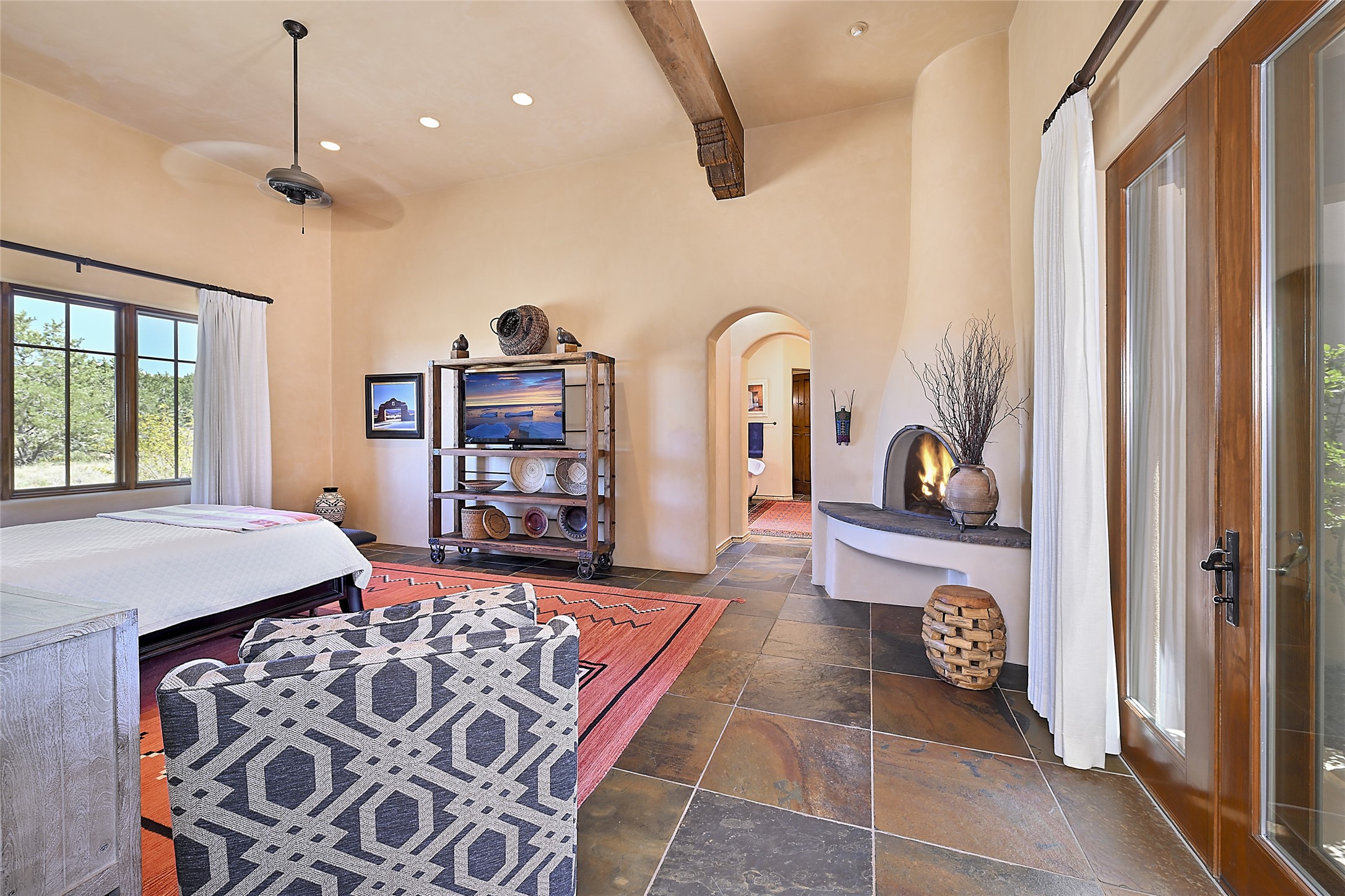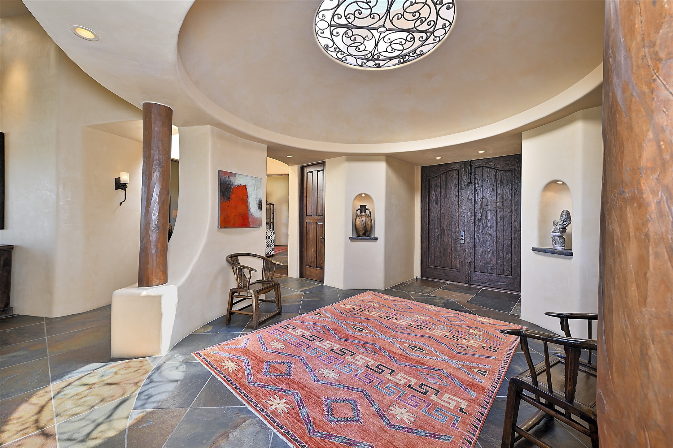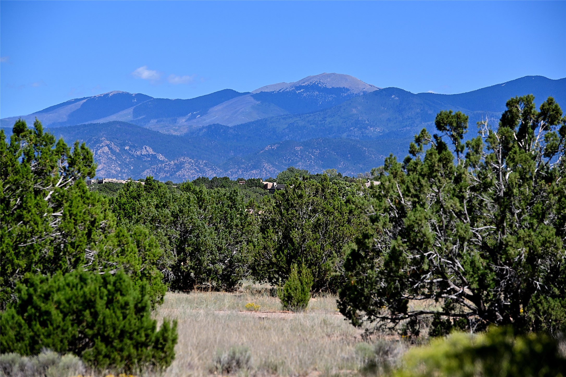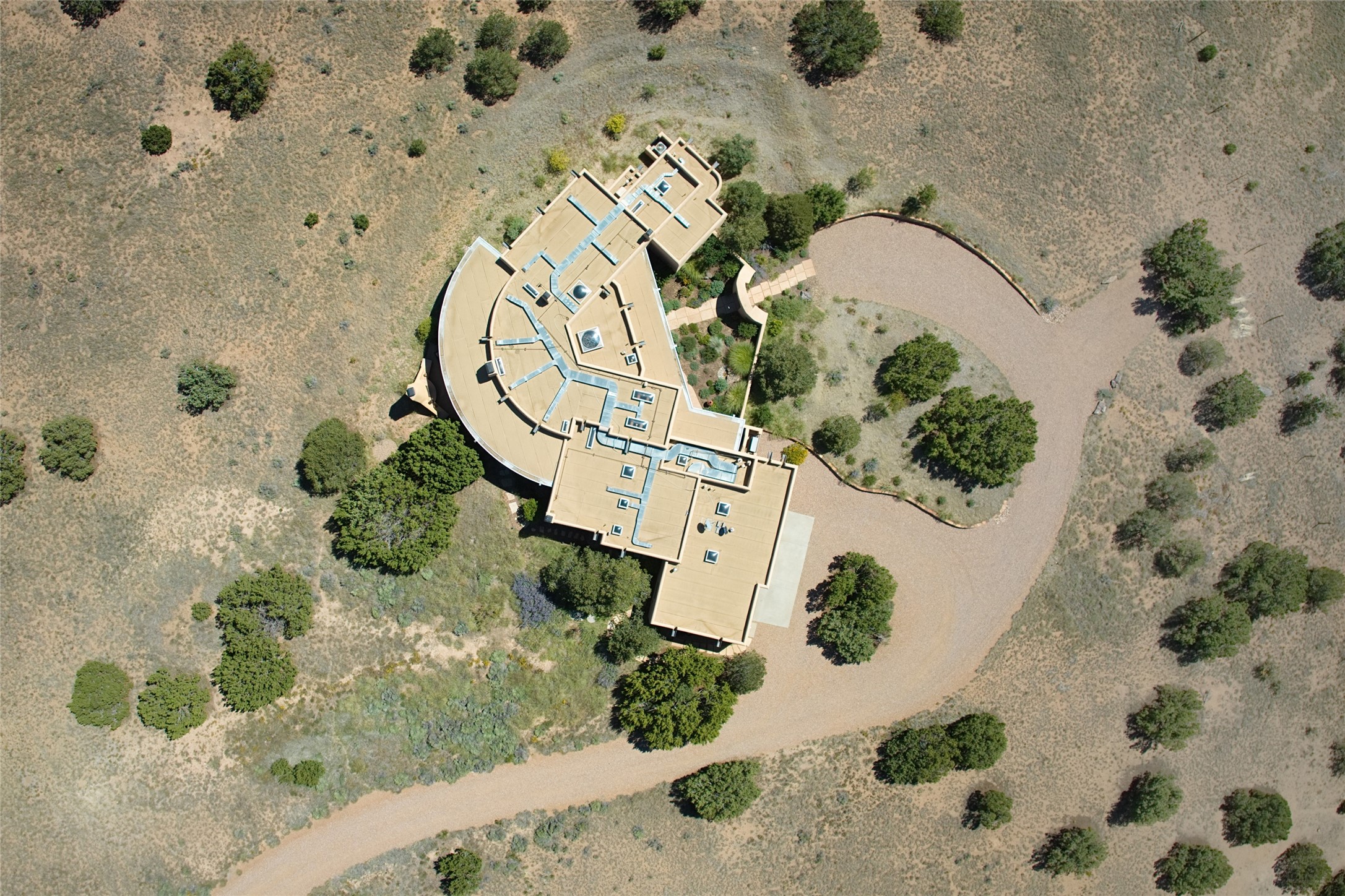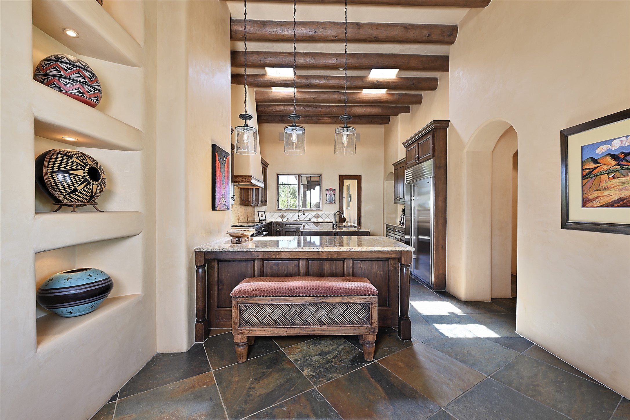 Masterfully sited 3 bedroom 2.5 bath Pueblo style home with a spectacular panorama of the Jemez and Sangre de Cristo mountains. Single level, no interior steps. Traditional Southwest ceiling treatments including radiating vigas and plastered ceilings, hand-troweled, pigmented plaster walls and skylights work in harmony to create a warm and comfortable home. Slate tile and wood floors. Double custom wood door opens to grand rotunda with 2 lighted art nichos with chiseled-edged flagstone sills. Spacious curved living/dining room providing 180-degree scenic views. Large gas-fueled fireplace with custom iron screens and beaver-chipped mantel. Chef's kitchen is appointed with ample lower/upper cabinets, granite countertops with decorative harlequin tile backsplash, Wolf double ovens and cooktop with 4 gas burners, griddle and grill, Sub-Zero refrigerator, 2 dishwashers, 2 sinks in kitchen, 2 wine fridges/racks in kitchen, and center island. Primary suite includes sitting area with kiva fireplace, a custom designed walk-in closet and luxurious bath with free-standing tub and separate walk-in shower. Split bedroom plan offers privacy for owners and guests. Separate office with built-ins and kiva fireplace. Ideal home for year-round outdoor living and dining with both winter and summer portal. Outdoor kiva and built-in grill. Enclosed entry courtyard with lush landscaping. 3-car heated garage. Convenient location with easy access to 599 and all the cultural amenities of Santa Fe.