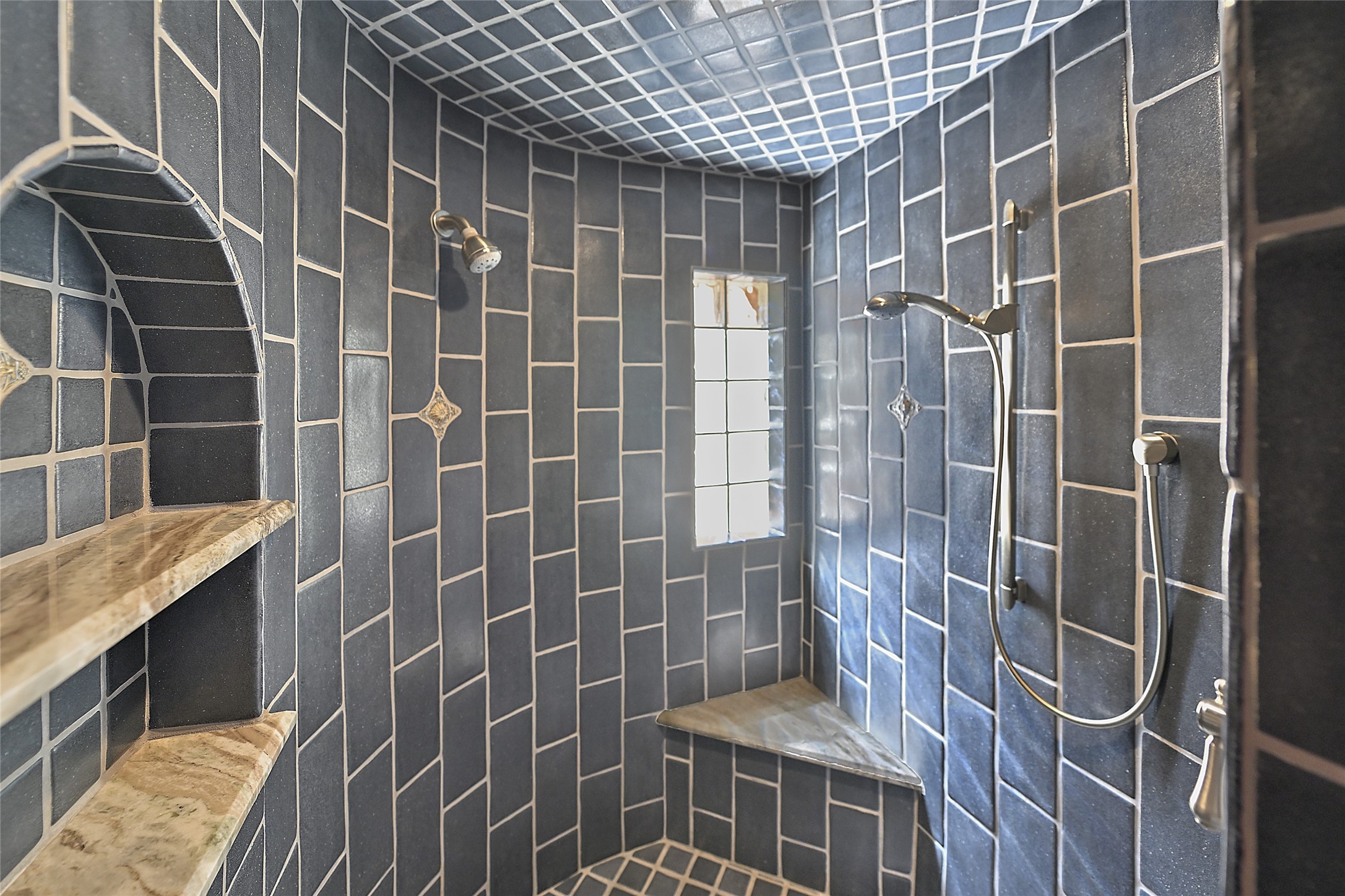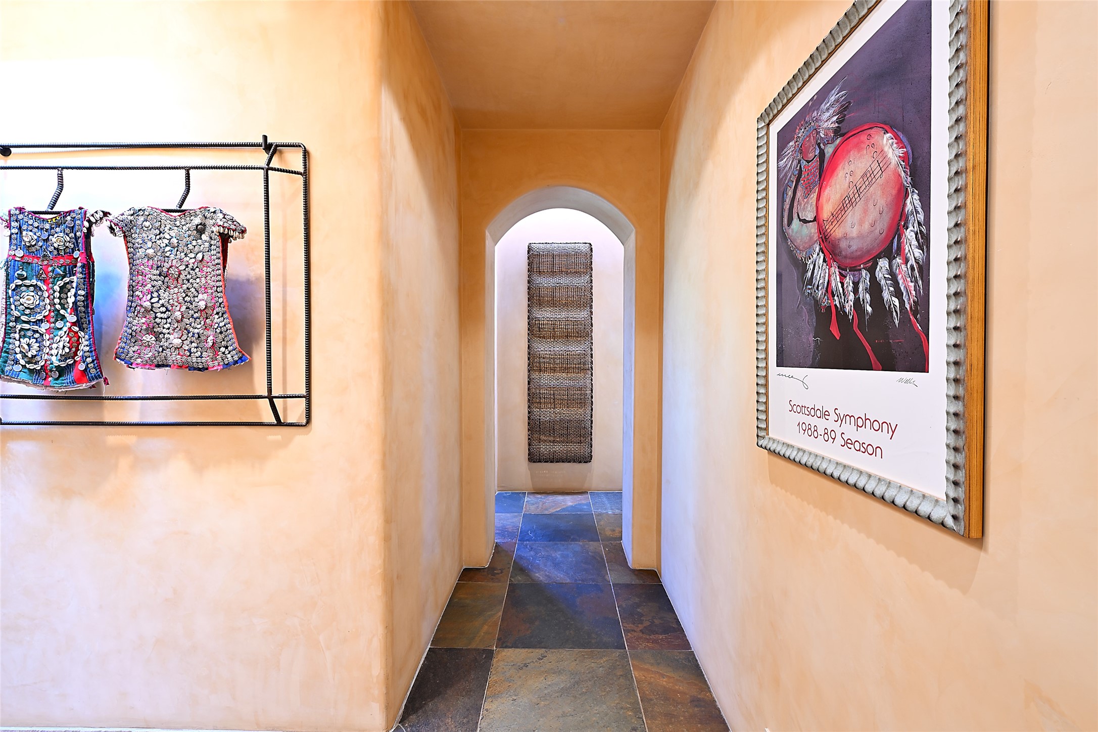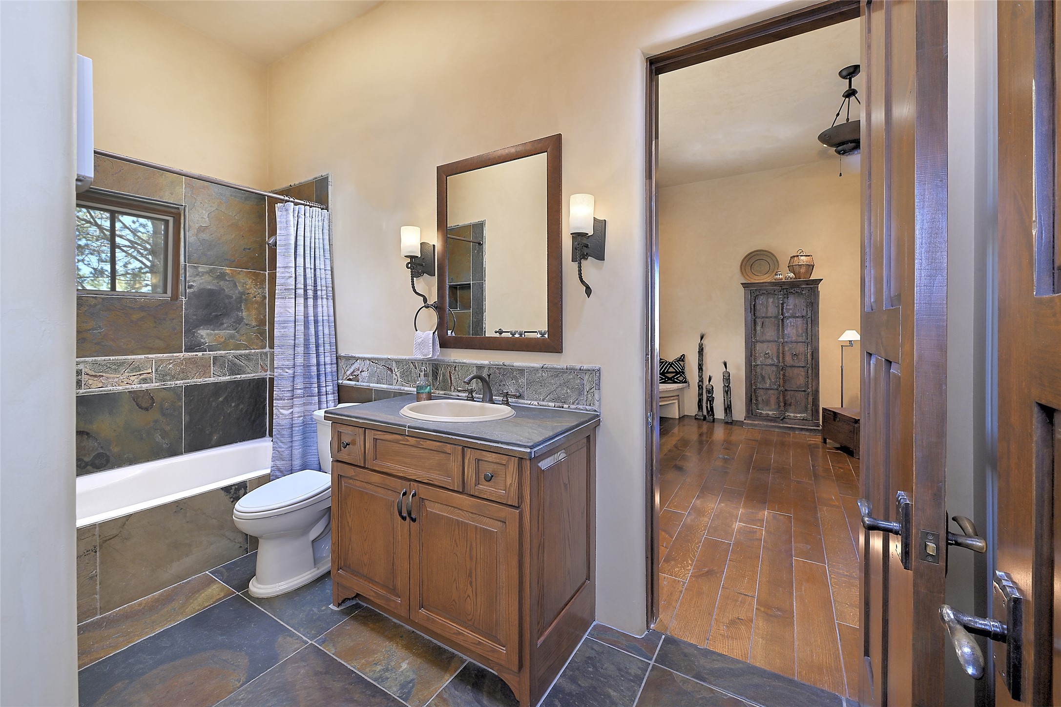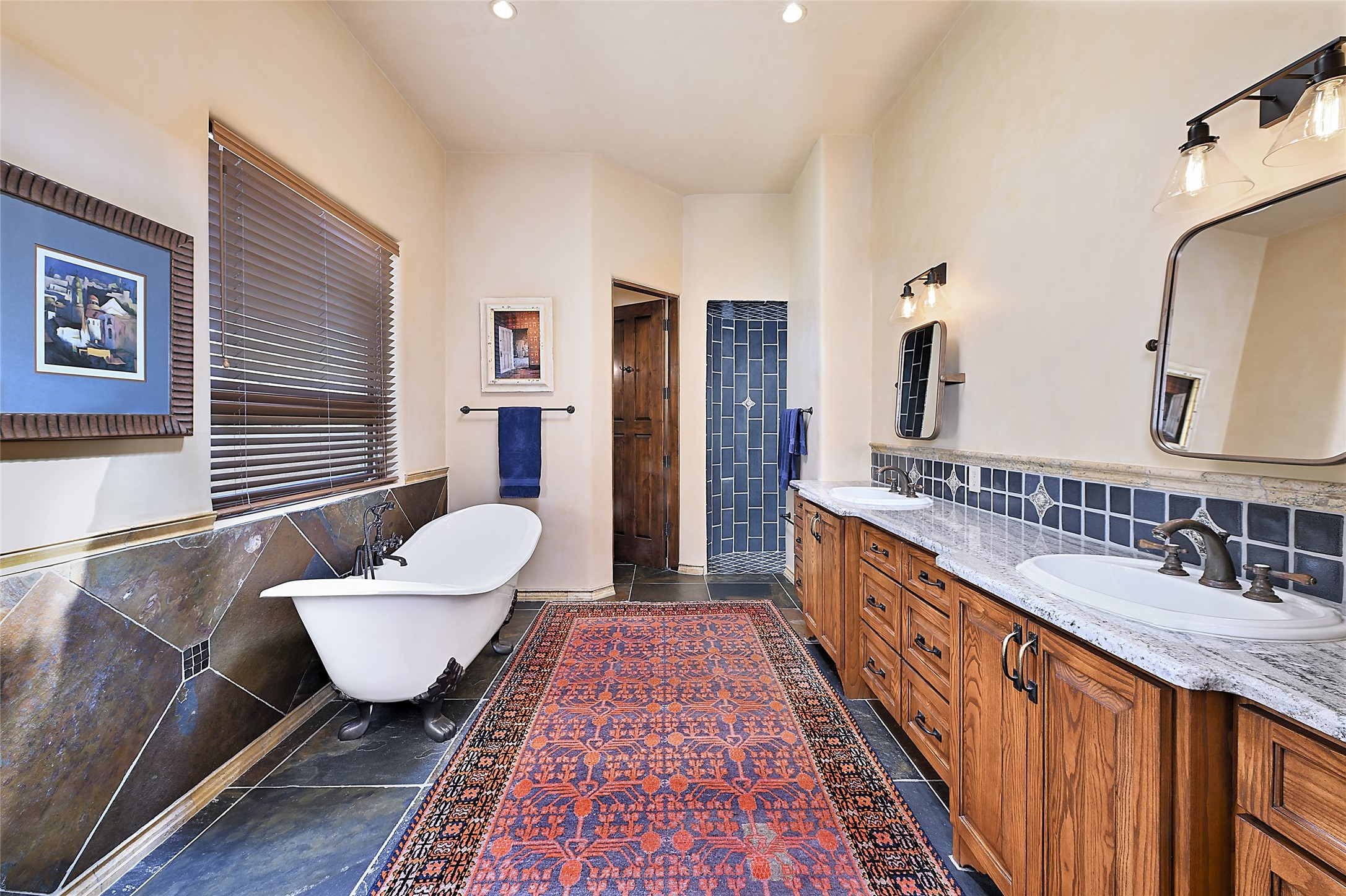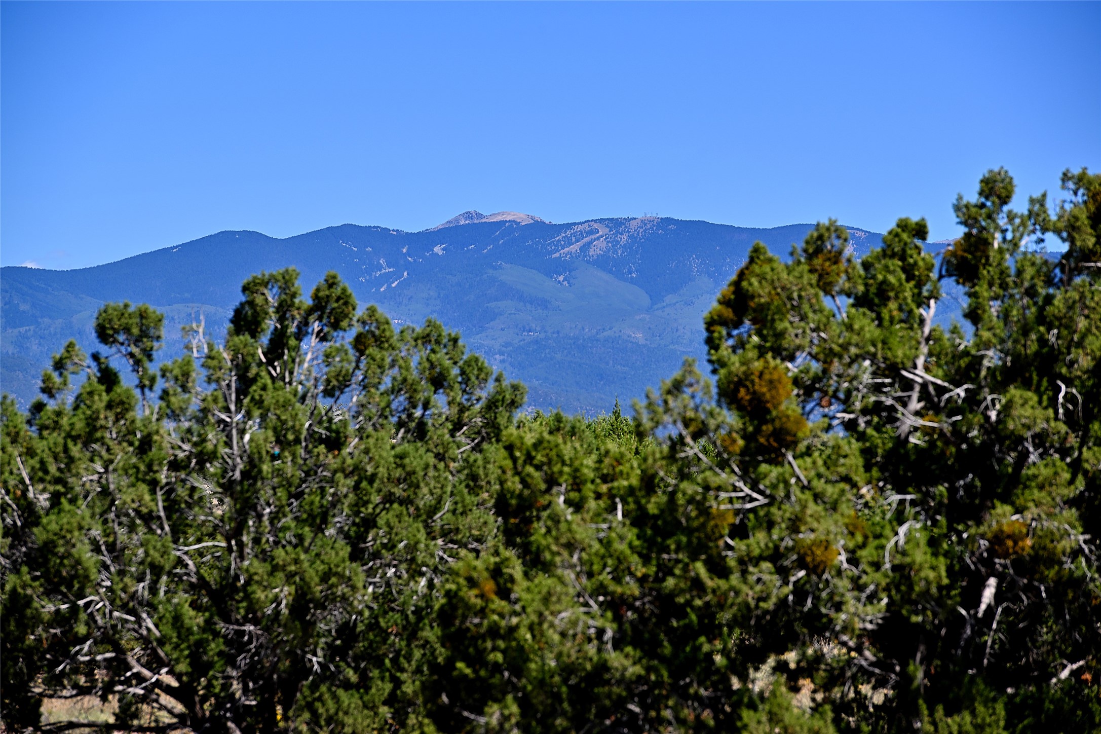 Masterfully sited 3 bedroom 2.5 bath Pueblo style home with a spectacular panorama of the Jemez and Sangre de Cristo mountains. Single level, no interior steps. Traditional Southwest ceiling treatments including radiating vigas and plastered ceilings, hand-troweled, pigmented plaster walls and skylights work in harmony to create a warm and comfortable home. Slate tile and wood floors. Double custom wood door opens to grand rotunda with 2 lighted art nichos with chiseled-edged flagstone sills. Spacious curved living/dining room providing 180-degree scenic views. Large gas-fueled fireplace with custom iron screens and beaver-chipped mantel. Chef's kitchen is appointed with ample lower/upper cabinets, granite countertops with decorative harlequin tile backsplash, Wolf double ovens and cooktop with 4 gas burners, griddle and grill, Sub-Zero refrigerator, 2 dishwashers, 2 sinks in kitchen, 2 wine fridges/racks in kitchen, and center island. Primary suite includes sitting area with kiva fireplace, a custom designed walk-in closet and luxurious bath with free-standing tub and separate walk-in shower. Split bedroom plan offers privacy for owners and guests. Separate office with built-ins and kiva fireplace. Ideal home for year-round outdoor living and dining with both winter and summer portal. Outdoor kiva and built-in grill. Enclosed entry courtyard with lush landscaping. 3-car heated garage. Convenient location with easy access to 599 and all the cultural amenities of Santa Fe.