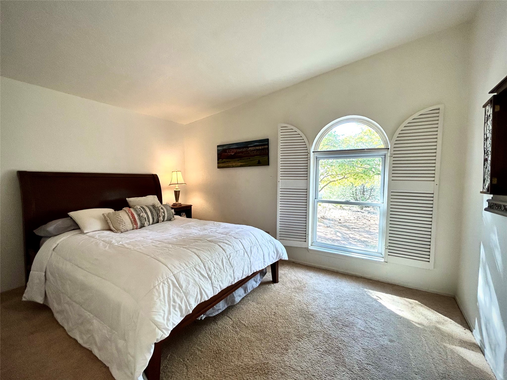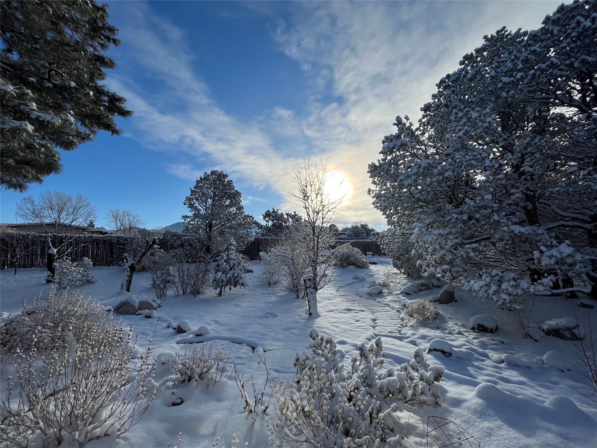This home sits on an amazing 1 acre lot within the desirable Sol y Lomas neighborhood, close to town but on a quiet dirt road. The 1/4 acre fenced backyard features a great covered portal with views of Sun and Moon Mountains, a flagstone pathway leading to a raised garden bed and an "interesting" pagoda structure. The lush landscaping includes five majestic Ponderosa trees, four Apple trees among many other pine and deciduous trees. The property is being sold "as-is" due to some conditions and the purchase will be limited to cash buyers only. The price is reflective of the cost of the improvements needed. The home is a well laid out single level floor plan with 3 bedrooms, 1 full bath and 1 3/4 bath. It has a beautiful living area that expands to the outdoor covered portal. The back workroom near the garage is not included in the square footage. The 2 car attached garage is finished and features two separate bays. This property is near many amenities including shopping, restaurants, Christus St. Vincent hospital and just a 10 minute drive to the Santa Fe Plaza.