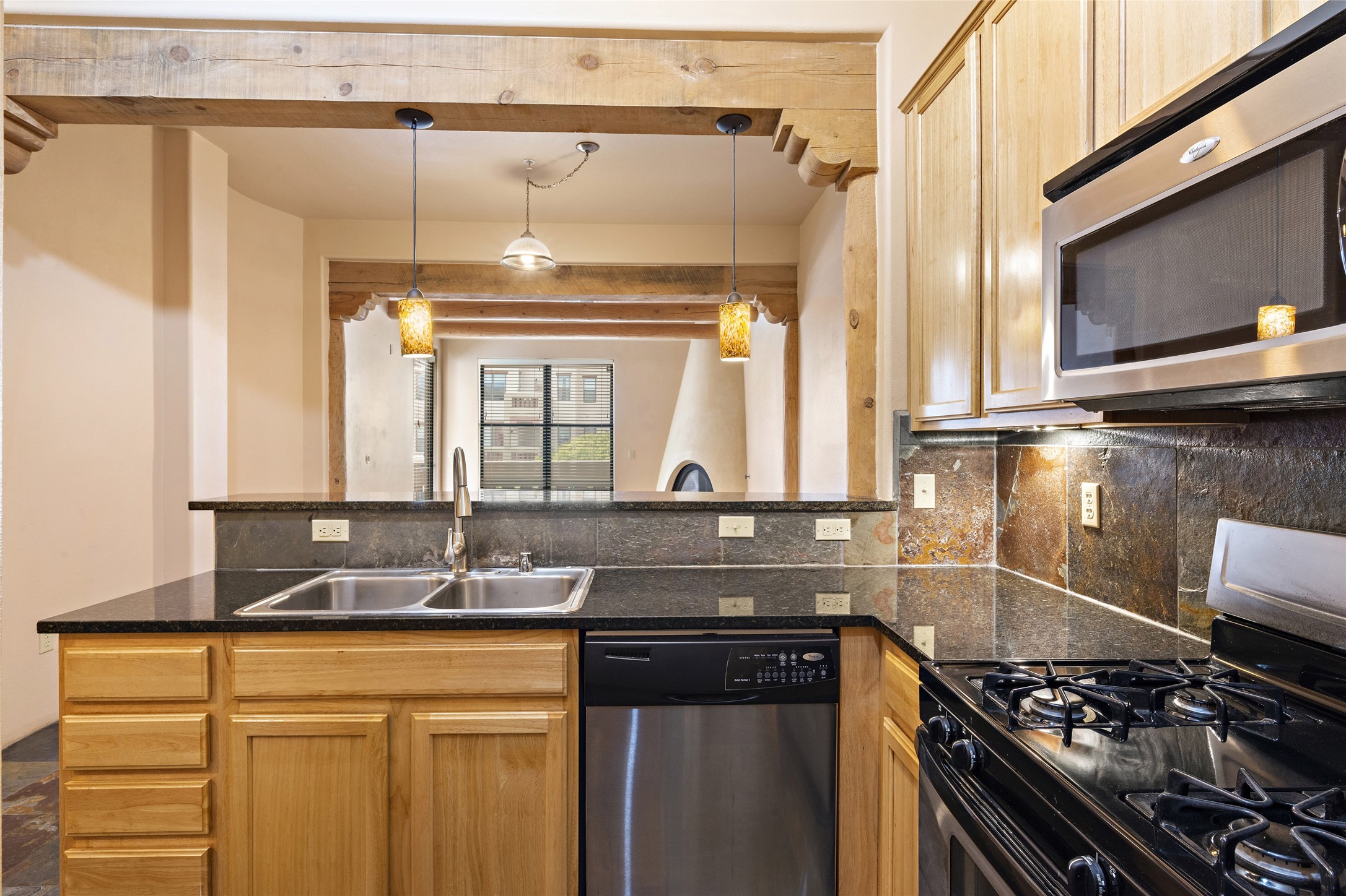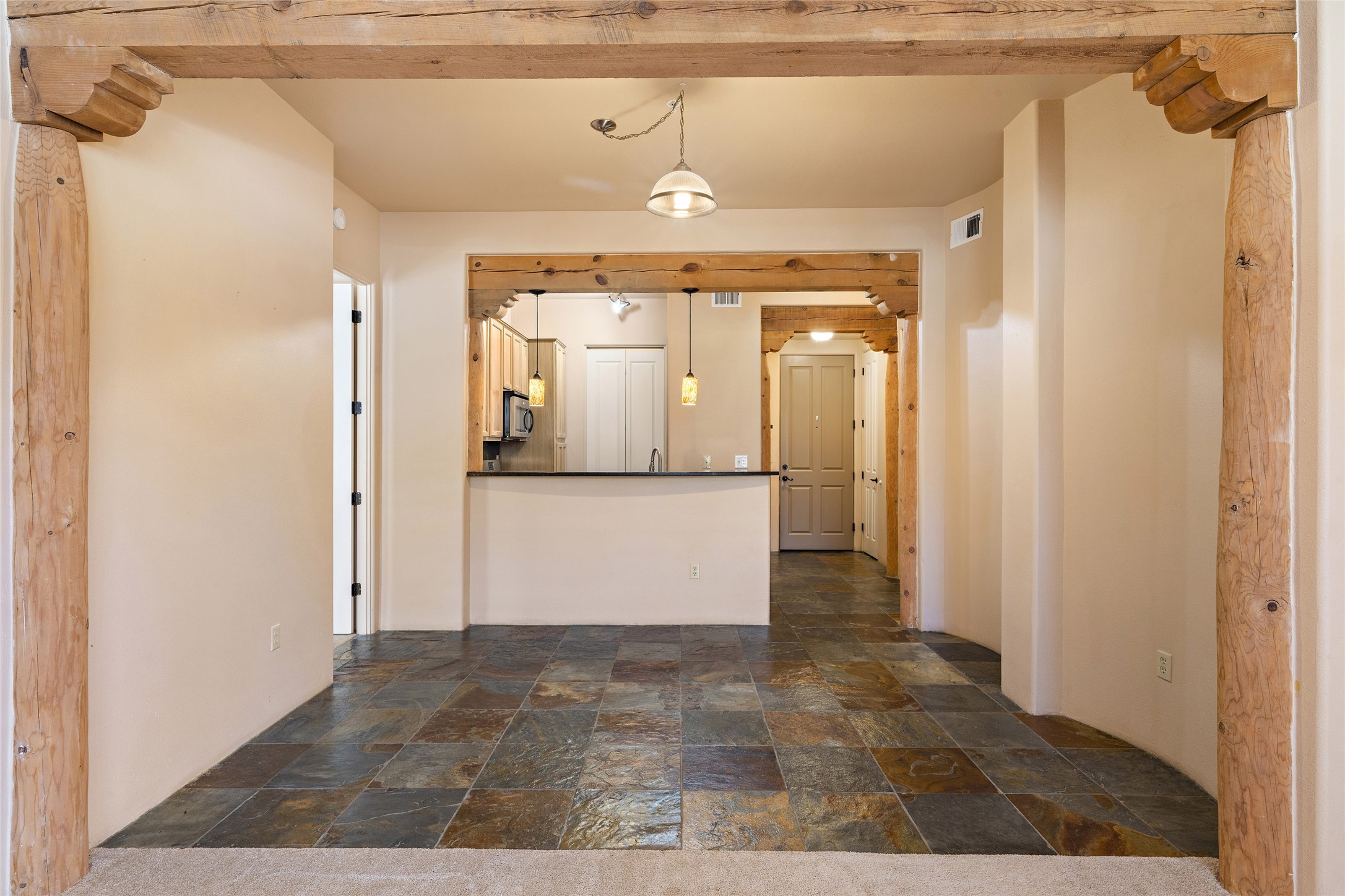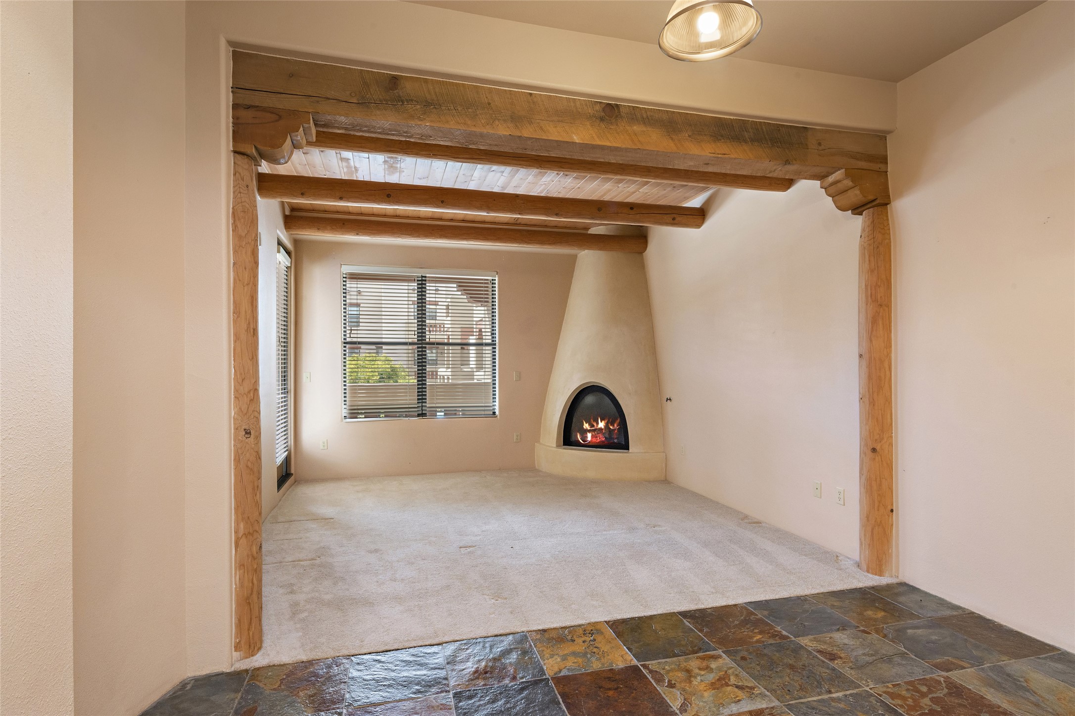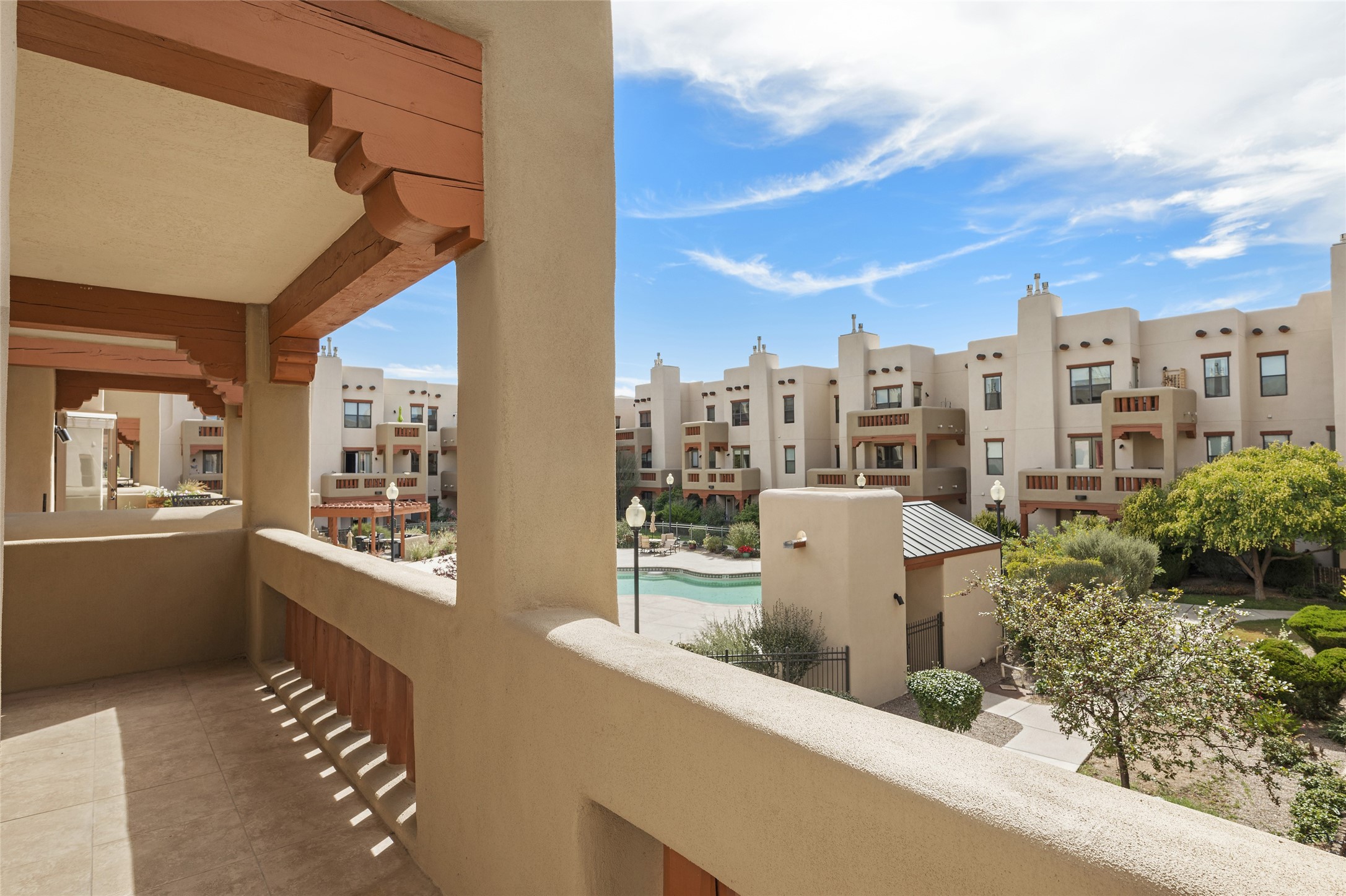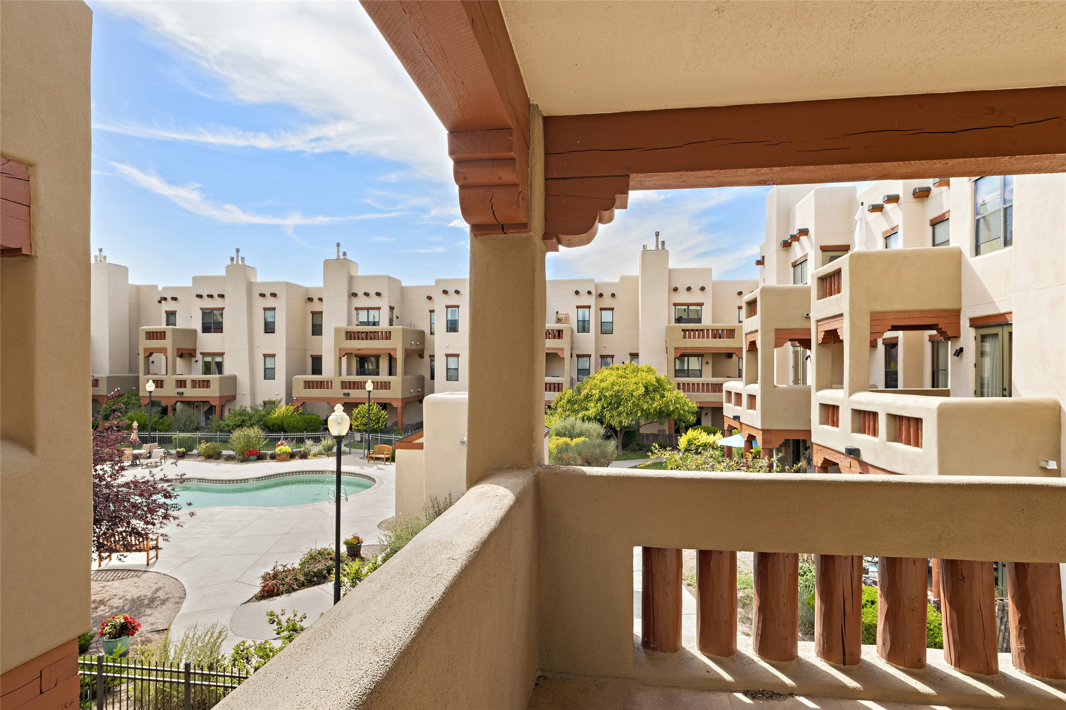 This sweet condo just off Cerrillos Road consists of two bedrooms and two full baths with views of the open sky and the pool from the wraparound patio. Ideal as a full time or second home, the condo comes with an oversized storage room nearby and a one-car garage. Features include vigas, slate and carpeted floors, stainless steel appliances, and granite countertops. The kitchen opens up on to the living/dining area with a laundry area tucked away with a full size washer and dryer. The living/dining area has a corner kiva gas-burning fireplace. The primary bedroom has a large ensuite bathroom with granite counters, dual sinks, a separate slate-tiled walk-in shower, a soaking tub, and a walk-in closet. The second bedroom is on the opposite side of the unit with an adjacent bathroom with granite counters and a bathtub with a slate tile enclosure. The entire complex has forced air heating and central refrigerated A/C. Amenities include a fitness center, swimming pool, conference room, clubhouse kitchen, all gated and fenced close to shopping and walking/bike trails making the Alameda Condos an easy retreat.