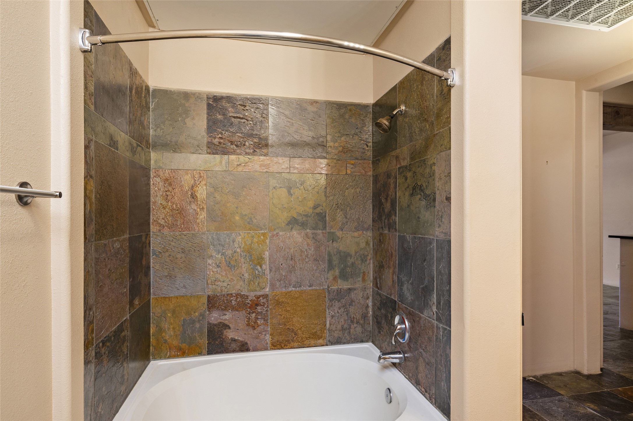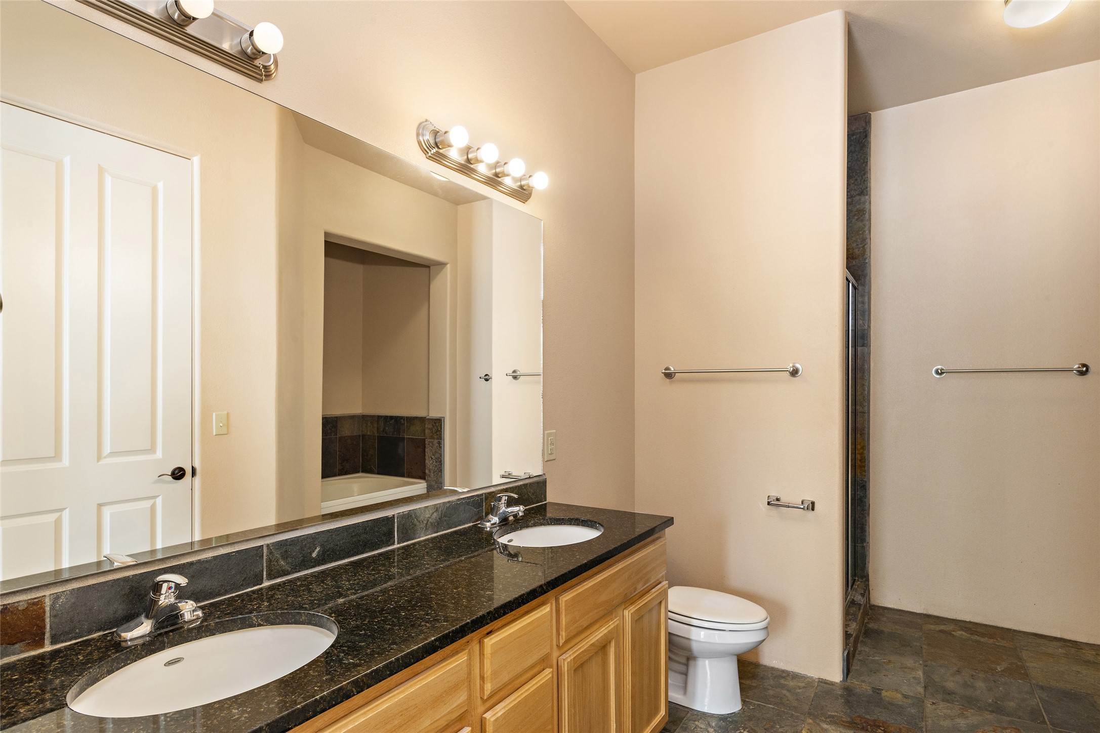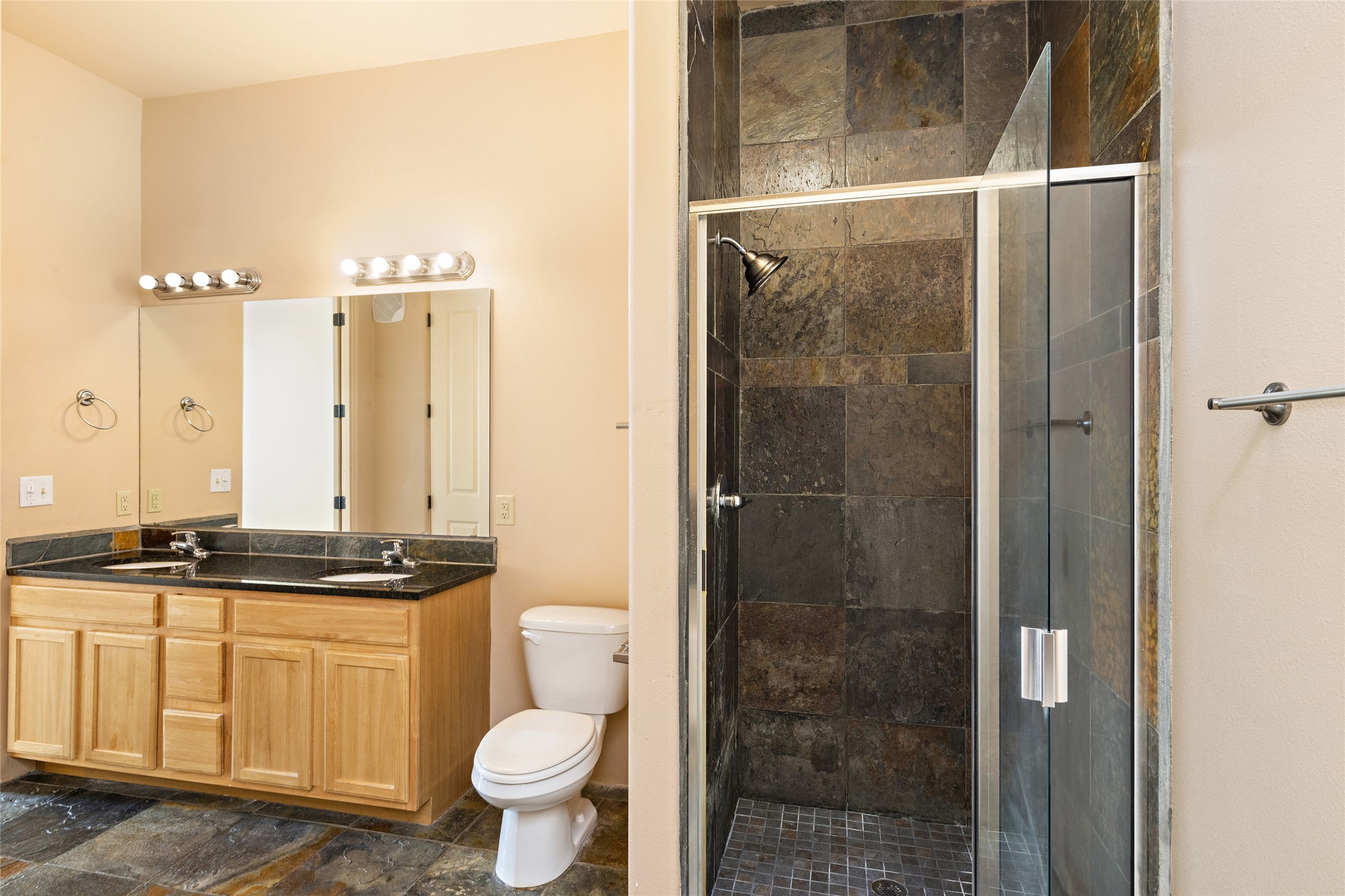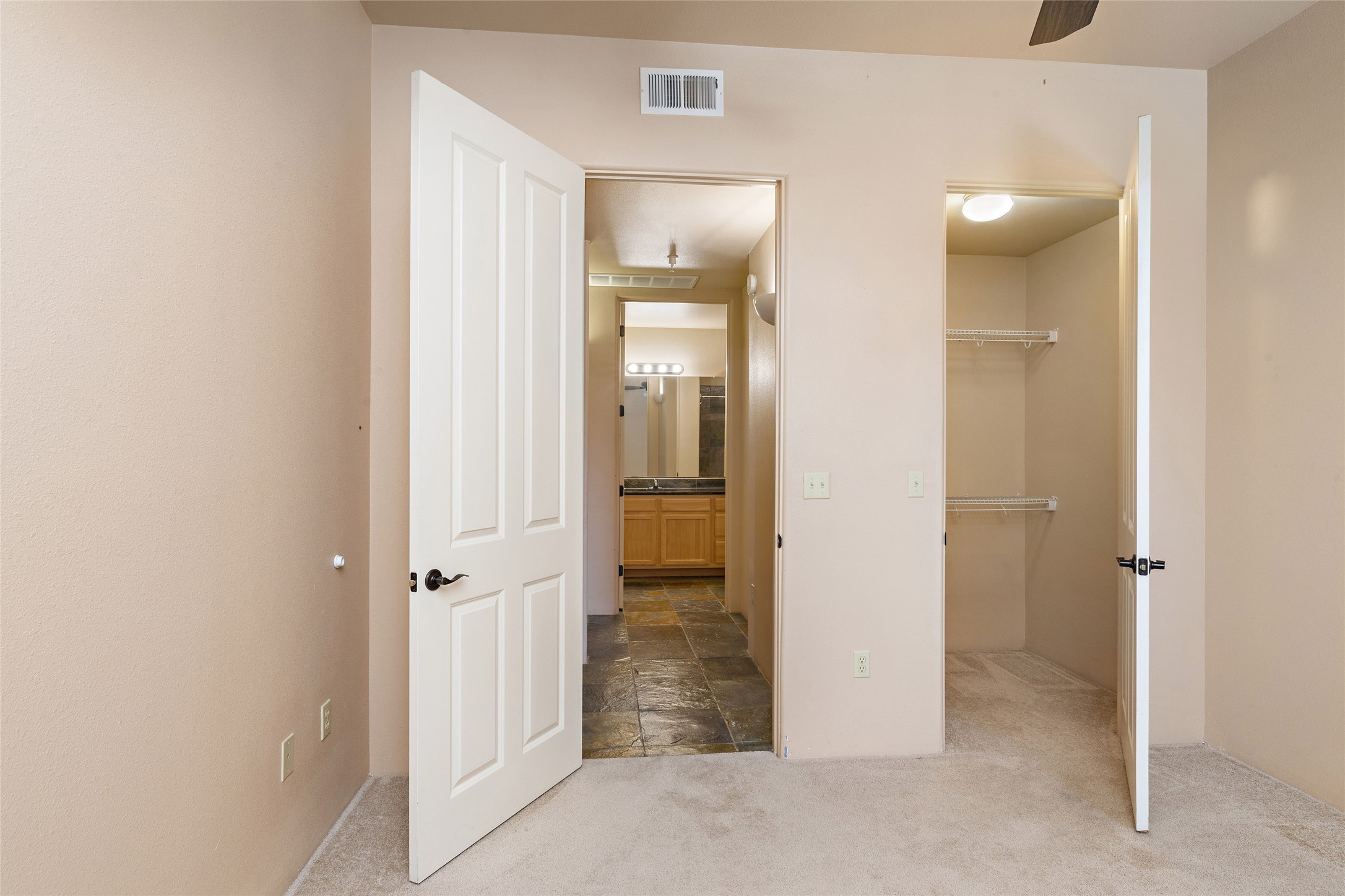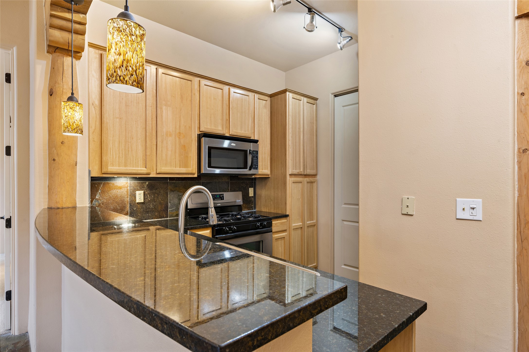 This sweet condo just off Cerrillos Road consists of two bedrooms and two full baths with views of the open sky and the pool from the wraparound patio. Ideal as a full time or second home, the condo comes with an oversized storage room nearby and a one-car garage. Features include vigas, slate and carpeted floors, stainless steel appliances, and granite countertops. The kitchen opens up on to the living/dining area with a laundry area tucked away with a full size washer and dryer. The living/dining area has a corner kiva gas-burning fireplace. The primary bedroom has a large ensuite bathroom with granite counters, dual sinks, a separate slate-tiled walk-in shower, a soaking tub, and a walk-in closet. The second bedroom is on the opposite side of the unit with an adjacent bathroom with granite counters and a bathtub with a slate tile enclosure. The entire complex has forced air heating and central refrigerated A/C. Amenities include a fitness center, swimming pool, conference room, clubhouse kitchen, all gated and fenced close to shopping and walking/bike trails making the Alameda Condos an easy retreat.