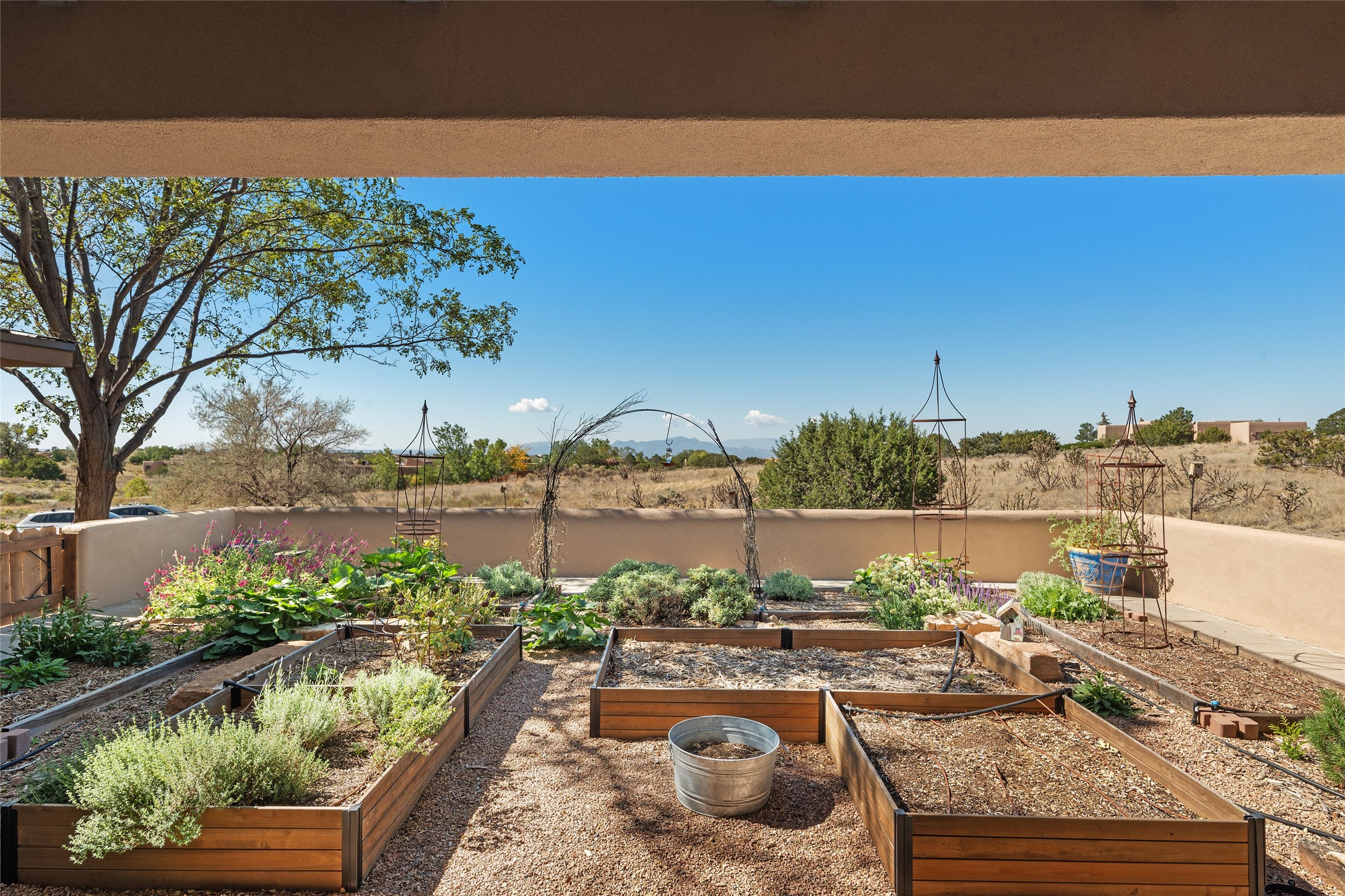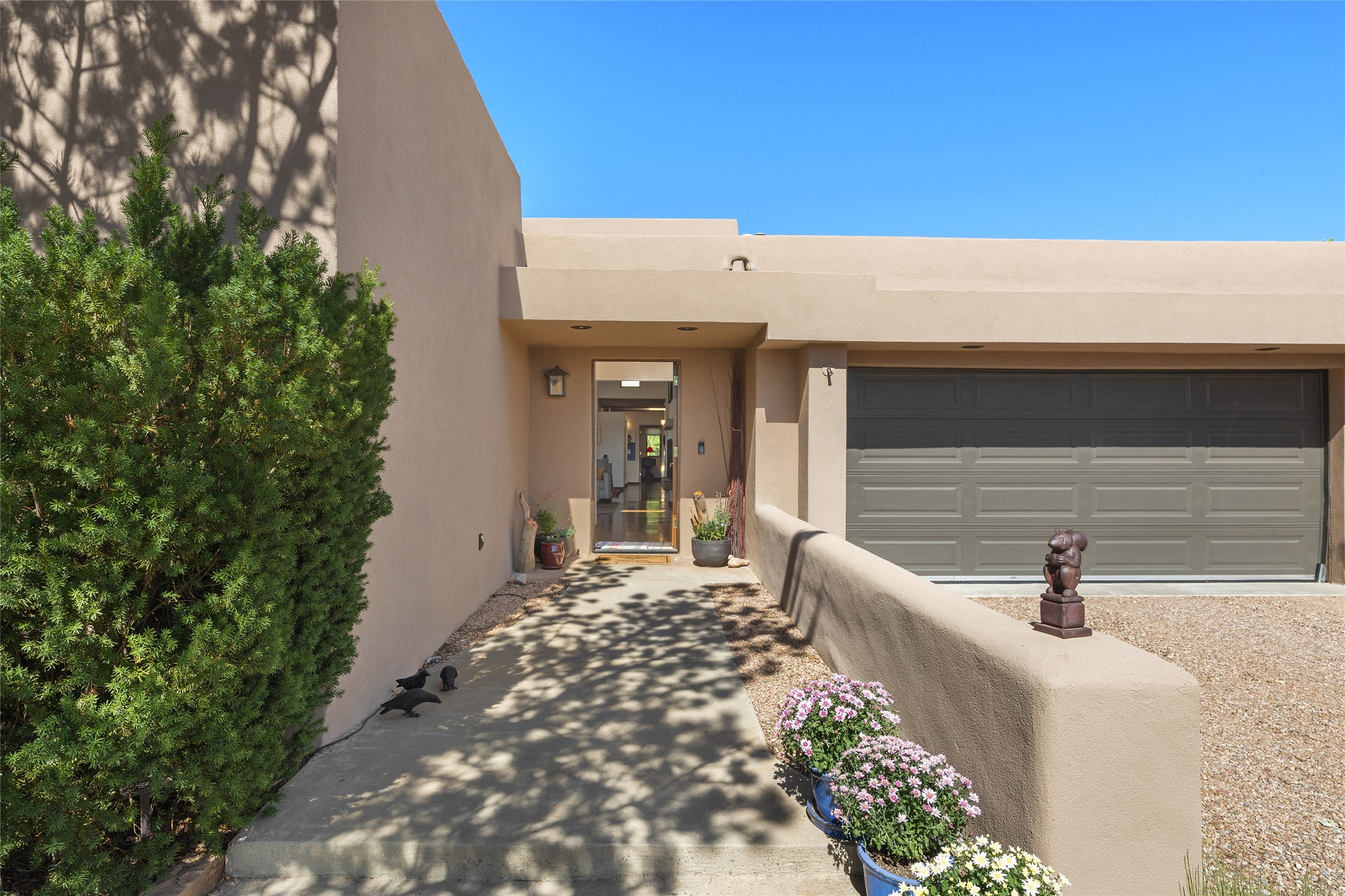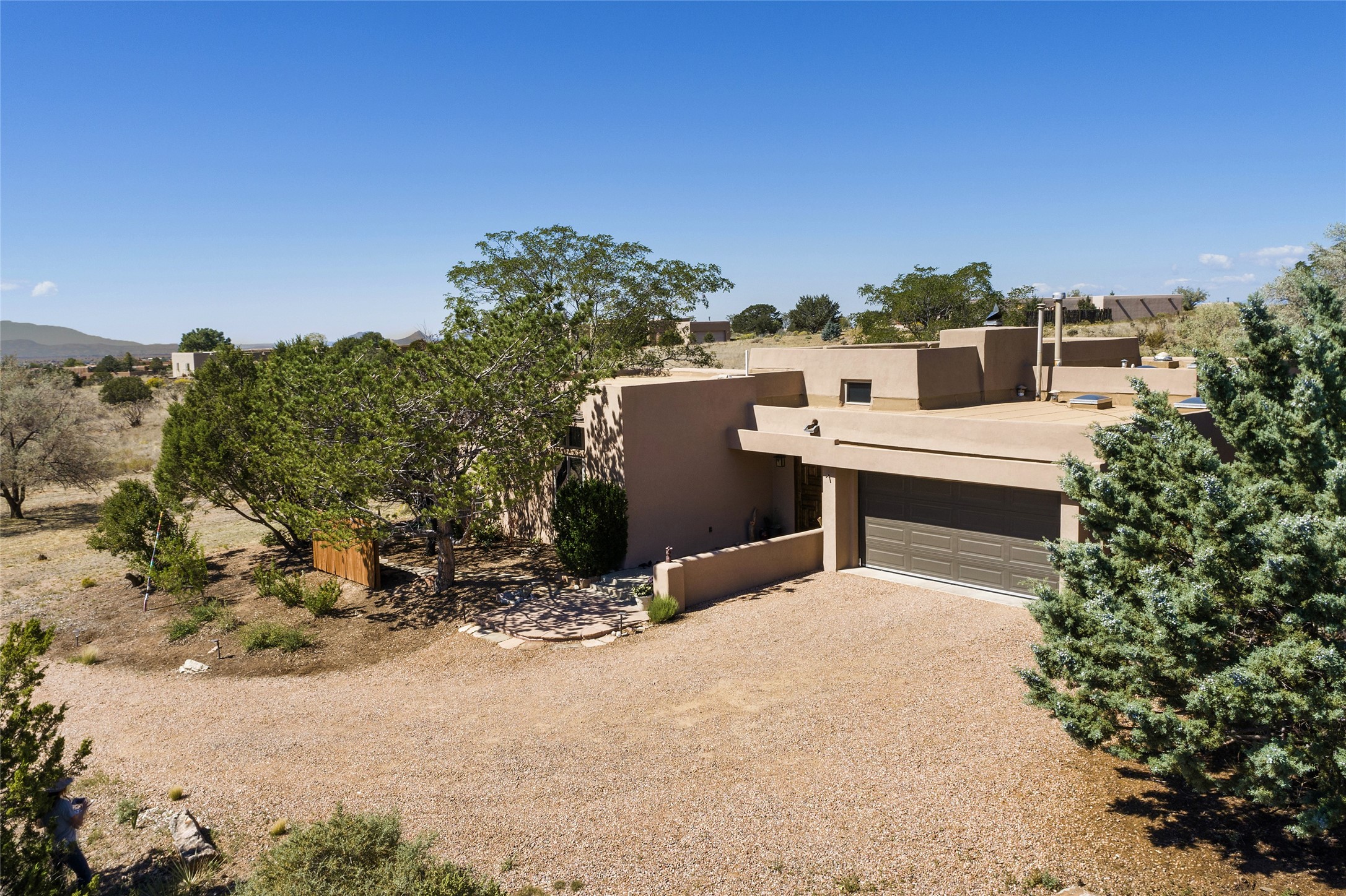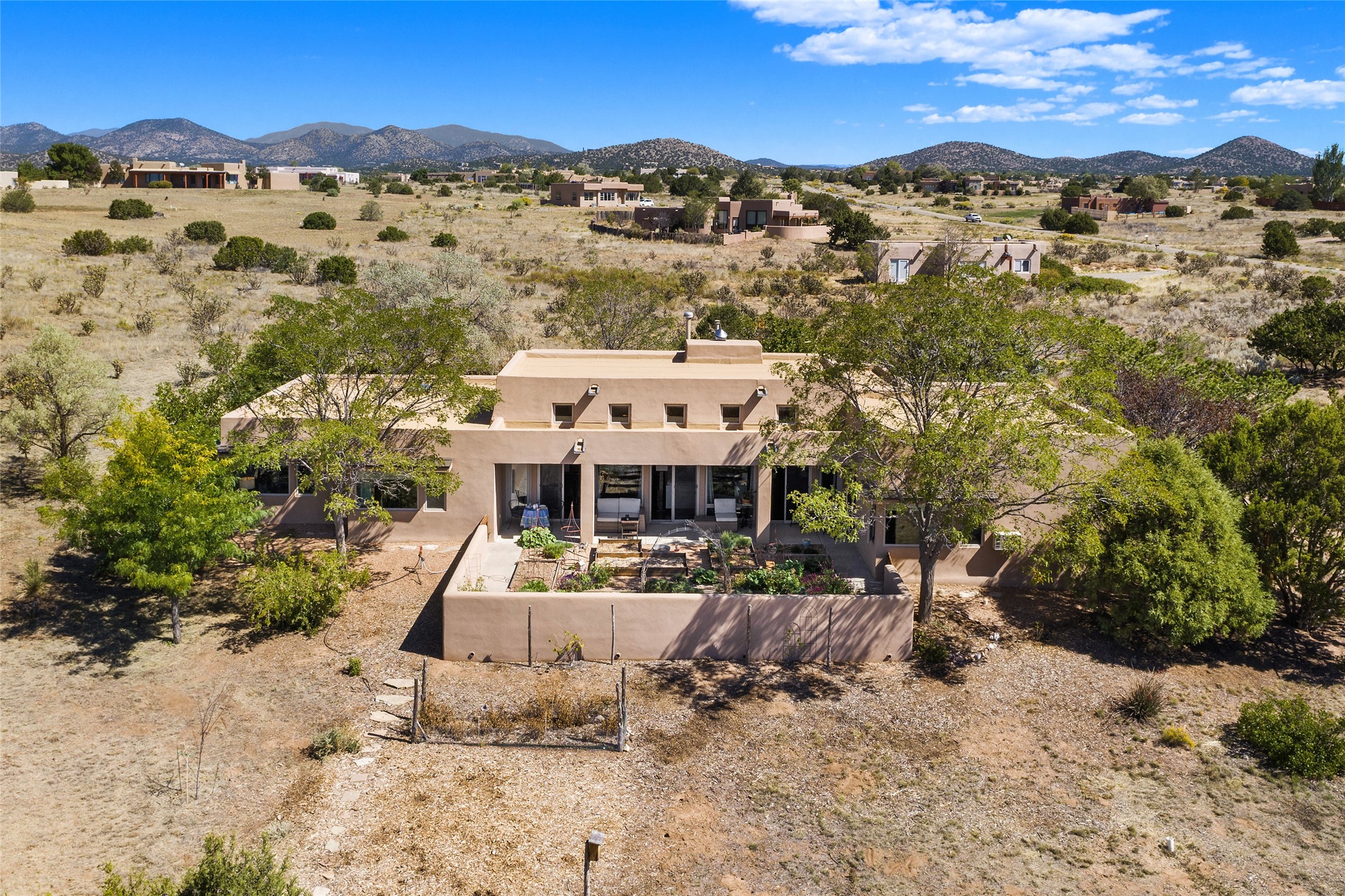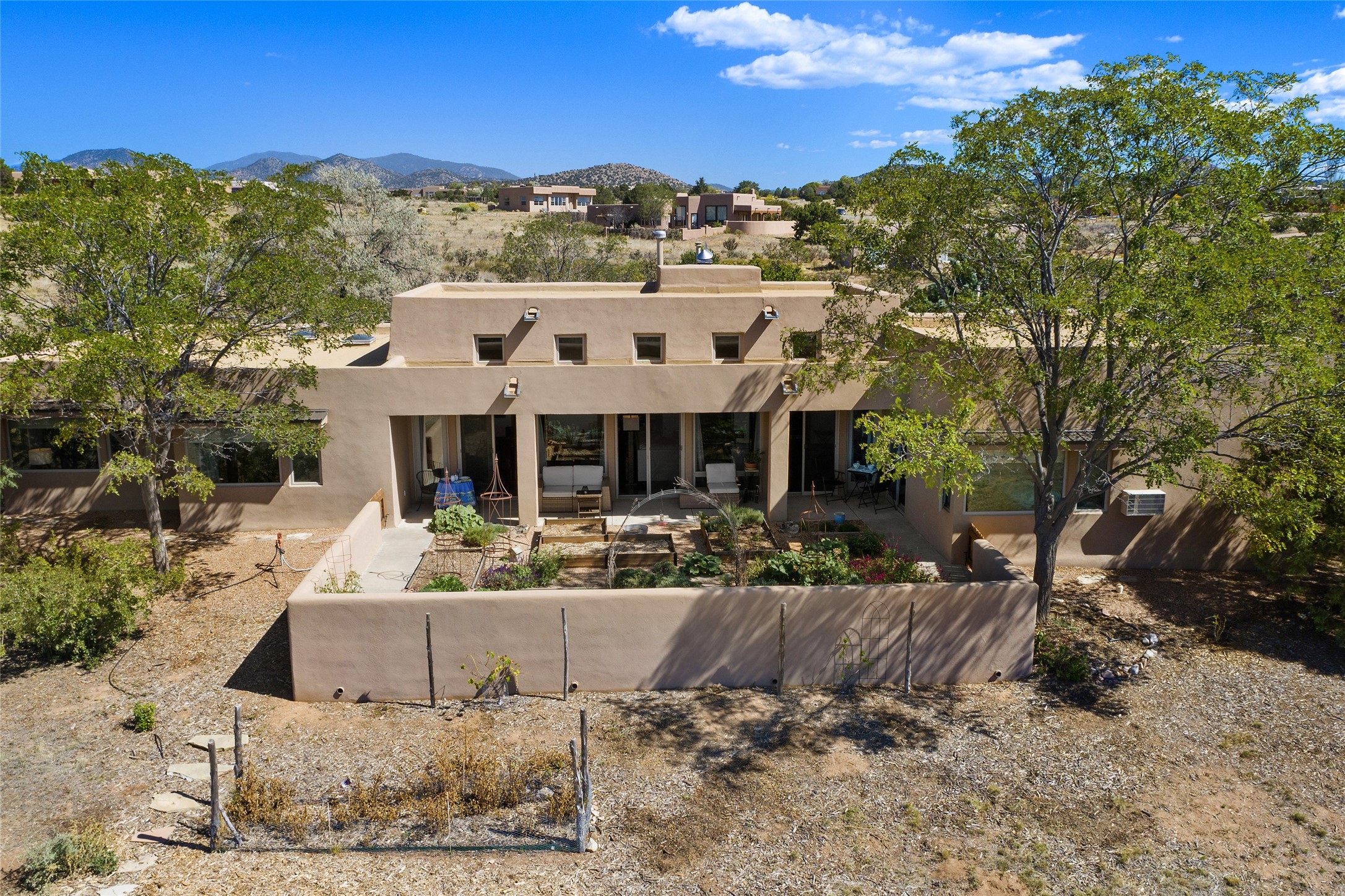 Near the crest of a gentle hill in Eldorado, this 2,418-square-foot home combines classic Santa Fe style--beamed ceilings, bancos, portales, courtyards, warm earth tones, and plaster walls--with chic contemporary flair. Walls of glass, clerestories, and skylights fill nearly every room with natural light, offer enchanting glimpses of the moon and stars, and create a feeling of being enveloped by nature. Spaces are airy, voluminous, and bright, and storage is abundant. The heart of the home is an inspiring open living and dining room with a soaring ceiling, a modern fireplace flanked by built-in bookshelves, and walls and lighting designed for the display of art and sculpture. A bank of glass doors opens to a colorful courtyard with thriving flower, herb, and vegetable garden beds lovingly maintained by a master gardener. The sleek updated kitchen features stainless-steel appliances, plentiful cabinets, a pass-through to the dining area, and a walk-in pantry. Nearby, a sunny laundry area gives way to the two-car garage and a secluded courtyard with a flagstone patio. The primary suite is a serene space with a wraparound window overlooking the gardens and hillside, glass doors opening to the portal, a well-outfitted walk-in closet, and a stylishly updated contemporary bath with a deep soaking tub, a dual-sink vanity, and a glass-walled shower. Three peaceful guest bedrooms--one of which could easily serve as an office or media room--and a shared bath are secluded in their own wing.