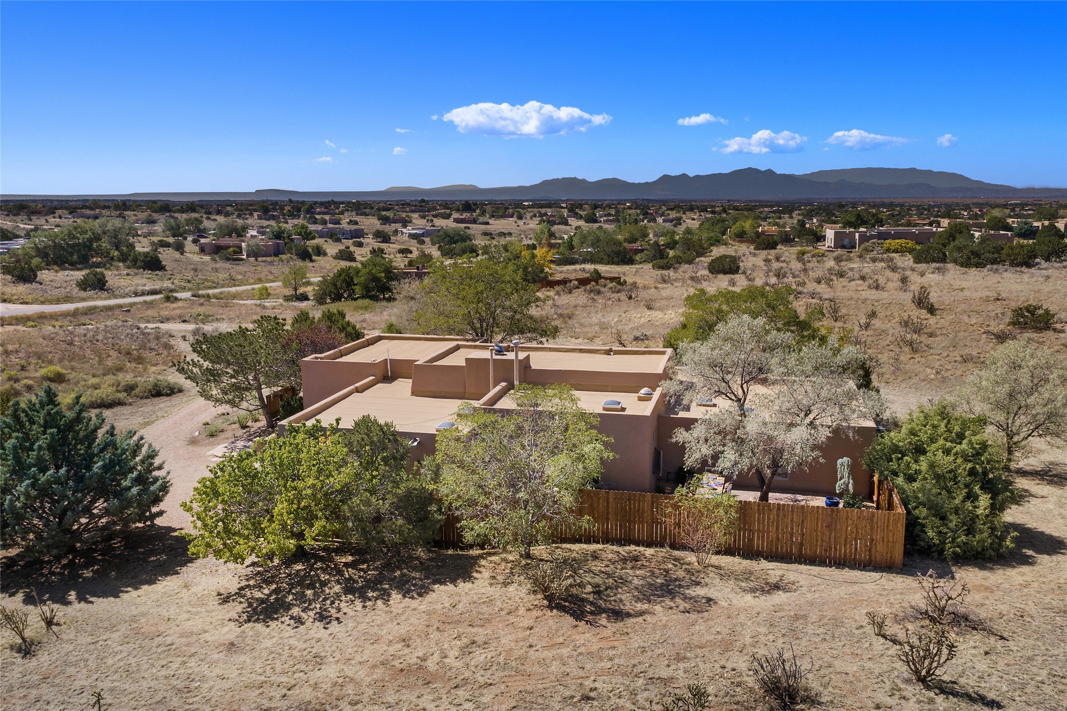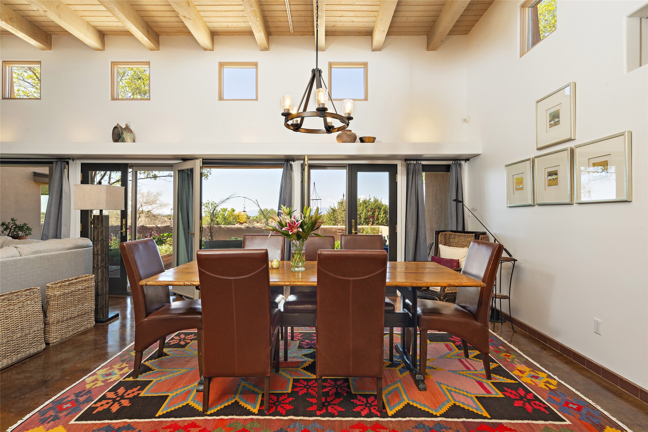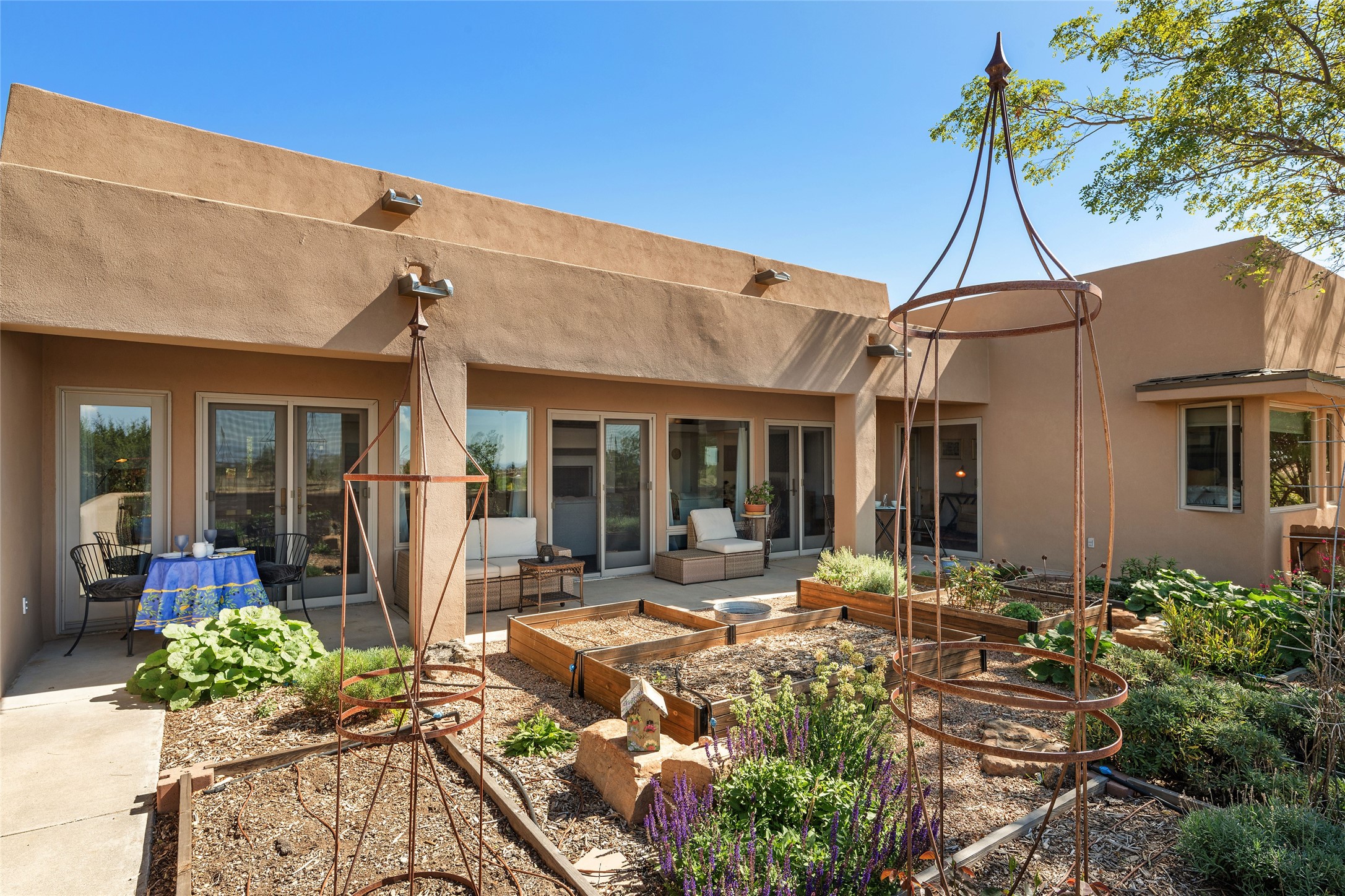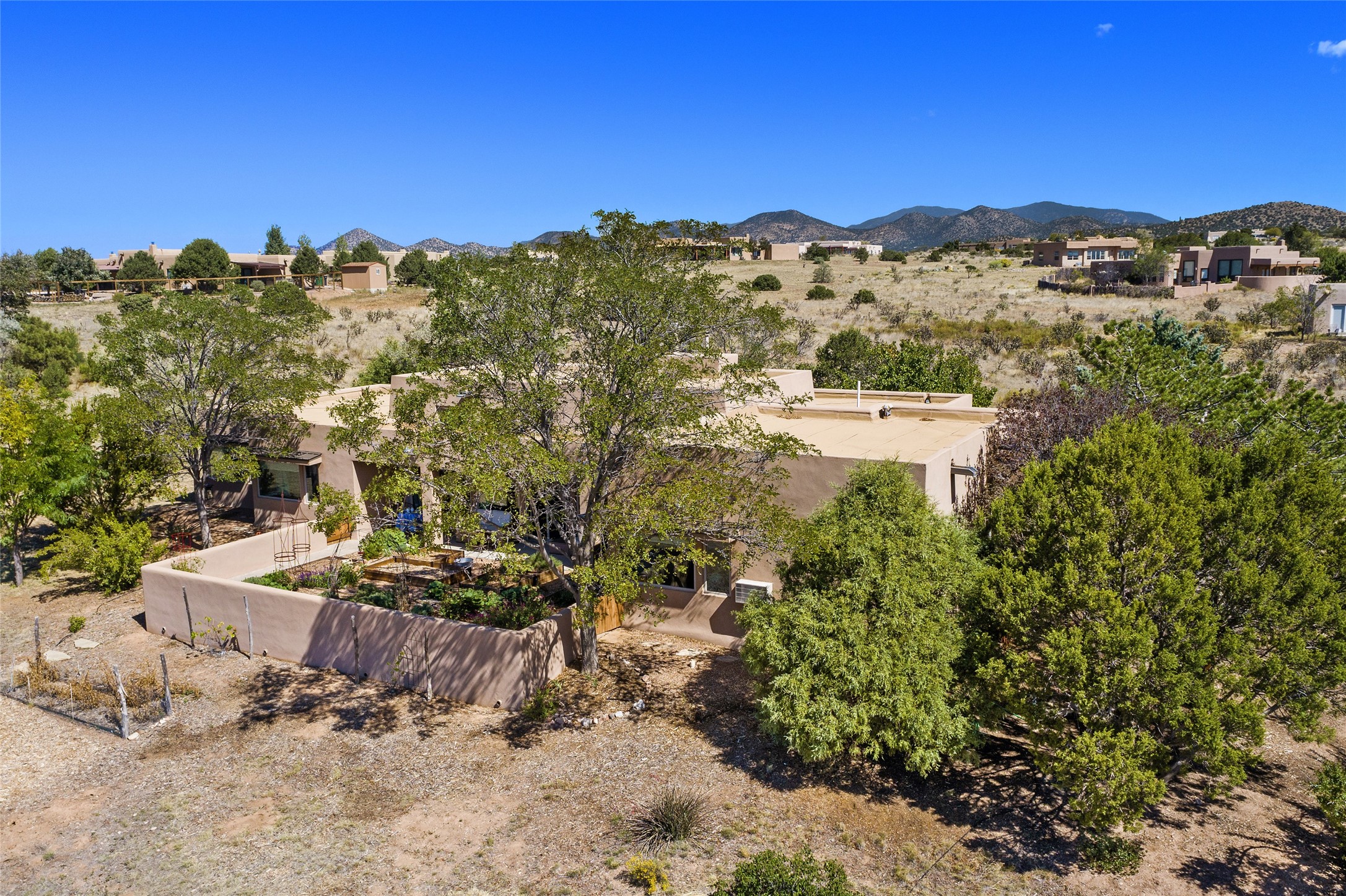 Near the crest of a gentle hill in Eldorado, this 2,418-square-foot home combines classic Santa Fe style--beamed ceilings, bancos, portales, courtyards, warm earth tones, and plaster walls--with chic contemporary flair. Walls of glass, clerestories, and skylights fill nearly every room with natural light, offer enchanting glimpses of the moon and stars, and create a feeling of being enveloped by nature. Spaces are airy, voluminous, and bright, and storage is abundant. The heart of the home is an inspiring open living and dining room with a soaring ceiling, a modern fireplace flanked by built-in bookshelves, and walls and lighting designed for the display of art and sculpture. A bank of glass doors opens to a colorful courtyard with thriving flower, herb, and vegetable garden beds lovingly maintained by a master gardener. The sleek updated kitchen features stainless-steel appliances, plentiful cabinets, a pass-through to the dining area, and a walk-in pantry. Nearby, a sunny laundry area gives way to the two-car garage and a secluded courtyard with a flagstone patio. The primary suite is a serene space with a wraparound window overlooking the gardens and hillside, glass doors opening to the portal, a well-outfitted walk-in closet, and a stylishly updated contemporary bath with a deep soaking tub, a dual-sink vanity, and a glass-walled shower. Three peaceful guest bedrooms--one of which could easily serve as an office or media room--and a shared bath are secluded in their own wing.