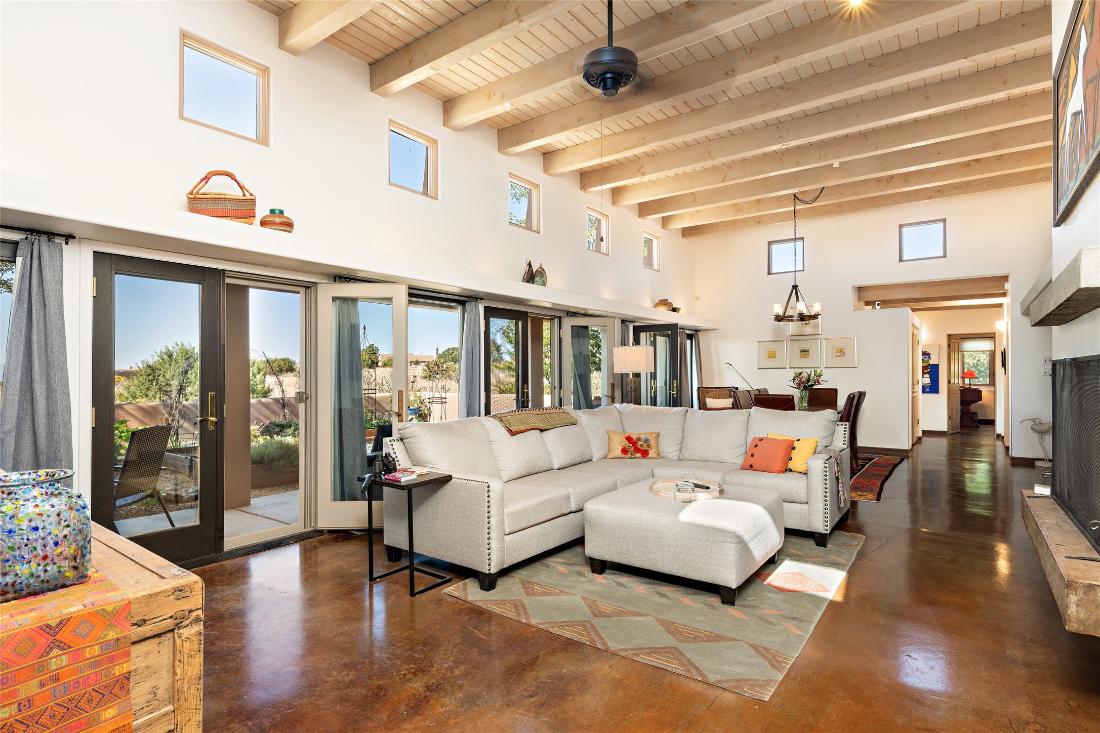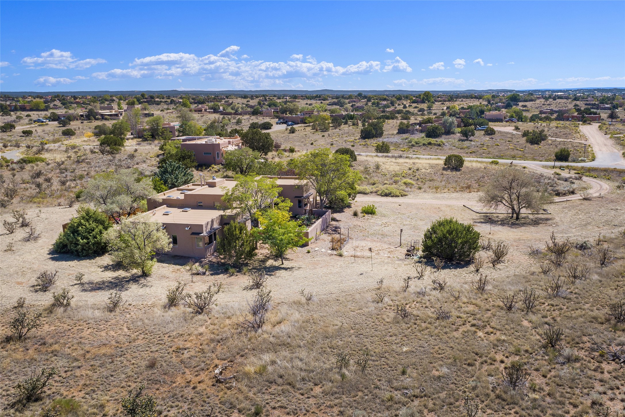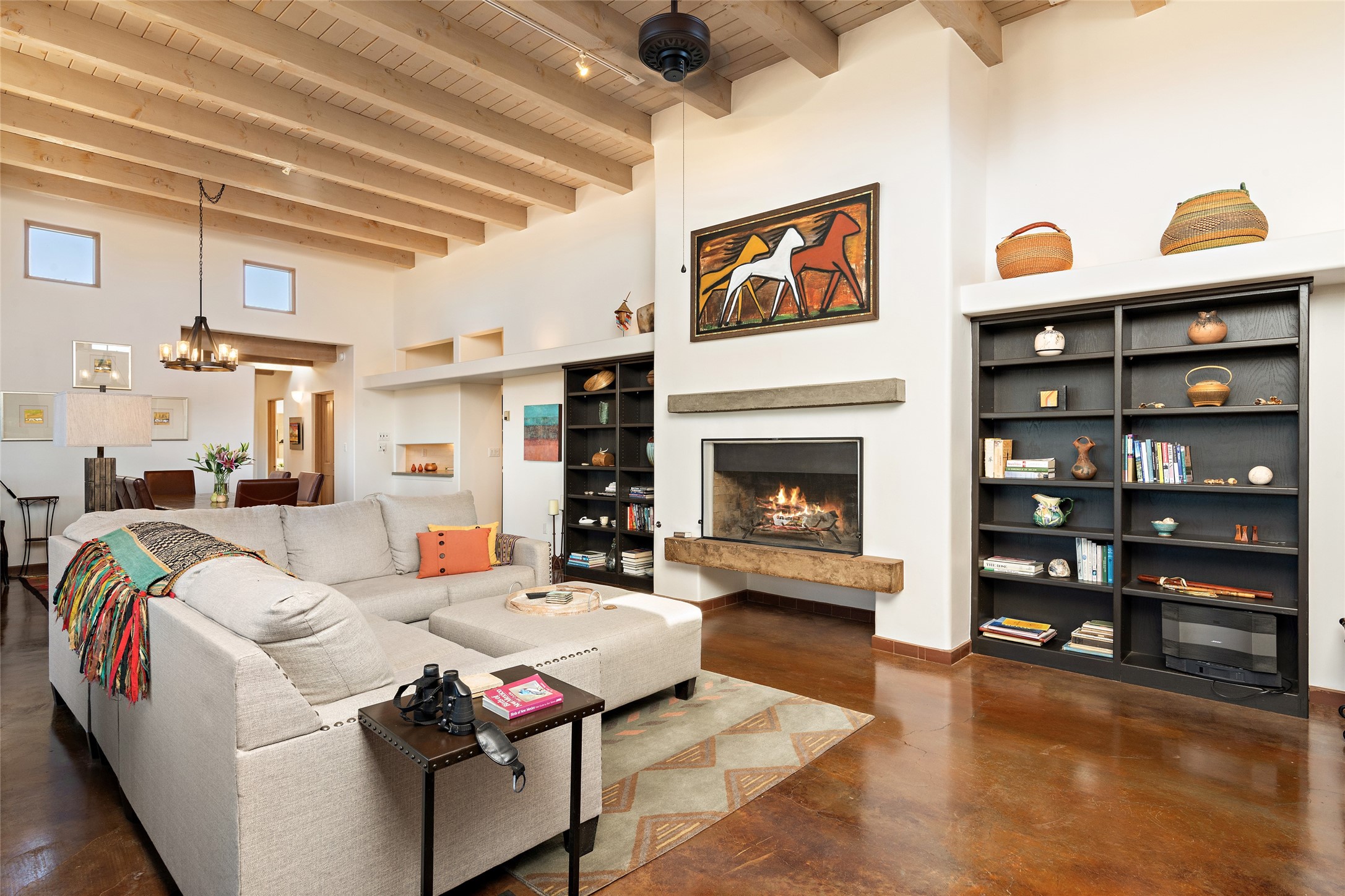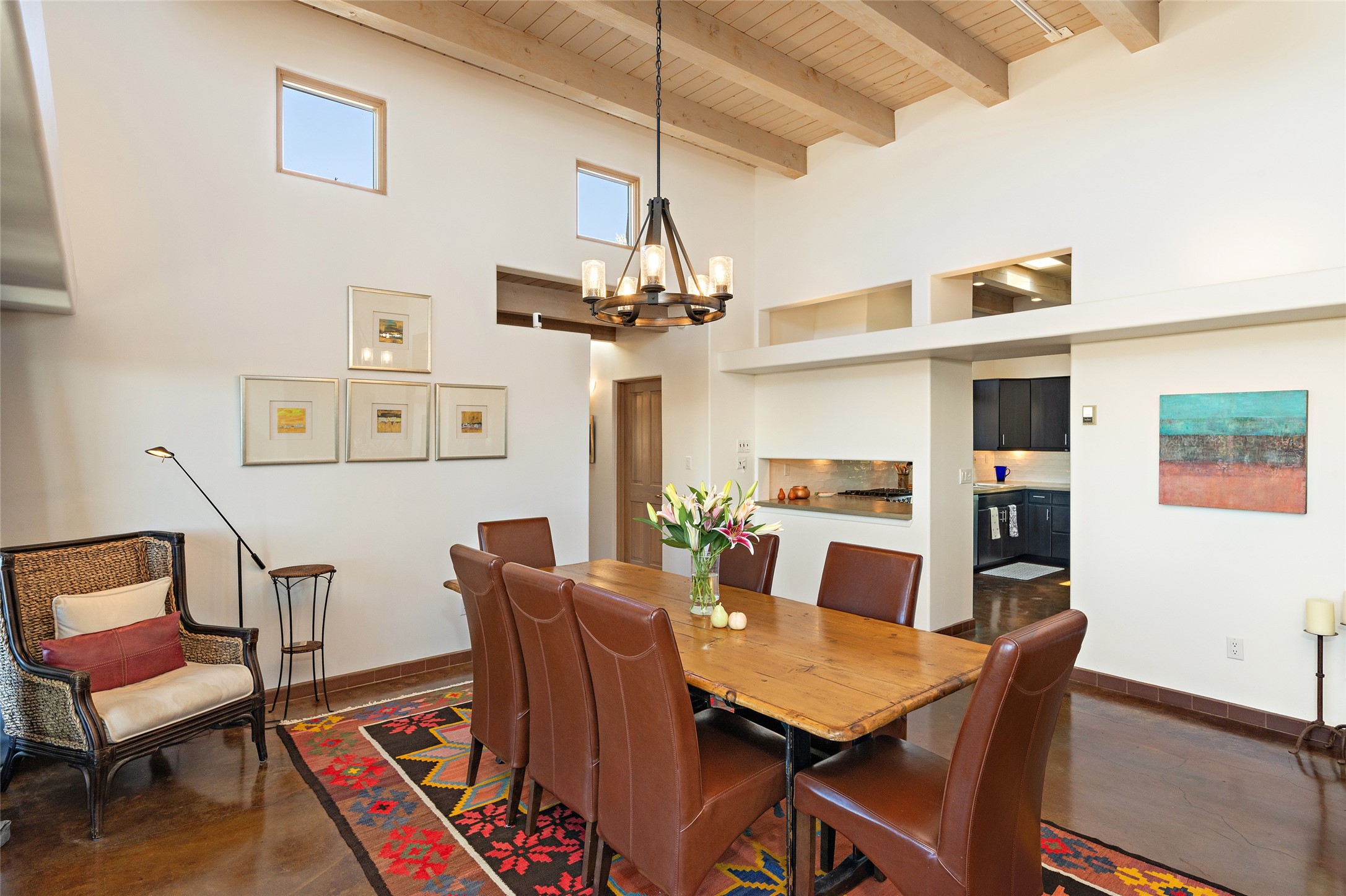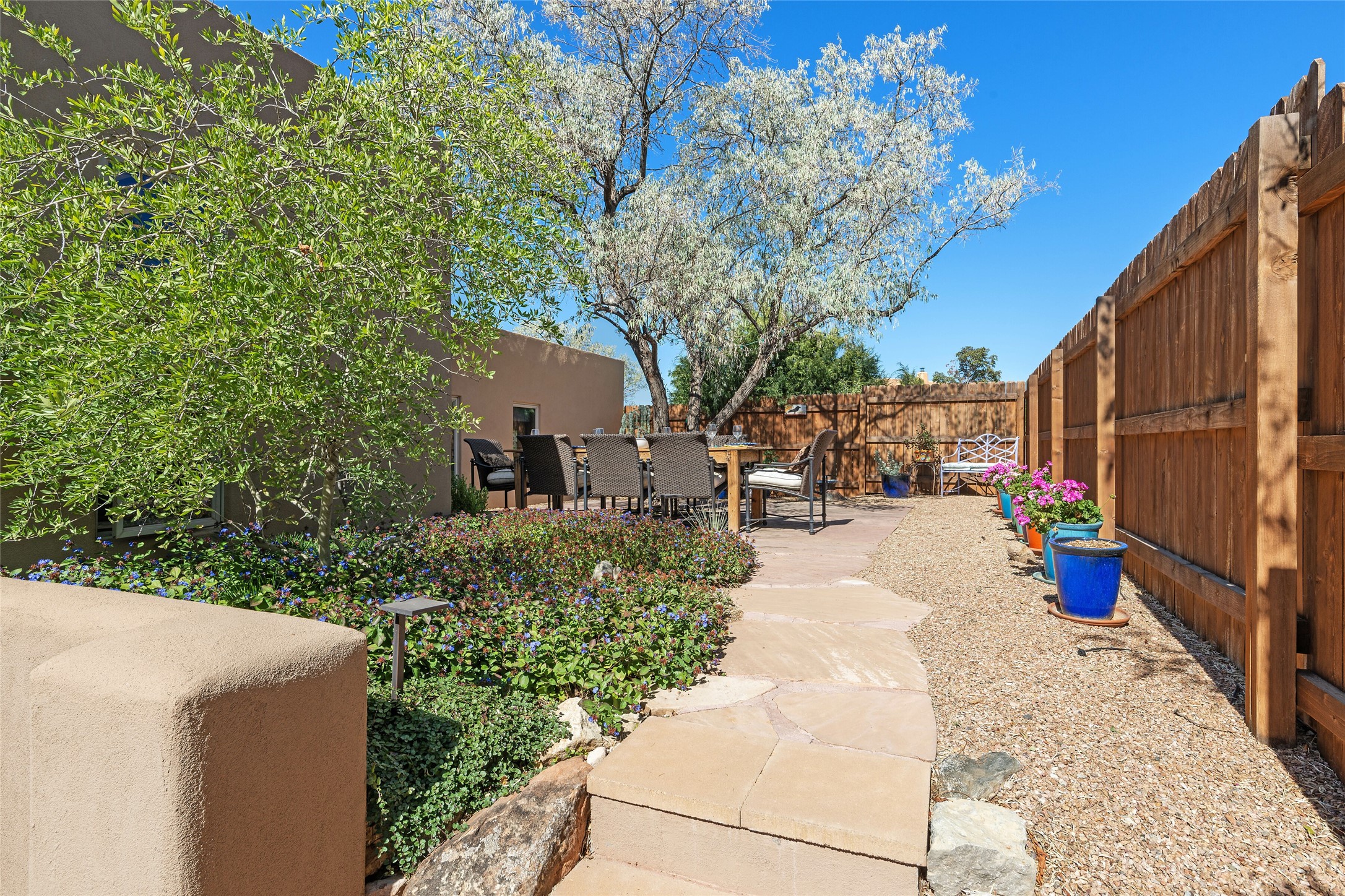 Near the crest of a gentle hill in Eldorado, this 2,418-square-foot home combines classic Santa Fe style--beamed ceilings, bancos, portales, courtyards, warm earth tones, and plaster walls--with chic contemporary flair. Walls of glass, clerestories, and skylights fill nearly every room with natural light, offer enchanting glimpses of the moon and stars, and create a feeling of being enveloped by nature. Spaces are airy, voluminous, and bright, and storage is abundant. The heart of the home is an inspiring open living and dining room with a soaring ceiling, a modern fireplace flanked by built-in bookshelves, and walls and lighting designed for the display of art and sculpture. A bank of glass doors opens to a colorful courtyard with thriving flower, herb, and vegetable garden beds lovingly maintained by a master gardener. The sleek updated kitchen features stainless-steel appliances, plentiful cabinets, a pass-through to the dining area, and a walk-in pantry. Nearby, a sunny laundry area gives way to the two-car garage and a secluded courtyard with a flagstone patio. The primary suite is a serene space with a wraparound window overlooking the gardens and hillside, glass doors opening to the portal, a well-outfitted walk-in closet, and a stylishly updated contemporary bath with a deep soaking tub, a dual-sink vanity, and a glass-walled shower. Three peaceful guest bedrooms--one of which could easily serve as an office or media room--and a shared bath are secluded in their own wing.