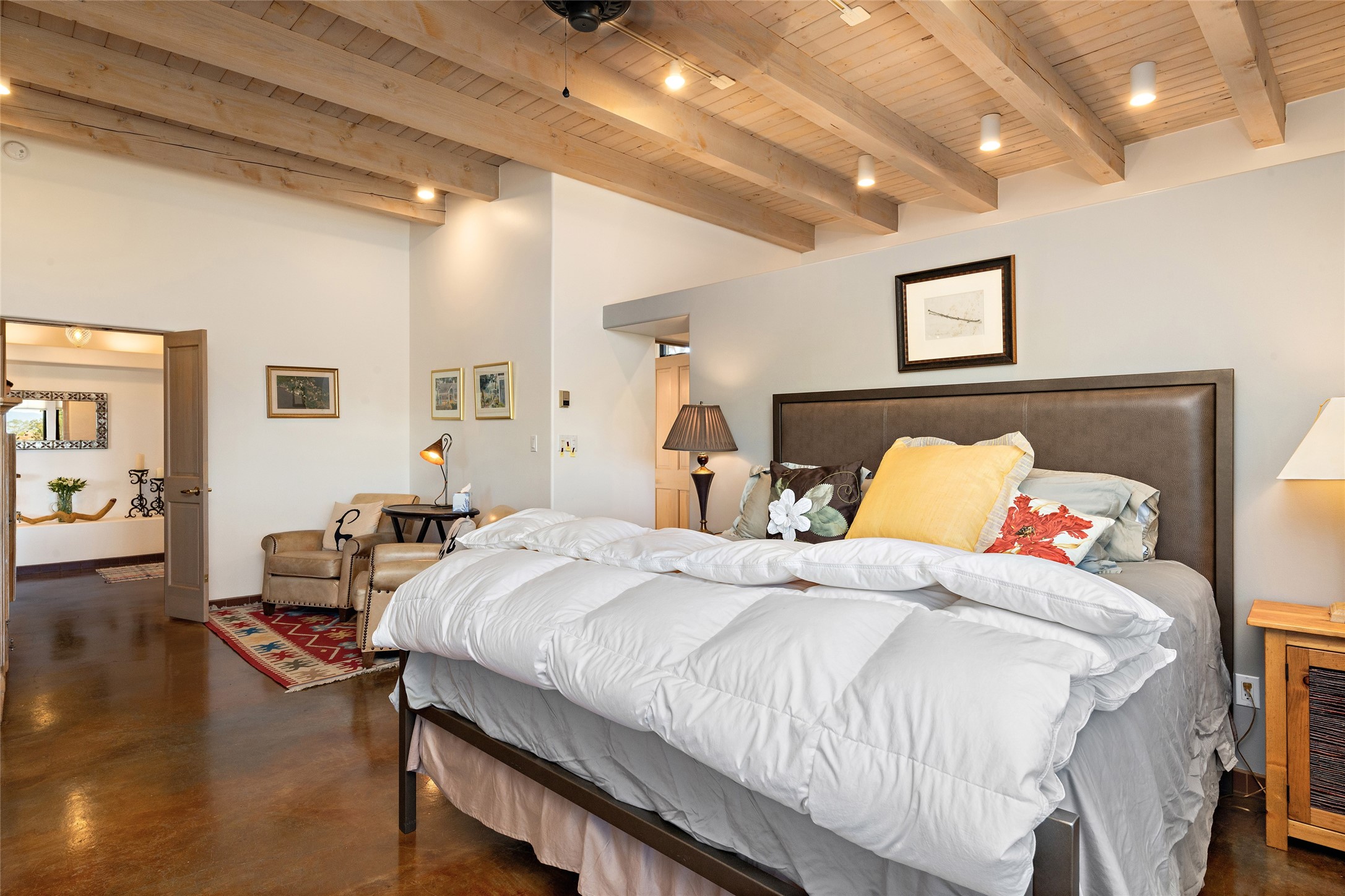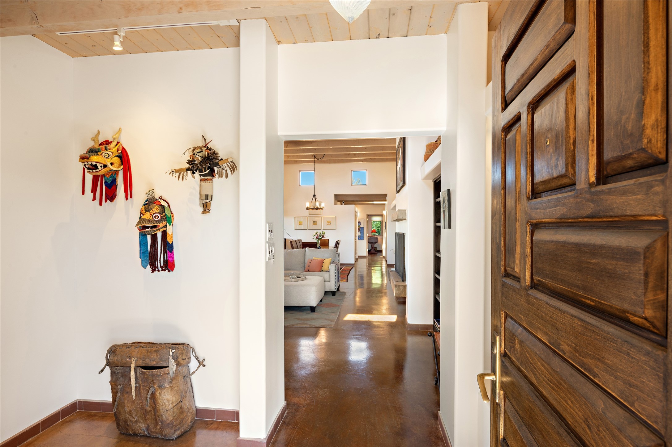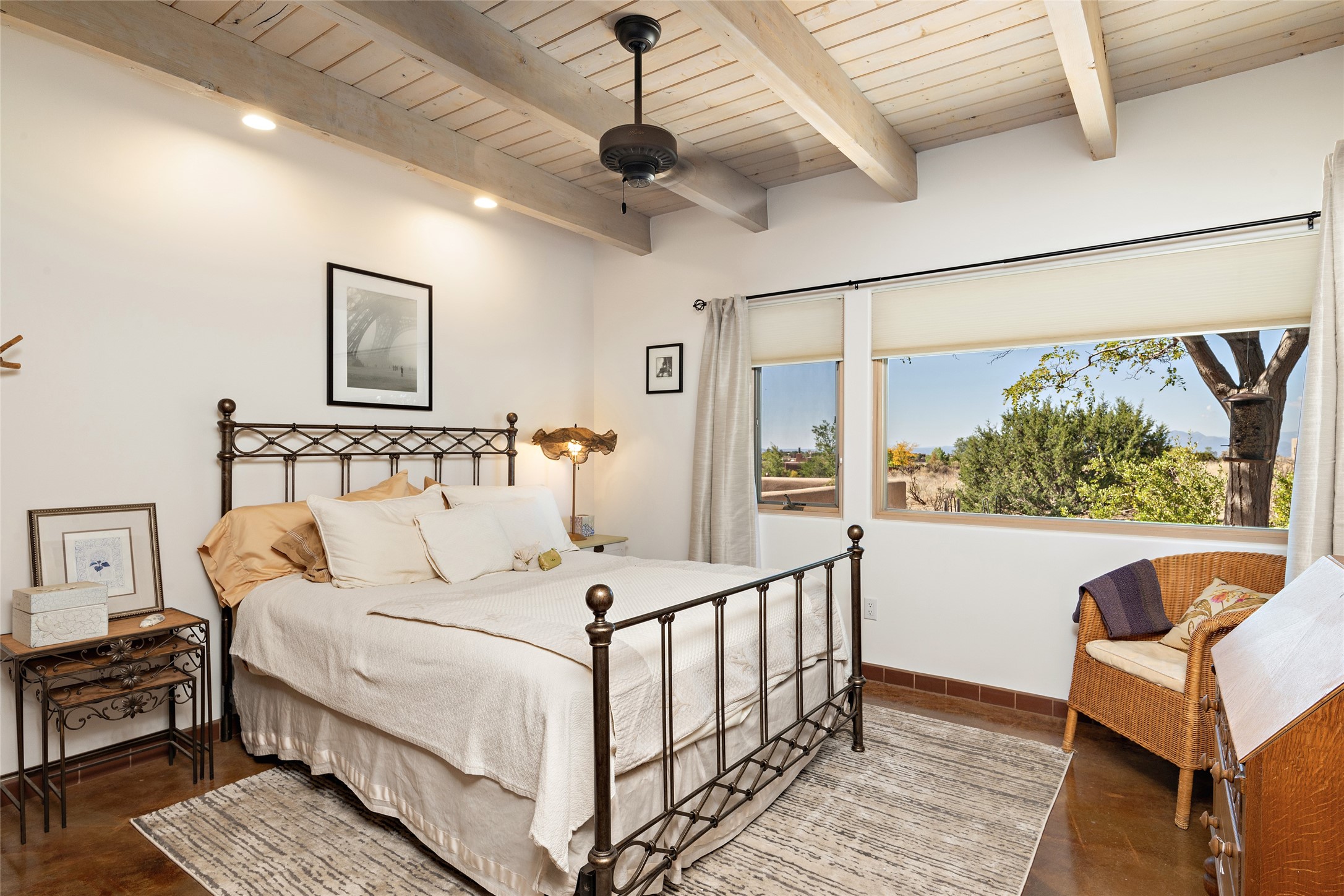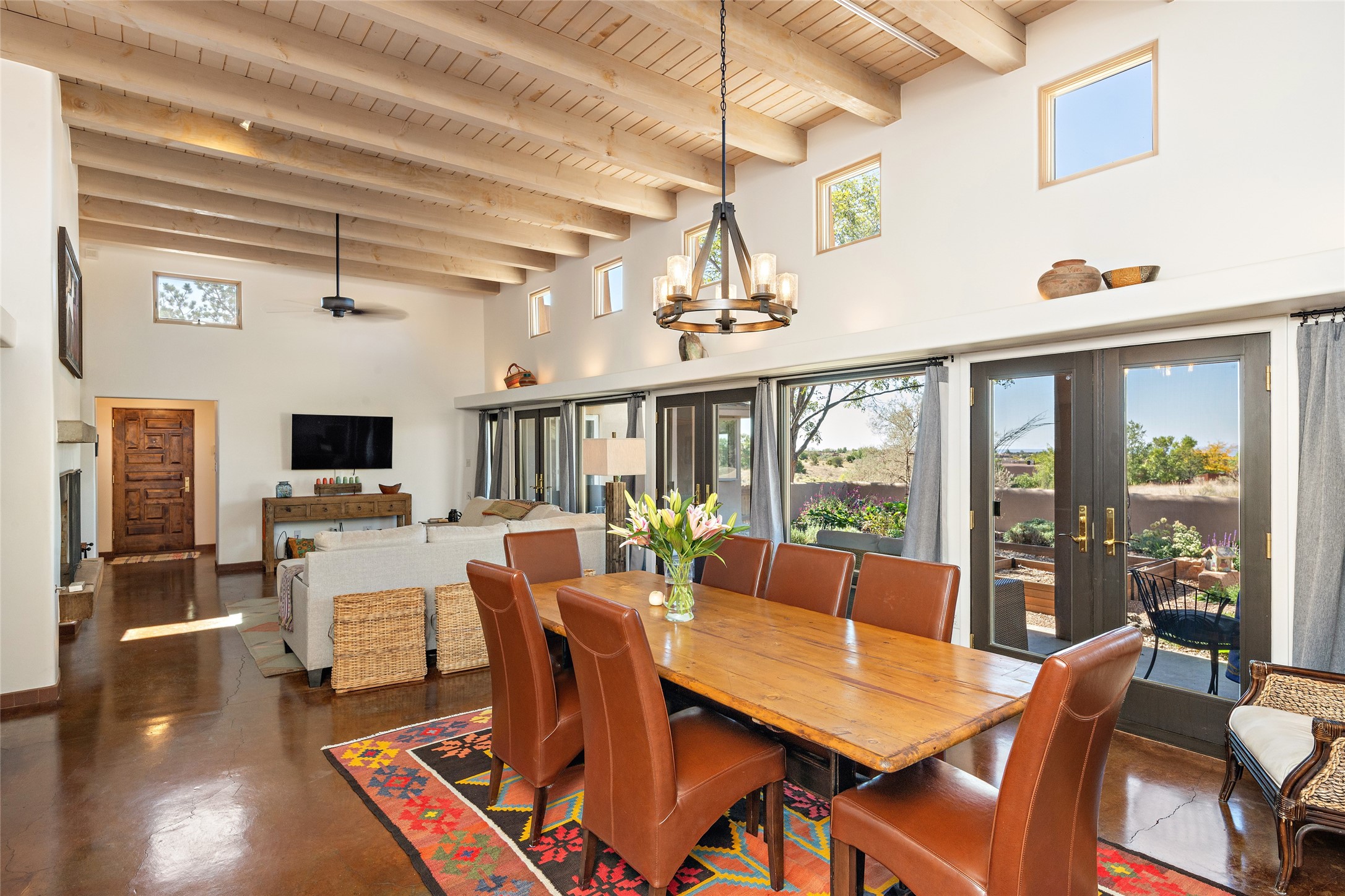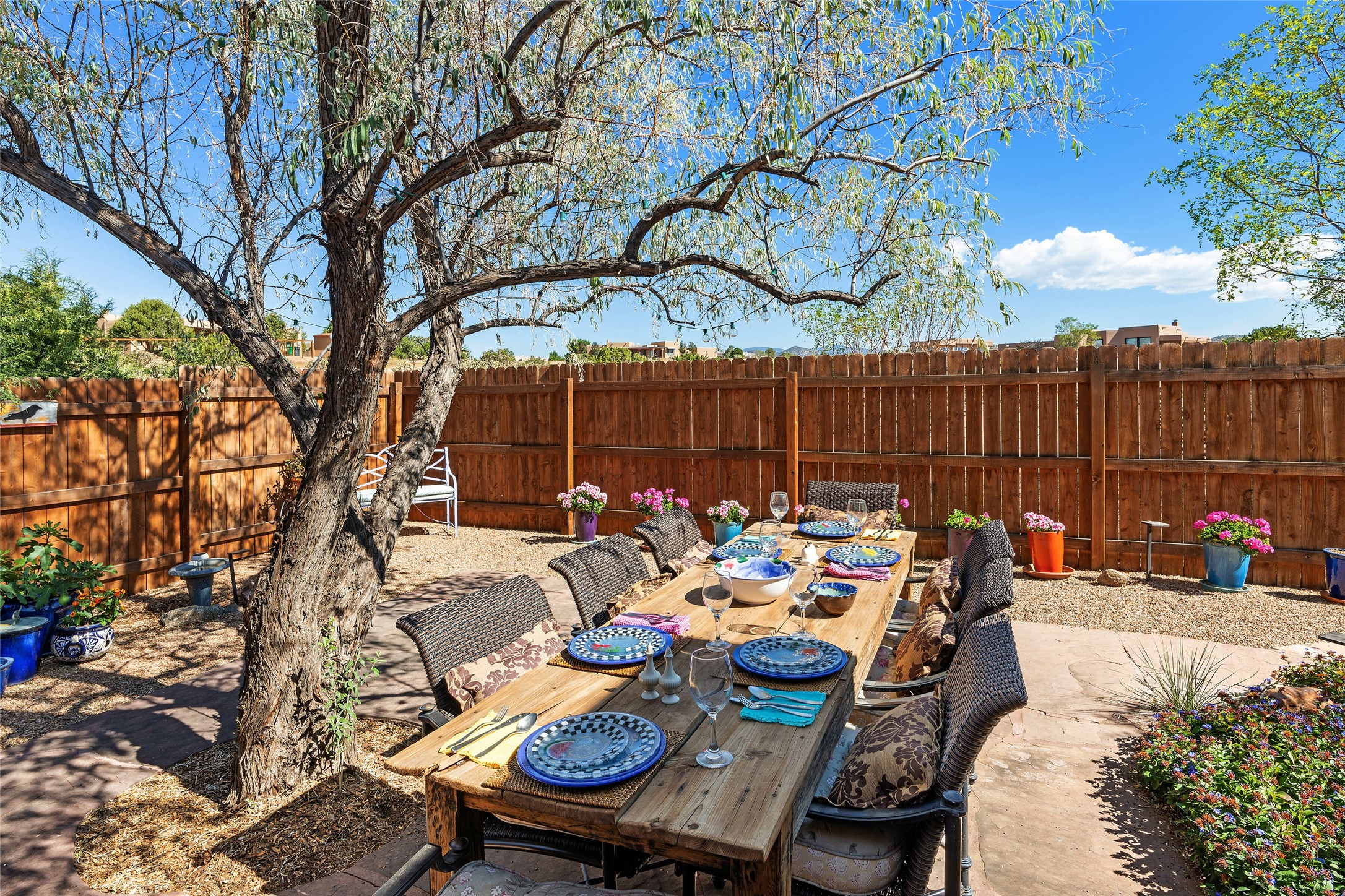 Near the crest of a gentle hill in Eldorado, this 2,418-square-foot home combines classic Santa Fe style--beamed ceilings, bancos, portales, courtyards, warm earth tones, and plaster walls--with chic contemporary flair. Walls of glass, clerestories, and skylights fill nearly every room with natural light, offer enchanting glimpses of the moon and stars, and create a feeling of being enveloped by nature. Spaces are airy, voluminous, and bright, and storage is abundant. The heart of the home is an inspiring open living and dining room with a soaring ceiling, a modern fireplace flanked by built-in bookshelves, and walls and lighting designed for the display of art and sculpture. A bank of glass doors opens to a colorful courtyard with thriving flower, herb, and vegetable garden beds lovingly maintained by a master gardener. The sleek updated kitchen features stainless-steel appliances, plentiful cabinets, a pass-through to the dining area, and a walk-in pantry. Nearby, a sunny laundry area gives way to the two-car garage and a secluded courtyard with a flagstone patio. The primary suite is a serene space with a wraparound window overlooking the gardens and hillside, glass doors opening to the portal, a well-outfitted walk-in closet, and a stylishly updated contemporary bath with a deep soaking tub, a dual-sink vanity, and a glass-walled shower. Three peaceful guest bedrooms--one of which could easily serve as an office or media room--and a shared bath are secluded in their own wing.
