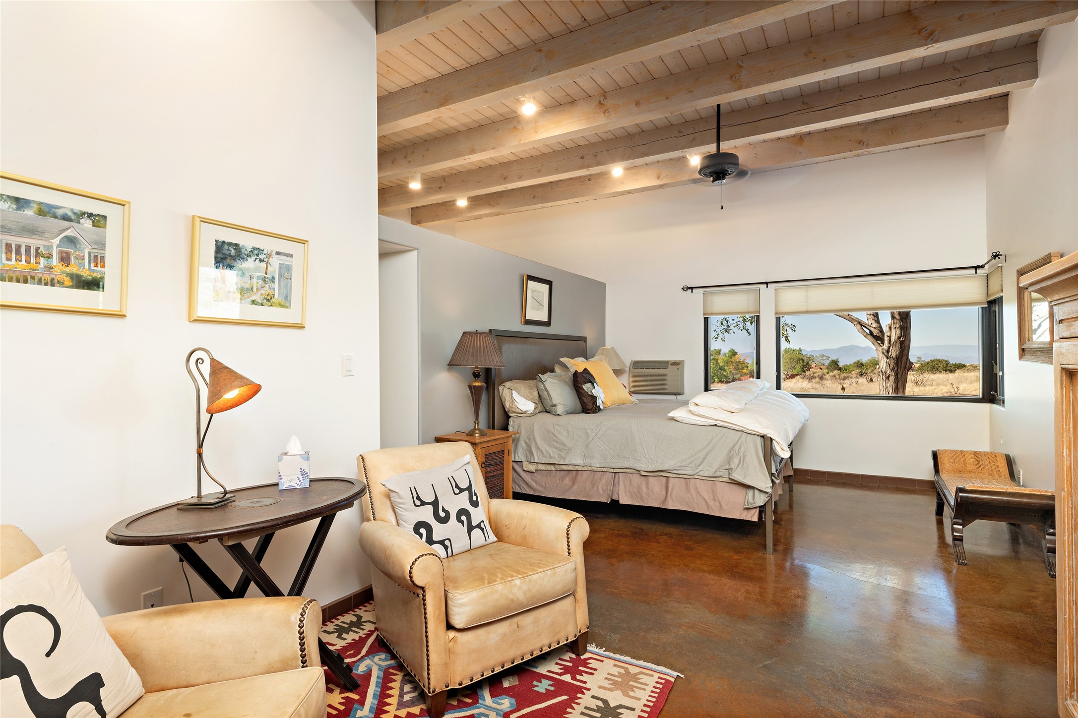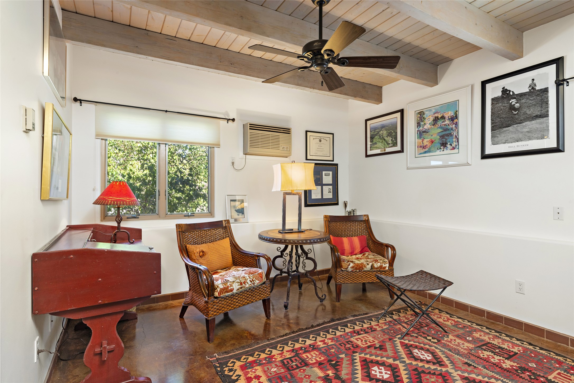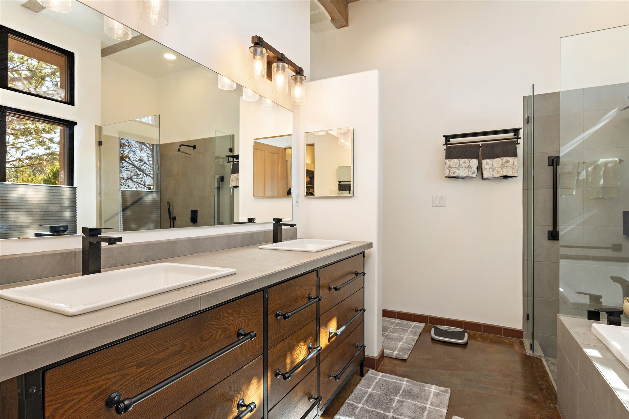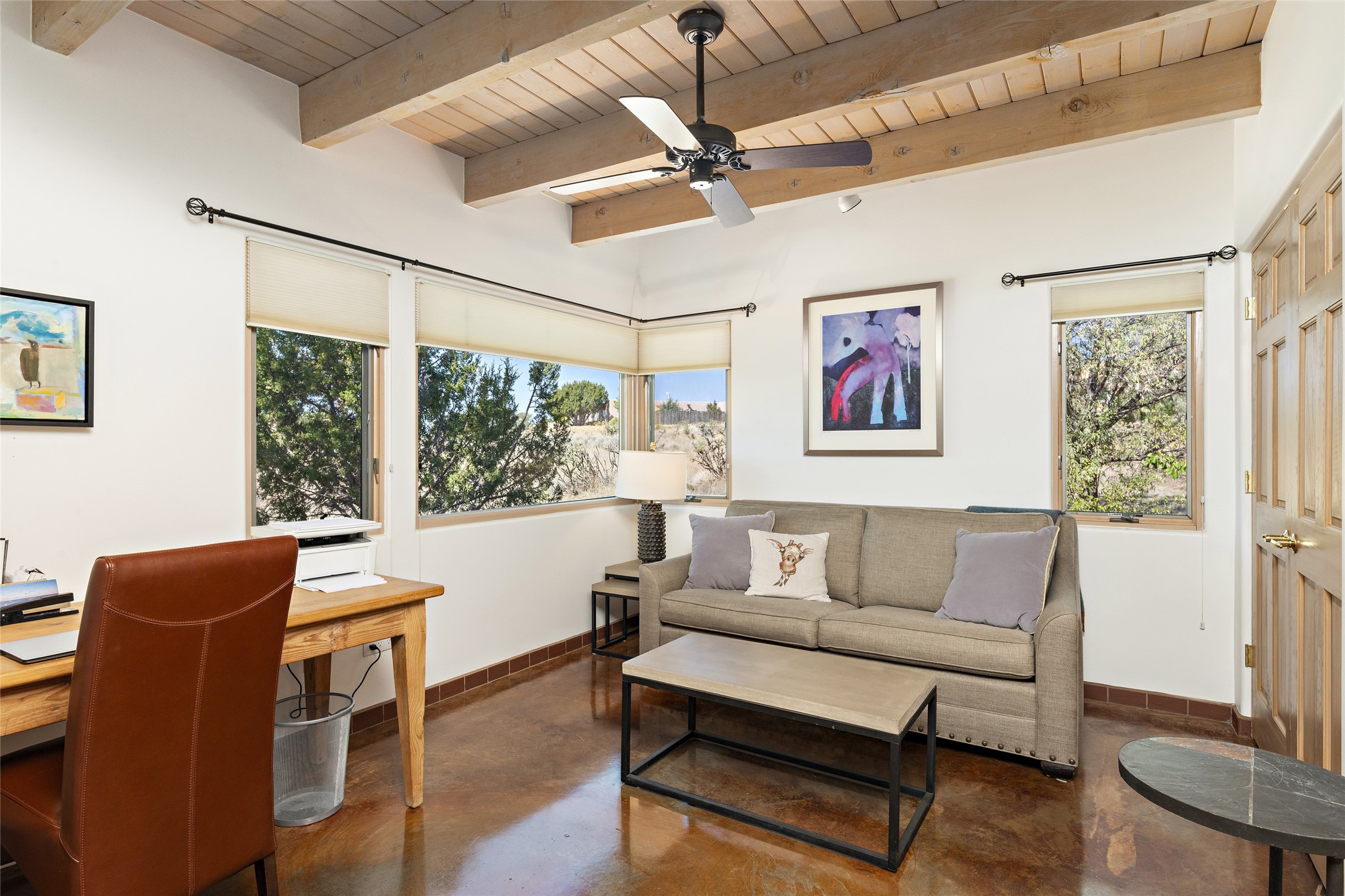 Near the crest of a gentle hill in Eldorado, this 2,418-square-foot home combines classic Santa Fe style--beamed ceilings, bancos, portales, courtyards, warm earth tones, and plaster walls--with chic contemporary flair. Walls of glass, clerestories, and skylights fill nearly every room with natural light, offer enchanting glimpses of the moon and stars, and create a feeling of being enveloped by nature. Spaces are airy, voluminous, and bright, and storage is abundant. The heart of the home is an inspiring open living and dining room with a soaring ceiling, a modern fireplace flanked by built-in bookshelves, and walls and lighting designed for the display of art and sculpture. A bank of glass doors opens to a colorful courtyard with thriving flower, herb, and vegetable garden beds lovingly maintained by a master gardener. The sleek updated kitchen features stainless-steel appliances, plentiful cabinets, a pass-through to the dining area, and a walk-in pantry. Nearby, a sunny laundry area gives way to the two-car garage and a secluded courtyard with a flagstone patio. The primary suite is a serene space with a wraparound window overlooking the gardens and hillside, glass doors opening to the portal, a well-outfitted walk-in closet, and a stylishly updated contemporary bath with a deep soaking tub, a dual-sink vanity, and a glass-walled shower. Three peaceful guest bedrooms--one of which could easily serve as an office or media room--and a shared bath are secluded in their own wing.