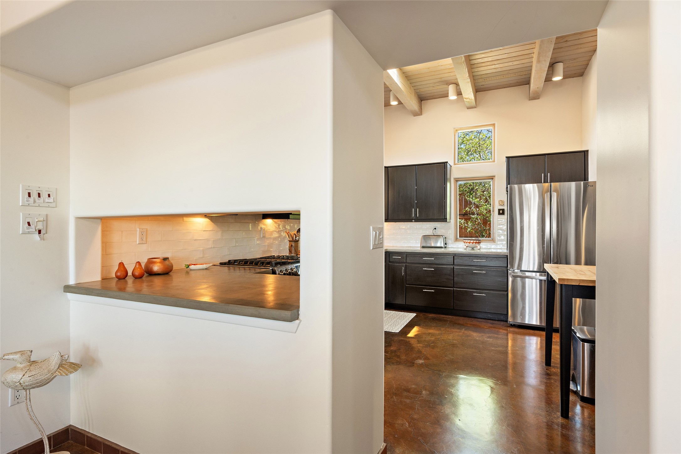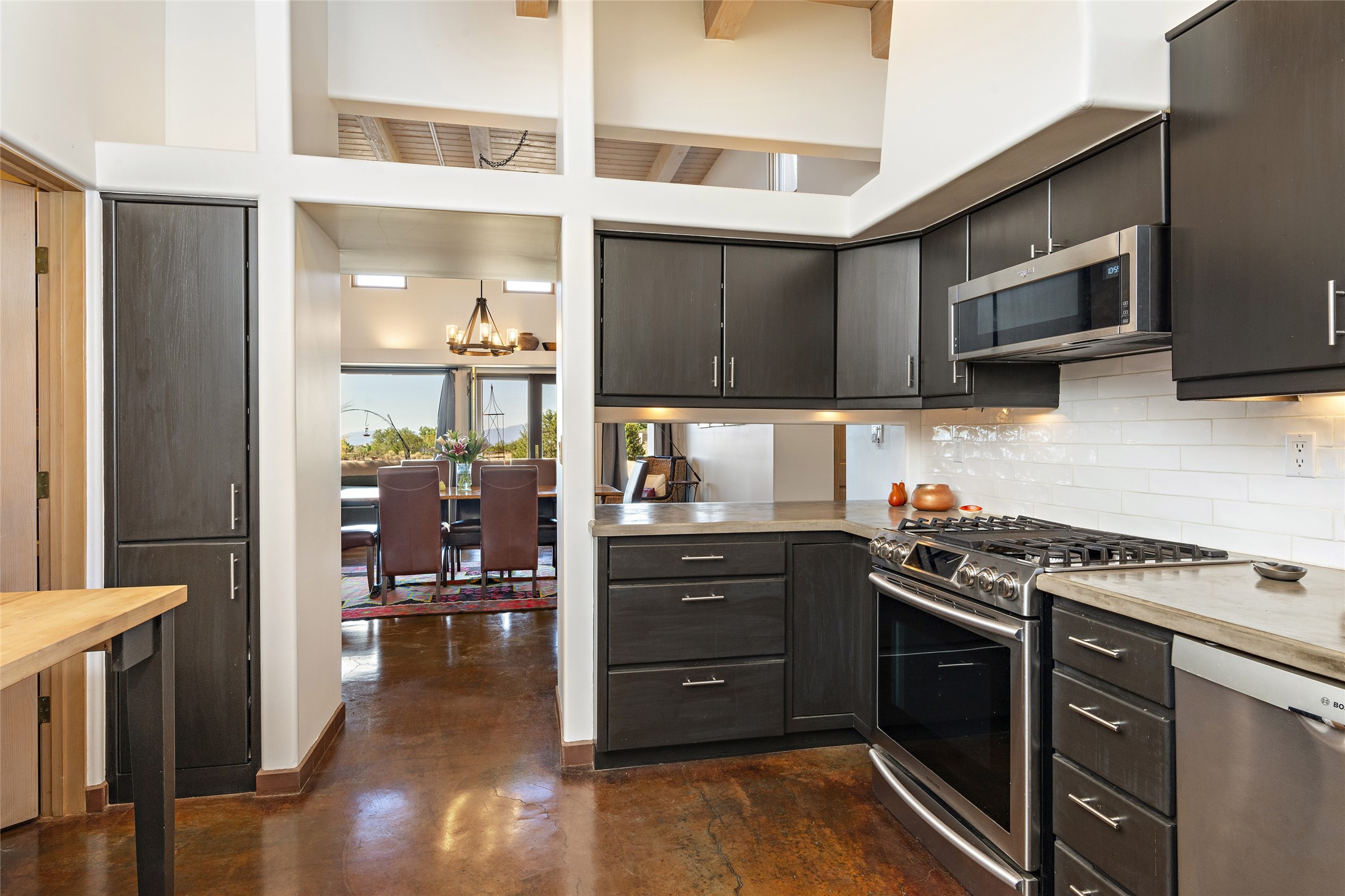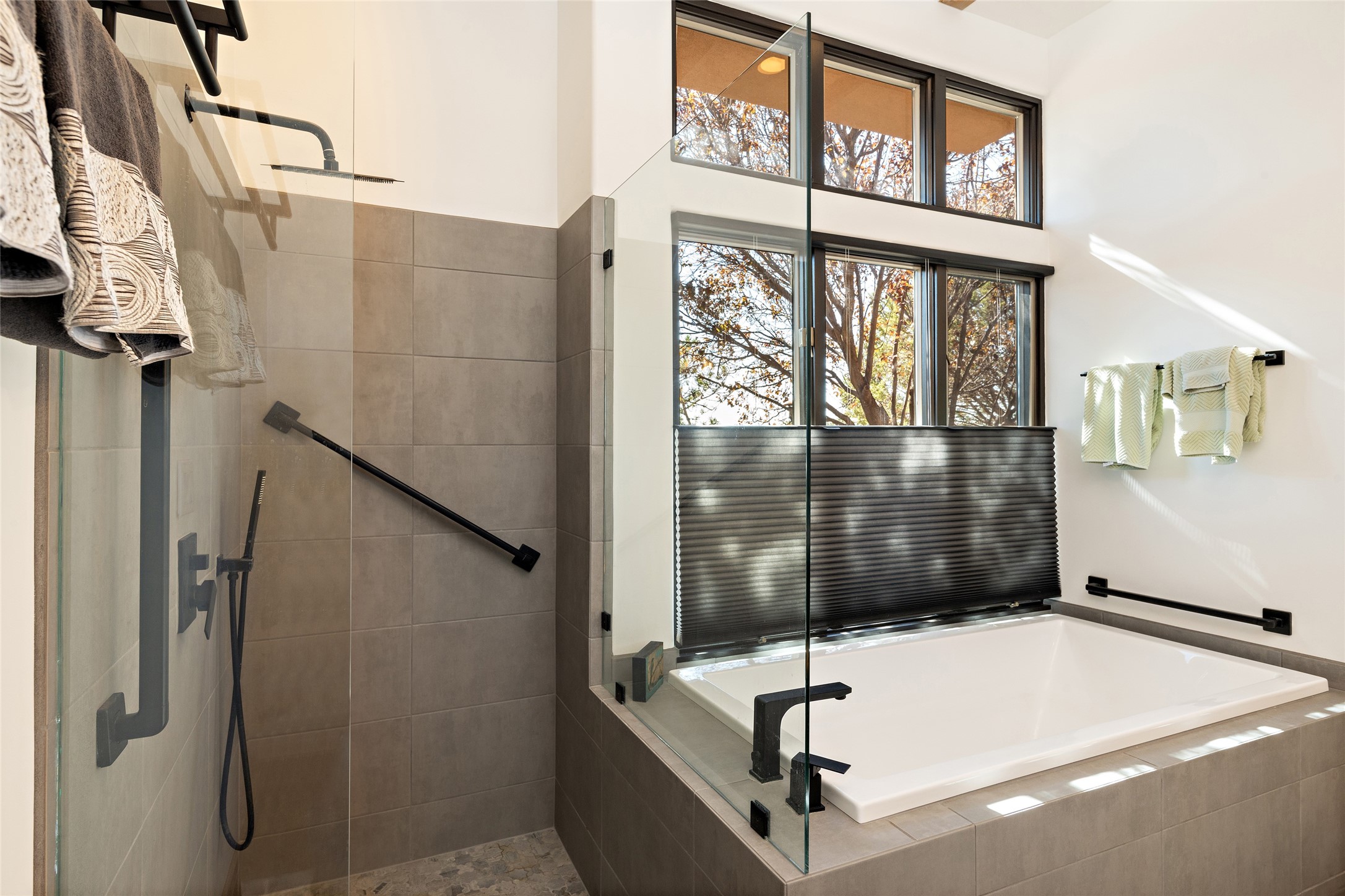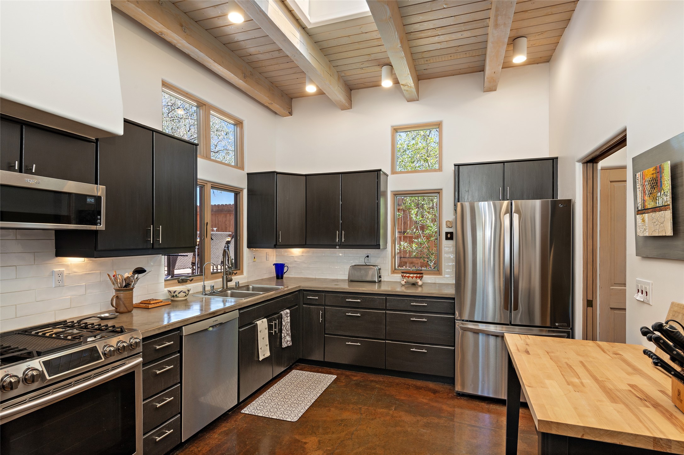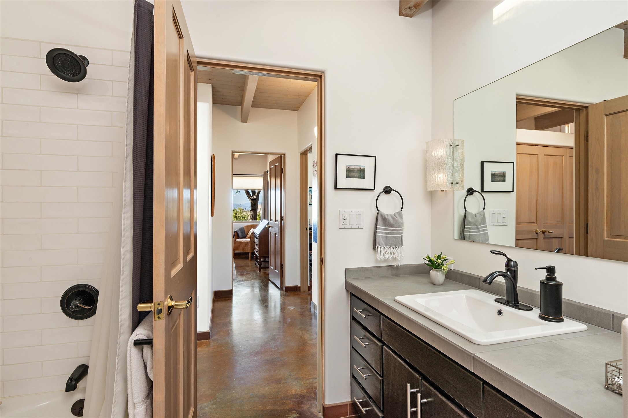 Near the crest of a gentle hill in Eldorado, this 2,418-square-foot home combines classic Santa Fe style--beamed ceilings, bancos, portales, courtyards, warm earth tones, and plaster walls--with chic contemporary flair. Walls of glass, clerestories, and skylights fill nearly every room with natural light, offer enchanting glimpses of the moon and stars, and create a feeling of being enveloped by nature. Spaces are airy, voluminous, and bright, and storage is abundant. The heart of the home is an inspiring open living and dining room with a soaring ceiling, a modern fireplace flanked by built-in bookshelves, and walls and lighting designed for the display of art and sculpture. A bank of glass doors opens to a colorful courtyard with thriving flower, herb, and vegetable garden beds lovingly maintained by a master gardener. The sleek updated kitchen features stainless-steel appliances, plentiful cabinets, a pass-through to the dining area, and a walk-in pantry. Nearby, a sunny laundry area gives way to the two-car garage and a secluded courtyard with a flagstone patio. The primary suite is a serene space with a wraparound window overlooking the gardens and hillside, glass doors opening to the portal, a well-outfitted walk-in closet, and a stylishly updated contemporary bath with a deep soaking tub, a dual-sink vanity, and a glass-walled shower. Three peaceful guest bedrooms--one of which could easily serve as an office or media room--and a shared bath are secluded in their own wing.