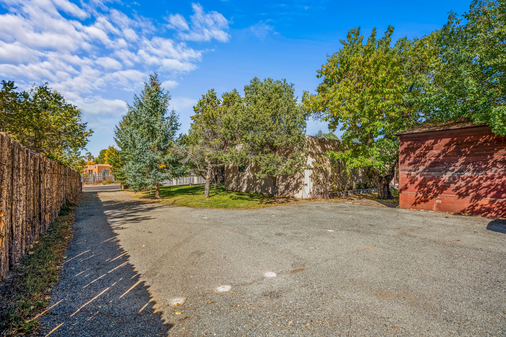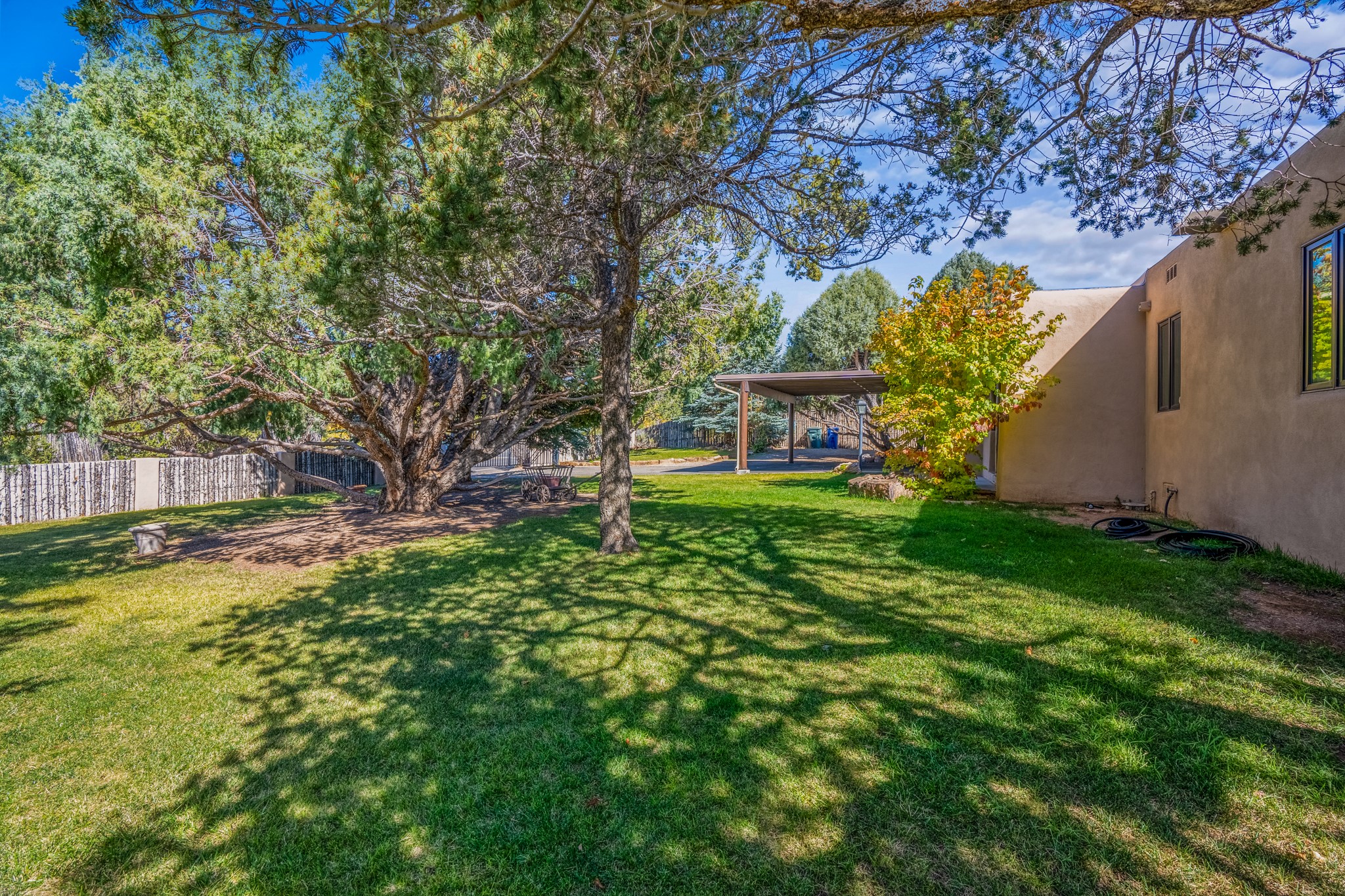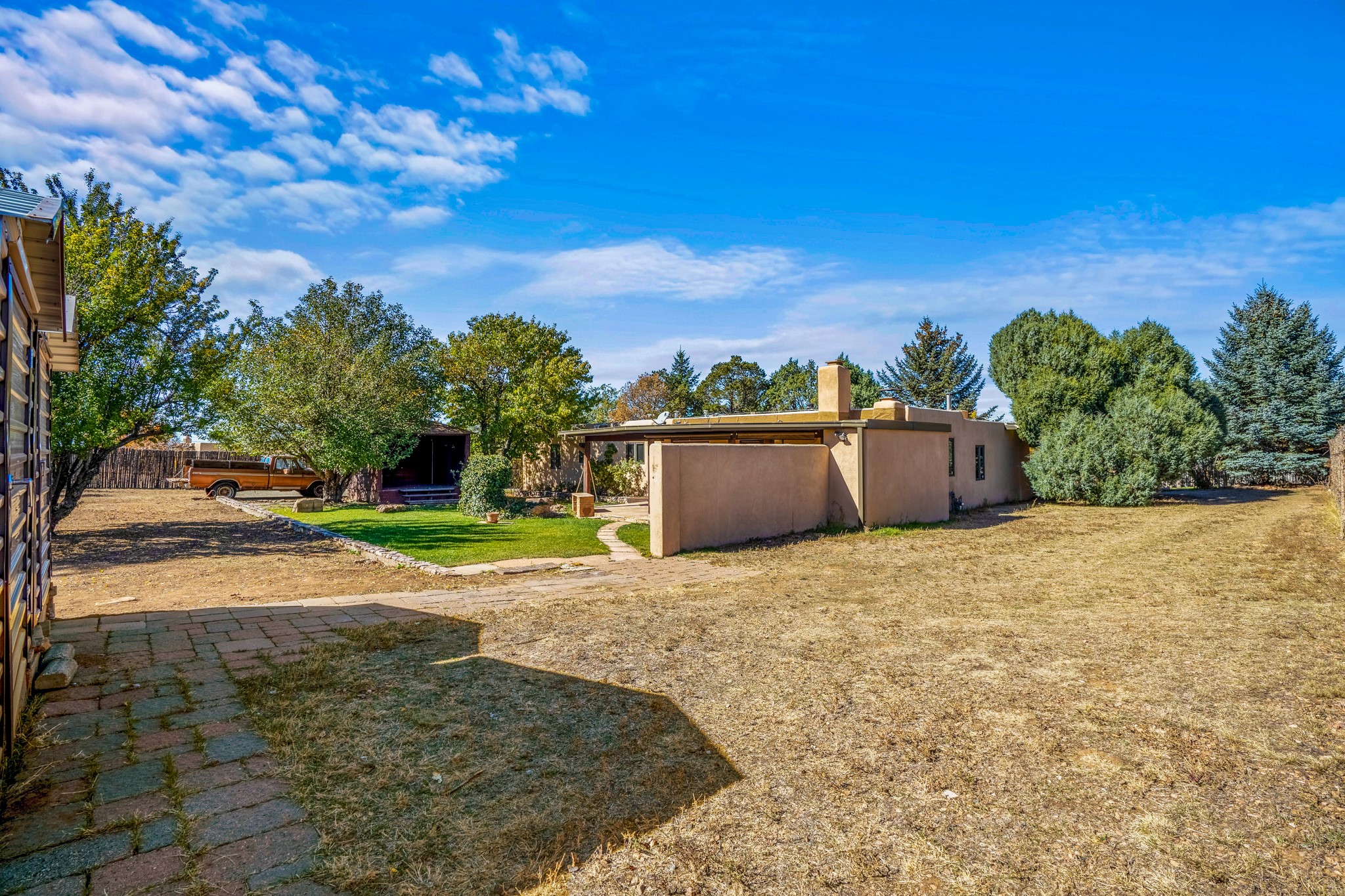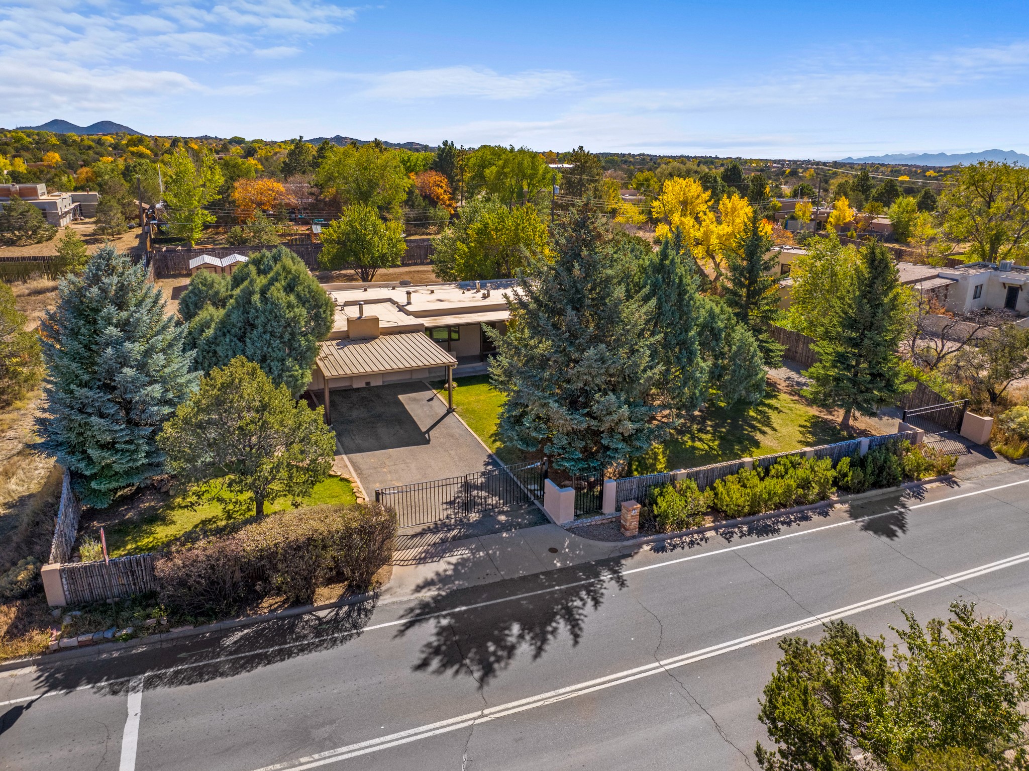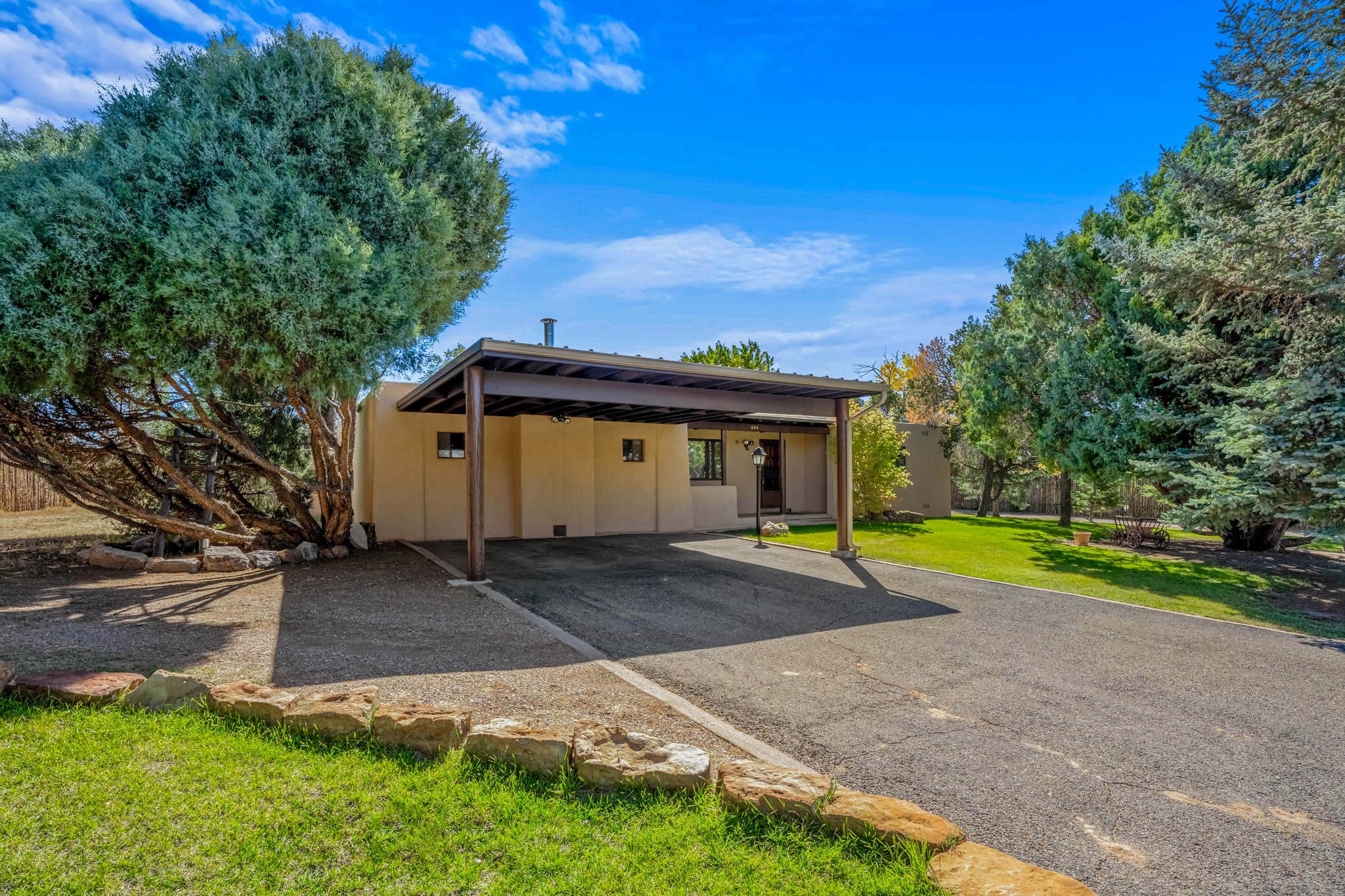 This is a home to get excited about. It is a Mid-century modern on a 1/2 acre lot located in one of the most desirable areas of town. Noted for its easy access to the hospital, I-25, Smiths grocery store and Harry Roadhouse and El Gancho, and only 12 minutes to downtown.Lovingly enjoyed and taken care of by the family over the years.This home features 3 beds, 2 baths, living room and family room with wood stoves and a private dining room with a wood burning fireplace. The bedrooms and living room have beautiful oak wood floors. Outside the kitchen is a covered portal with another fireplace for entertaining your guest all year round. This area leads to the back yard where you can enjoy the sound of water from the recirculating rock fountain. Both kids and adults and animals will delight playing in this huge completely fenced yard with green grass that is watered with the private well. Here you will find 2 large storage sheds to store your gear. Further charm of this property is mature pine trees that create shade and a story book yard that provides an oasis from the busy world. There is also an electronic gate for privacy and safety. There is no need to worry about parking either. Not only is there a carport but there is also ample parking in front and on the sides of the house. Bring your RV's and boats with no worries about restrictive covenants other than those imposed by the city. There is no HOA and no dues. On city, gas, electric and sewer. The roof is approximately 5 years old and is still under warranty with "Fix my Roof". Furnace is 2 years old. Most of the windows have been replaced with double pain windows. This well located mid-century home is waiting for your creative touches to give it a fresh contemporary look.