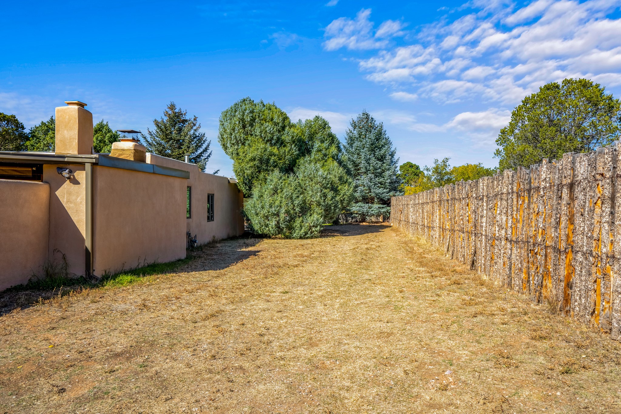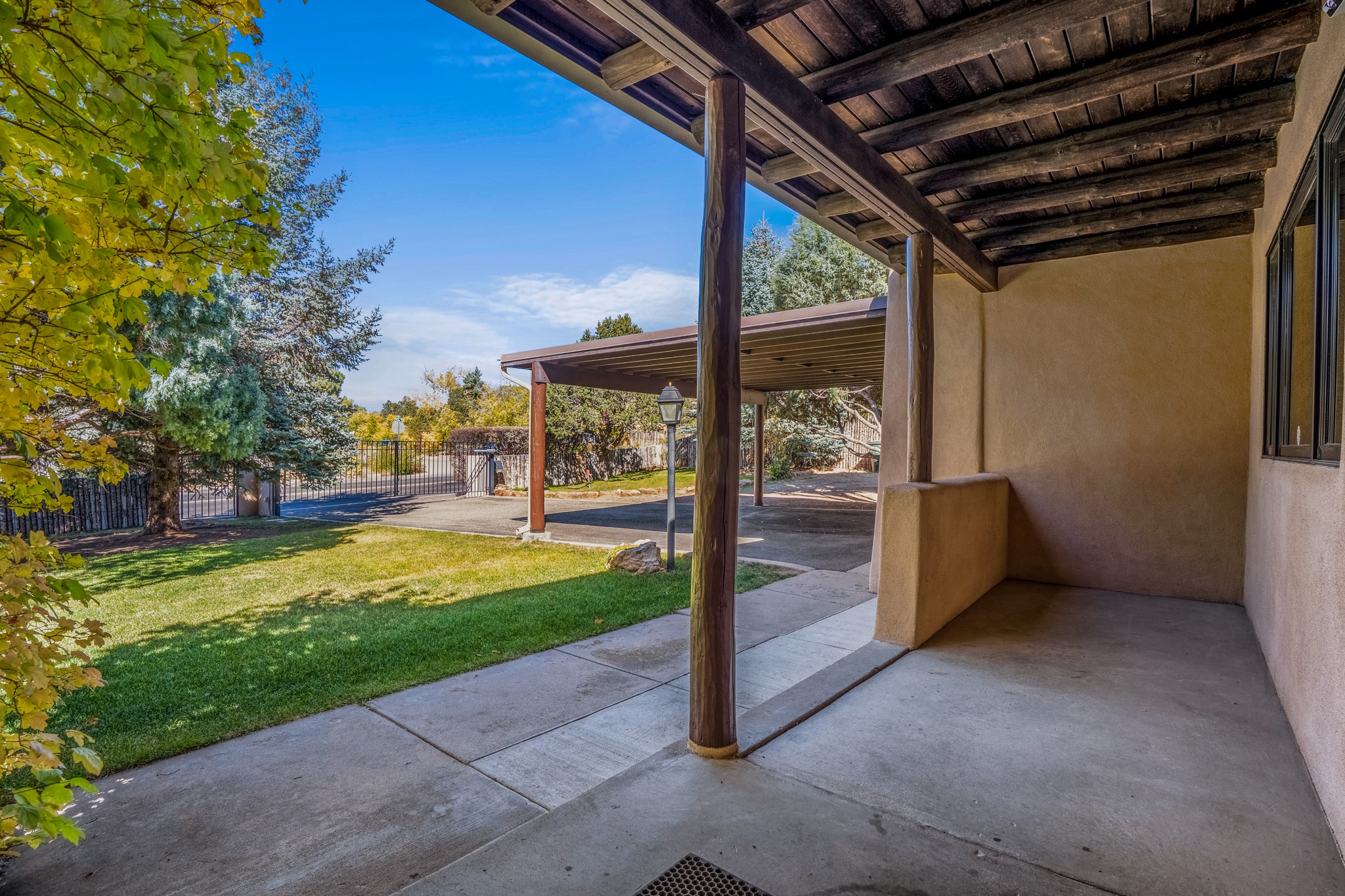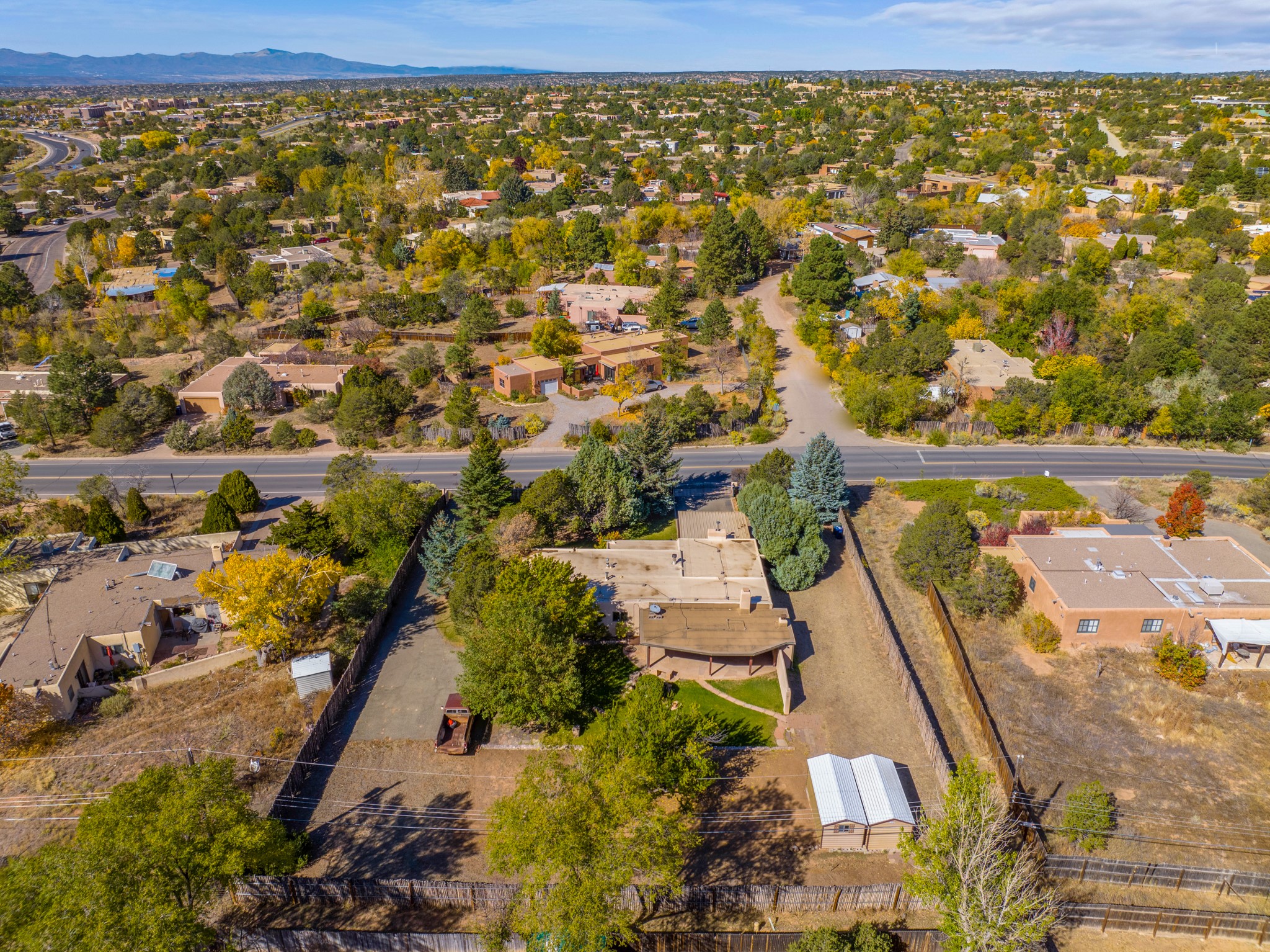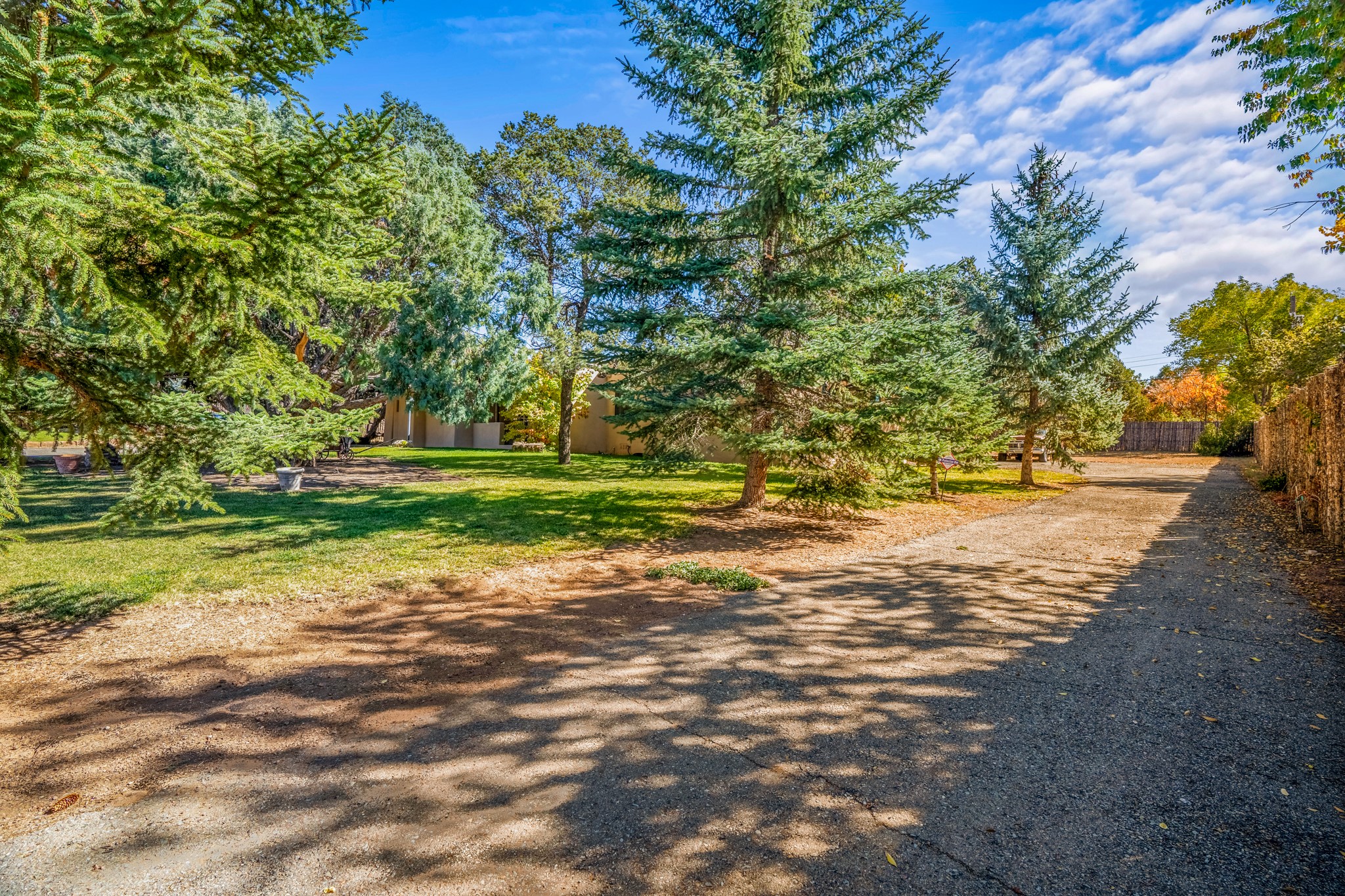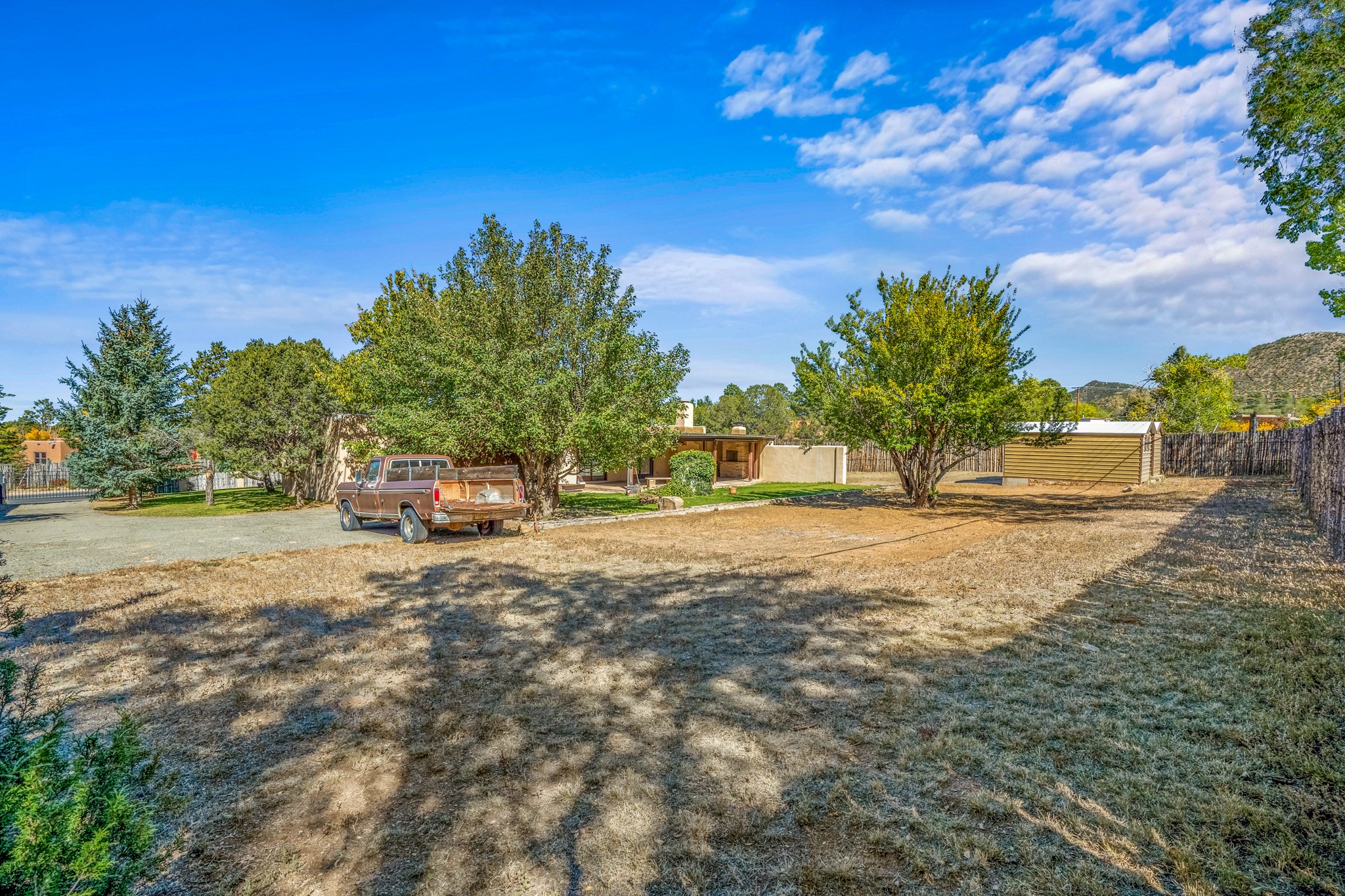 This is a home to get excited about. It is a Mid-century modern on a 1/2 acre lot located in one of the most desirable areas of town. Noted for its easy access to the hospital, I-25, Smiths grocery store and Harry Roadhouse and El Gancho, and only 12 minutes to downtown.Lovingly enjoyed and taken care of by the family over the years.This home features 3 beds, 2 baths, living room and family room with wood stoves and a private dining room with a wood burning fireplace. The bedrooms and living room have beautiful oak wood floors. Outside the kitchen is a covered portal with another fireplace for entertaining your guest all year round. This area leads to the back yard where you can enjoy the sound of water from the recirculating rock fountain. Both kids and adults and animals will delight playing in this huge completely fenced yard with green grass that is watered with the private well. Here you will find 2 large storage sheds to store your gear. Further charm of this property is mature pine trees that create shade and a story book yard that provides an oasis from the busy world. There is also an electronic gate for privacy and safety. There is no need to worry about parking either. Not only is there a carport but there is also ample parking in front and on the sides of the house. Bring your RV's and boats with no worries about restrictive covenants other than those imposed by the city. There is no HOA and no dues. On city, gas, electric and sewer. The roof is approximately 5 years old and is still under warranty with "Fix my Roof". Furnace is 2 years old. Most of the windows have been replaced with double pain windows. This well located mid-century home is waiting for your creative touches to give it a fresh contemporary look.