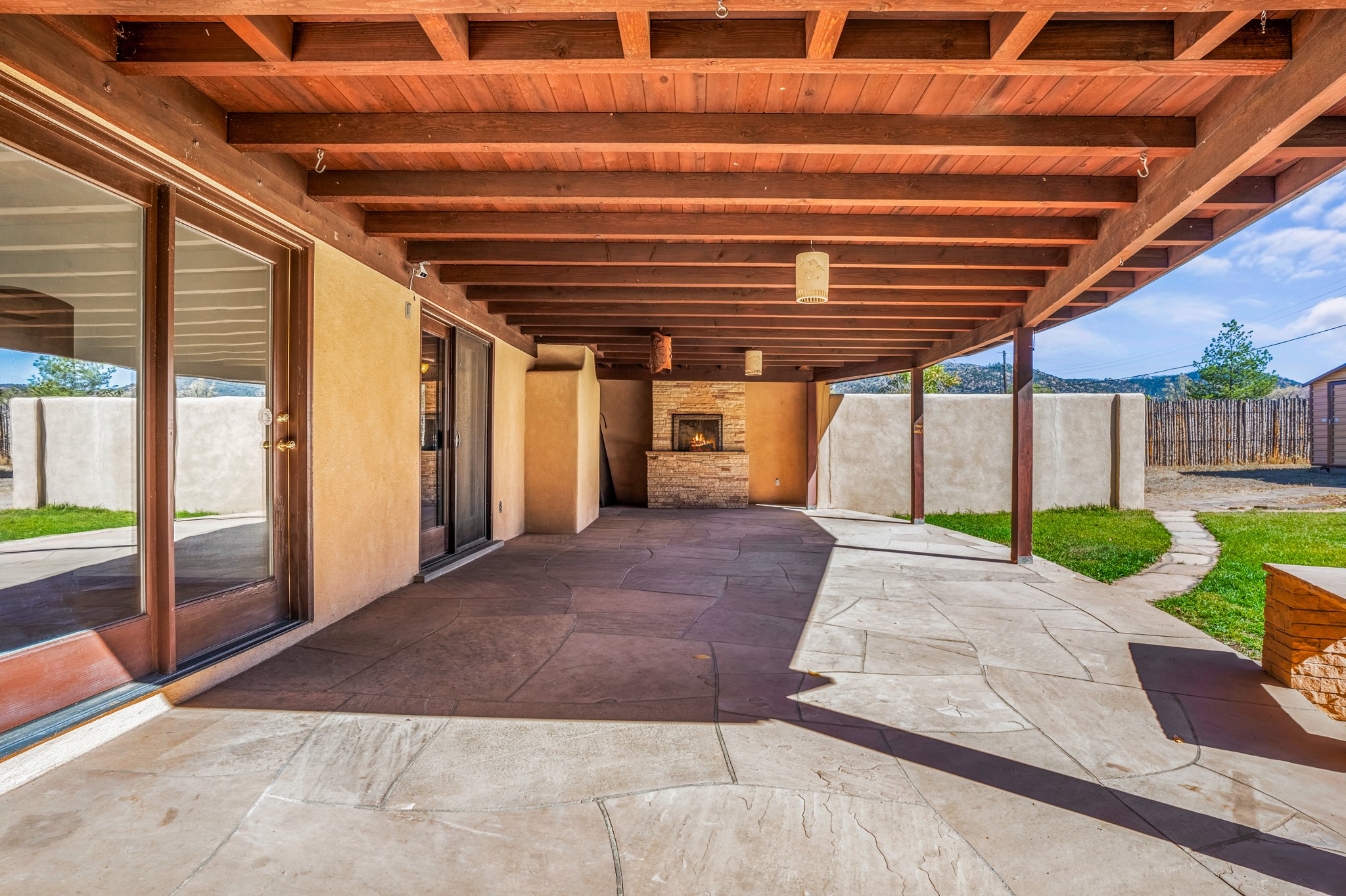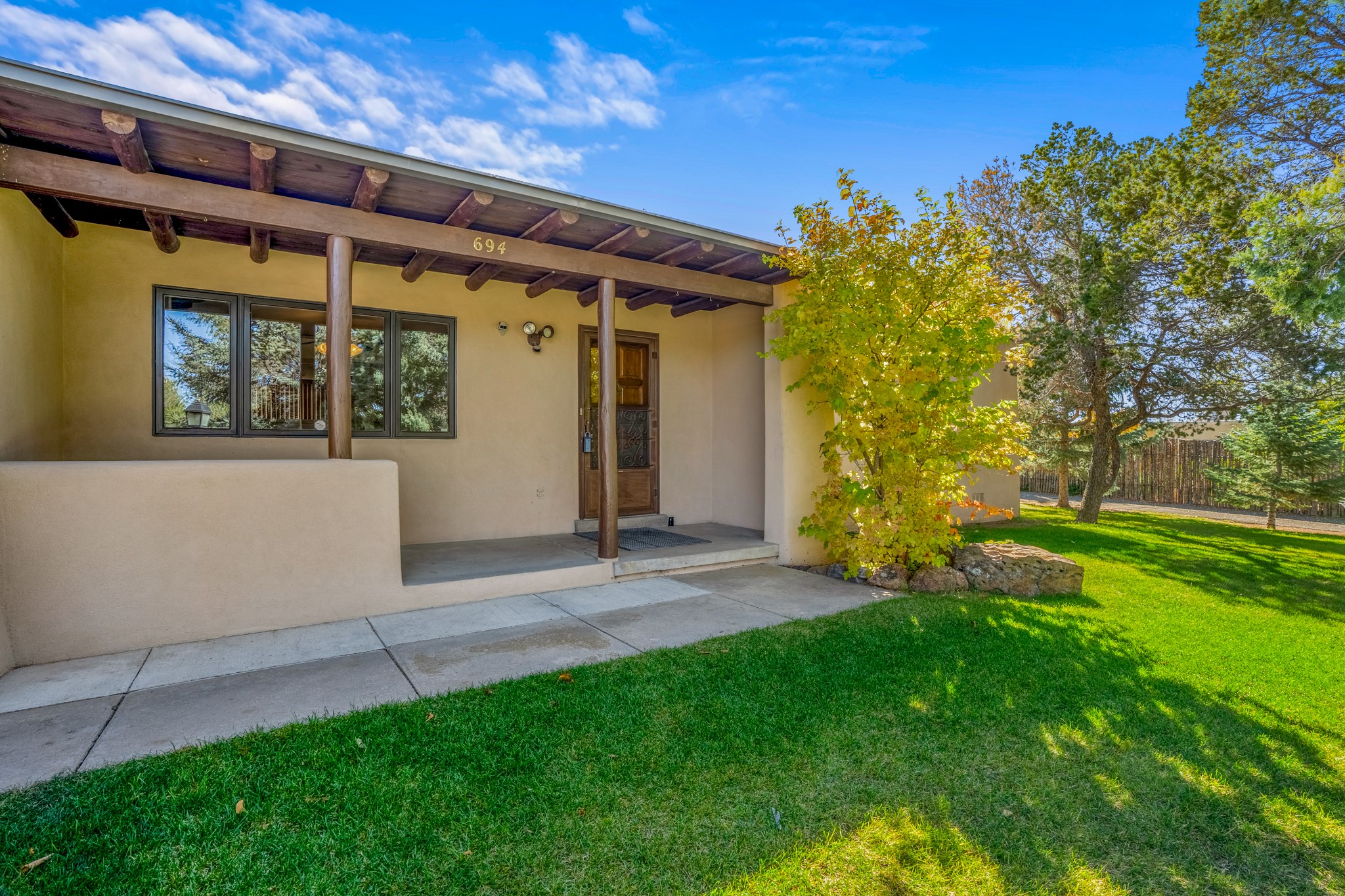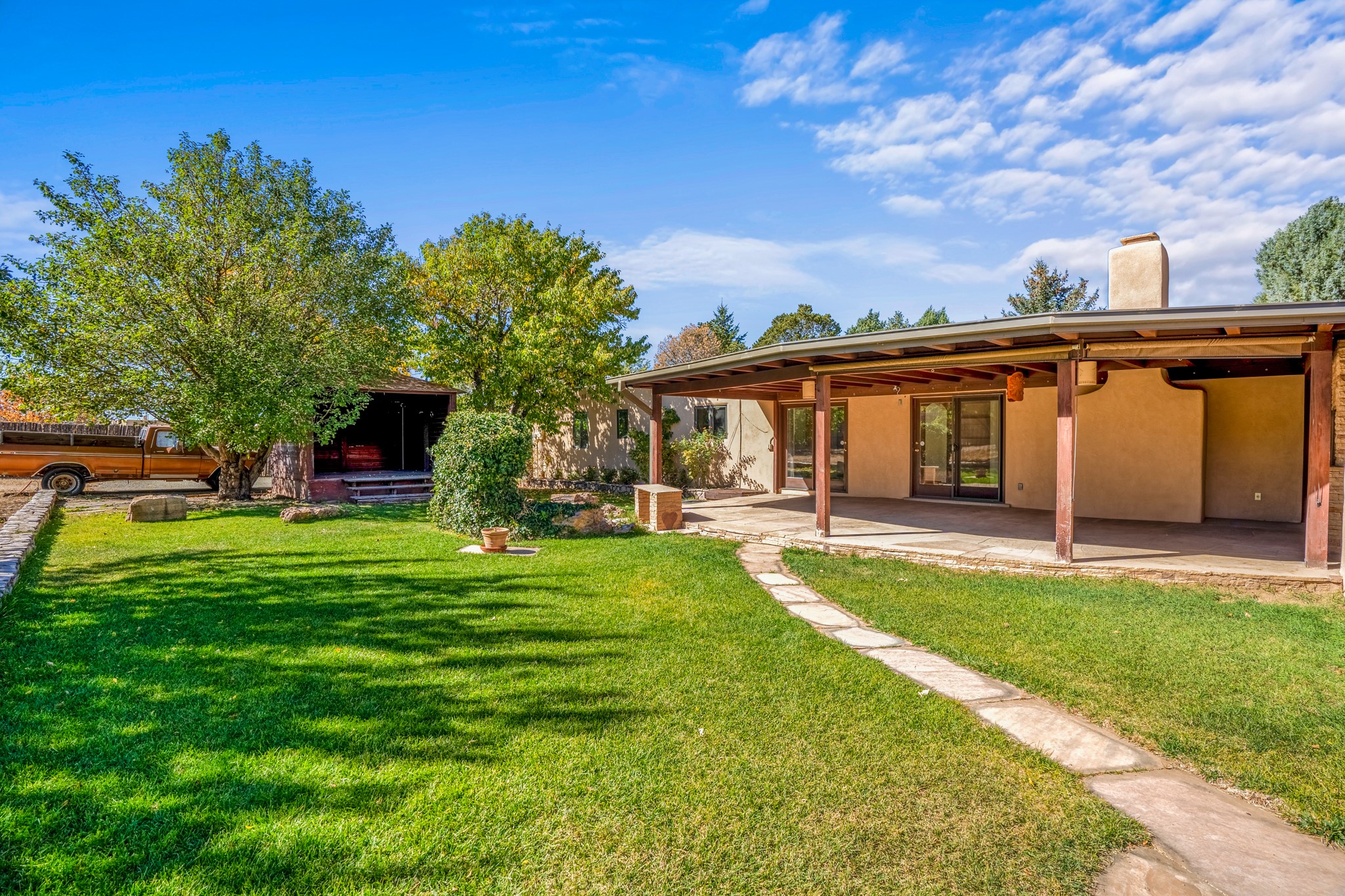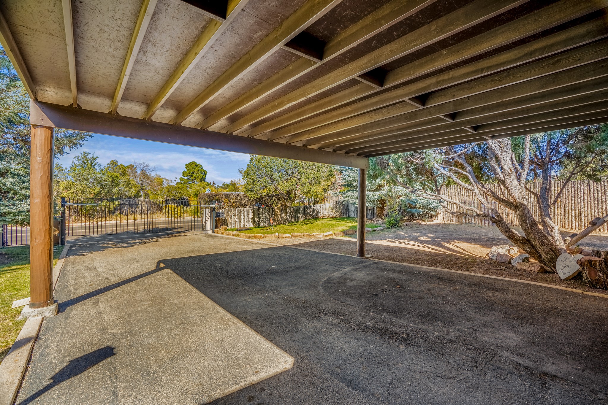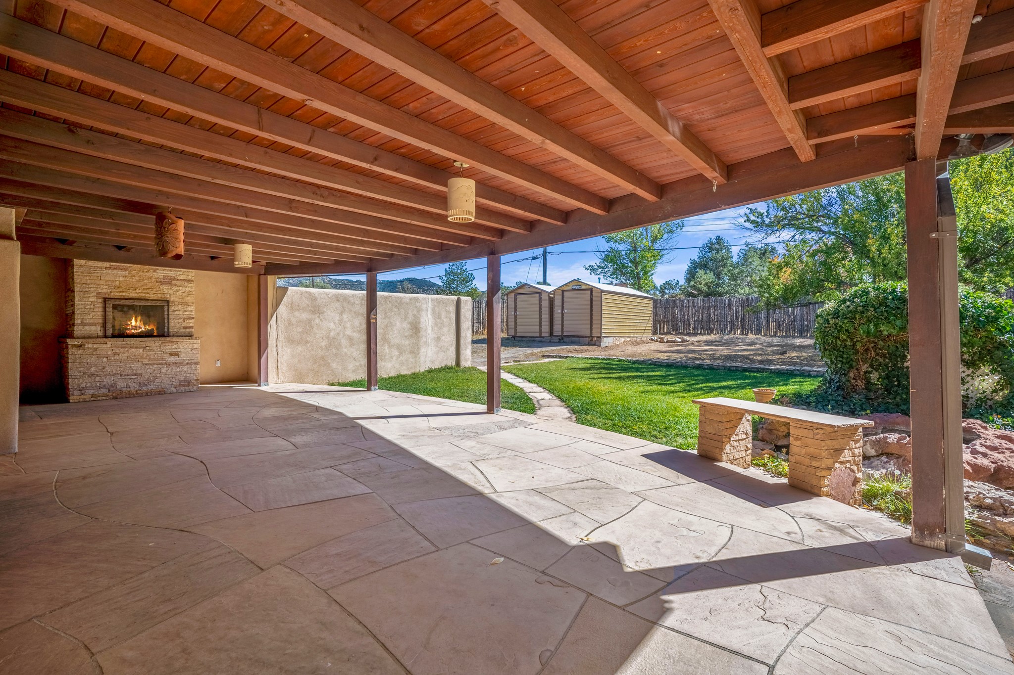 This is a home to get excited about. It is a Mid-century modern on a 1/2 acre lot located in one of the most desirable areas of town. Noted for its easy access to the hospital, I-25, Smiths grocery store and Harry Roadhouse and El Gancho, and only 12 minutes to downtown.Lovingly enjoyed and taken care of by the family over the years.This home features 3 beds, 2 baths, living room and family room with wood stoves and a private dining room with a wood burning fireplace. The bedrooms and living room have beautiful oak wood floors. Outside the kitchen is a covered portal with another fireplace for entertaining your guest all year round. This area leads to the back yard where you can enjoy the sound of water from the recirculating rock fountain. Both kids and adults and animals will delight playing in this huge completely fenced yard with green grass that is watered with the private well. Here you will find 2 large storage sheds to store your gear. Further charm of this property is mature pine trees that create shade and a story book yard that provides an oasis from the busy world. There is also an electronic gate for privacy and safety. There is no need to worry about parking either. Not only is there a carport but there is also ample parking in front and on the sides of the house. Bring your RV's and boats with no worries about restrictive covenants other than those imposed by the city. There is no HOA and no dues. On city, gas, electric and sewer. The roof is approximately 5 years old and is still under warranty with "Fix my Roof". Furnace is 2 years old. Most of the windows have been replaced with double pain windows. This well located mid-century home is waiting for your creative touches to give it a fresh contemporary look.
