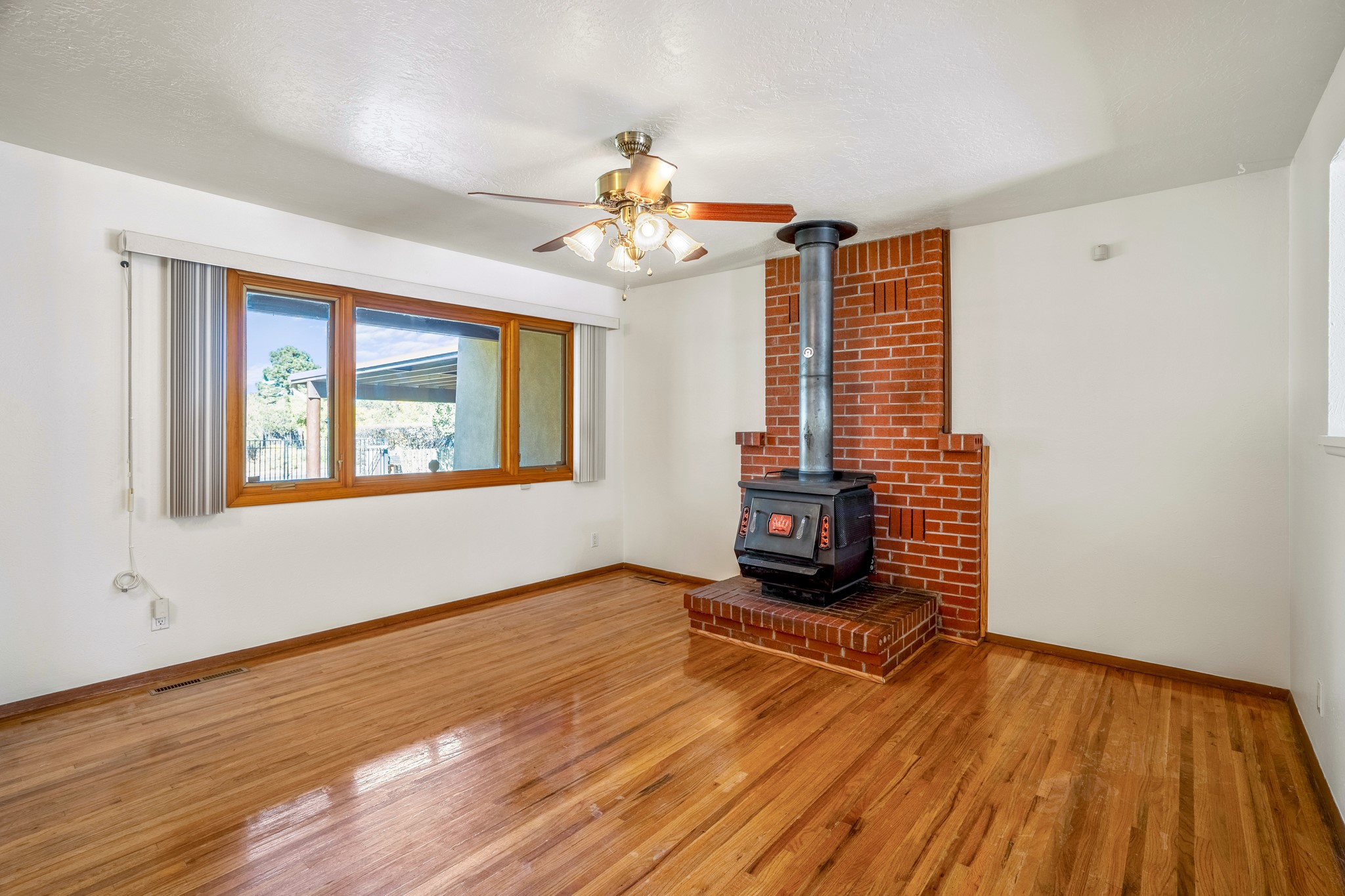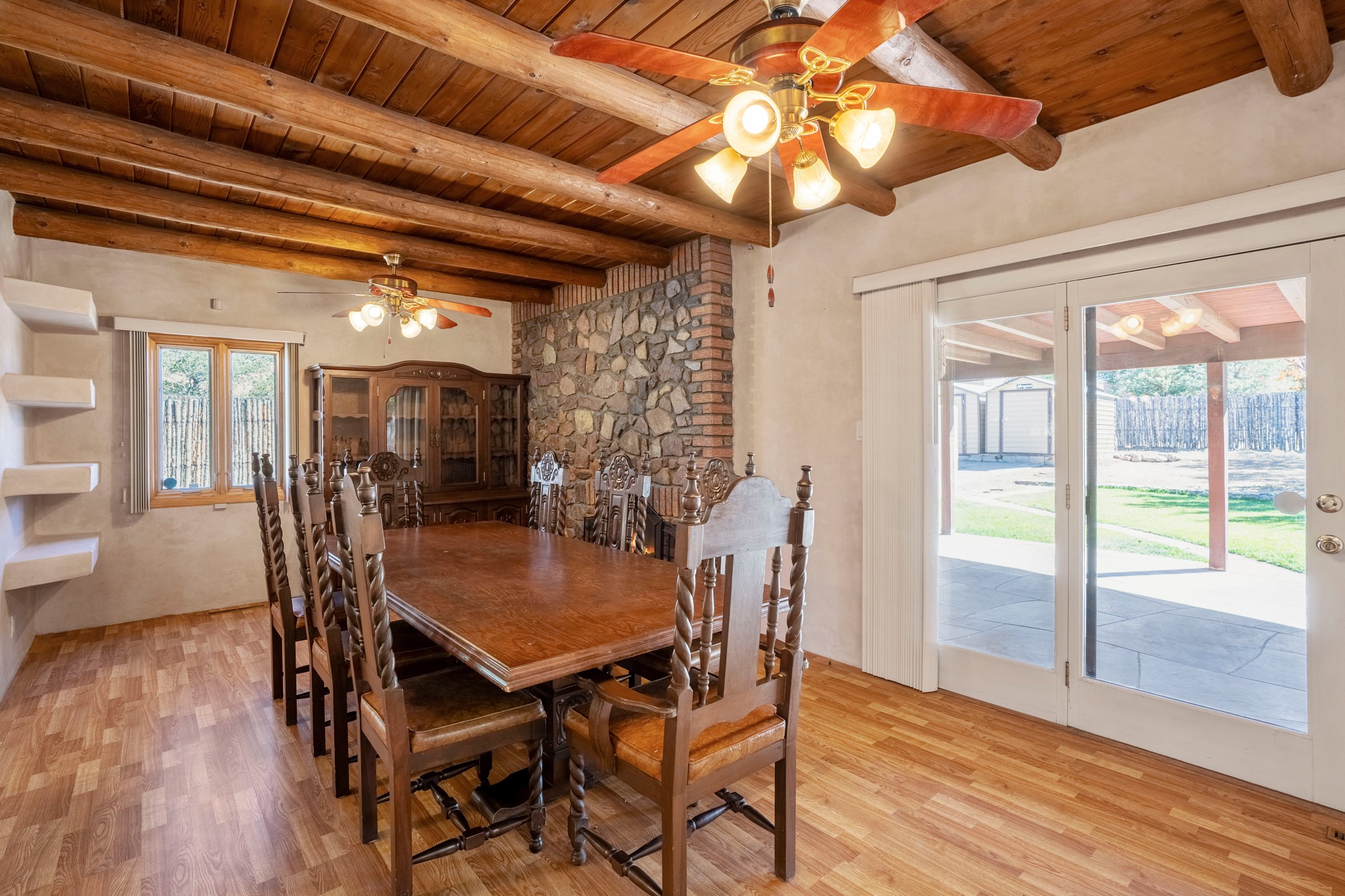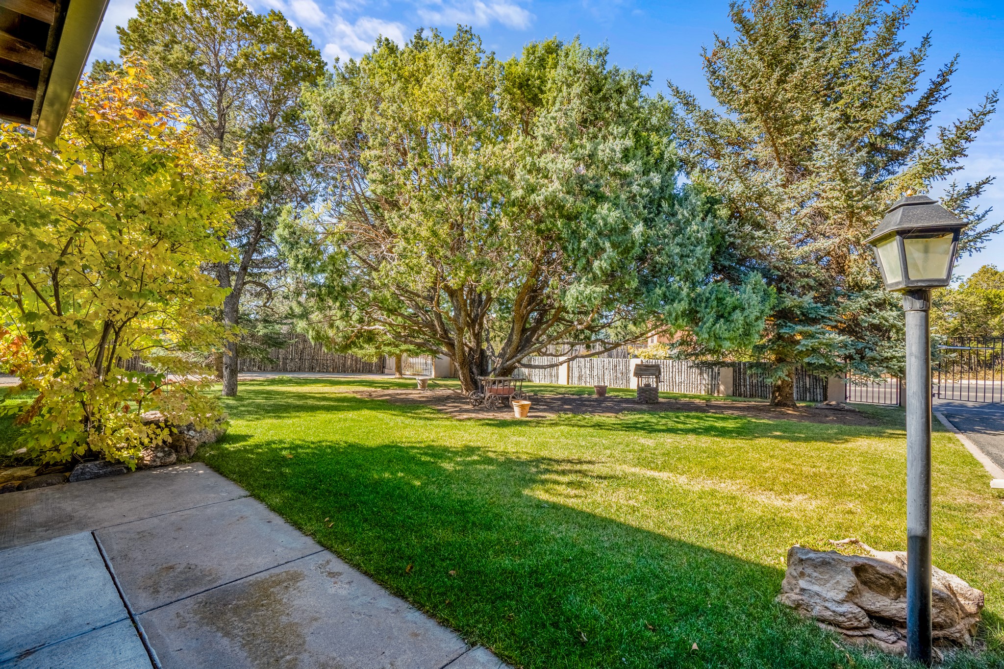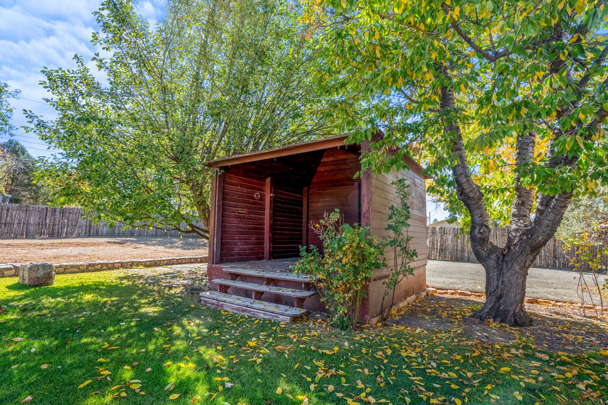 This is a home to get excited about. It is a Mid-century modern on a 1/2 acre lot located in one of the most desirable areas of town. Noted for its easy access to the hospital, I-25, Smiths grocery store and Harry Roadhouse and El Gancho, and only 12 minutes to downtown.Lovingly enjoyed and taken care of by the family over the years.This home features 3 beds, 2 baths, living room and family room with wood stoves and a private dining room with a wood burning fireplace. The bedrooms and living room have beautiful oak wood floors. Outside the kitchen is a covered portal with another fireplace for entertaining your guest all year round. This area leads to the back yard where you can enjoy the sound of water from the recirculating rock fountain. Both kids and adults and animals will delight playing in this huge completely fenced yard with green grass that is watered with the private well. Here you will find 2 large storage sheds to store your gear. Further charm of this property is mature pine trees that create shade and a story book yard that provides an oasis from the busy world. There is also an electronic gate for privacy and safety. There is no need to worry about parking either. Not only is there a carport but there is also ample parking in front and on the sides of the house. Bring your RV's and boats with no worries about restrictive covenants other than those imposed by the city. There is no HOA and no dues. On city, gas, electric and sewer. The roof is approximately 5 years old and is still under warranty with "Fix my Roof". Furnace is 2 years old. Most of the windows have been replaced with double pain windows. This well located mid-century home is waiting for your creative touches to give it a fresh contemporary look.