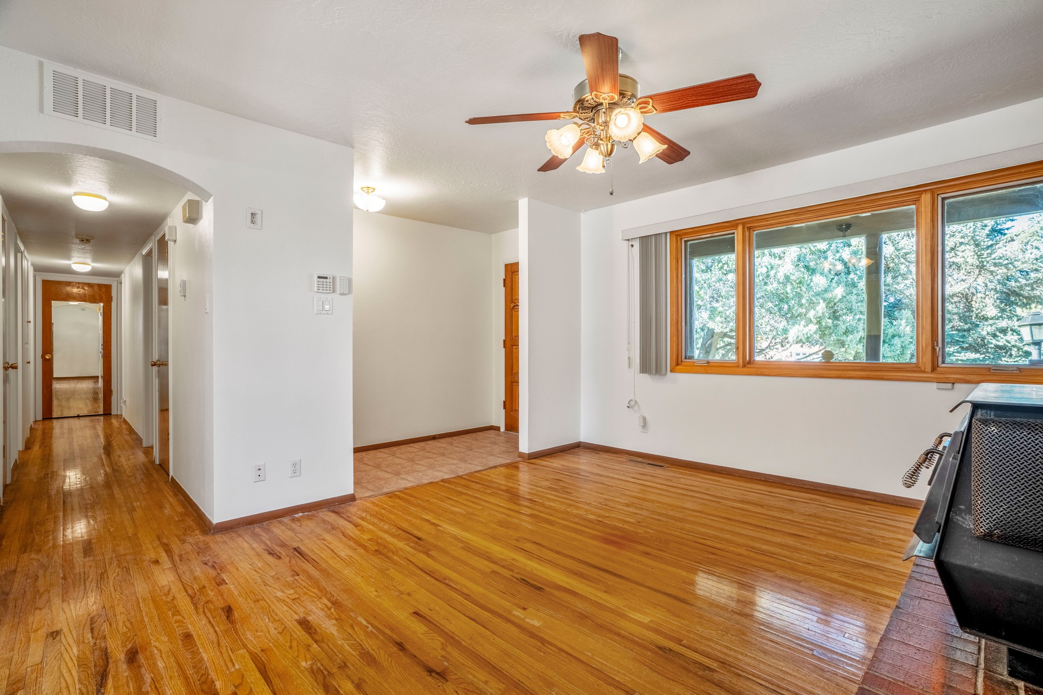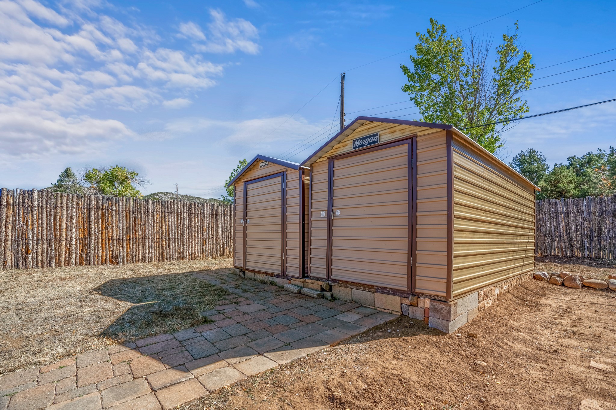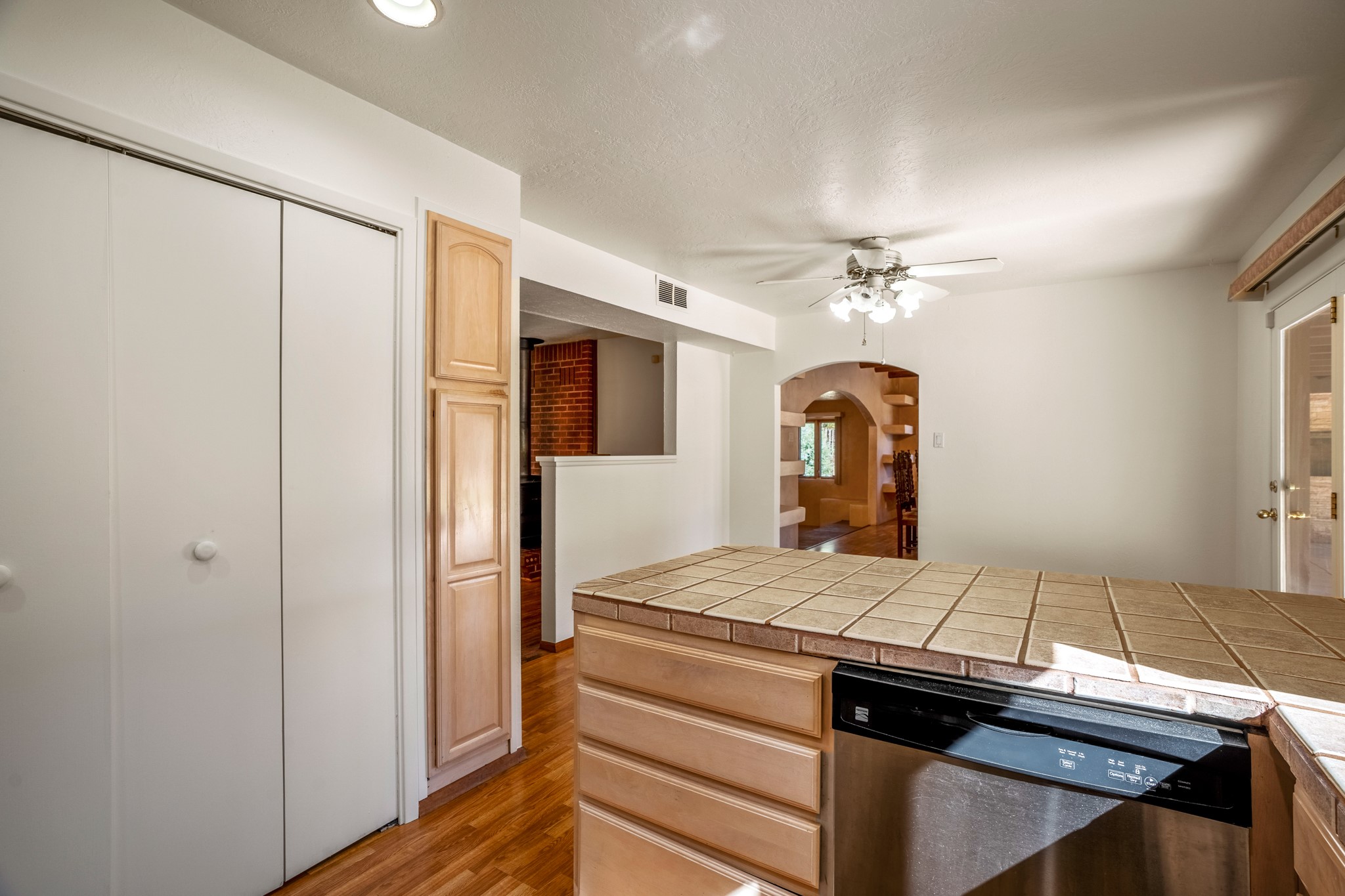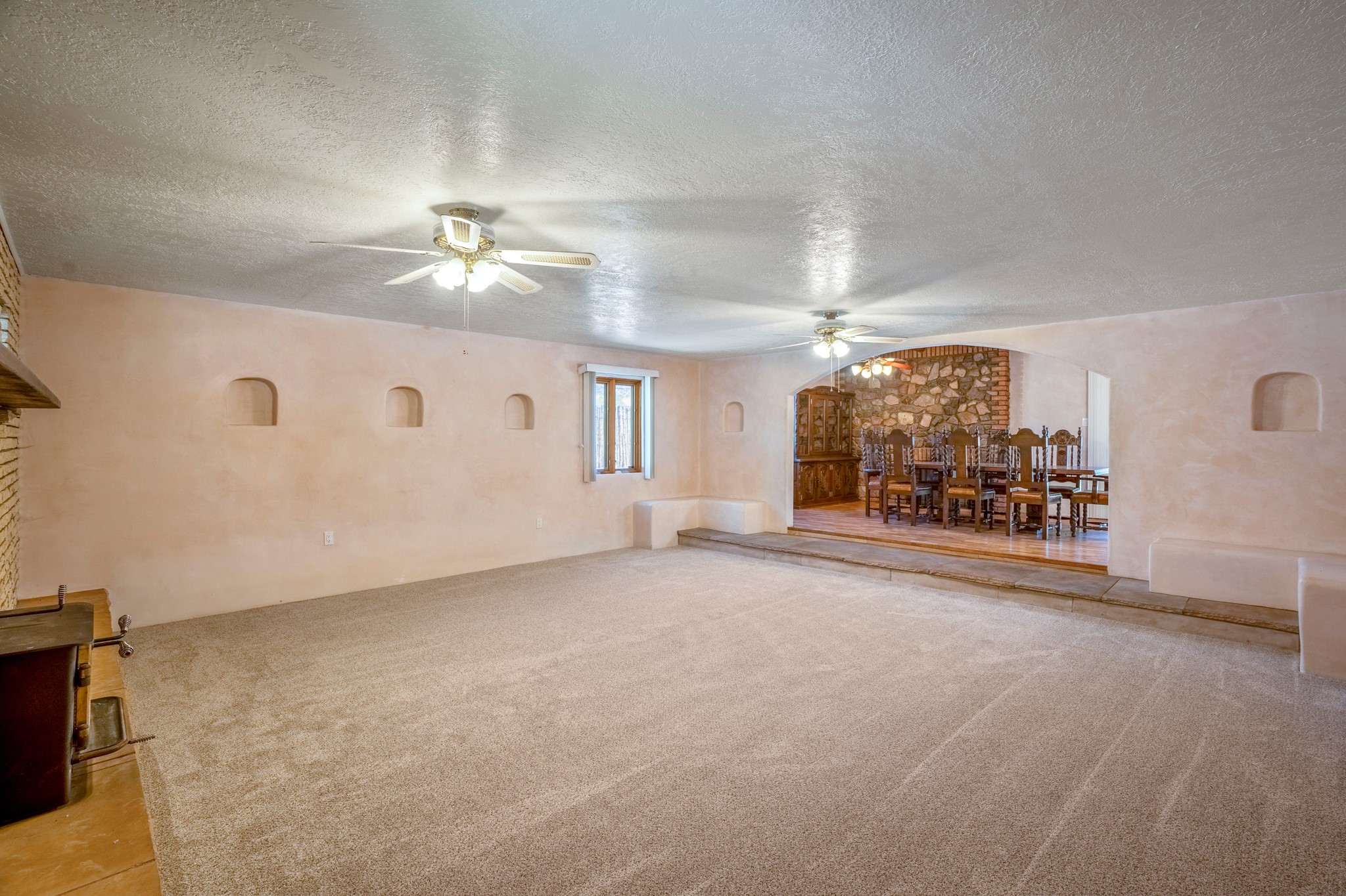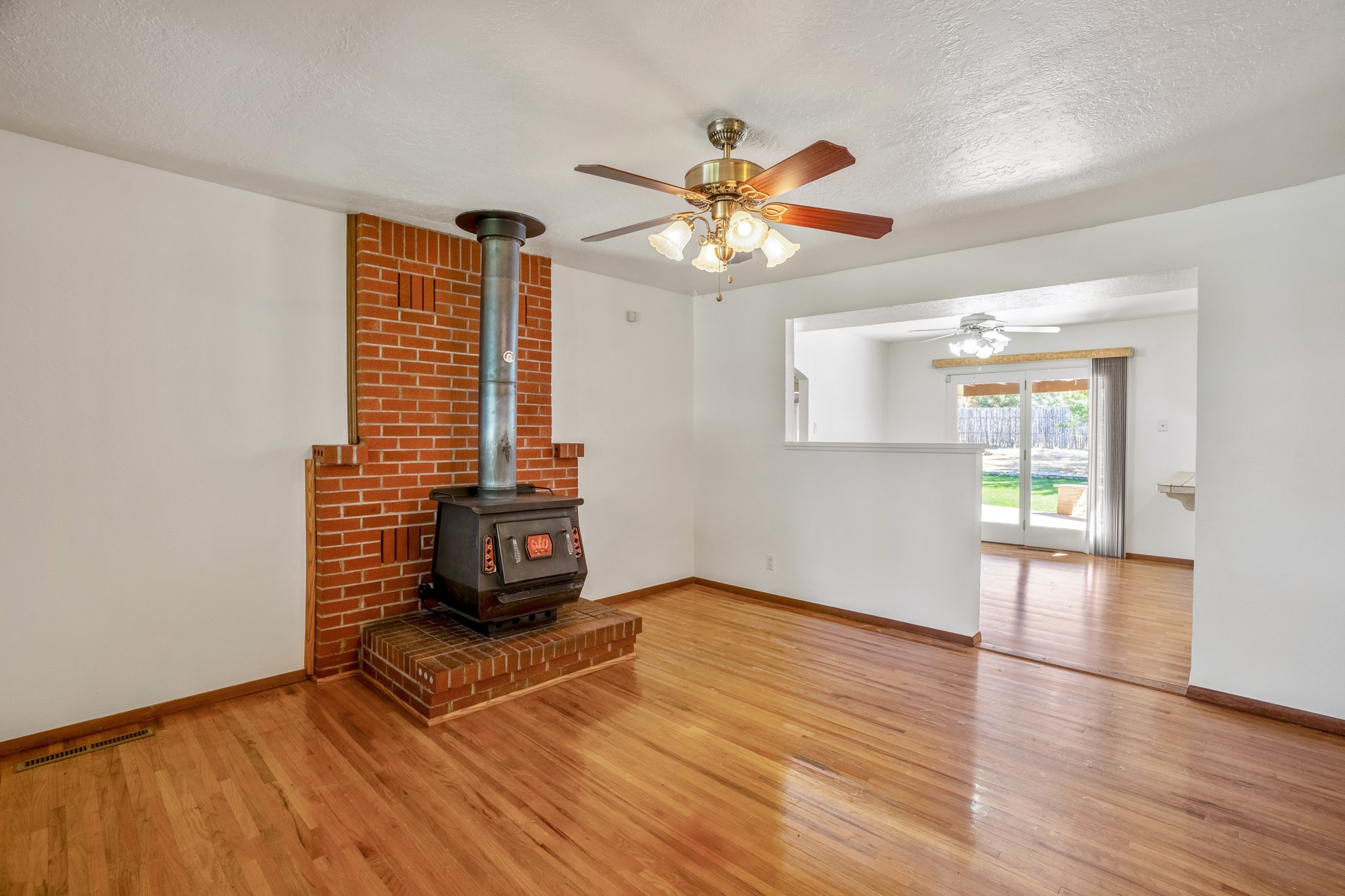 This is a home to get excited about. It is a Mid-century modern on a 1/2 acre lot located in one of the most desirable areas of town. Noted for its easy access to the hospital, I-25, Smiths grocery store and Harry Roadhouse and El Gancho, and only 12 minutes to downtown.Lovingly enjoyed and taken care of by the family over the years.This home features 3 beds, 2 baths, living room and family room with wood stoves and a private dining room with a wood burning fireplace. The bedrooms and living room have beautiful oak wood floors. Outside the kitchen is a covered portal with another fireplace for entertaining your guest all year round. This area leads to the back yard where you can enjoy the sound of water from the recirculating rock fountain. Both kids and adults and animals will delight playing in this huge completely fenced yard with green grass that is watered with the private well. Here you will find 2 large storage sheds to store your gear. Further charm of this property is mature pine trees that create shade and a story book yard that provides an oasis from the busy world. There is also an electronic gate for privacy and safety. There is no need to worry about parking either. Not only is there a carport but there is also ample parking in front and on the sides of the house. Bring your RV's and boats with no worries about restrictive covenants other than those imposed by the city. There is no HOA and no dues. On city, gas, electric and sewer. The roof is approximately 5 years old and is still under warranty with "Fix my Roof". Furnace is 2 years old. Most of the windows have been replaced with double pain windows. This well located mid-century home is waiting for your creative touches to give it a fresh contemporary look.