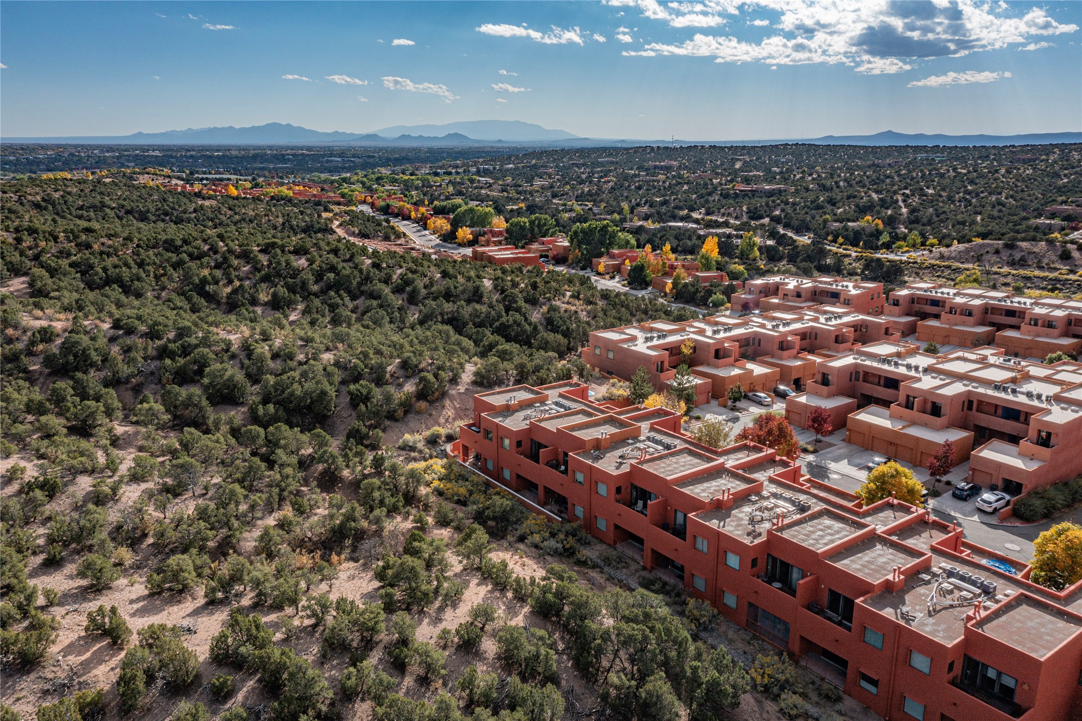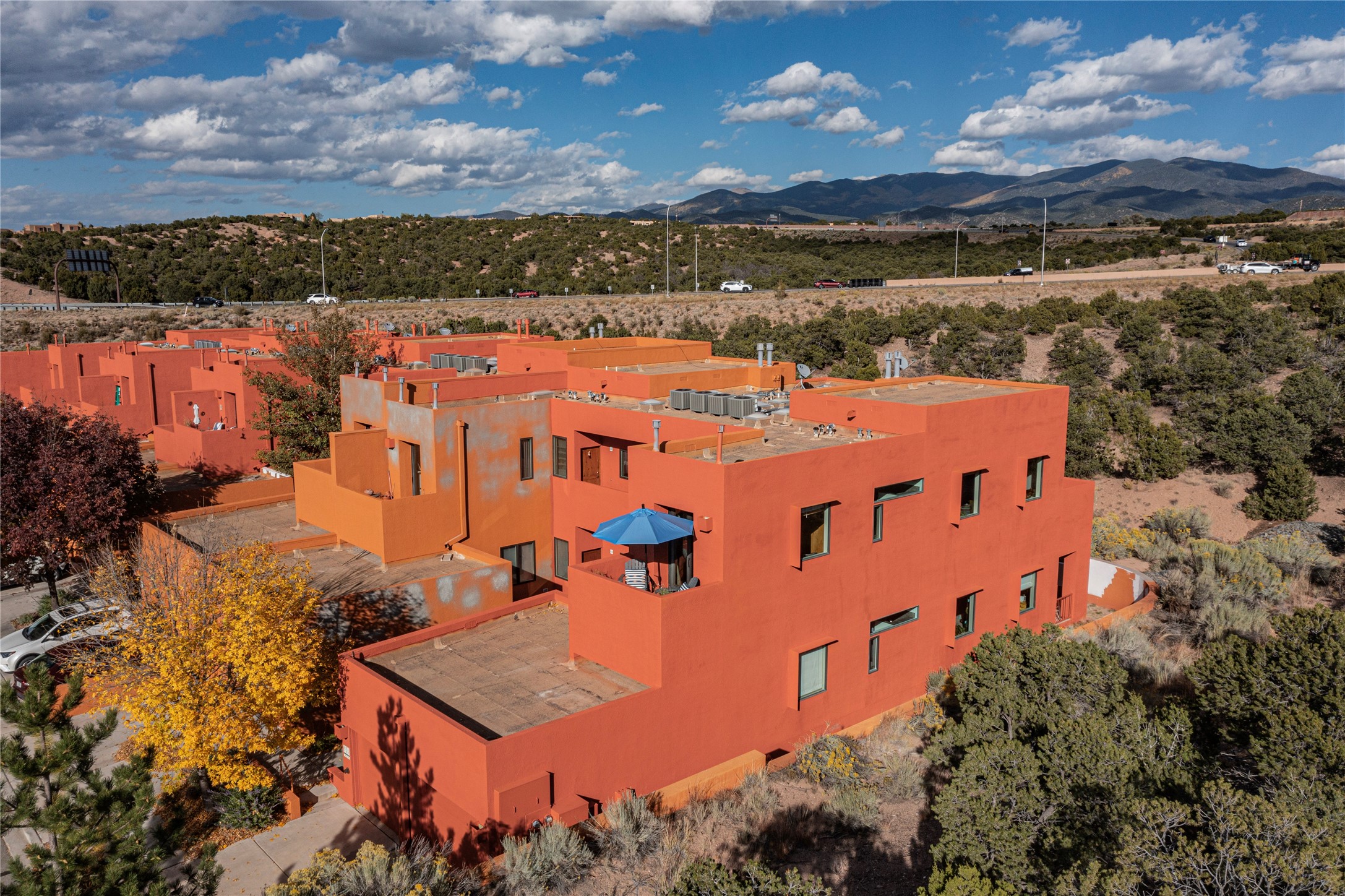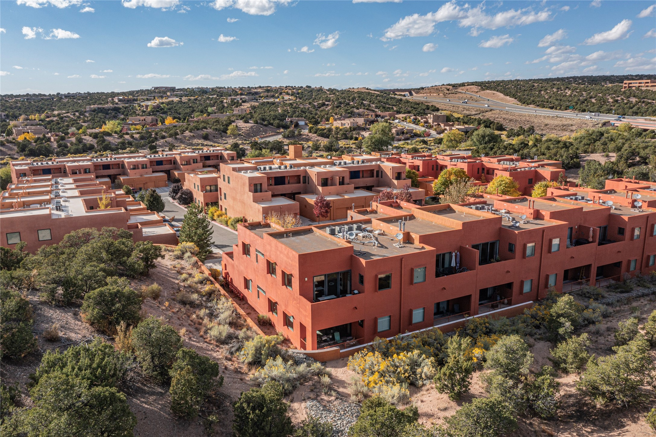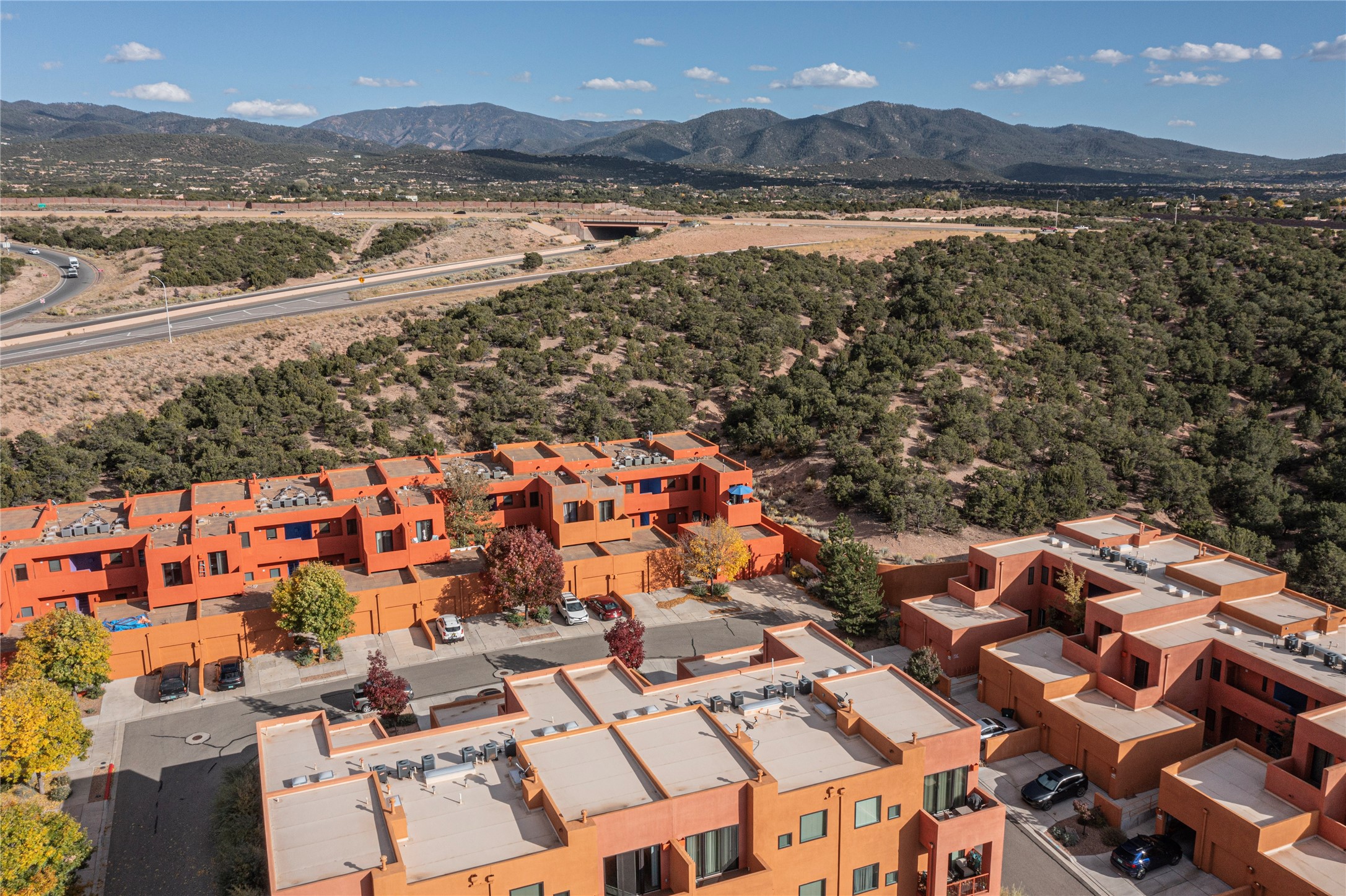 Rare end unit in coveted Zocalo in northside Santa Fe, convenient to 599 bypass, minutes to both the Santa Fe Opera and downtown. This beautifully-maintained 2-bedroom, 1 3/4 bath condo is full of light, private, and has decks at both ends, with mountain and sunset views! Huge south windows overlook peaceful undeveloped hillsides, tall glass sliding doors at both ends bring the beauty of the landscape inside. Modern design by award-winning architect Ricard Legoretta emphasizes clean lines, high ceilings and flowing spaces, giving a spacious feel. Gas fireplace built into wall in great room for cozy relaxing. Split bedroom design with spa-like ensuite in main bedroom including soaking tub and tiled, glass-walled shower, plus walk-in closet for plenty of storage. Second bedroom boasts its own deck with lovely views and seating area. Stackable washer and dryer in closet off front hall; kitchen includes a breakfast bar. New custom window treatments, MinkaAire silent ceiling fans, easy-care polished and tinted concrete floors have been re-sealed in most rooms, new refrigerator and sink/ faucet in kitchen, wood sash and trim refinished throughout--this condo has been tended with love and care by an experienced home renovator! Condo includes detached, oversized one-car garage plus another parking space. Zocalo amenities include security, landscaping and exterior maintenance, beautiful clubhouse with two gyms, pool, soaking tub, courtyard with fountain, and covered patio with a bbq.
