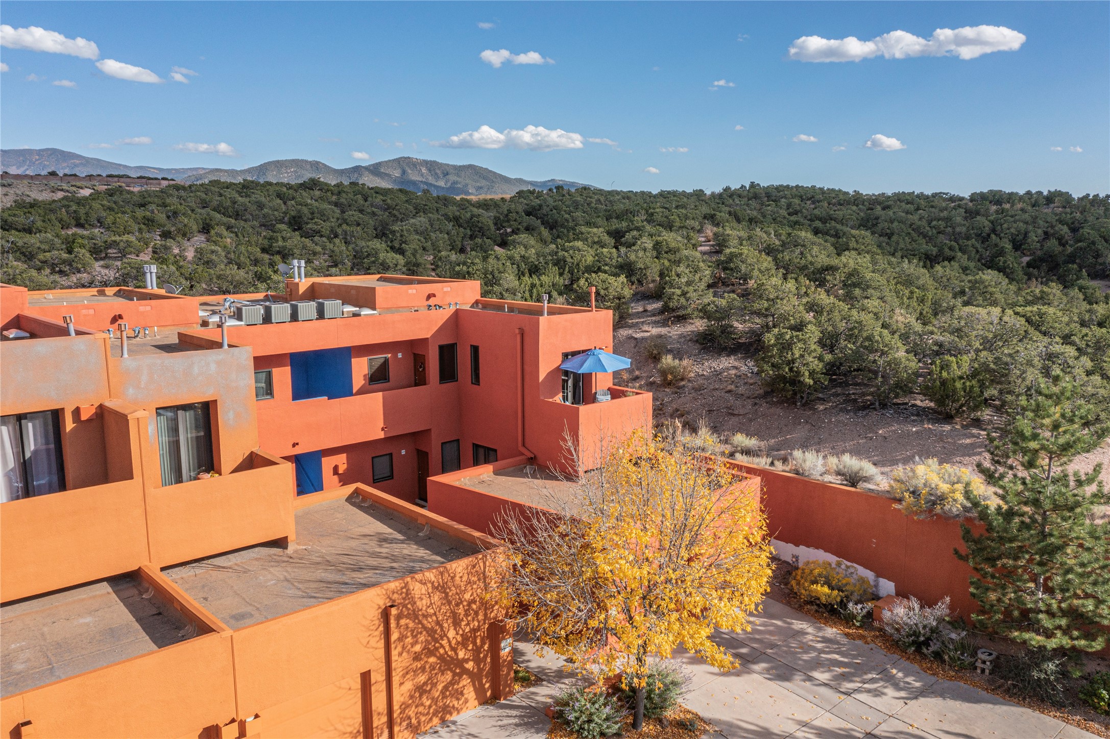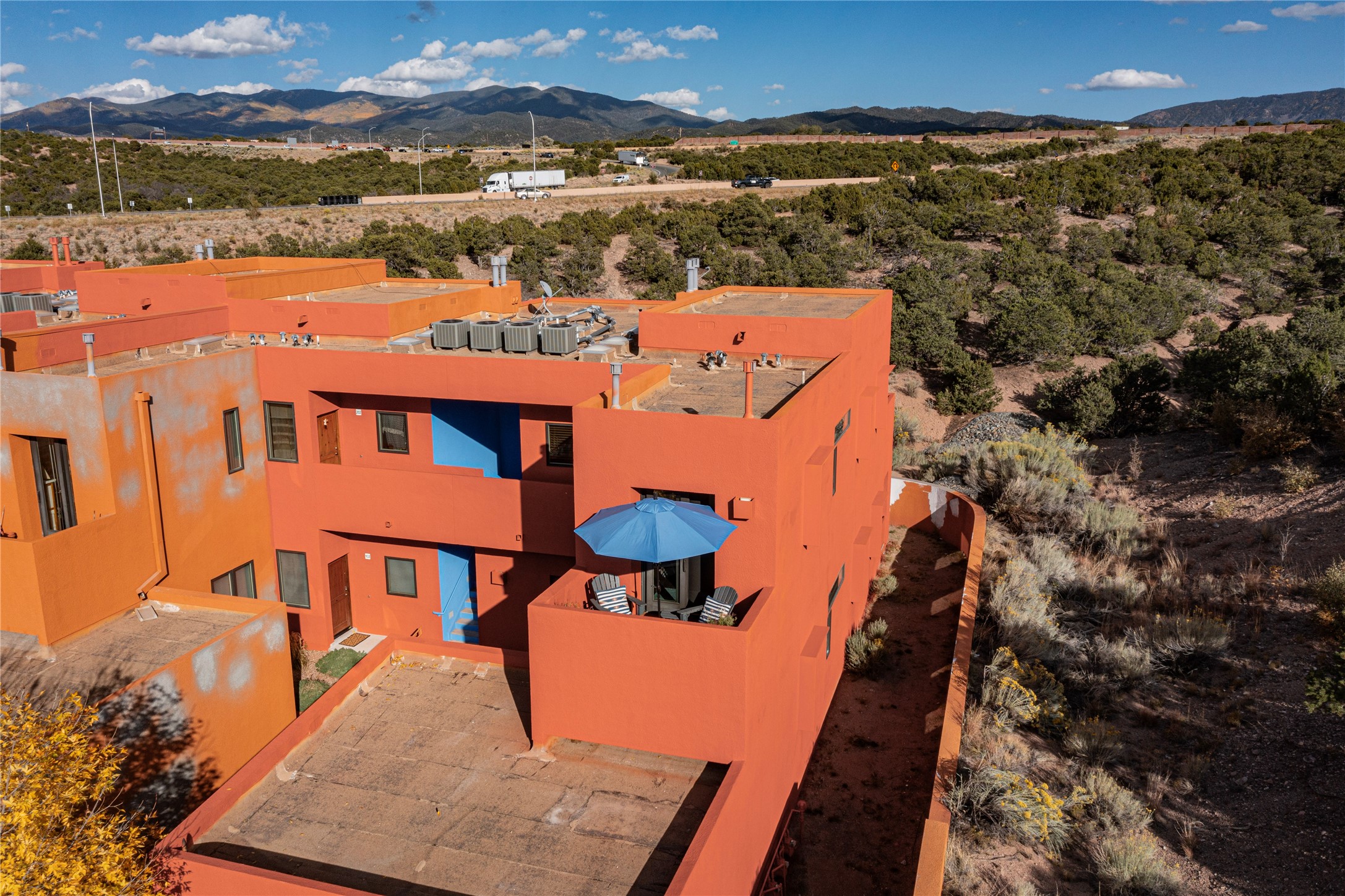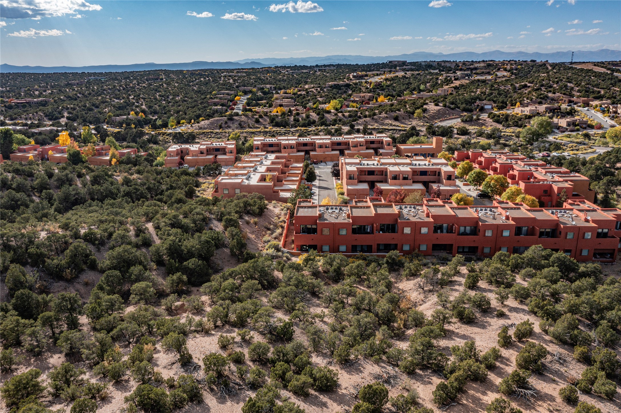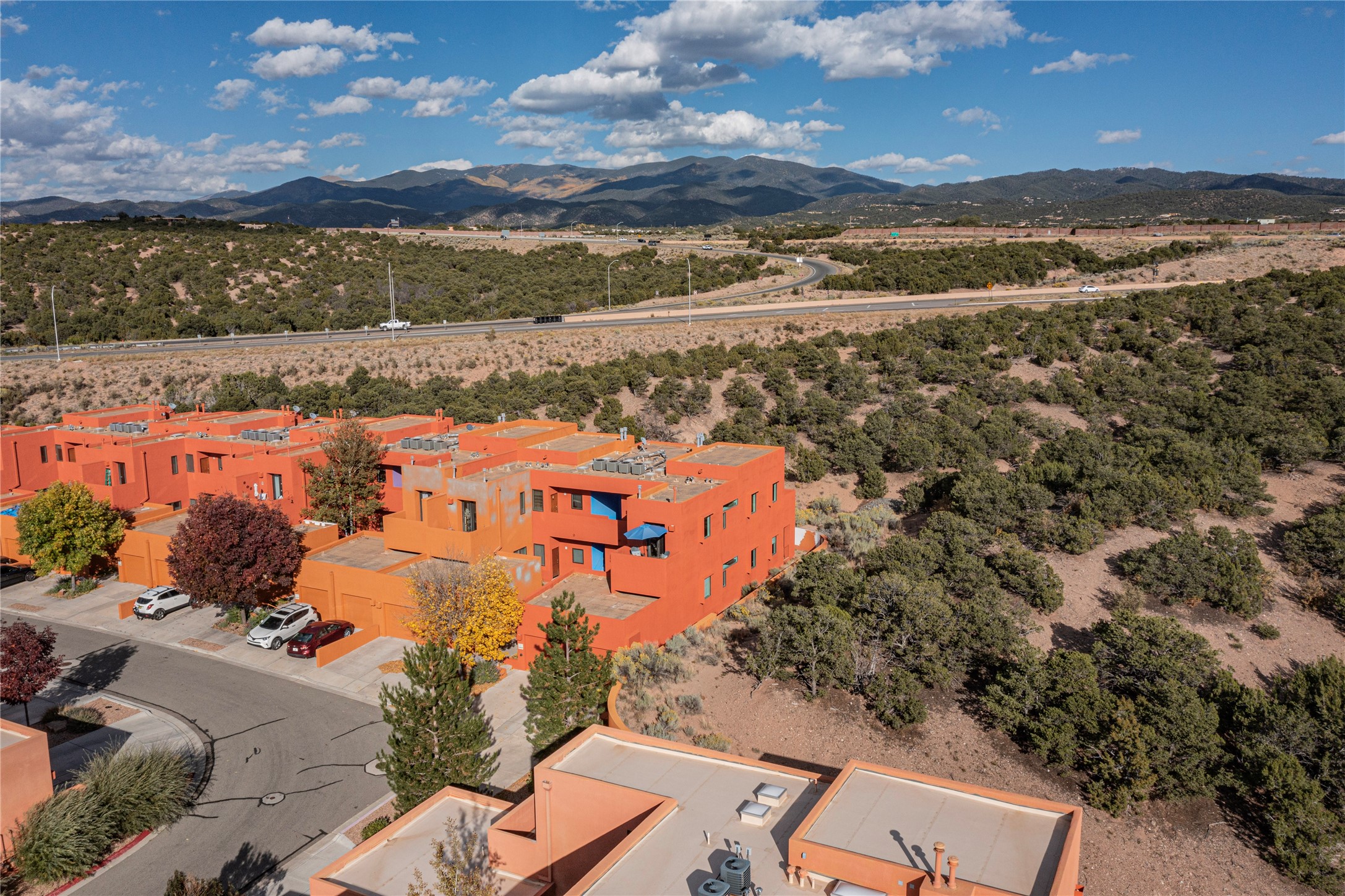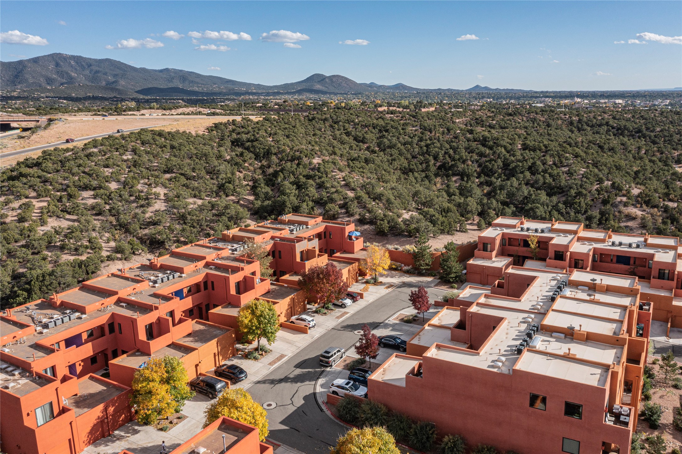 Rare end unit in coveted Zocalo in northside Santa Fe, convenient to 599 bypass, minutes to both the Santa Fe Opera and downtown. This beautifully-maintained 2-bedroom, 1 3/4 bath condo is full of light, private, and has decks at both ends, with mountain and sunset views! Huge south windows overlook peaceful undeveloped hillsides, tall glass sliding doors at both ends bring the beauty of the landscape inside. Modern design by award-winning architect Ricard Legoretta emphasizes clean lines, high ceilings and flowing spaces, giving a spacious feel. Gas fireplace built into wall in great room for cozy relaxing. Split bedroom design with spa-like ensuite in main bedroom including soaking tub and tiled, glass-walled shower, plus walk-in closet for plenty of storage. Second bedroom boasts its own deck with lovely views and seating area. Stackable washer and dryer in closet off front hall; kitchen includes a breakfast bar. New custom window treatments, MinkaAire silent ceiling fans, easy-care polished and tinted concrete floors have been re-sealed in most rooms, new refrigerator and sink/ faucet in kitchen, wood sash and trim refinished throughout--this condo has been tended with love and care by an experienced home renovator! Condo includes detached, oversized one-car garage plus another parking space. Zocalo amenities include security, landscaping and exterior maintenance, beautiful clubhouse with two gyms, pool, soaking tub, courtyard with fountain, and covered patio with a bbq.
