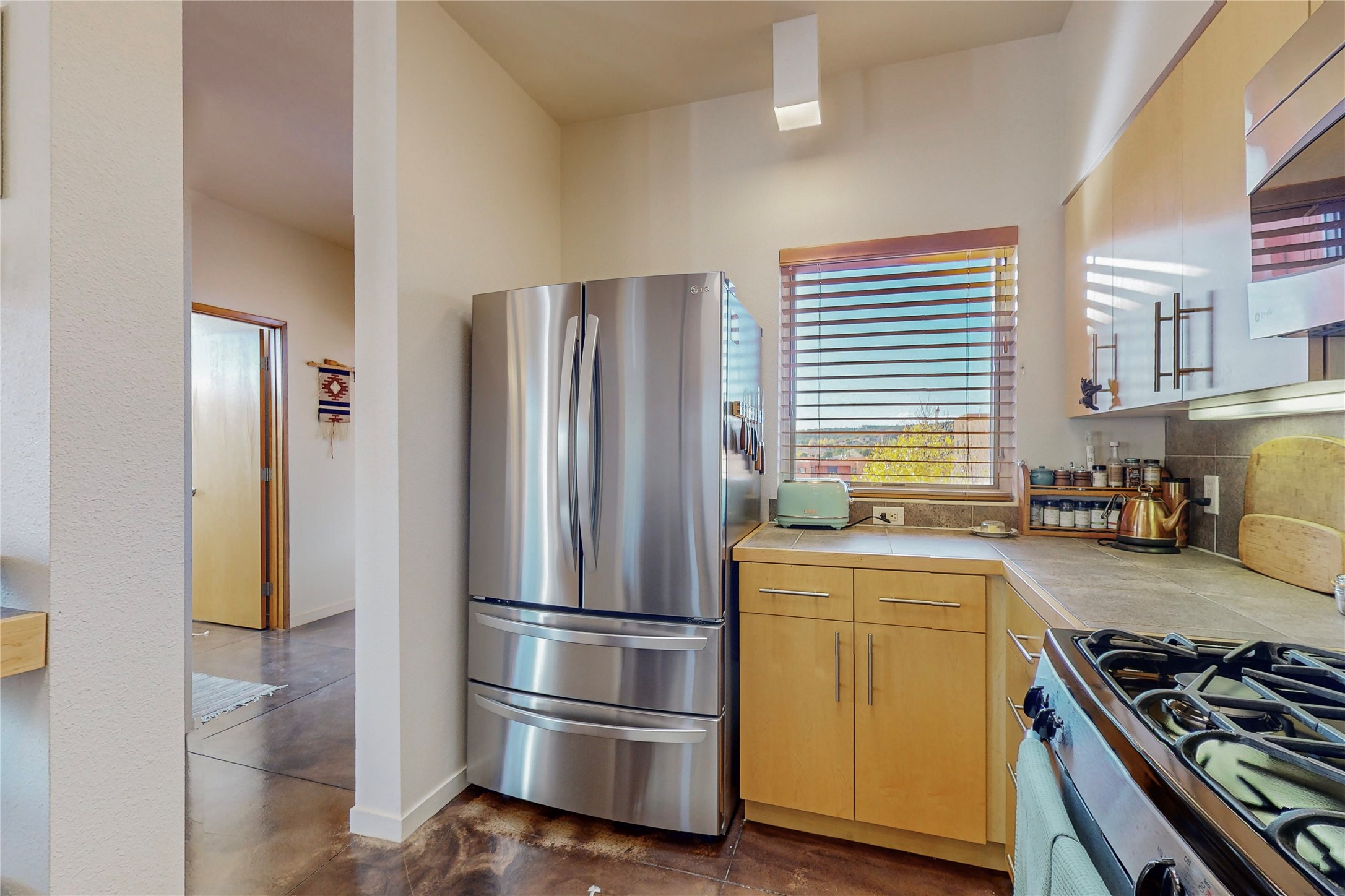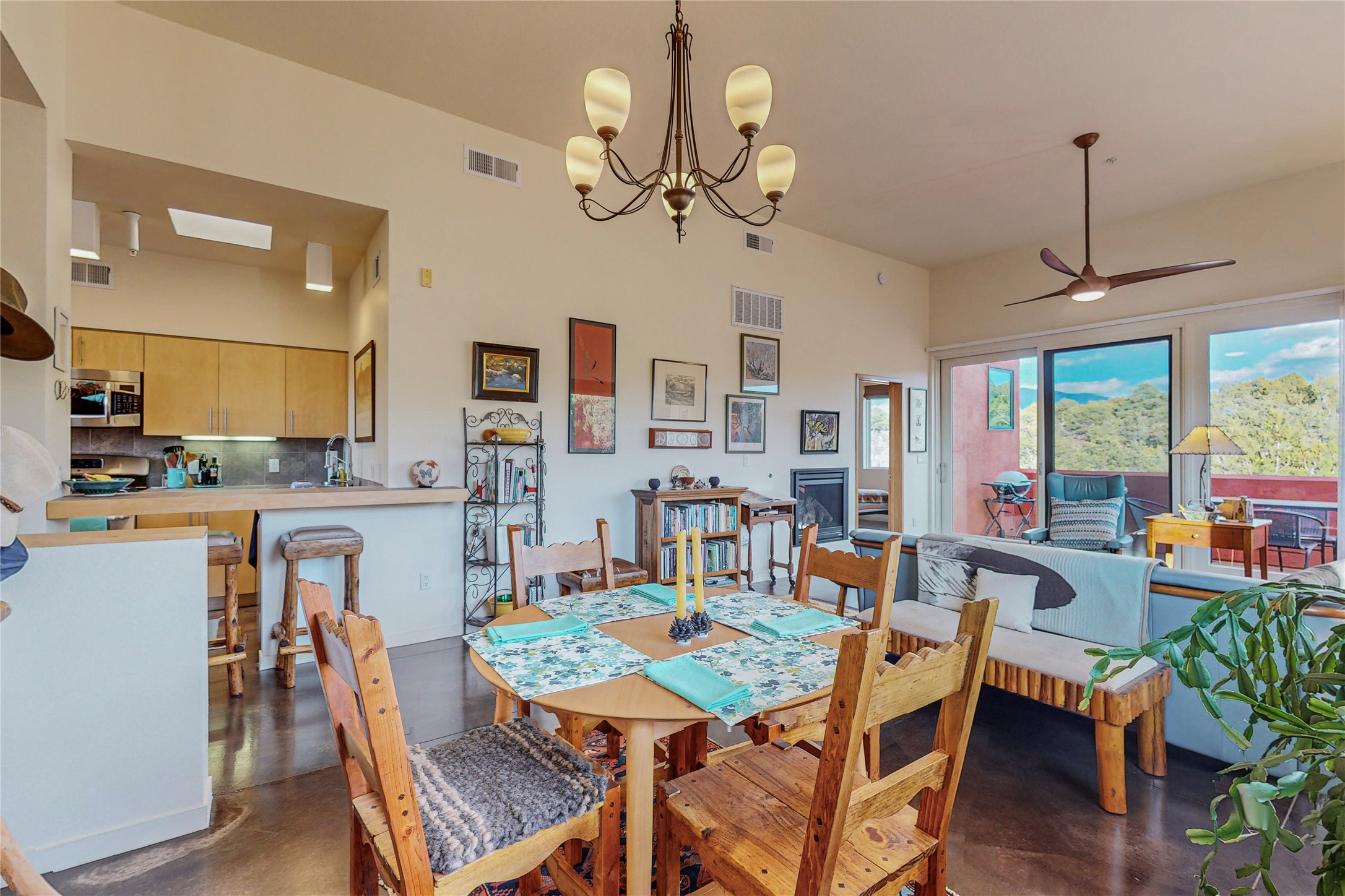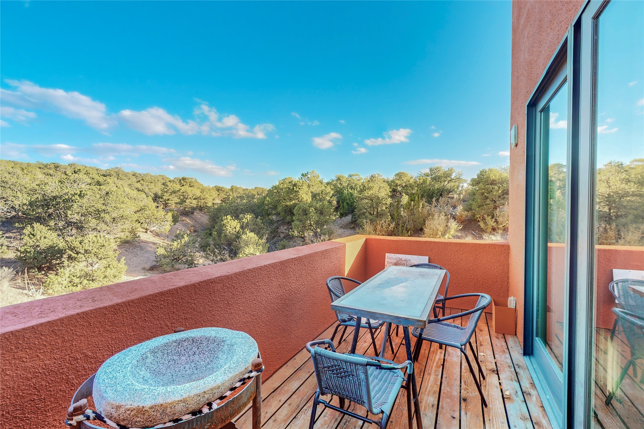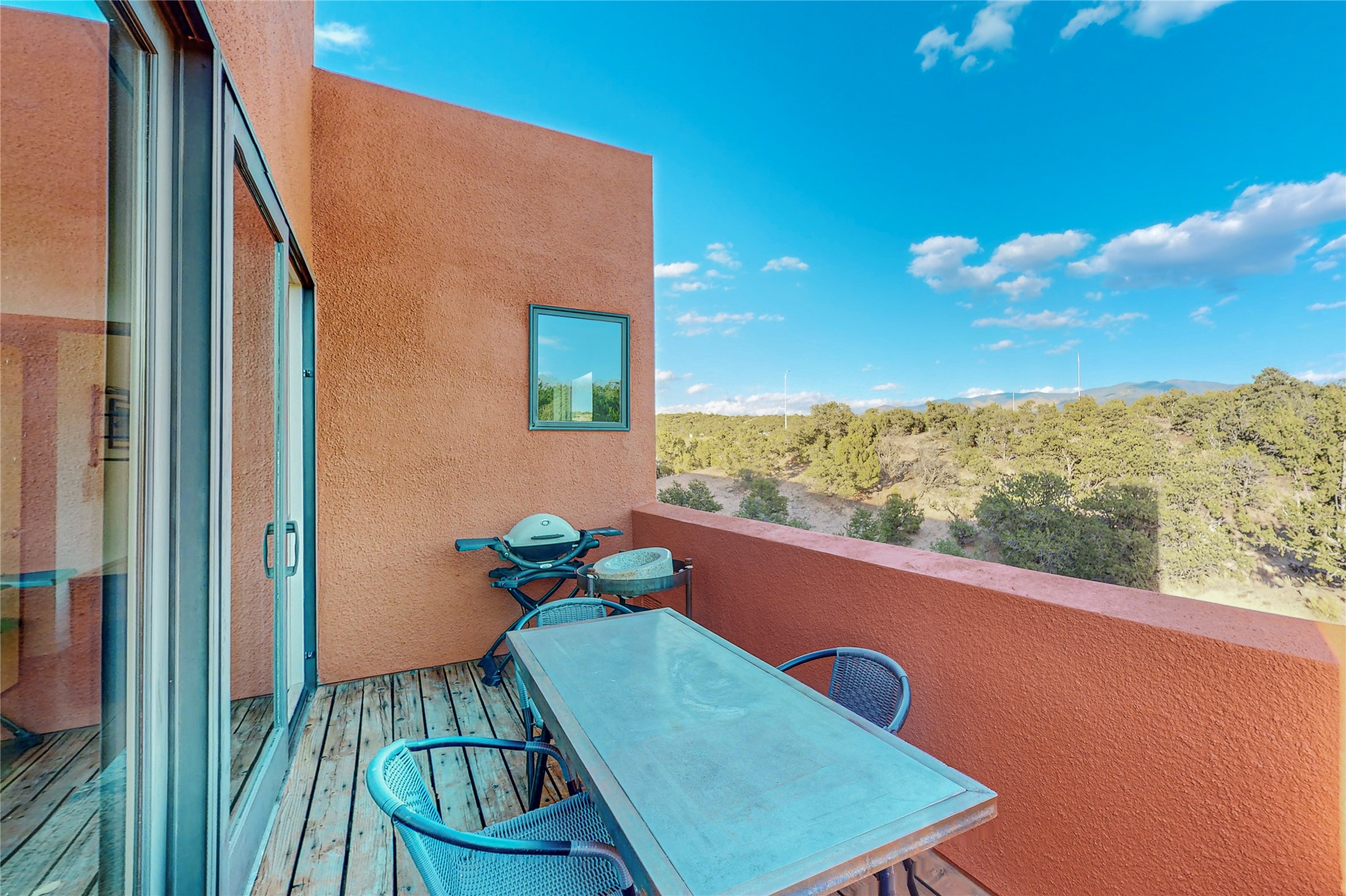 Rare end unit in coveted Zocalo in northside Santa Fe, convenient to 599 bypass, minutes to both the Santa Fe Opera and downtown. This beautifully-maintained 2-bedroom, 1 3/4 bath condo is full of light, private, and has decks at both ends, with mountain and sunset views! Huge south windows overlook peaceful undeveloped hillsides, tall glass sliding doors at both ends bring the beauty of the landscape inside. Modern design by award-winning architect Ricard Legoretta emphasizes clean lines, high ceilings and flowing spaces, giving a spacious feel. Gas fireplace built into wall in great room for cozy relaxing. Split bedroom design with spa-like ensuite in main bedroom including soaking tub and tiled, glass-walled shower, plus walk-in closet for plenty of storage. Second bedroom boasts its own deck with lovely views and seating area. Stackable washer and dryer in closet off front hall; kitchen includes a breakfast bar. New custom window treatments, MinkaAire silent ceiling fans, easy-care polished and tinted concrete floors have been re-sealed in most rooms, new refrigerator and sink/ faucet in kitchen, wood sash and trim refinished throughout--this condo has been tended with love and care by an experienced home renovator! Condo includes detached, oversized one-car garage plus another parking space. Zocalo amenities include security, landscaping and exterior maintenance, beautiful clubhouse with two gyms, pool, soaking tub, courtyard with fountain, and covered patio with a bbq.