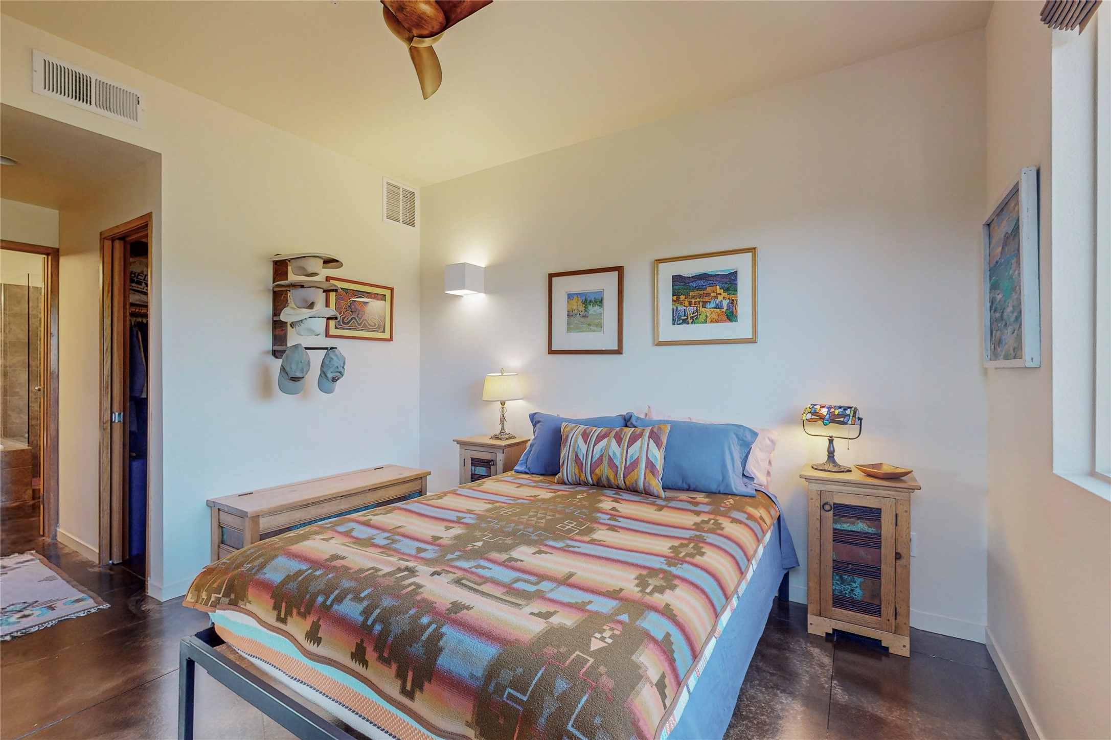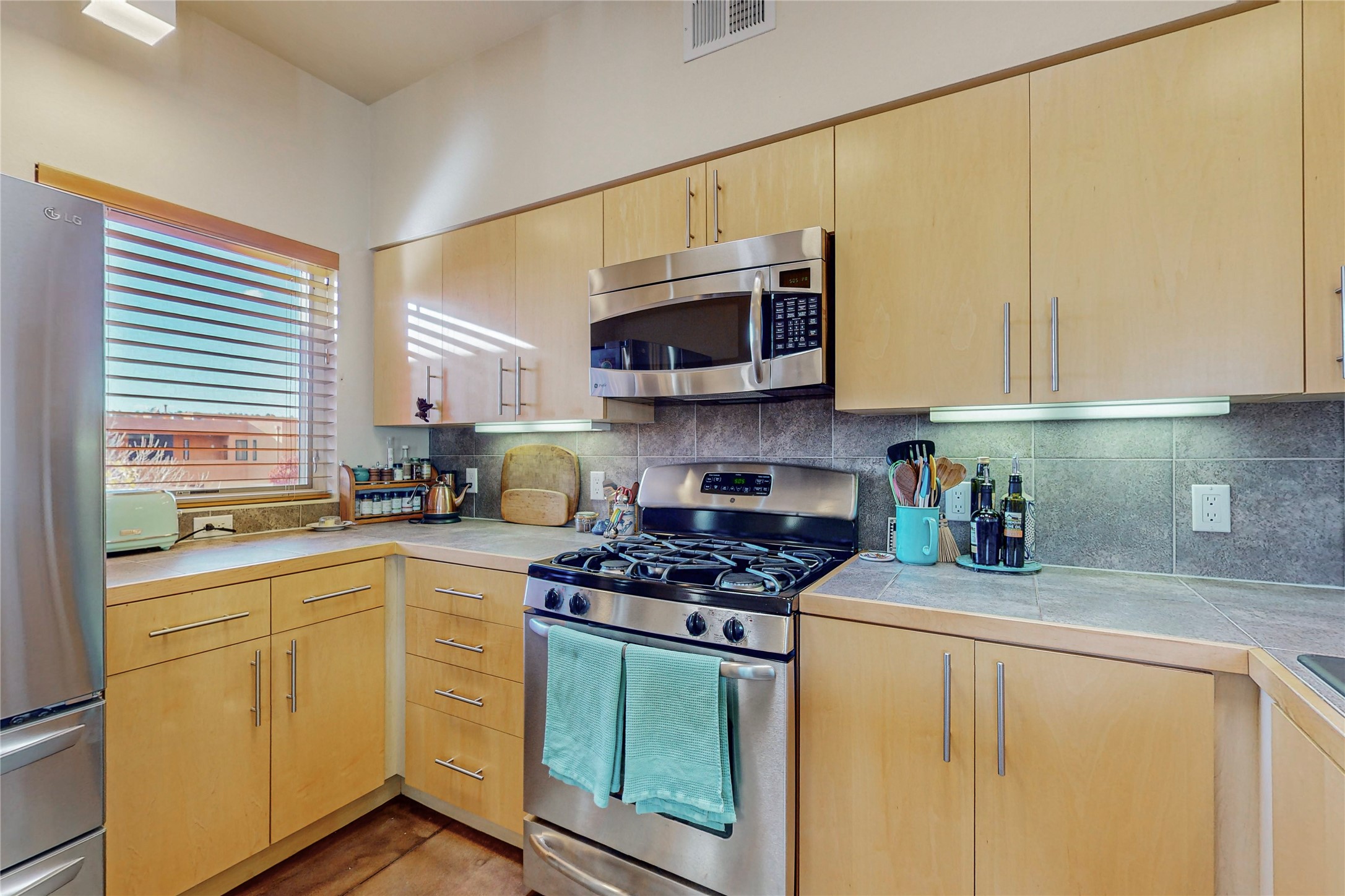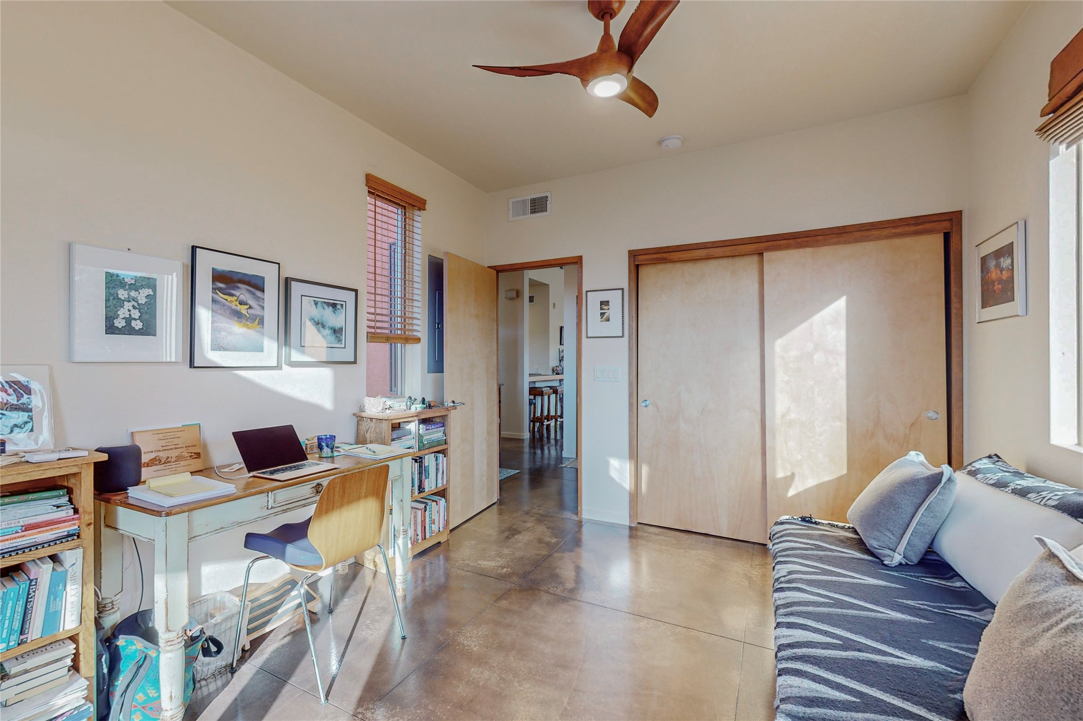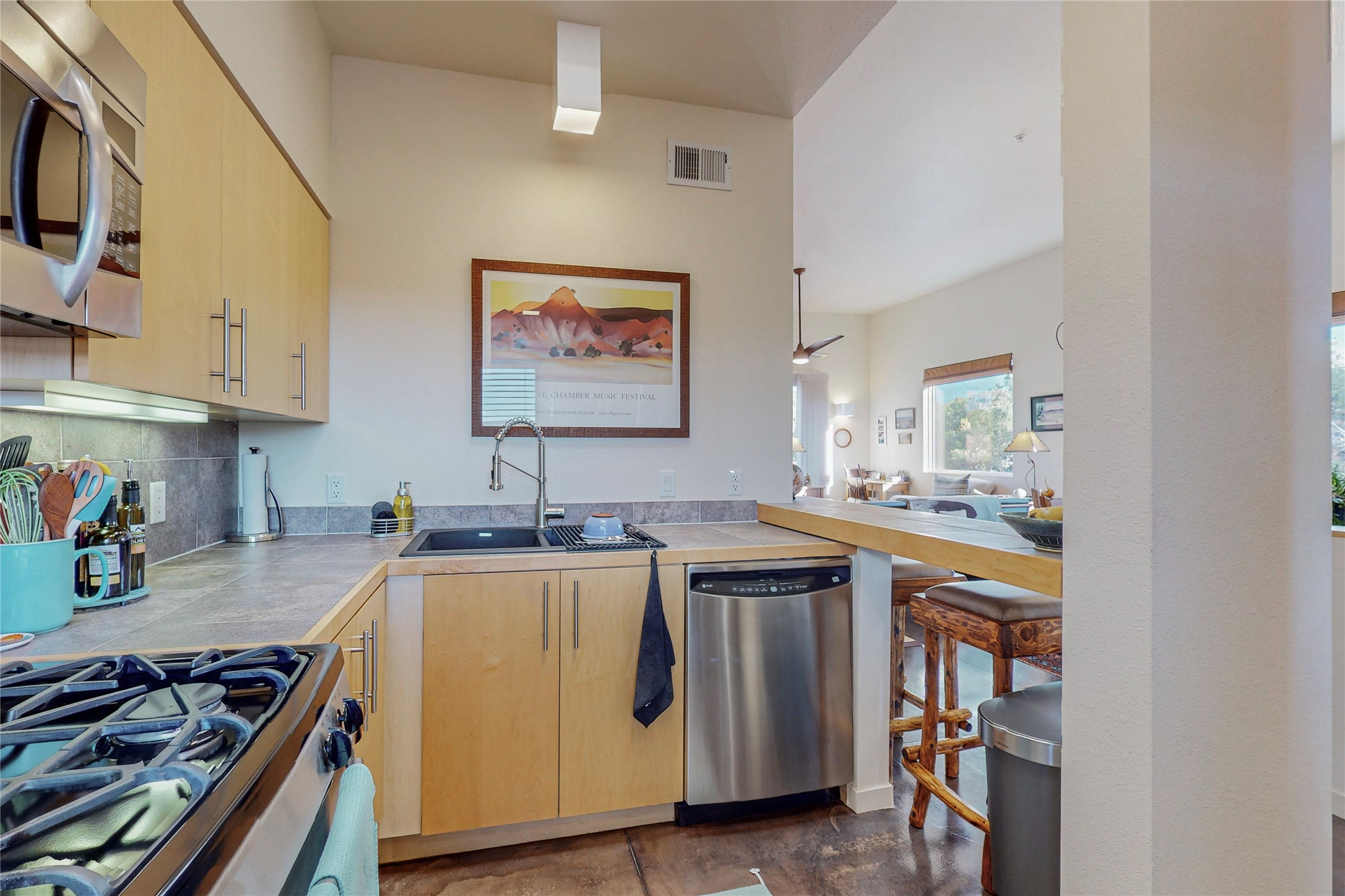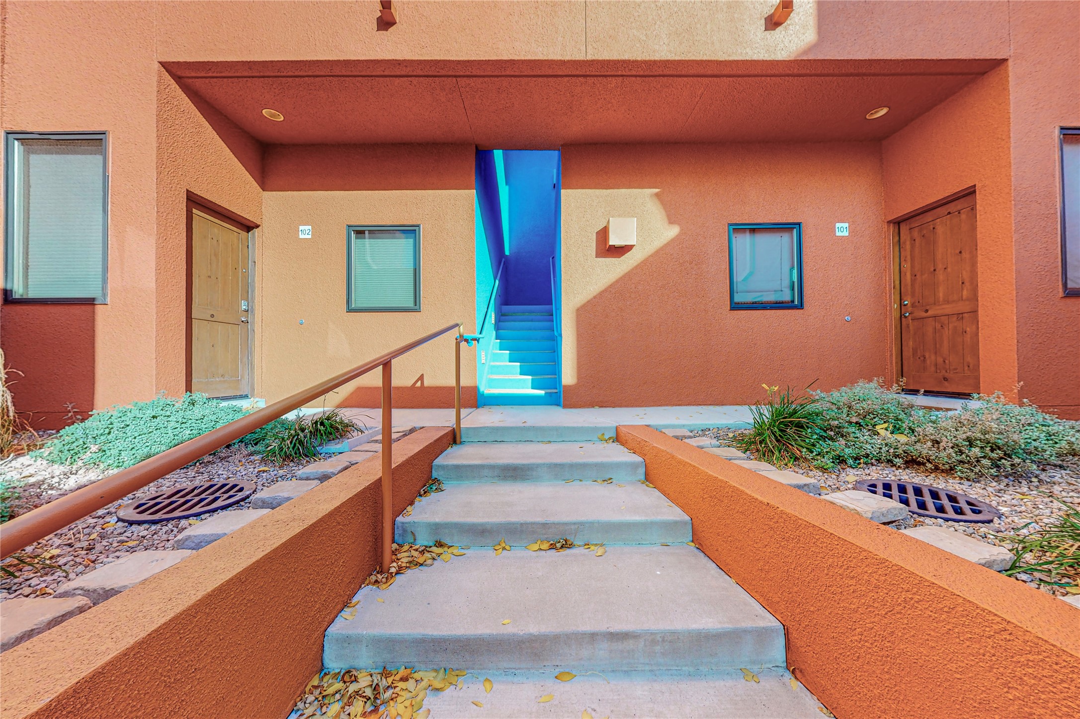 Rare end unit in coveted Zocalo in northside Santa Fe, convenient to 599 bypass, minutes to both the Santa Fe Opera and downtown. This beautifully-maintained 2-bedroom, 1 3/4 bath condo is full of light, private, and has decks at both ends, with mountain and sunset views! Huge south windows overlook peaceful undeveloped hillsides, tall glass sliding doors at both ends bring the beauty of the landscape inside. Modern design by award-winning architect Ricard Legoretta emphasizes clean lines, high ceilings and flowing spaces, giving a spacious feel. Gas fireplace built into wall in great room for cozy relaxing. Split bedroom design with spa-like ensuite in main bedroom including soaking tub and tiled, glass-walled shower, plus walk-in closet for plenty of storage. Second bedroom boasts its own deck with lovely views and seating area. Stackable washer and dryer in closet off front hall; kitchen includes a breakfast bar. New custom window treatments, MinkaAire silent ceiling fans, easy-care polished and tinted concrete floors have been re-sealed in most rooms, new refrigerator and sink/ faucet in kitchen, wood sash and trim refinished throughout--this condo has been tended with love and care by an experienced home renovator! Condo includes detached, oversized one-car garage plus another parking space. Zocalo amenities include security, landscaping and exterior maintenance, beautiful clubhouse with two gyms, pool, soaking tub, courtyard with fountain, and covered patio with a bbq.
