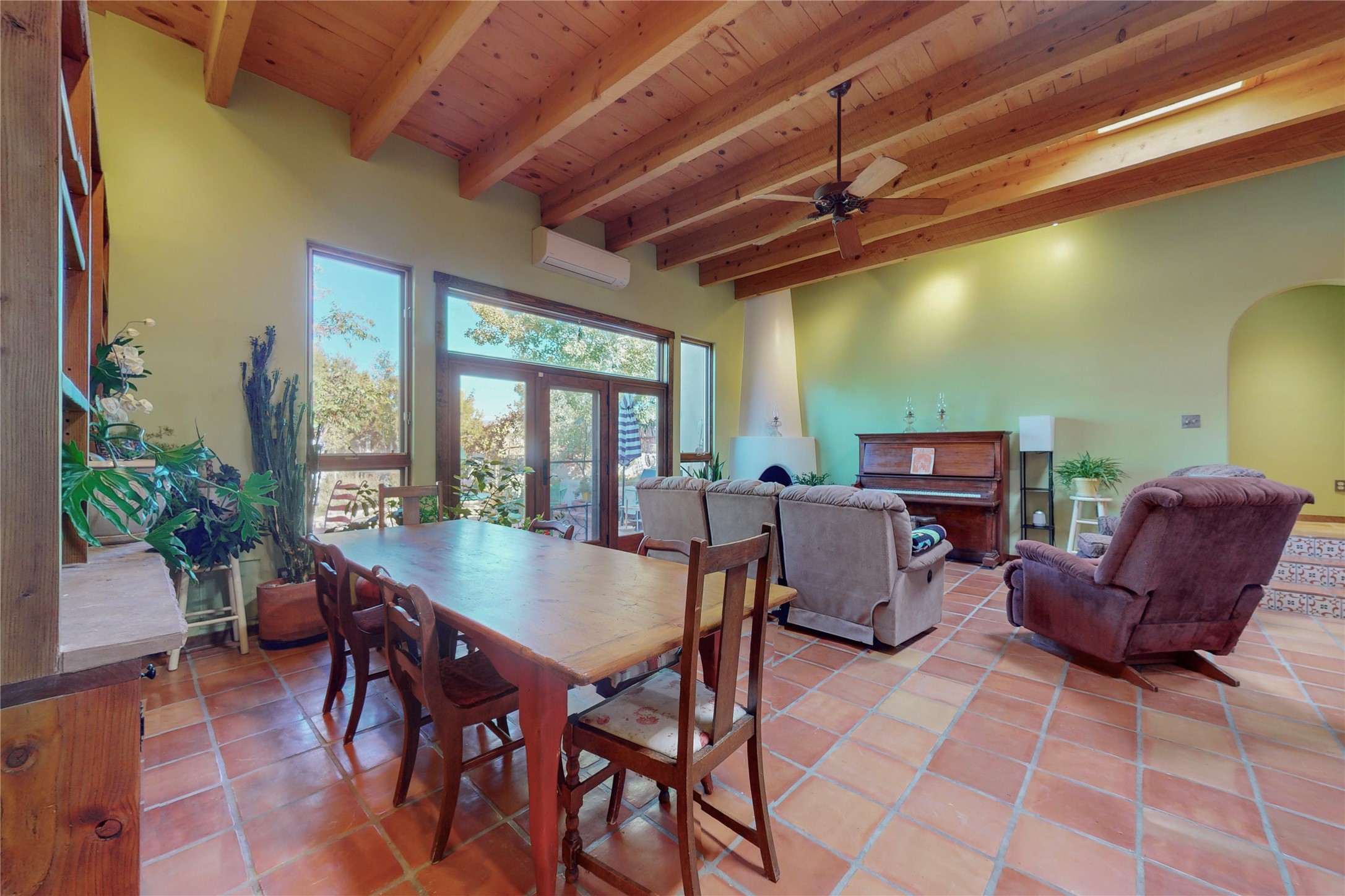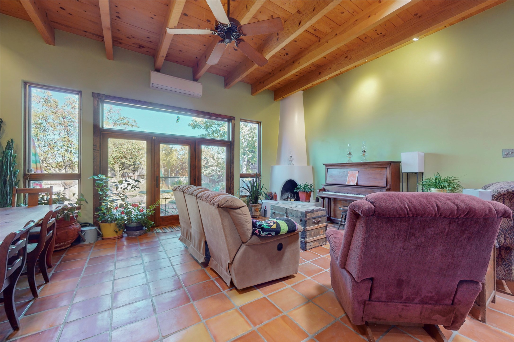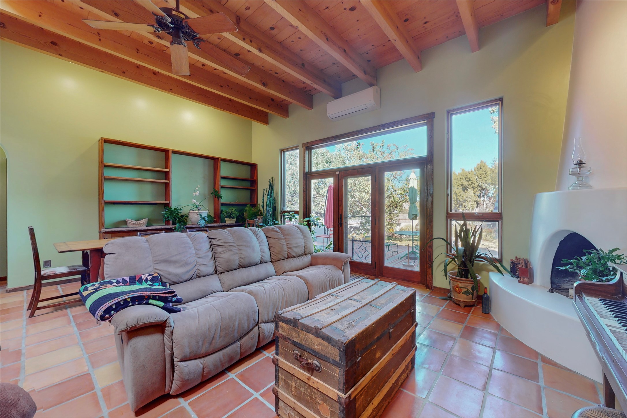 A wonderful home to come home to, custom built by Tom Yoder and lovingly looked after both inside and the surrounding gardens. A privately walled landscaped courtyard entry beckons you in to an impressive foyer, mind the step - you may not look down awed by the Santa Fe style architectural features that delight the eye. A large country kitchen equipped with a professional Thermador cooktop, double ovens and a farmhouse sink and wow what a lovely bay window kitchen view. Gleaming Saltillo tile floors and high ceilings throughout add to a spaciousness yet cosy feel. In 2014 a new roof which was upgraded with a 2 year warranty in 2023. In 2015 the boiler was replaced, in 2017 a new hot water heater, and in 2022 mini splits were added. The natural gas radiant heating system has been inspected, found to be Entran 3 and currently working fine. This year the stucco, canales, and windows all repaired. Washer and dryer replaced in 2016 and kitchen appliances were upgraded in 2021. Even the drip irrigation system was upgraded in 2013, 2 car garage plus a side approved parking area for an RV. Sitting on almost 1.5 acres bordered by a large greenbelt yet close to paved road with easy access to Eldorado amenities and local shopping this home is hard to beat.
