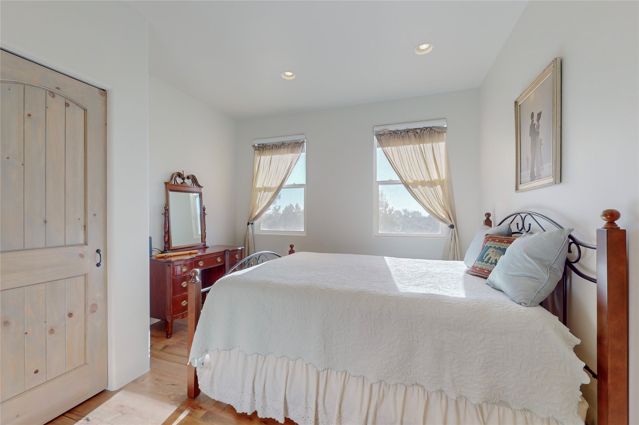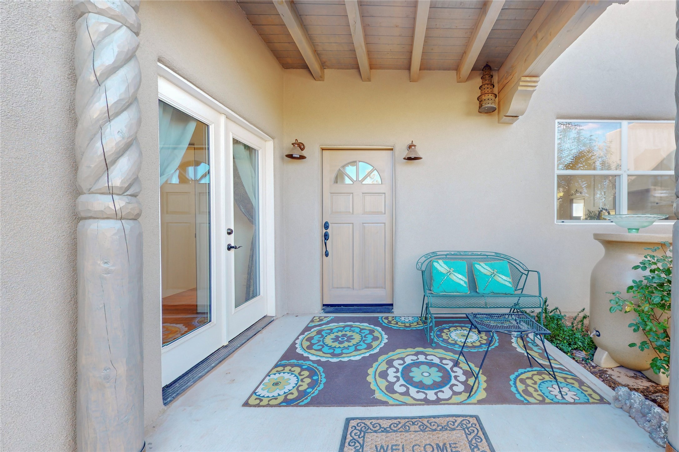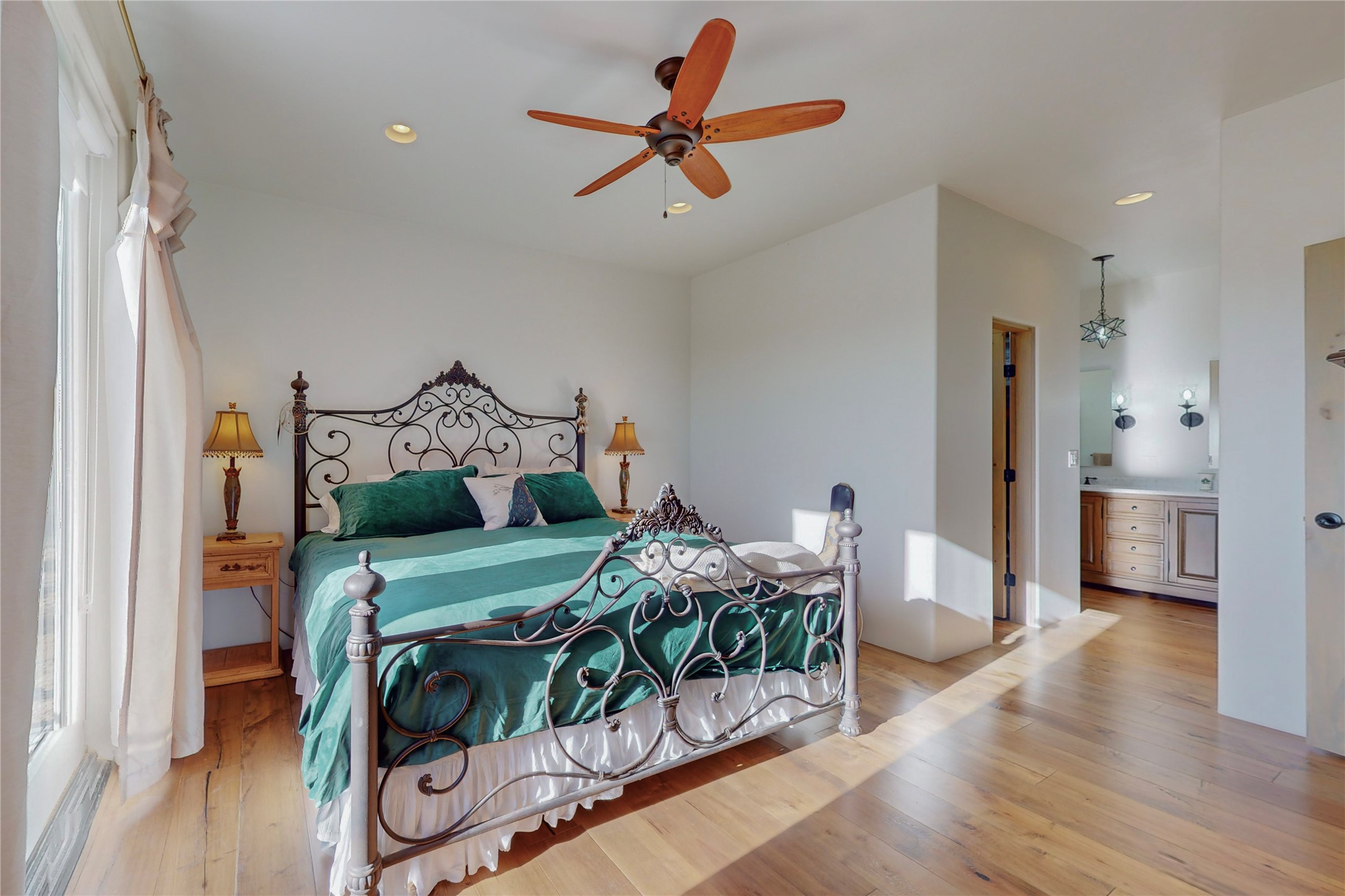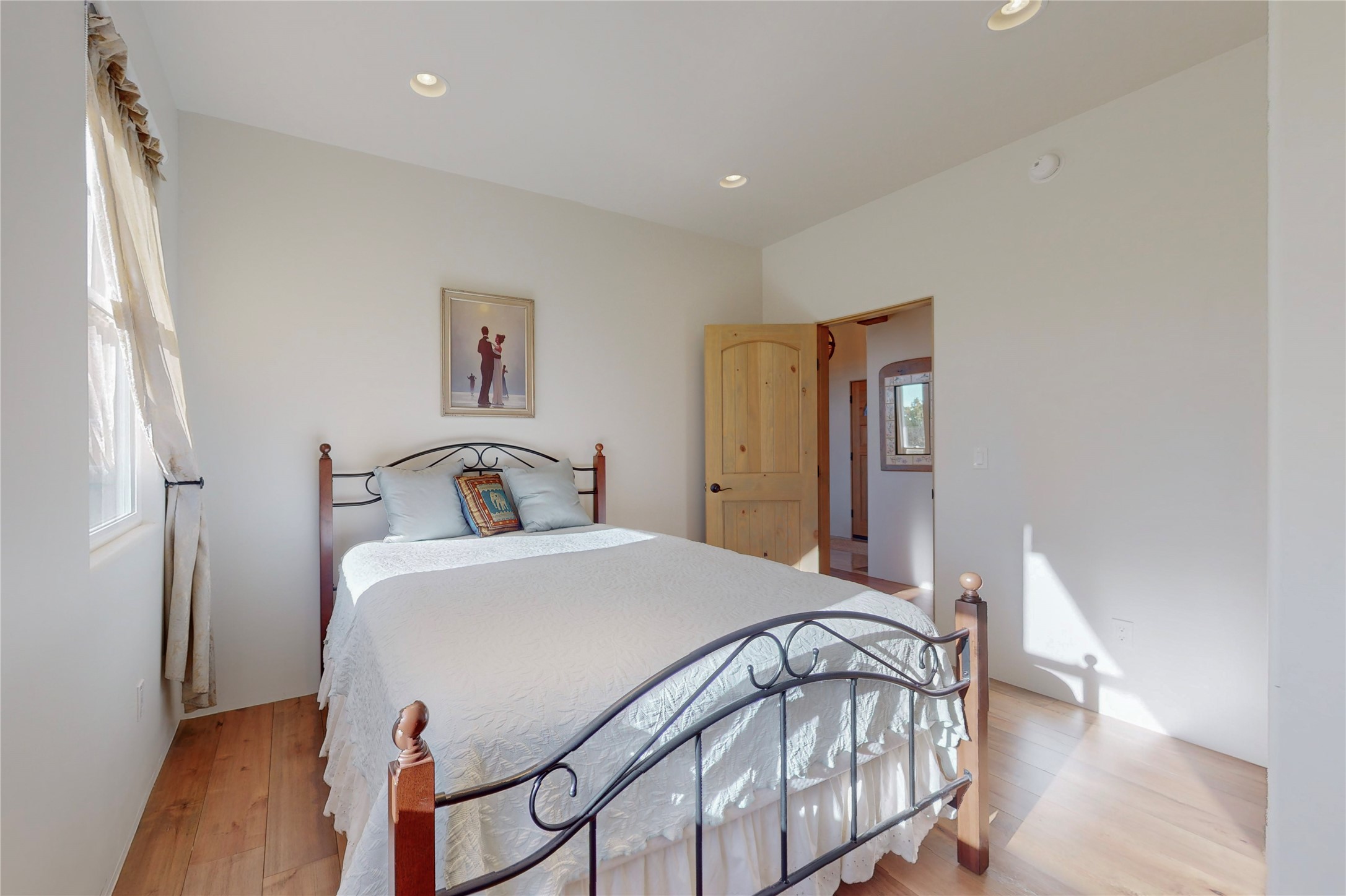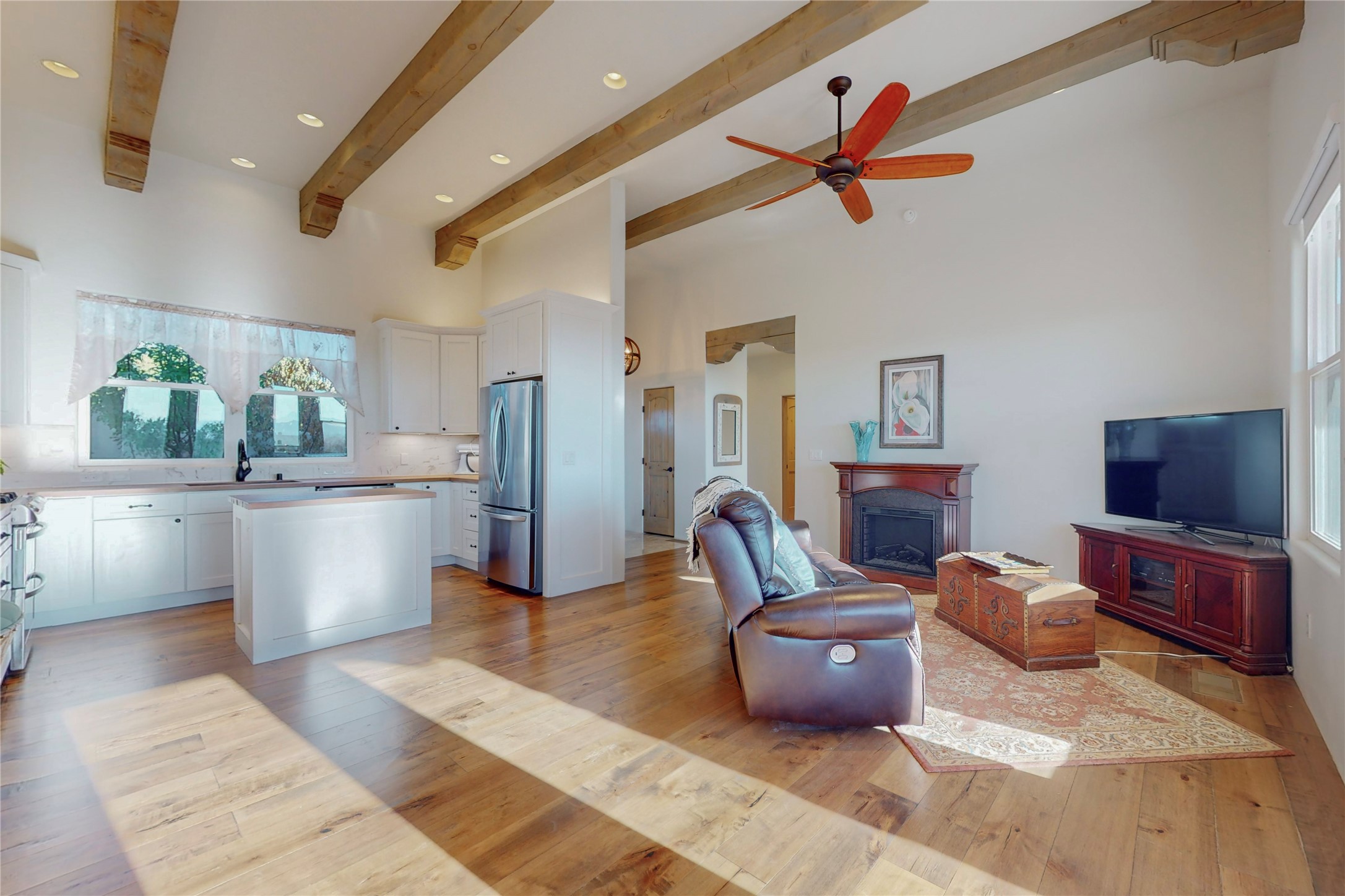 Sparkling bright "as new" 3 year old contemporary home on high corner view lot, a custom creation by Wild Sage Homes for the owners. With high ceilings and gleaming engineered wood floors throughout, this home is a perfect example of Pride of Ownership. An open plan, split bedroom design centered on a spacious great room this home was built for energy efficiency with a HERS rating of 70. Lovely long E-glass windows maximize the views and light, natural gas forced air provides efficient heating and cooling, high insulation factors make low utility bills year round. the attached finished 2 car garage includes a dedicated electrical for a freezer. An on demand gas hot water heater with a recirculating pump for instant hot water plus energy efficient upscale appliances. An 800 sqft heated RV garage with two bays and a workshop area plus a greenhouse creates space for all your hobbies and toys. This home accesses Eldorado amenities, local community activities, shopping and services plus only minutes into Santa Fe. A must see!