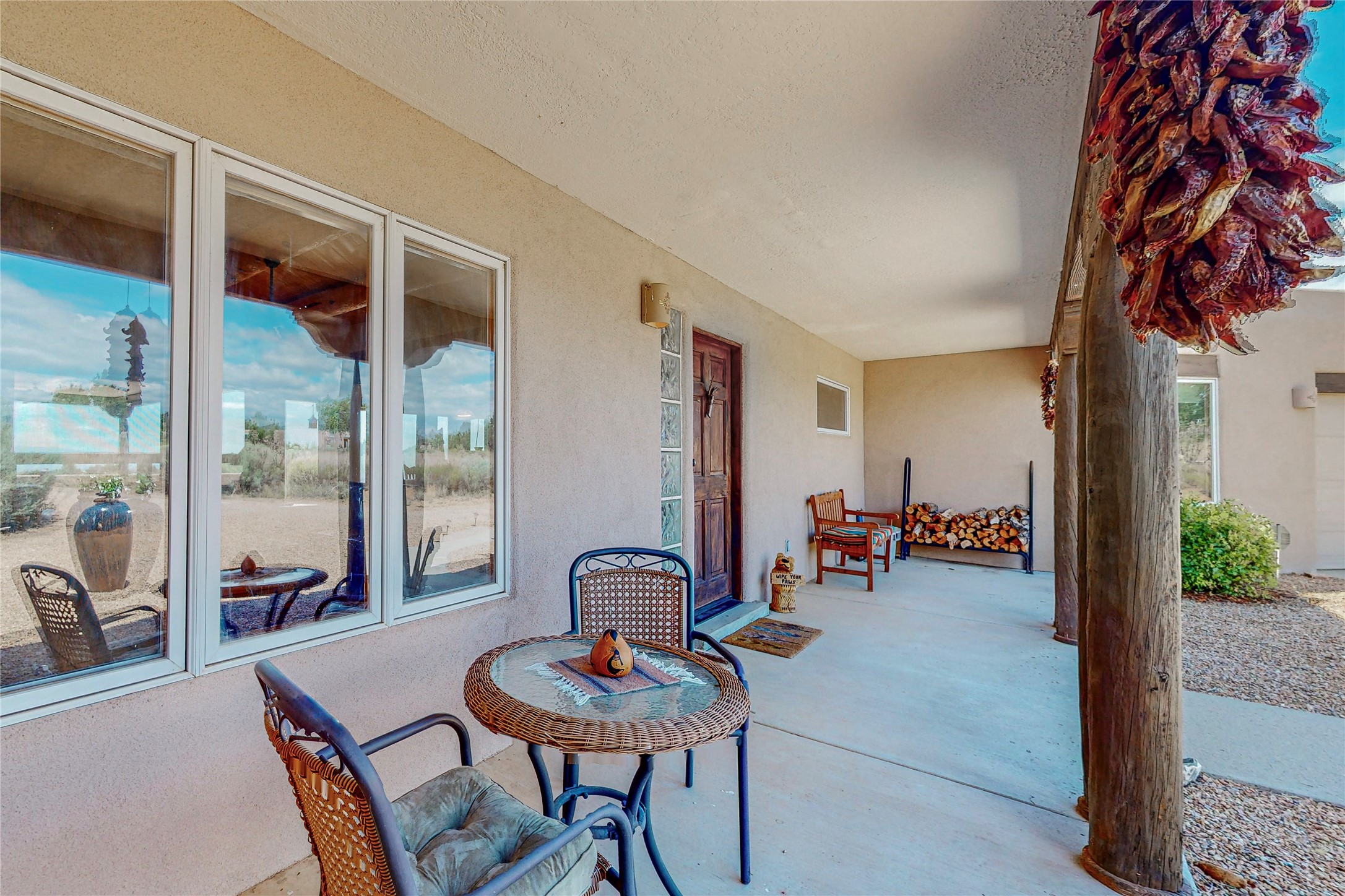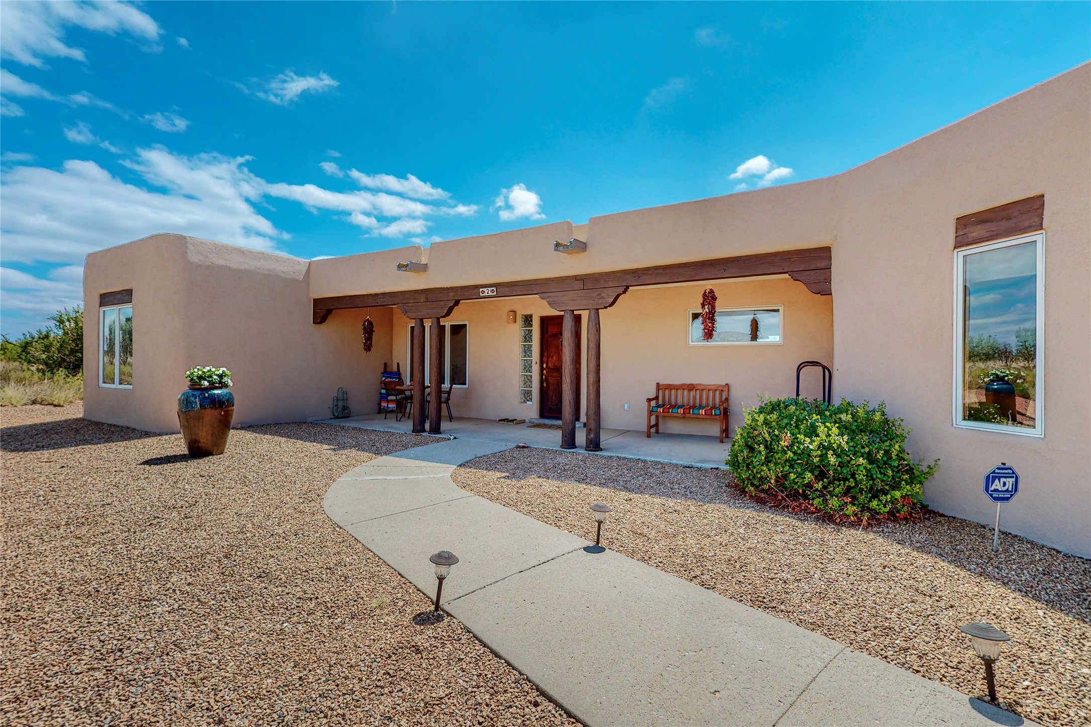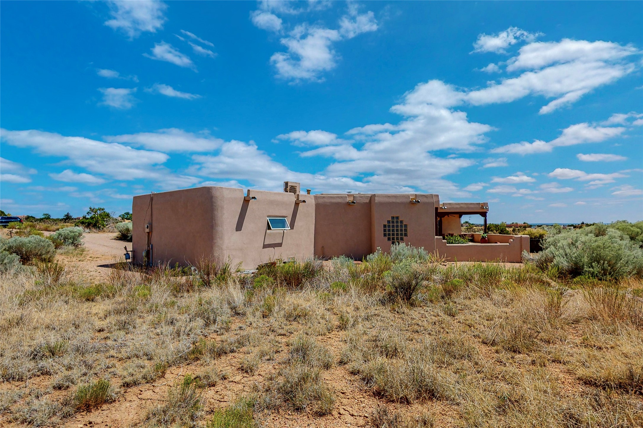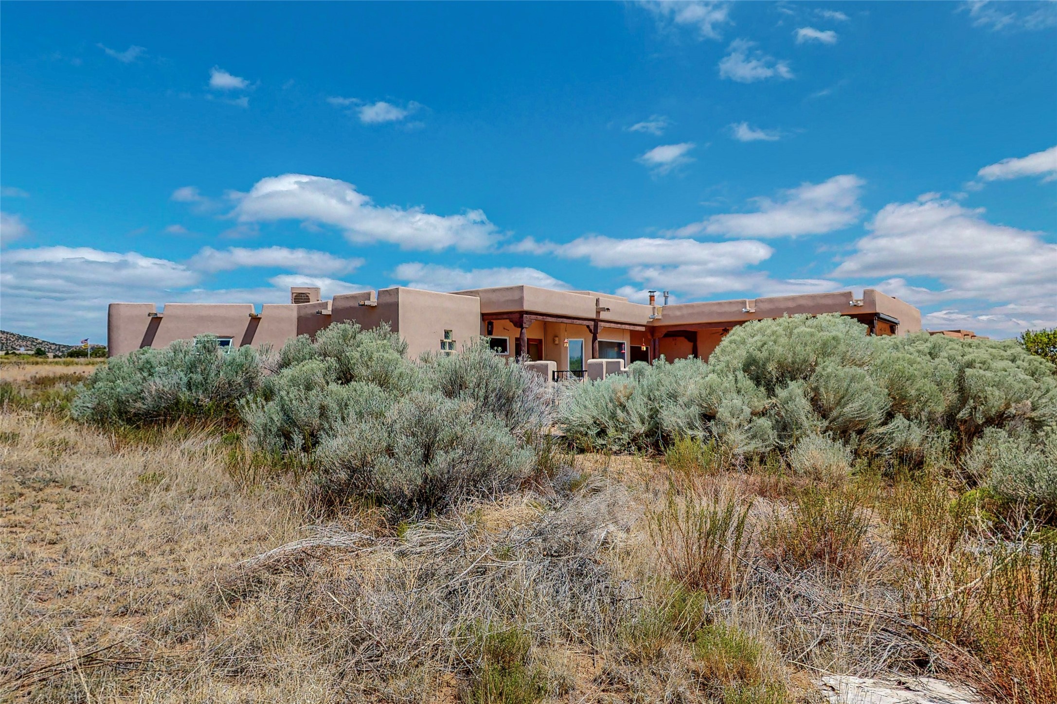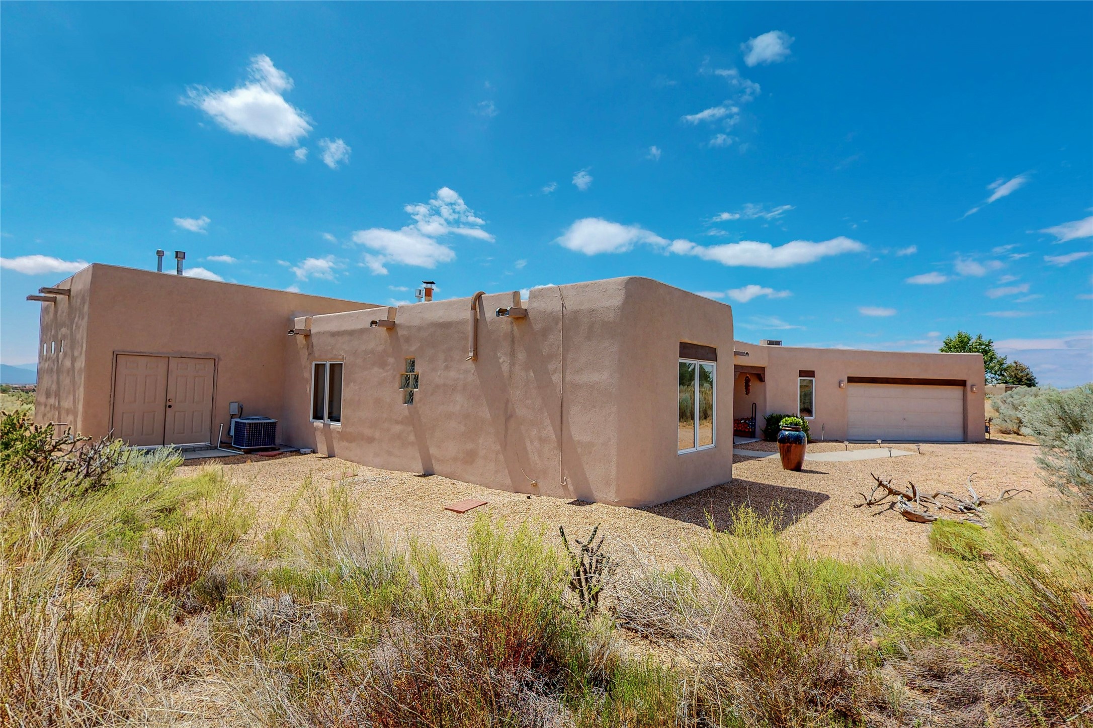 This lovely one owner home was carefully sited and built by Homes by Marie to access expansive mountain views. Lovely light and spacious open plan contemporary pueblo design. The split 3 bedroom design has been enlarged to add a den on one side and an exquisite expansive main bedroom suite with a spa like bathroom and large walk in closet on the other. 3 mini-splits have been added for summer cool, natural gas radiant heating in the original home and gas forced air in the newer wing. A large portal for summer sunset dining overlooking a privately walled garden and an easterly front view portal for early coffee or breakfast. This home is ideally located close to the Eldorado Community Center and amenities, 2 local shopping centers, a school, library and senior center. It is on a paved road close to the exits making it an easy few minutes into Santa Fe or to the train station in historic Lamy village.