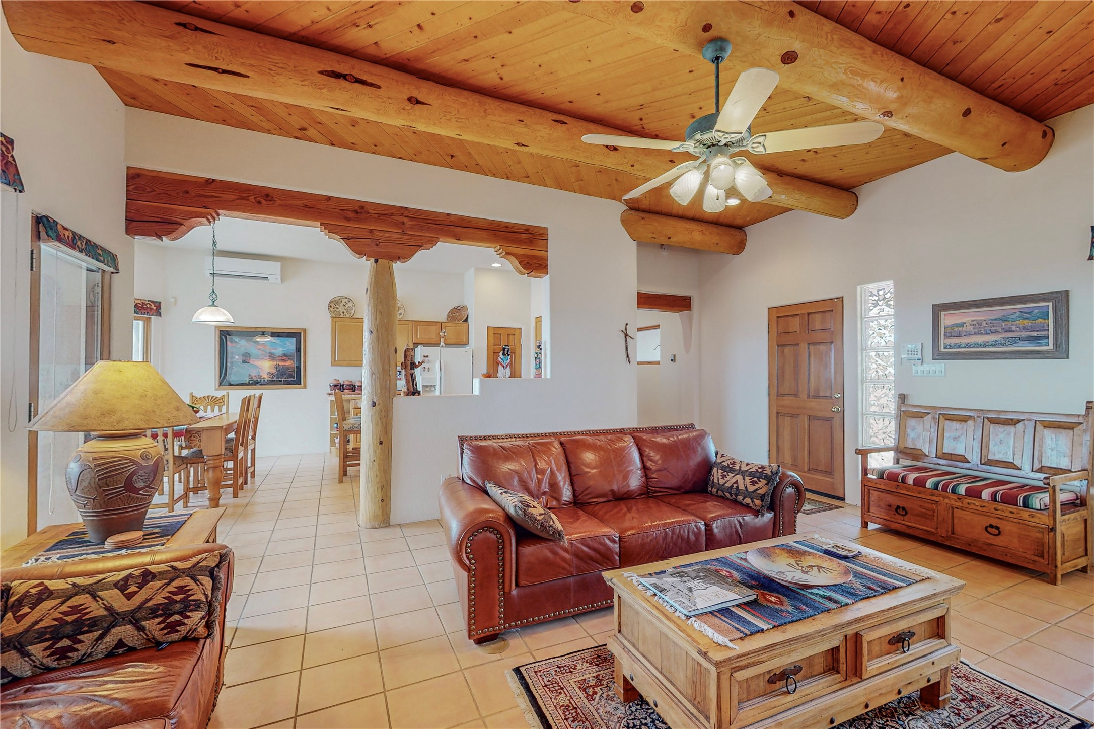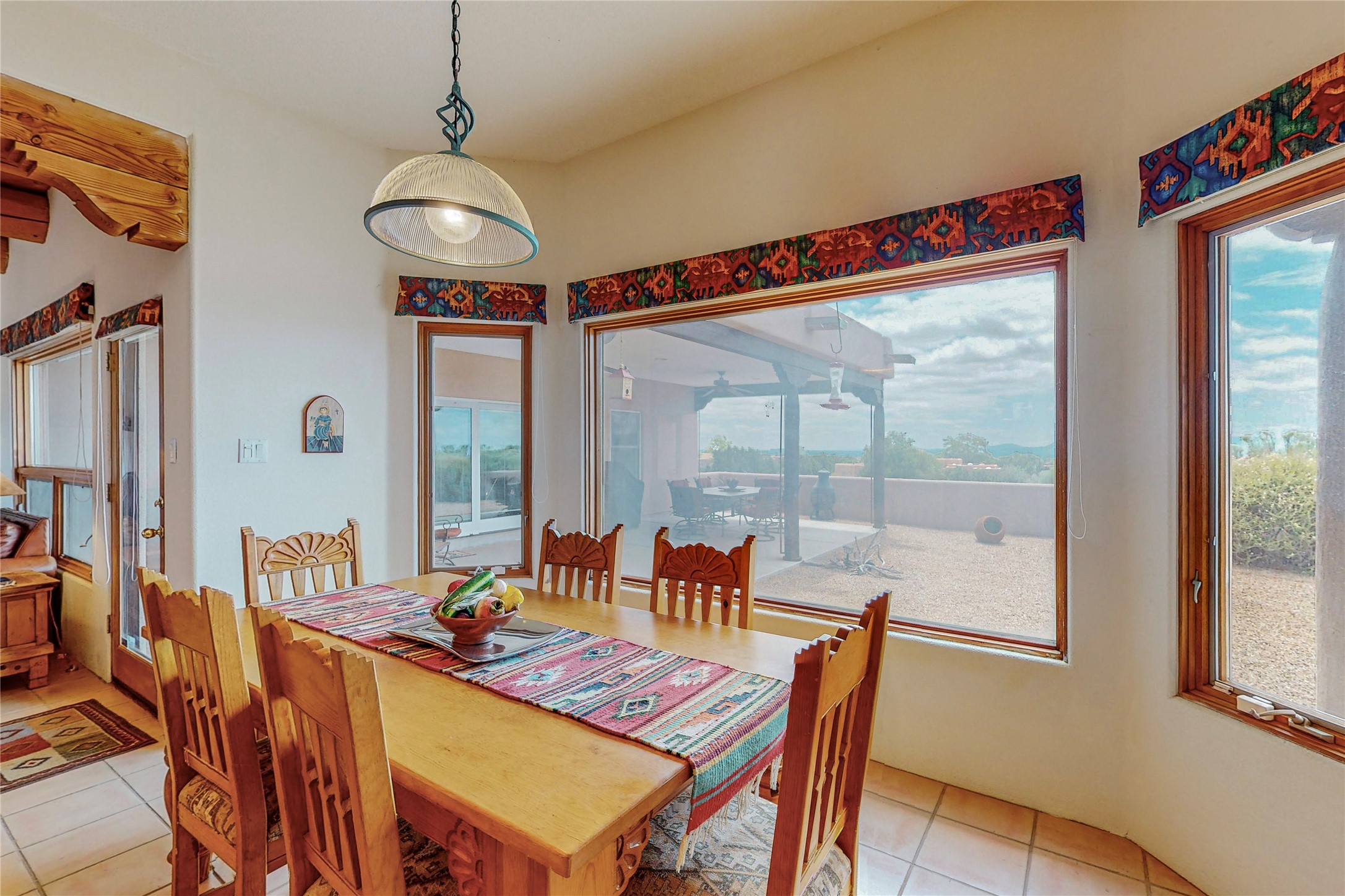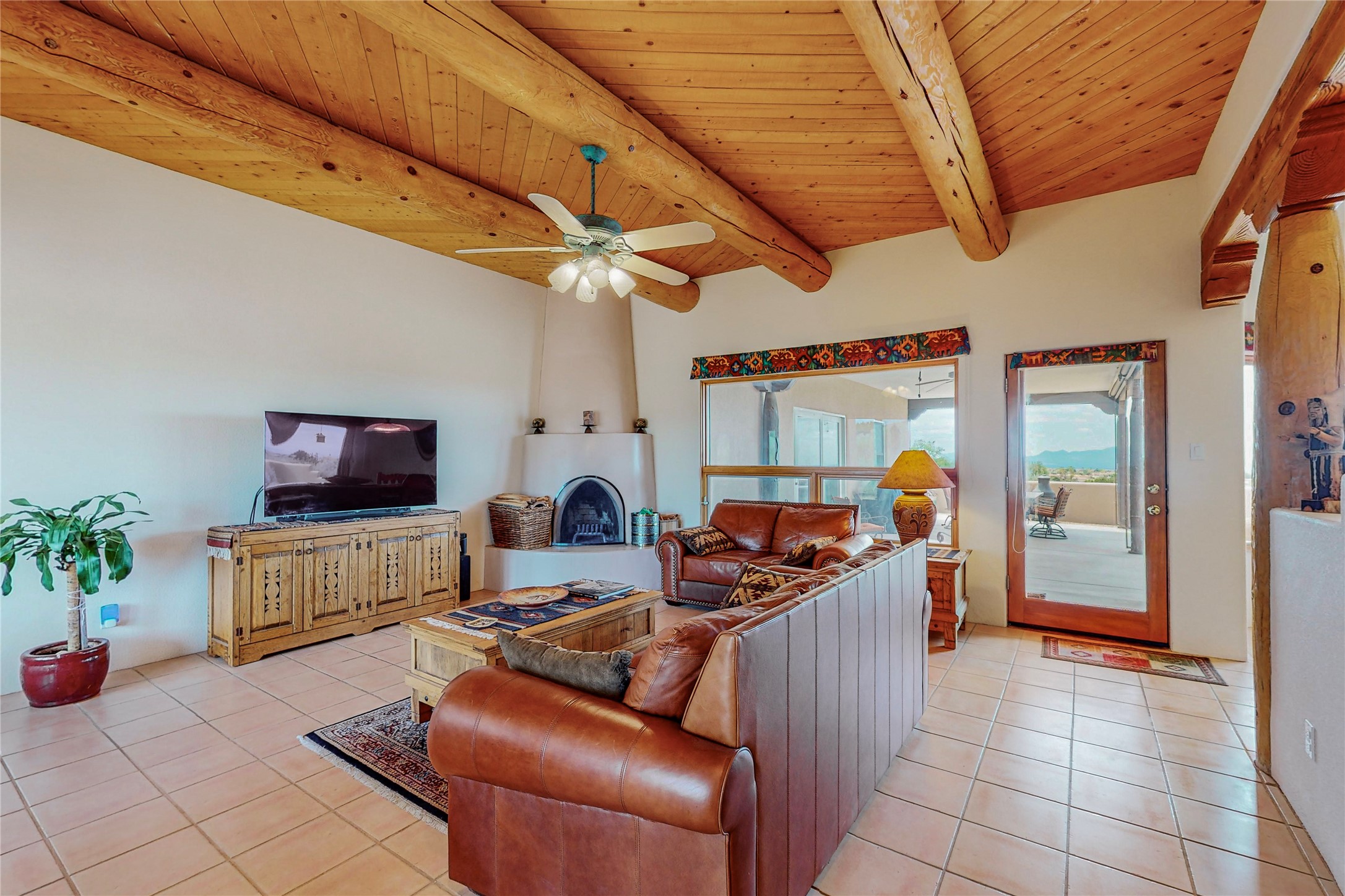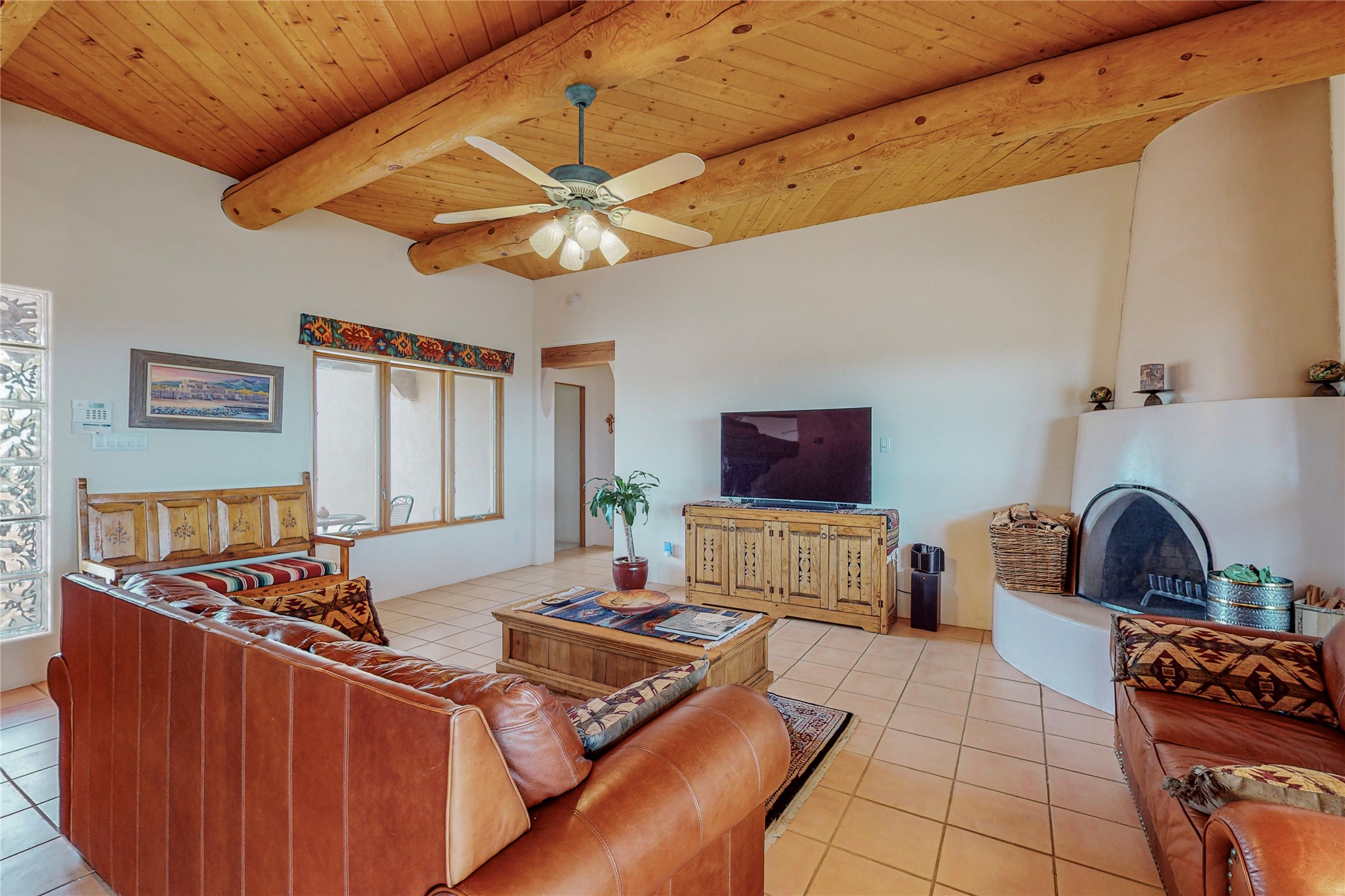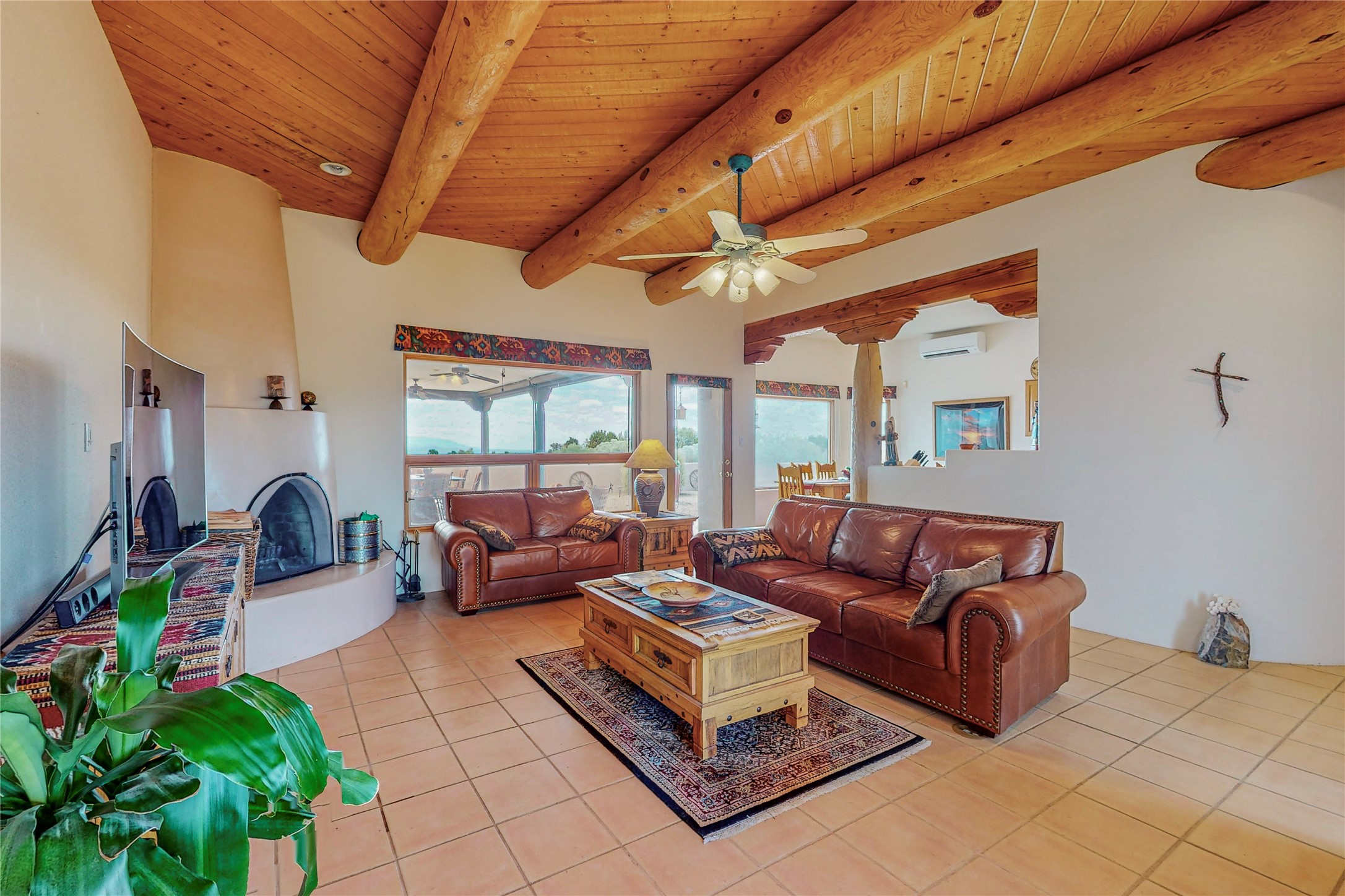This lovely one owner home was carefully sited and built by Homes by Marie to access expansive mountain views. Lovely light and spacious open plan contemporary pueblo design. The split 3 bedroom design has been enlarged to add a den on one side and an exquisite expansive main bedroom suite with a spa like bathroom and large walk in closet on the other. 3 mini-splits have been added for summer cool, natural gas radiant heating in the original home and gas forced air in the newer wing. A large portal for summer sunset dining overlooking a privately walled garden and an easterly front view portal for early coffee or breakfast. This home is ideally located close to the Eldorado Community Center and amenities, 2 local shopping centers, a school, library and senior center. It is on a paved road close to the exits making it an easy few minutes into Santa Fe or to the train station in historic Lamy village.