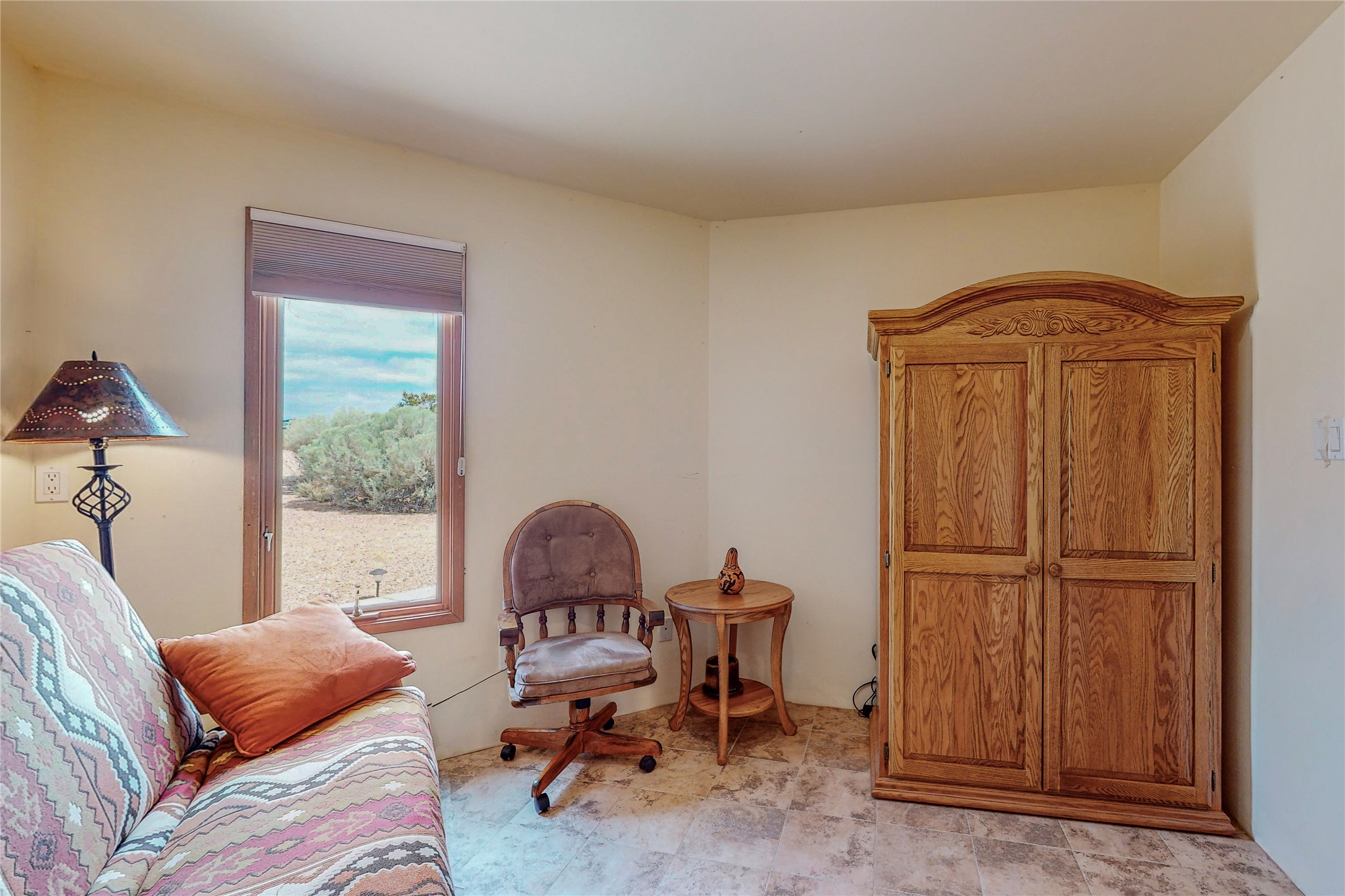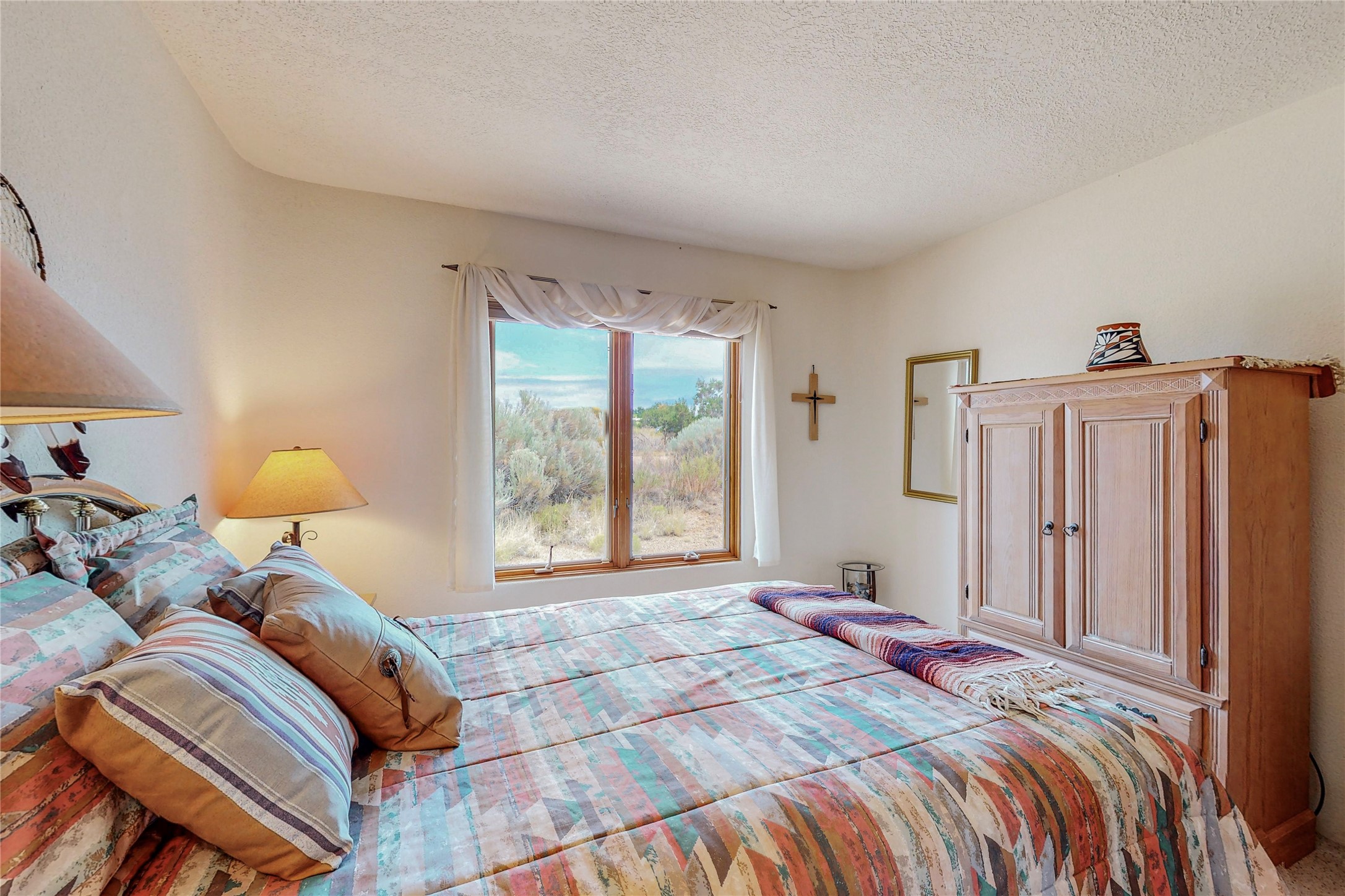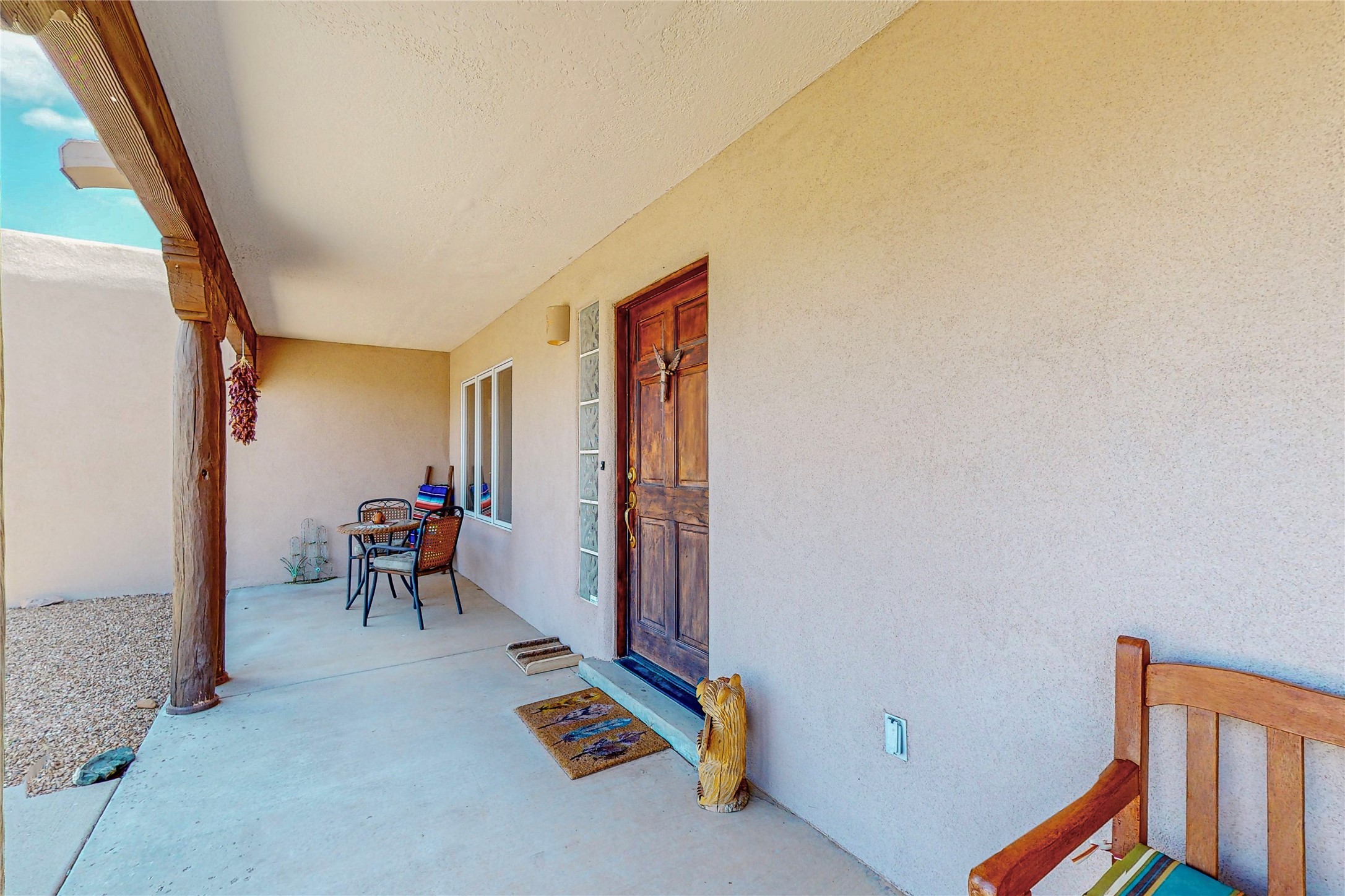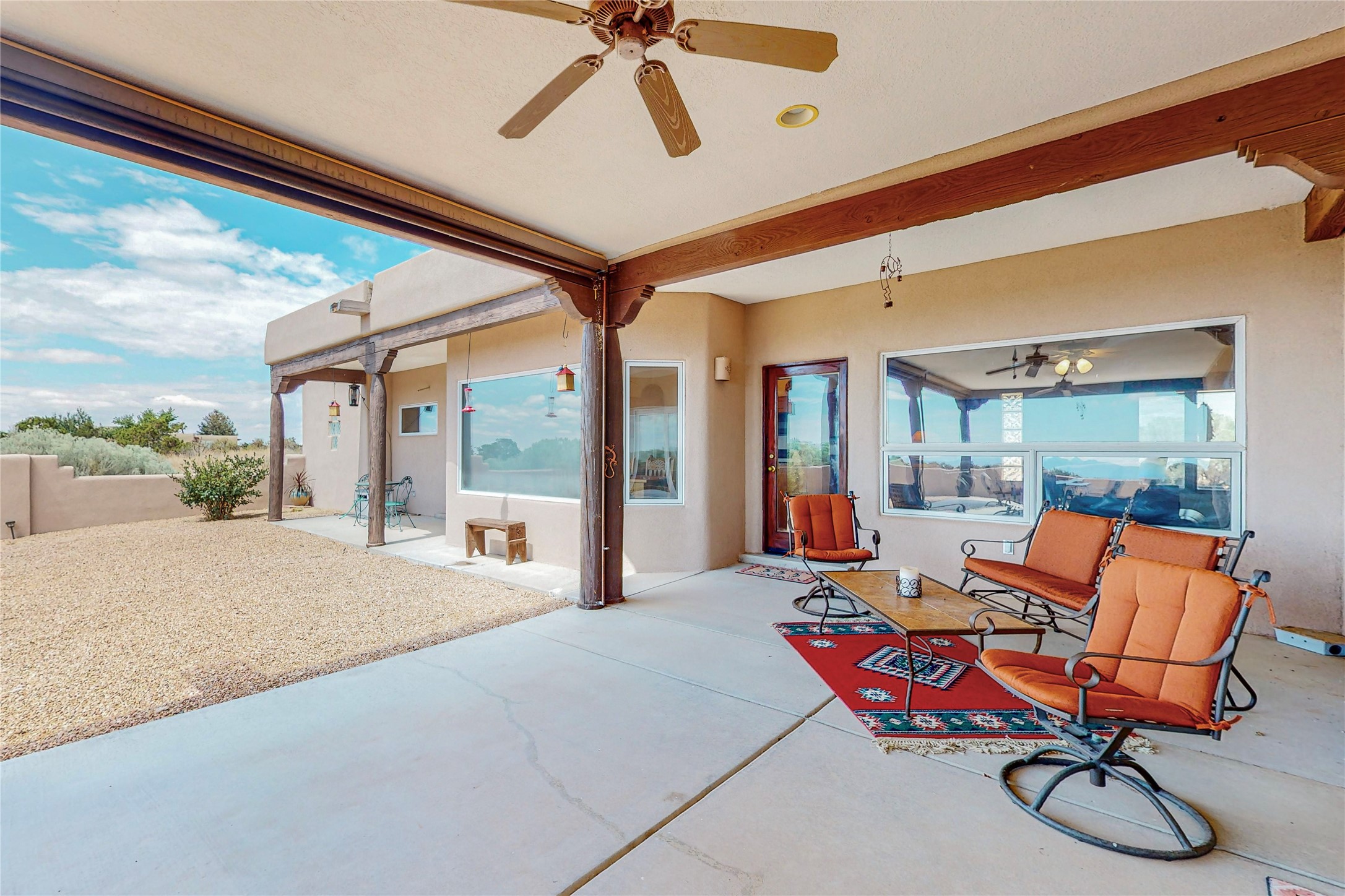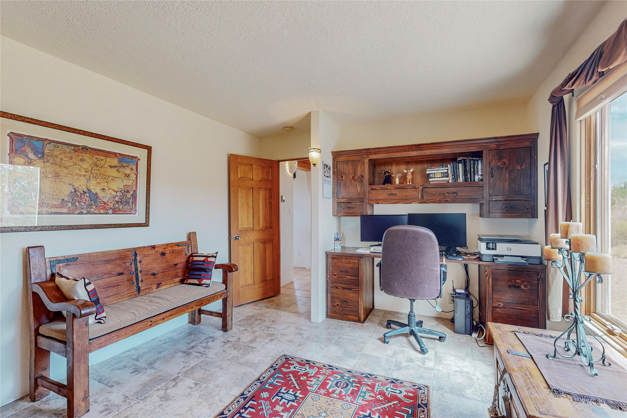 This lovely one owner home was carefully sited and built by Homes by Marie to access expansive mountain views. Lovely light and spacious open plan contemporary pueblo design. The split 3 bedroom design has been enlarged to add a den on one side and an exquisite expansive main bedroom suite with a spa like bathroom and large walk in closet on the other. 3 mini-splits have been added for summer cool, natural gas radiant heating in the original home and gas forced air in the newer wing. A large portal for summer sunset dining overlooking a privately walled garden and an easterly front view portal for early coffee or breakfast. This home is ideally located close to the Eldorado Community Center and amenities, 2 local shopping centers, a school, library and senior center. It is on a paved road close to the exits making it an easy few minutes into Santa Fe or to the train station in historic Lamy village.