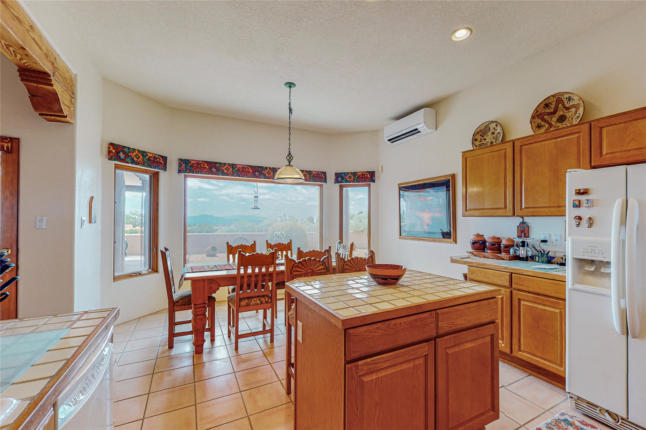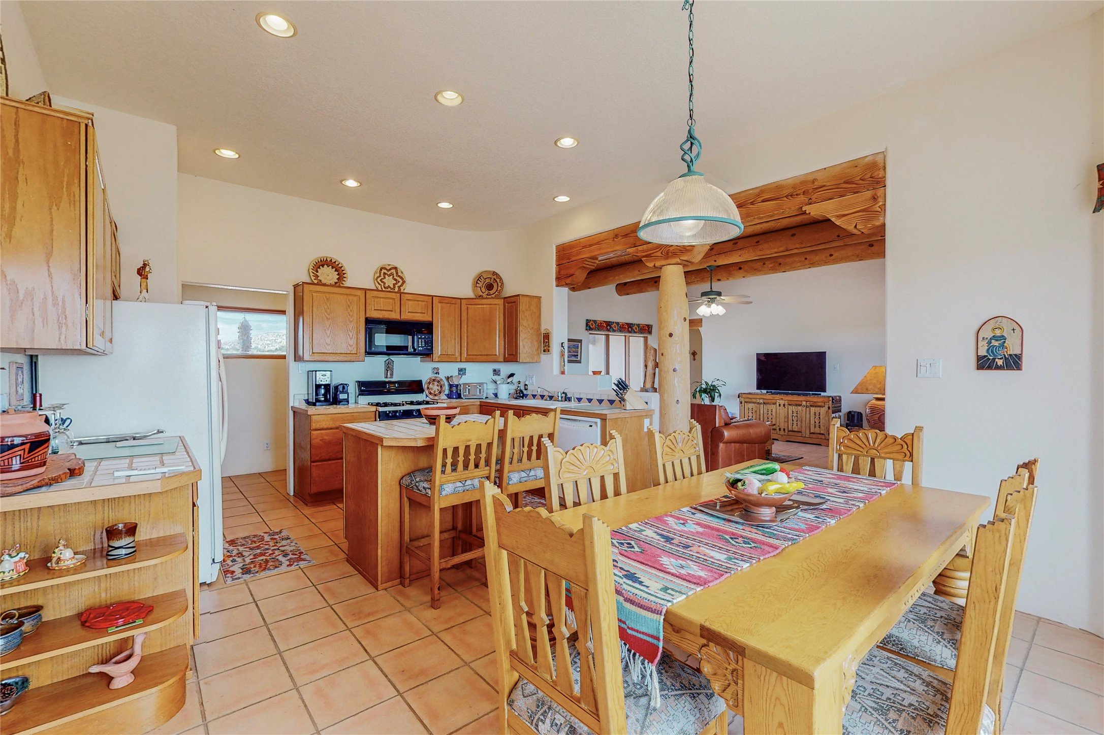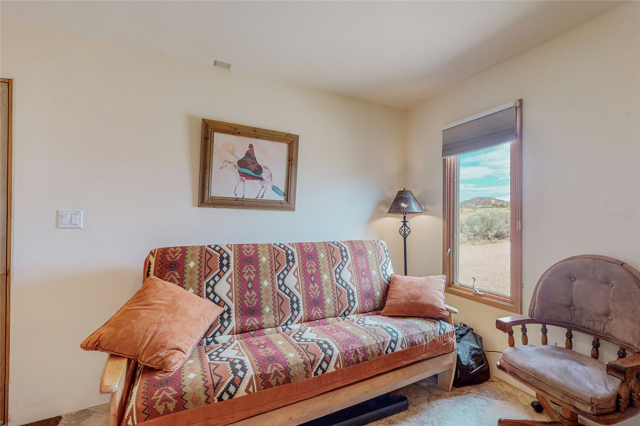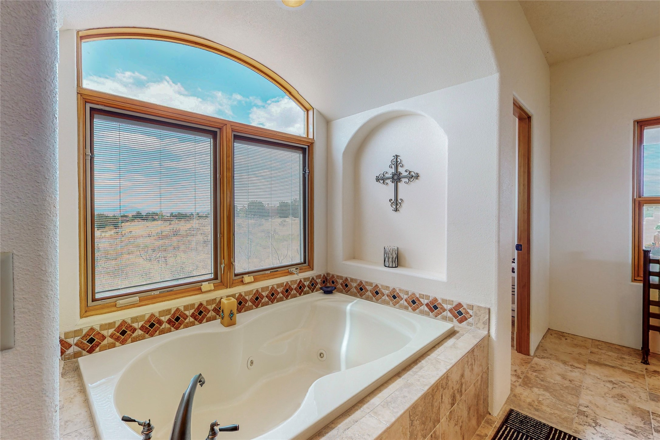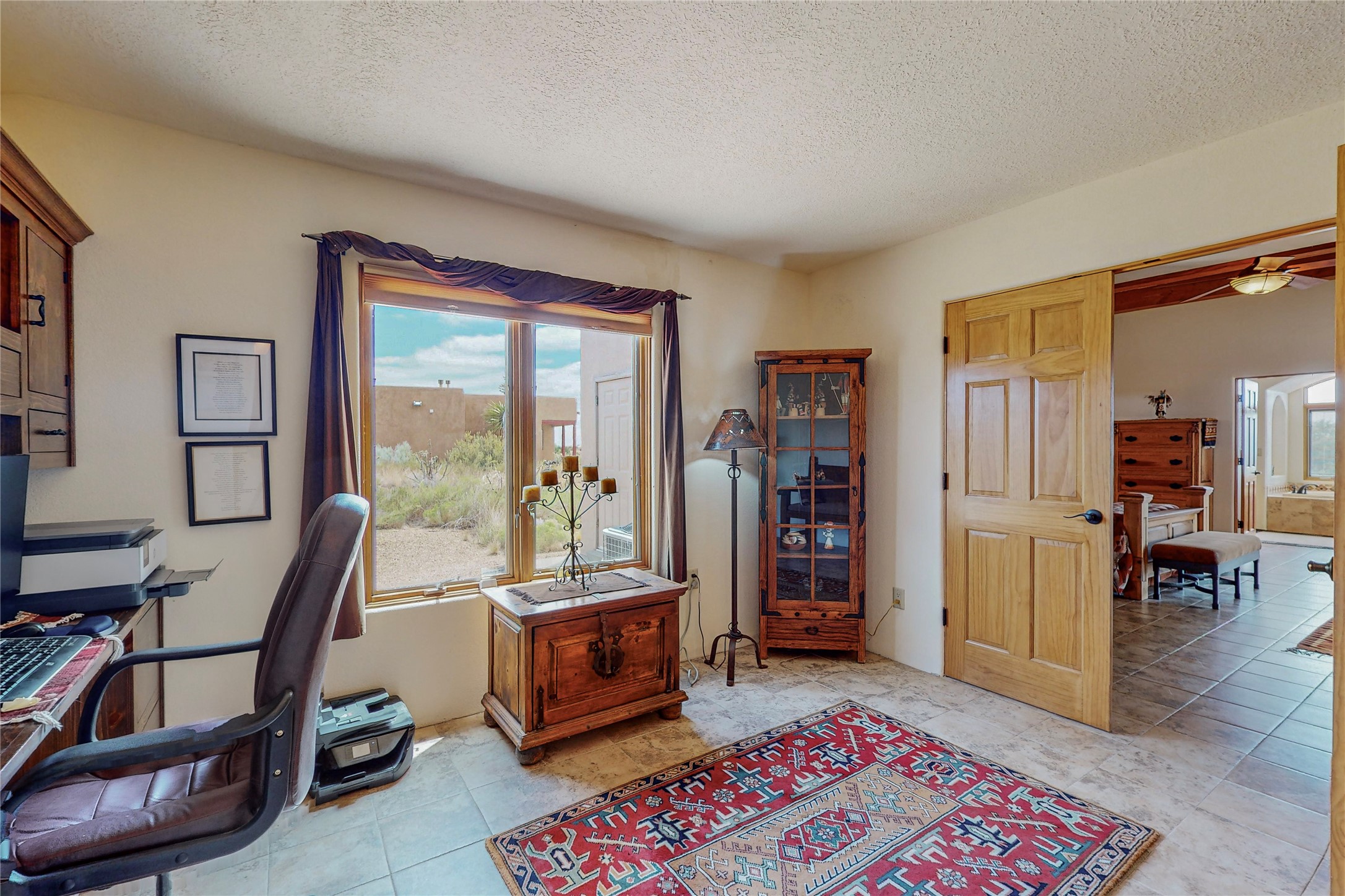 This lovely one owner home was carefully sited and built by Homes by Marie to access expansive mountain views. Lovely light and spacious open plan contemporary pueblo design. The split 3 bedroom design has been enlarged to add a den on one side and an exquisite expansive main bedroom suite with a spa like bathroom and large walk in closet on the other. 3 mini-splits have been added for summer cool, natural gas radiant heating in the original home and gas forced air in the newer wing. A large portal for summer sunset dining overlooking a privately walled garden and an easterly front view portal for early coffee or breakfast. This home is ideally located close to the Eldorado Community Center and amenities, 2 local shopping centers, a school, library and senior center. It is on a paved road close to the exits making it an easy few minutes into Santa Fe or to the train station in historic Lamy village.
