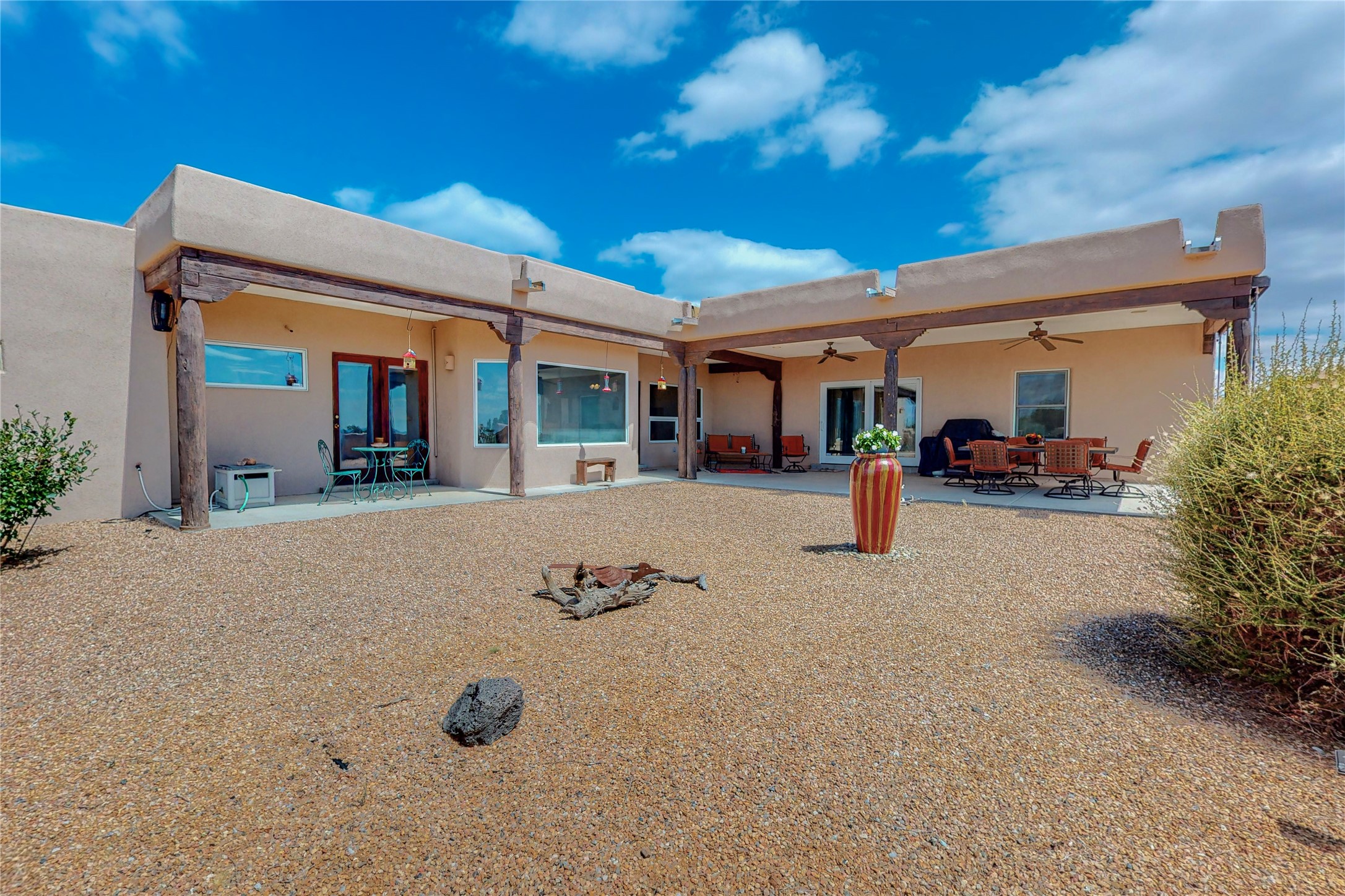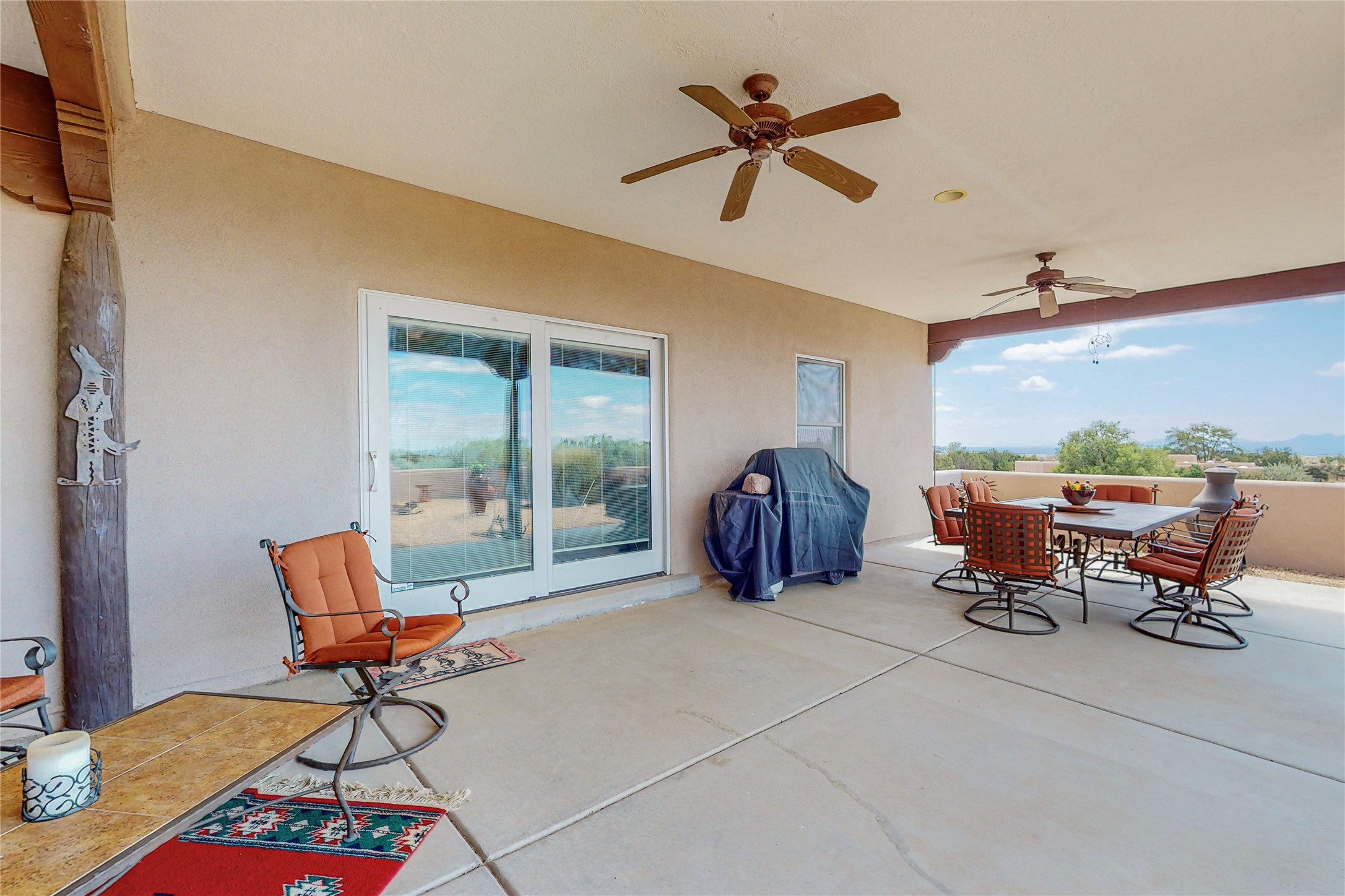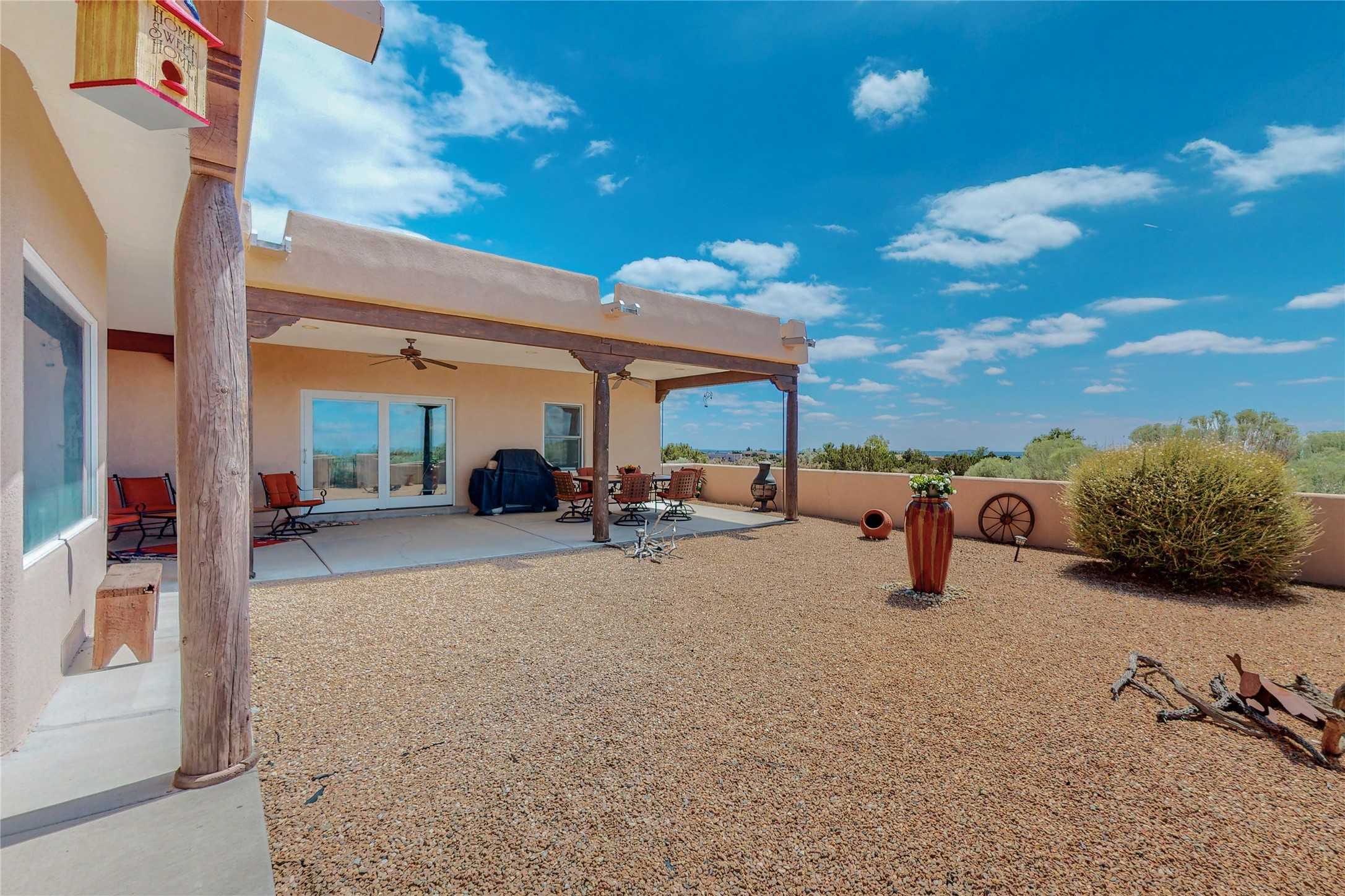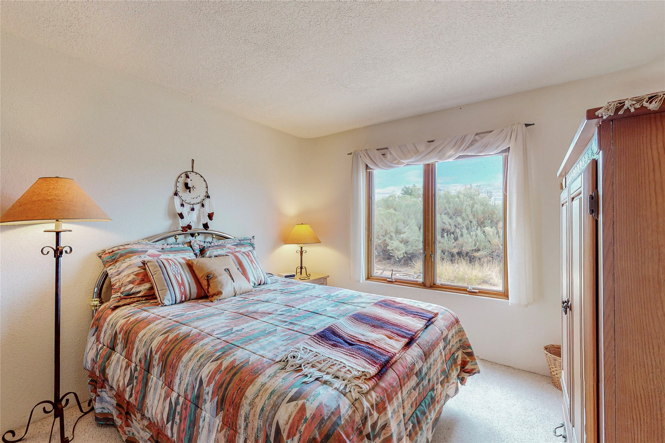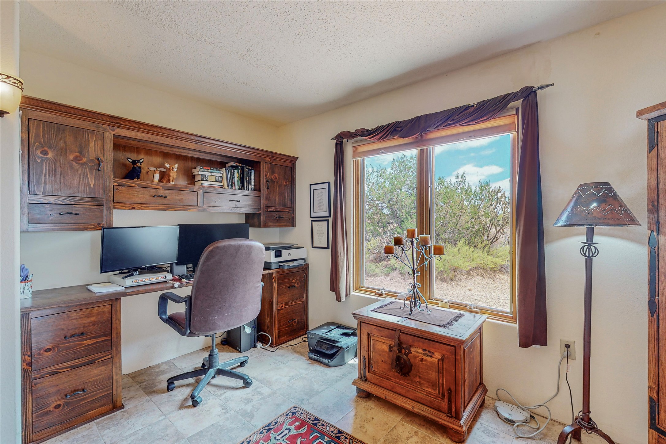 This lovely one owner home was carefully sited and built by Homes by Marie to access expansive mountain views. Lovely light and spacious open plan contemporary pueblo design. The split 3 bedroom design has been enlarged to add a den on one side and an exquisite expansive main bedroom suite with a spa like bathroom and large walk in closet on the other. 3 mini-splits have been added for summer cool, natural gas radiant heating in the original home and gas forced air in the newer wing. A large portal for summer sunset dining overlooking a privately walled garden and an easterly front view portal for early coffee or breakfast. This home is ideally located close to the Eldorado Community Center and amenities, 2 local shopping centers, a school, library and senior center. It is on a paved road close to the exits making it an easy few minutes into Santa Fe or to the train station in historic Lamy village.