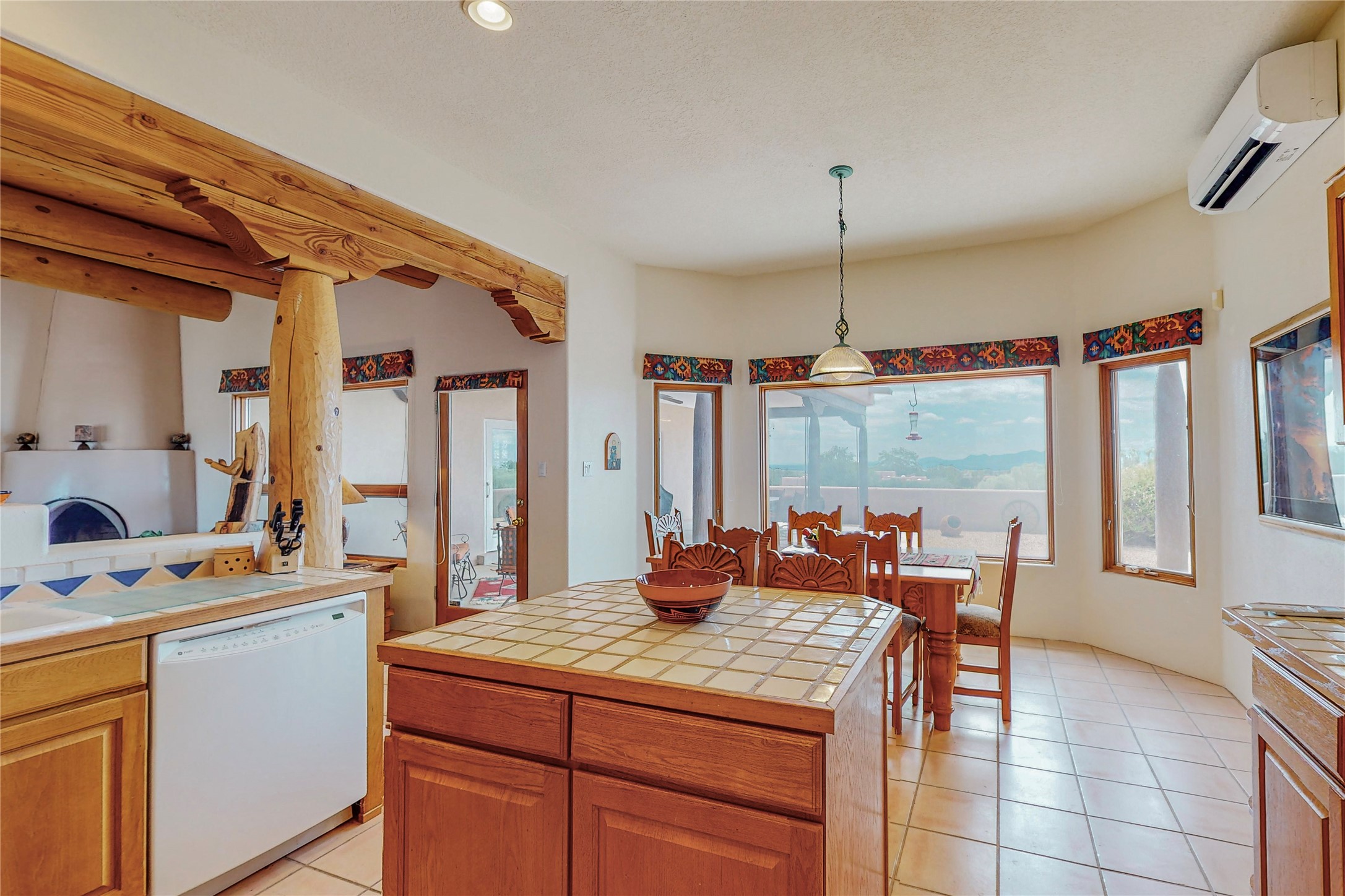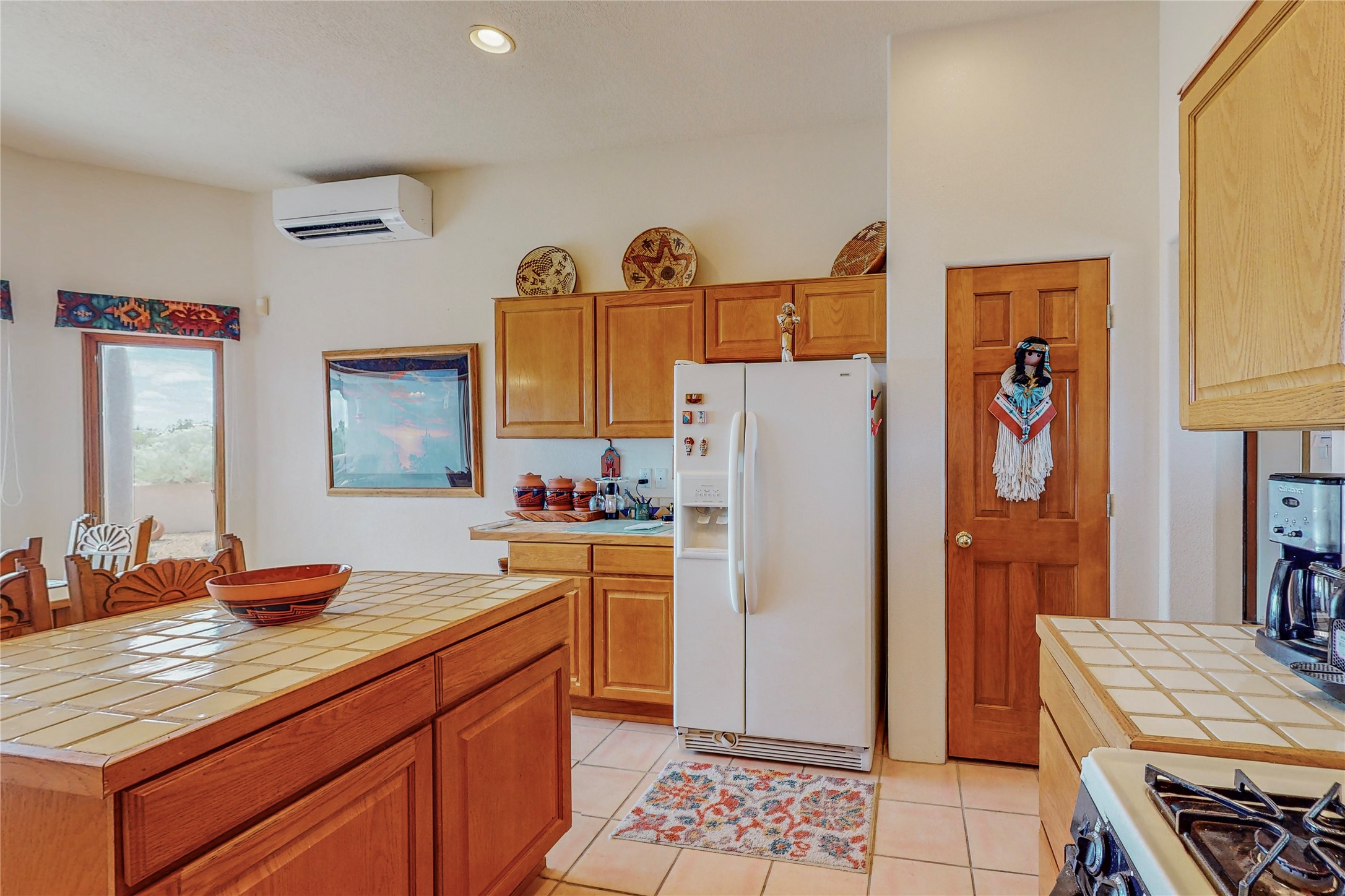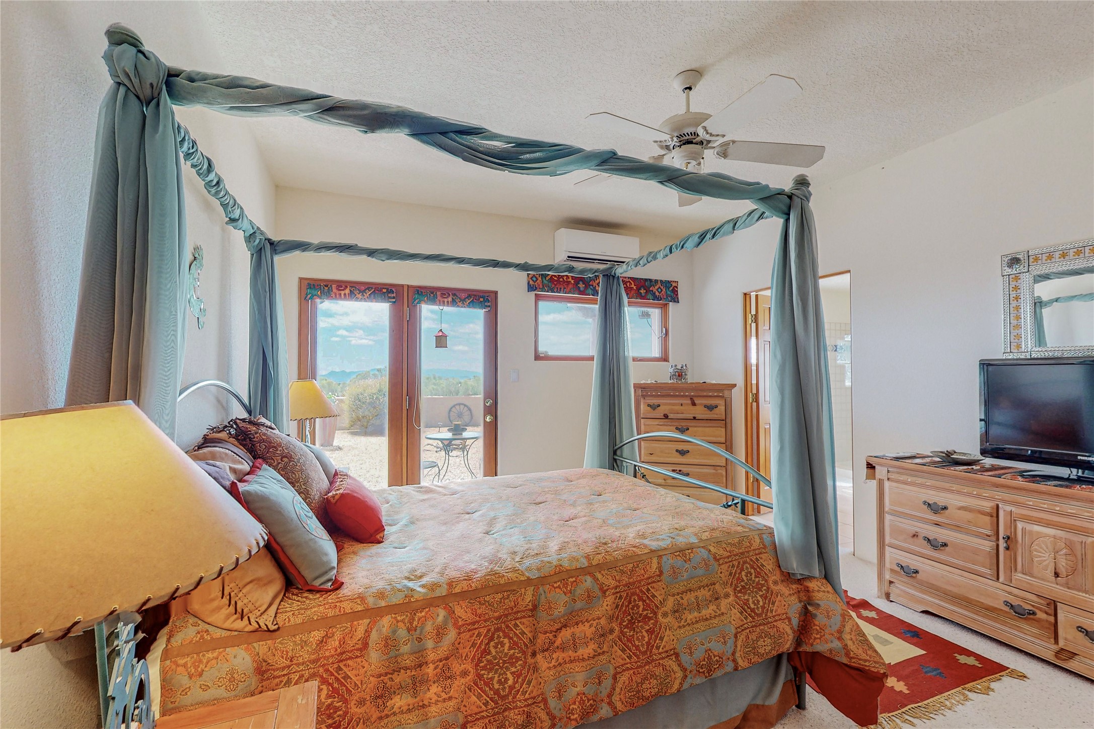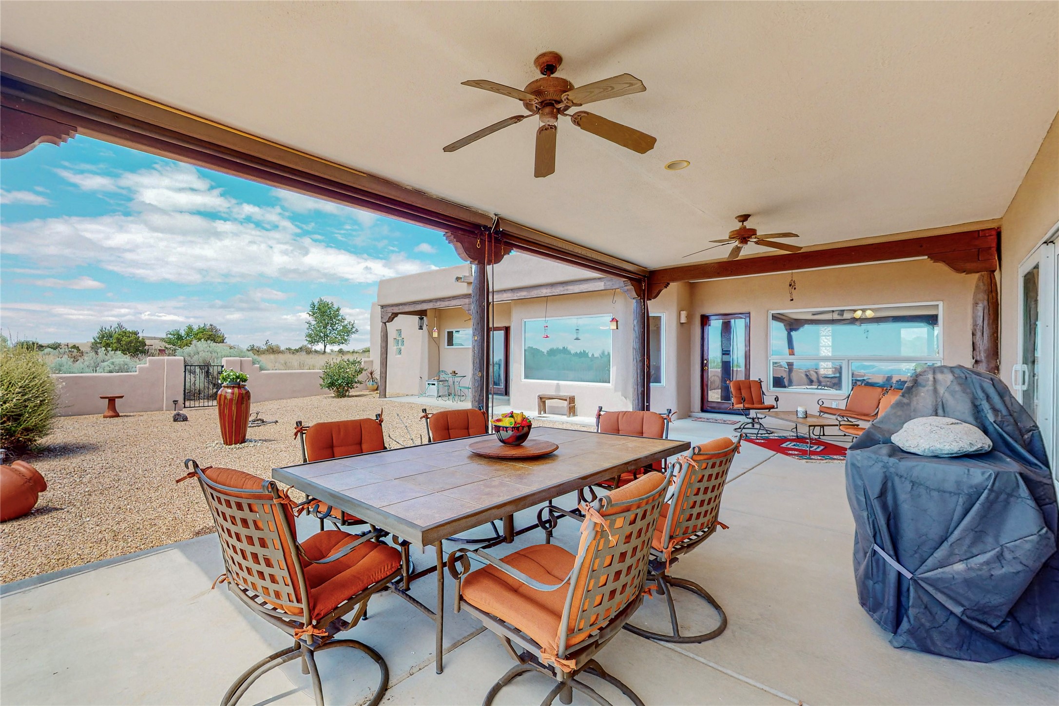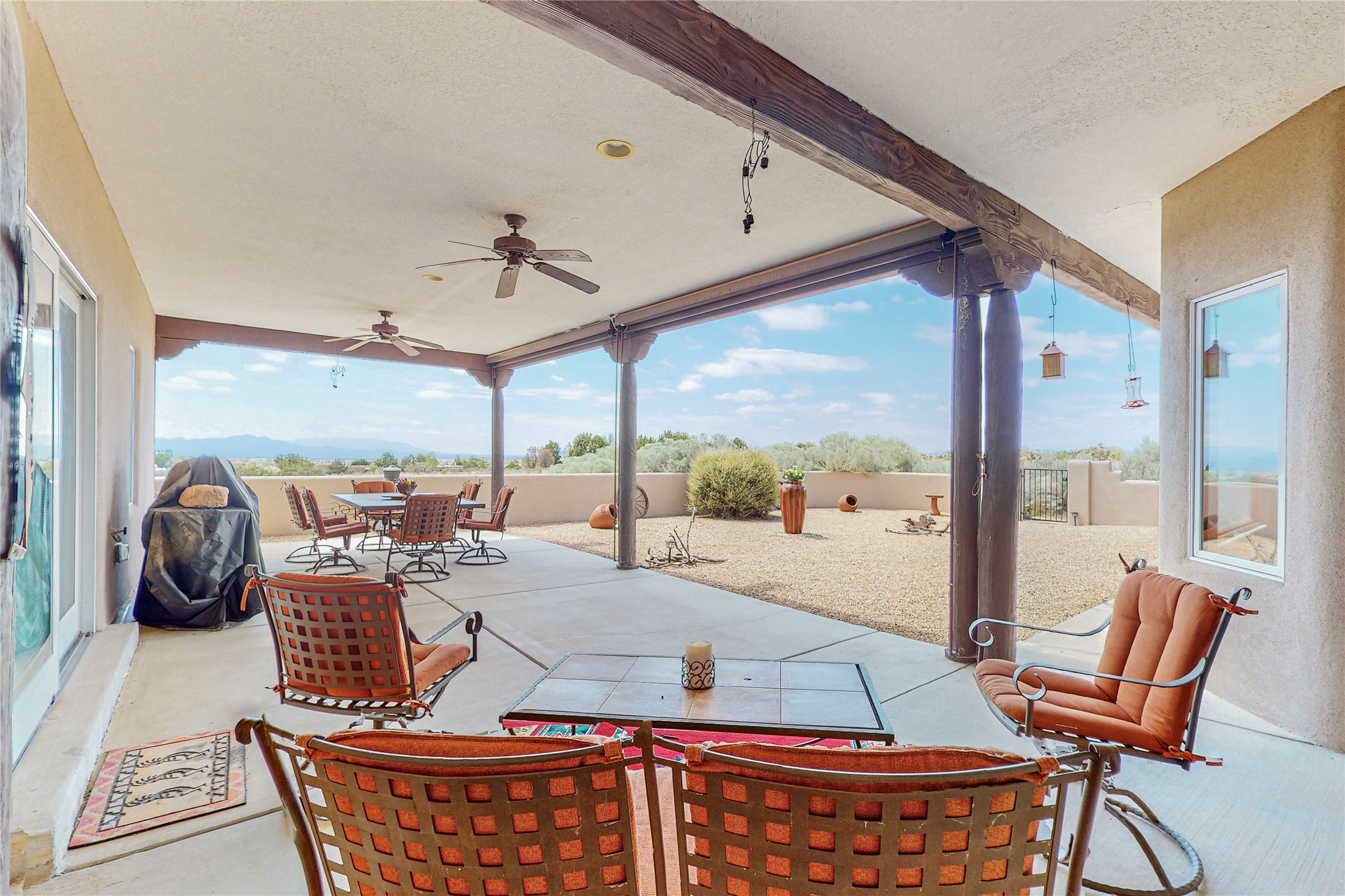 This lovely one owner home was carefully sited and built by Homes by Marie to access expansive mountain views. Lovely light and spacious open plan contemporary pueblo design. The split 3 bedroom design has been enlarged to add a den on one side and an exquisite expansive main bedroom suite with a spa like bathroom and large walk in closet on the other. 3 mini-splits have been added for summer cool, natural gas radiant heating in the original home and gas forced air in the newer wing. A large portal for summer sunset dining overlooking a privately walled garden and an easterly front view portal for early coffee or breakfast. This home is ideally located close to the Eldorado Community Center and amenities, 2 local shopping centers, a school, library and senior center. It is on a paved road close to the exits making it an easy few minutes into Santa Fe or to the train station in historic Lamy village.