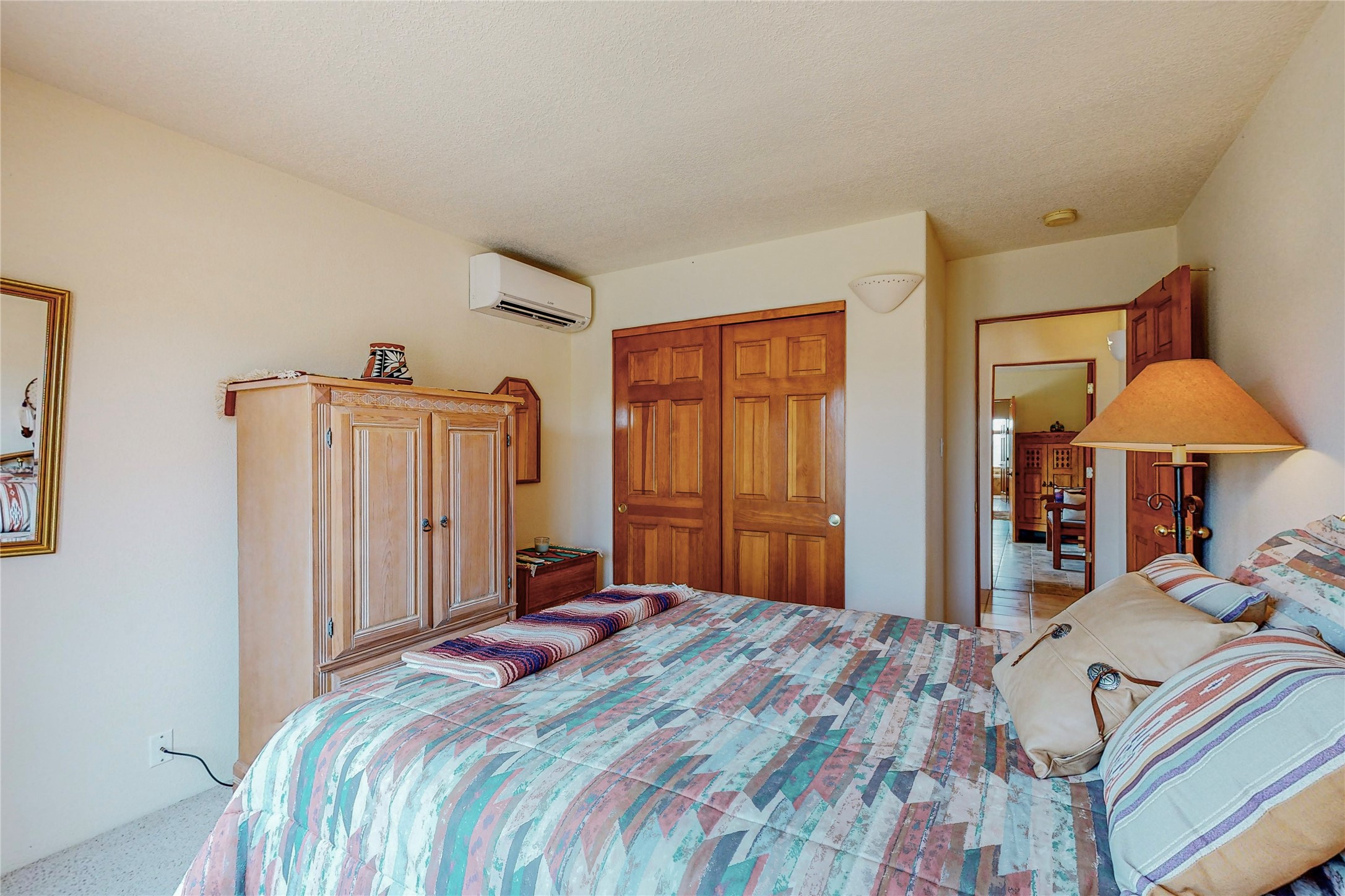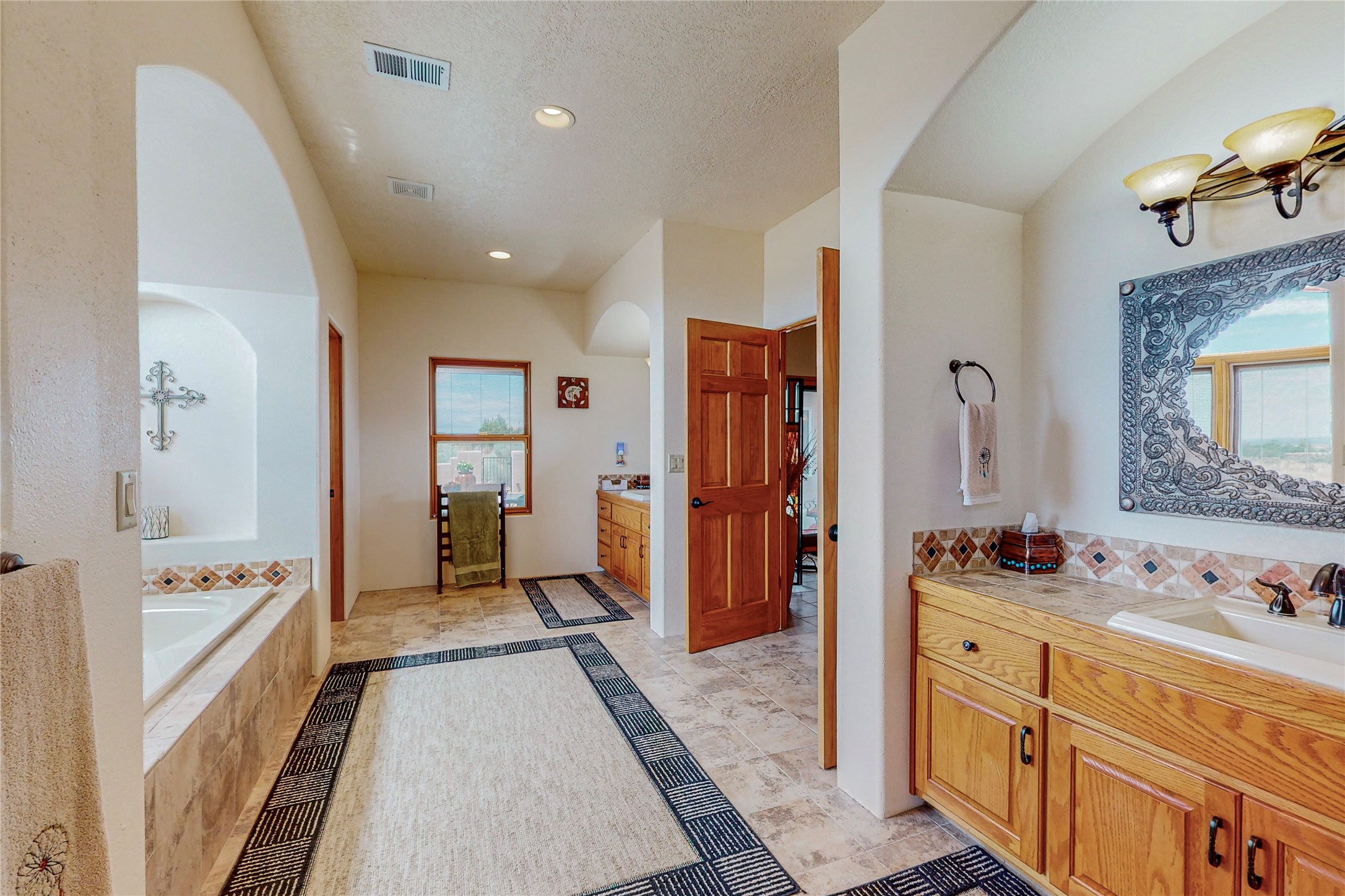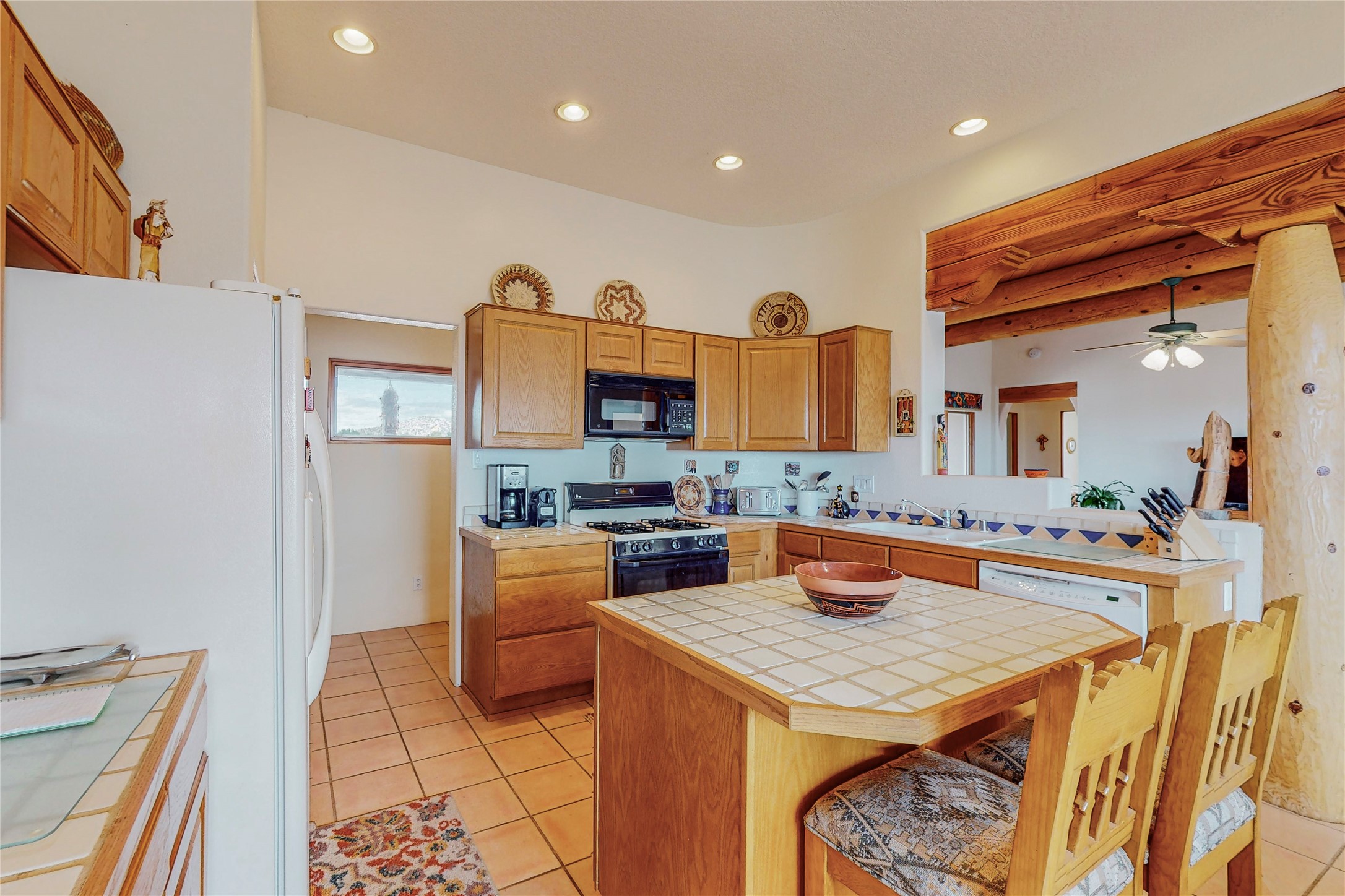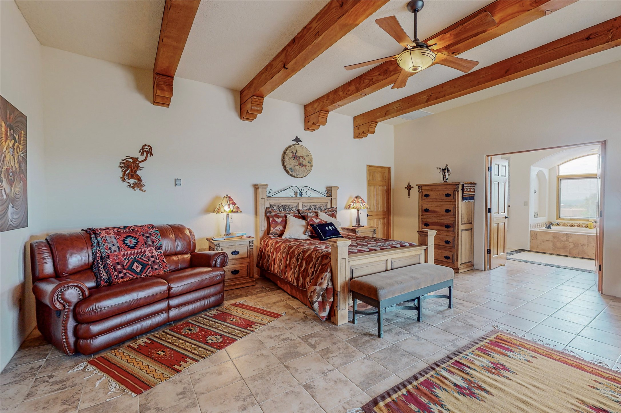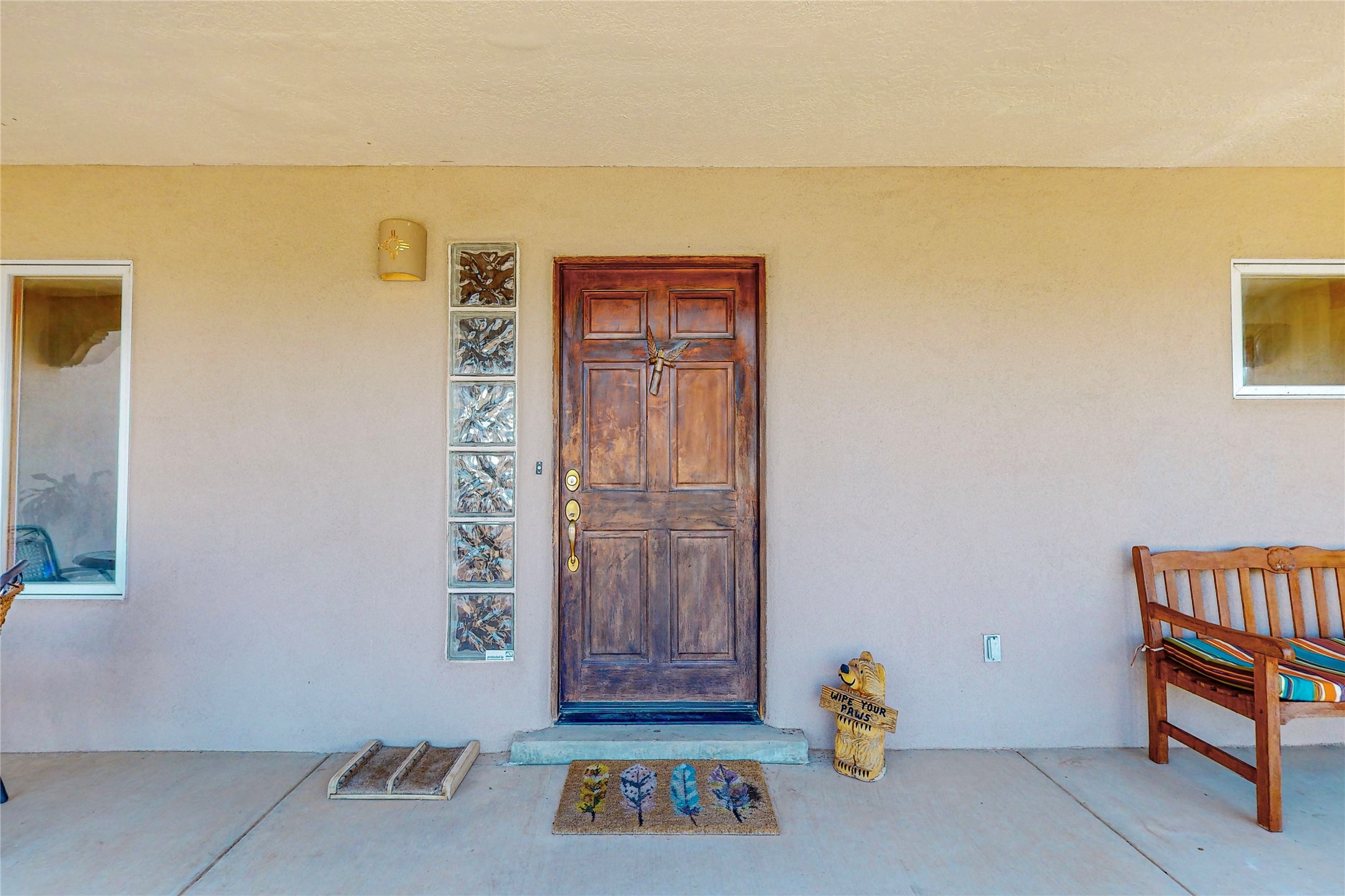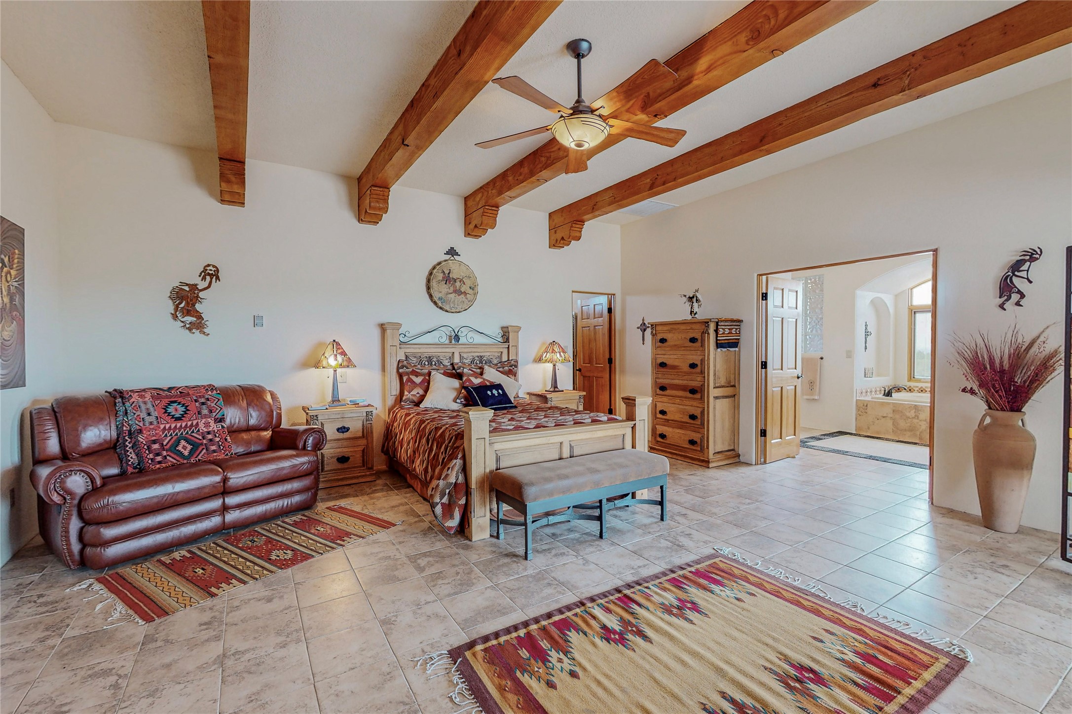 This lovely one owner home was carefully sited and built by Homes by Marie to access expansive mountain views. Lovely light and spacious open plan contemporary pueblo design. The split 3 bedroom design has been enlarged to add a den on one side and an exquisite expansive main bedroom suite with a spa like bathroom and large walk in closet on the other. 3 mini-splits have been added for summer cool, natural gas radiant heating in the original home and gas forced air in the newer wing. A large portal for summer sunset dining overlooking a privately walled garden and an easterly front view portal for early coffee or breakfast. This home is ideally located close to the Eldorado Community Center and amenities, 2 local shopping centers, a school, library and senior center. It is on a paved road close to the exits making it an easy few minutes into Santa Fe or to the train station in historic Lamy village.