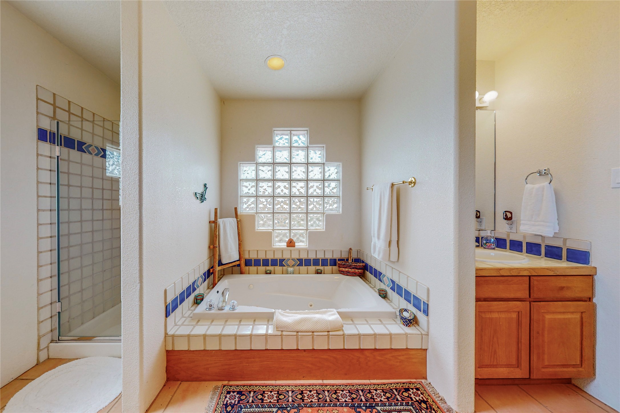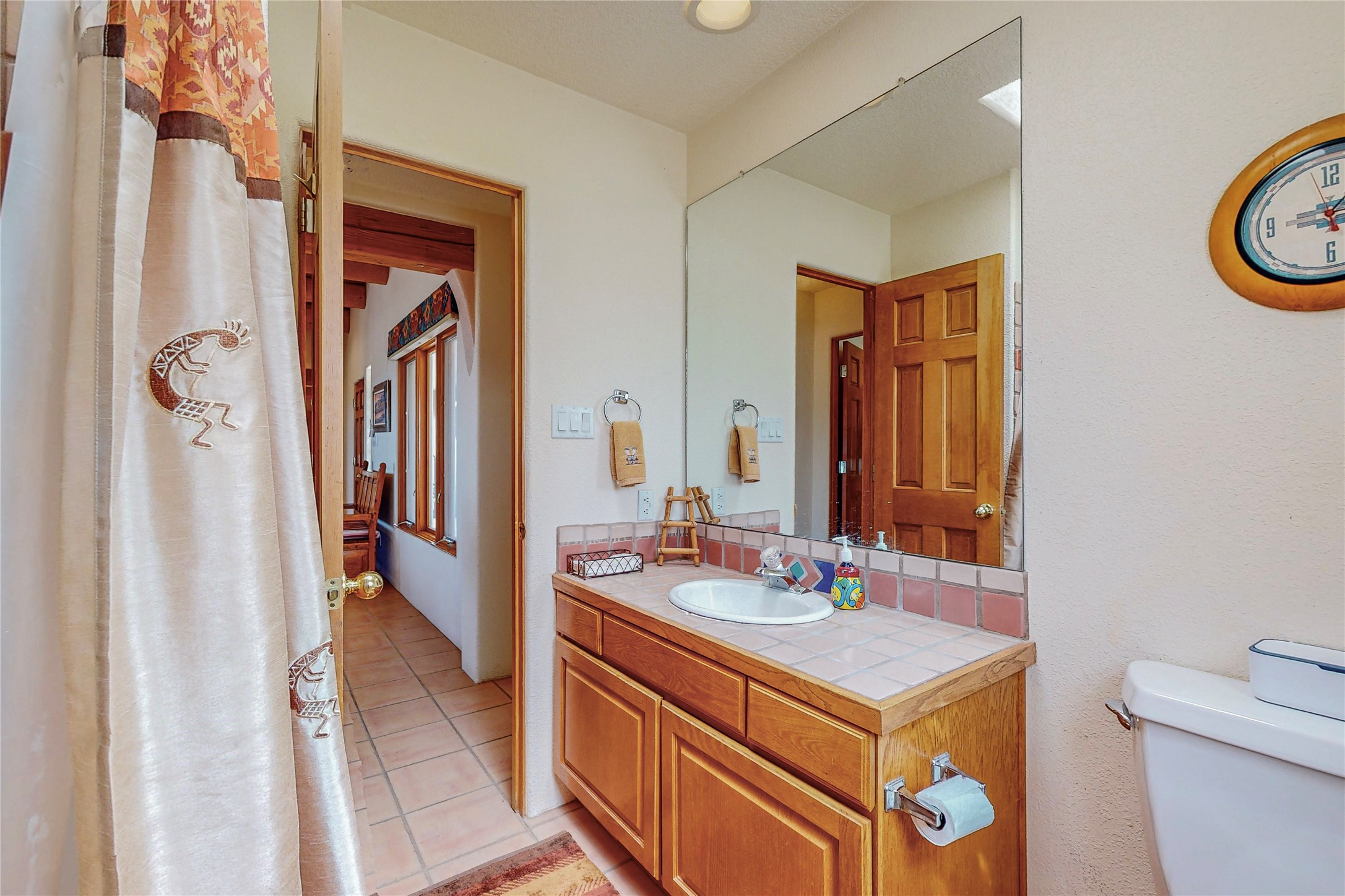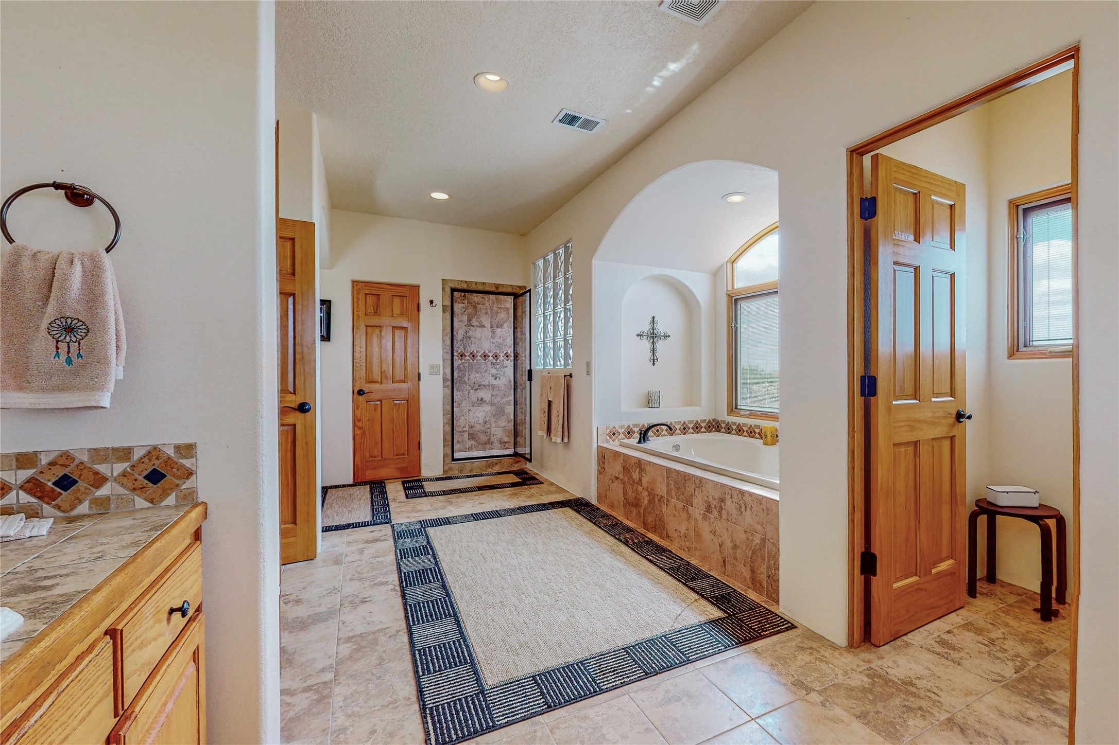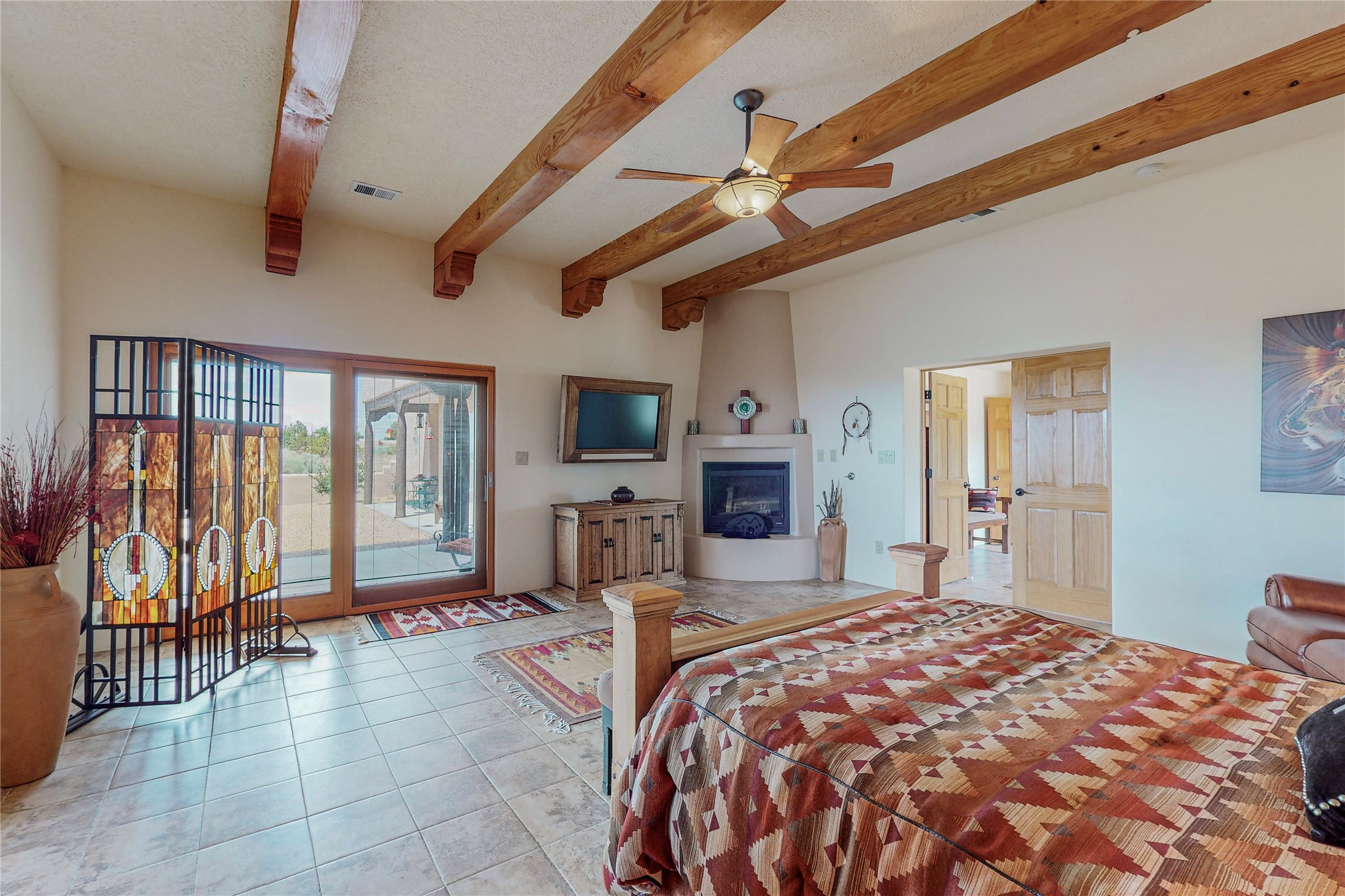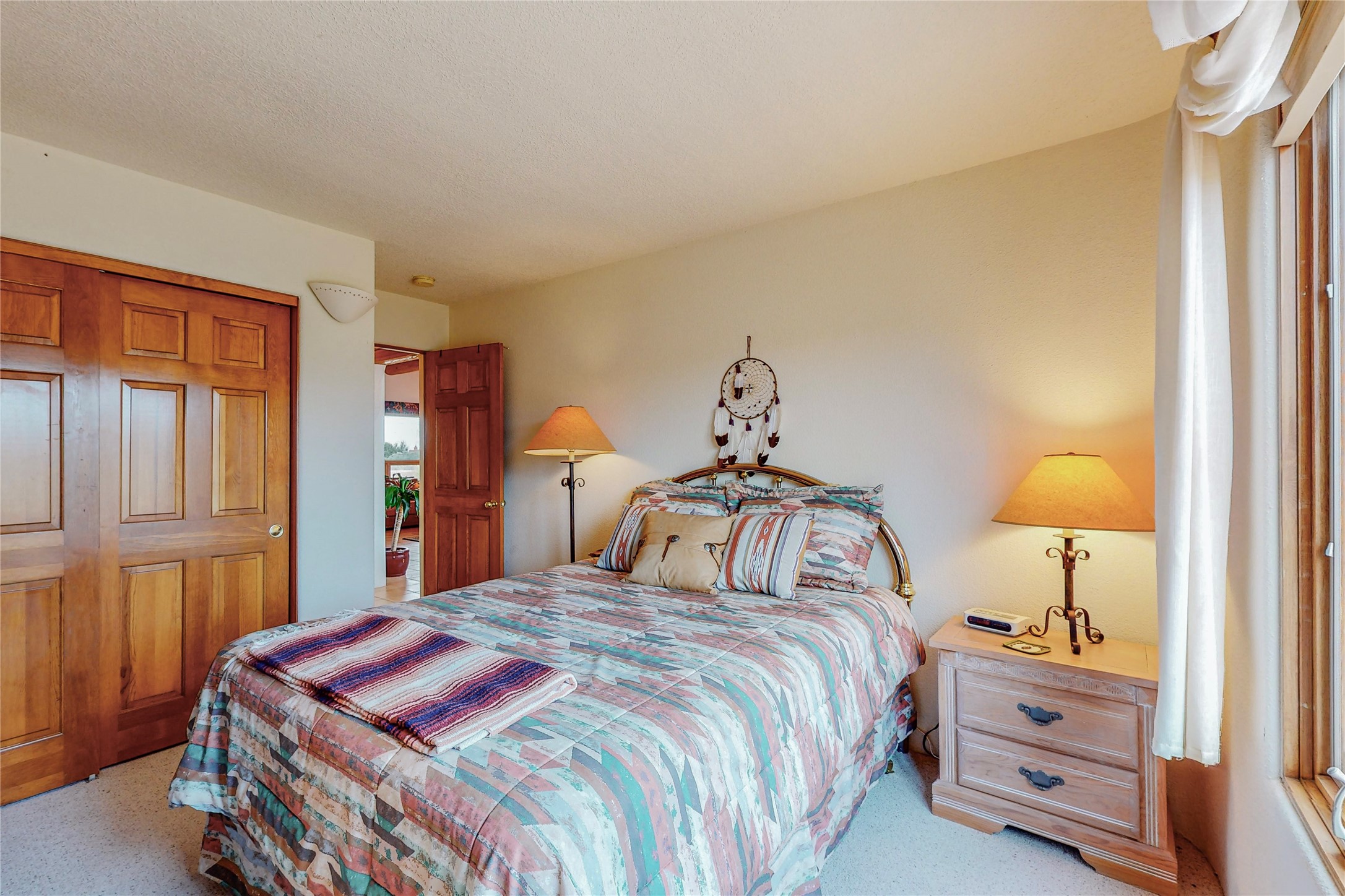 This lovely one owner home was carefully sited and built by Homes by Marie to access expansive mountain views. Lovely light and spacious open plan contemporary pueblo design. The split 3 bedroom design has been enlarged to add a den on one side and an exquisite expansive main bedroom suite with a spa like bathroom and large walk in closet on the other. 3 mini-splits have been added for summer cool, natural gas radiant heating in the original home and gas forced air in the newer wing. A large portal for summer sunset dining overlooking a privately walled garden and an easterly front view portal for early coffee or breakfast. This home is ideally located close to the Eldorado Community Center and amenities, 2 local shopping centers, a school, library and senior center. It is on a paved road close to the exits making it an easy few minutes into Santa Fe or to the train station in historic Lamy village.