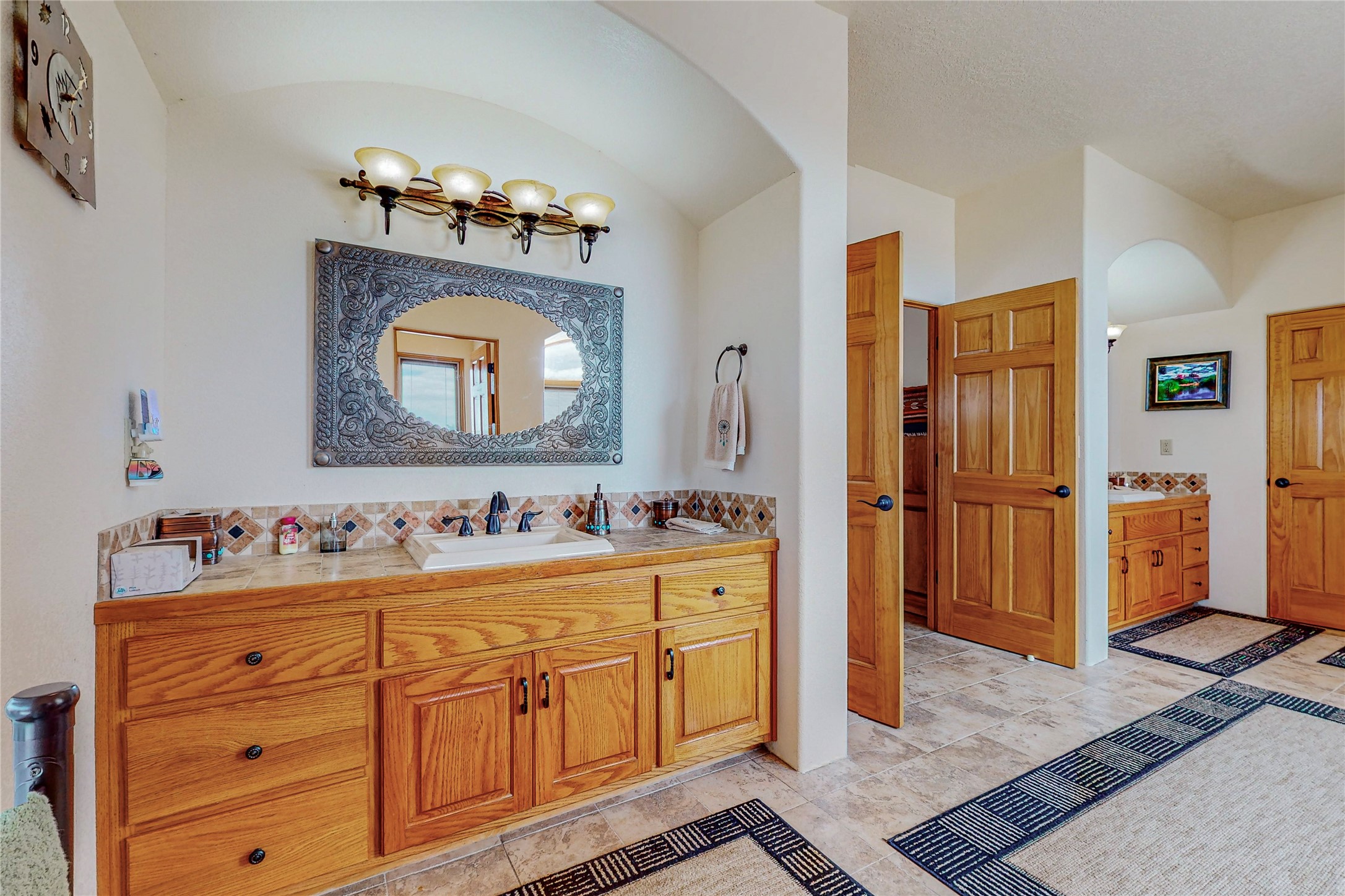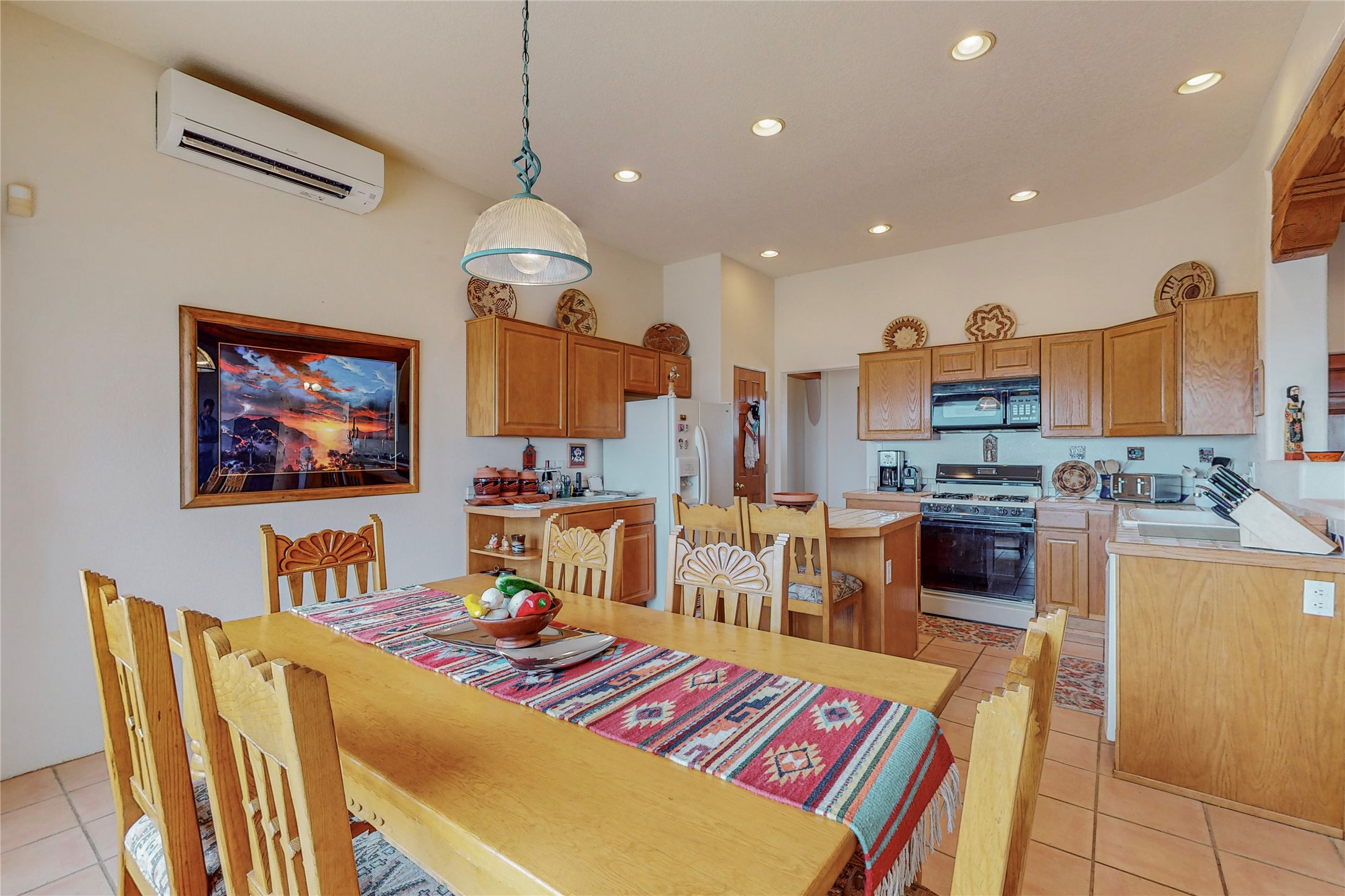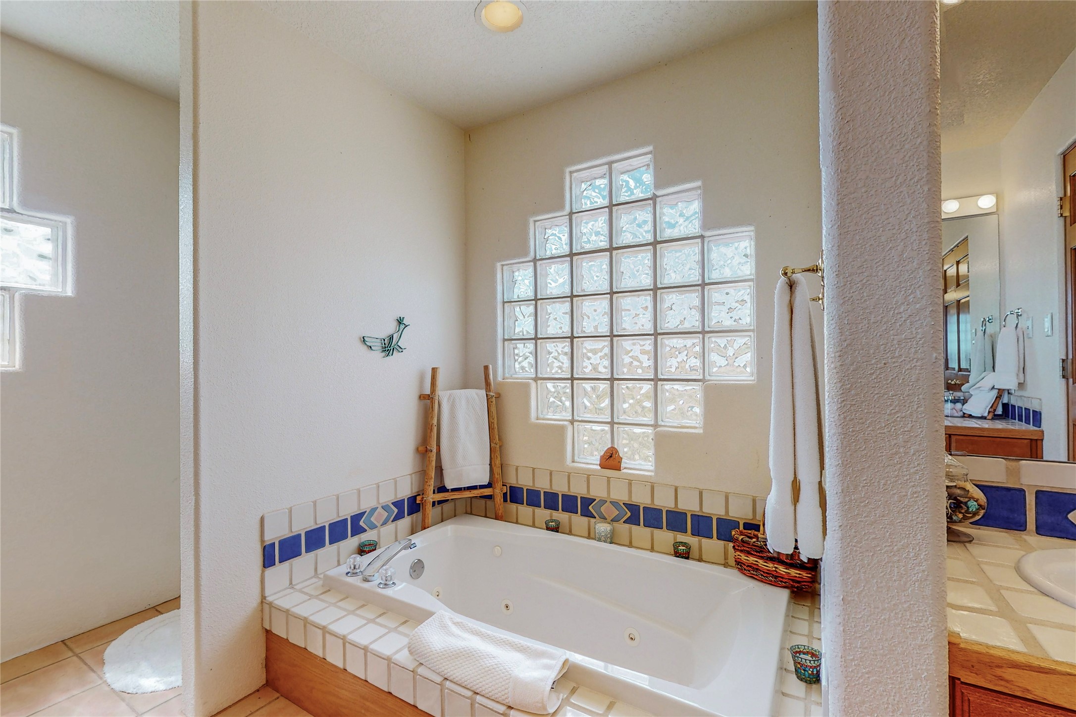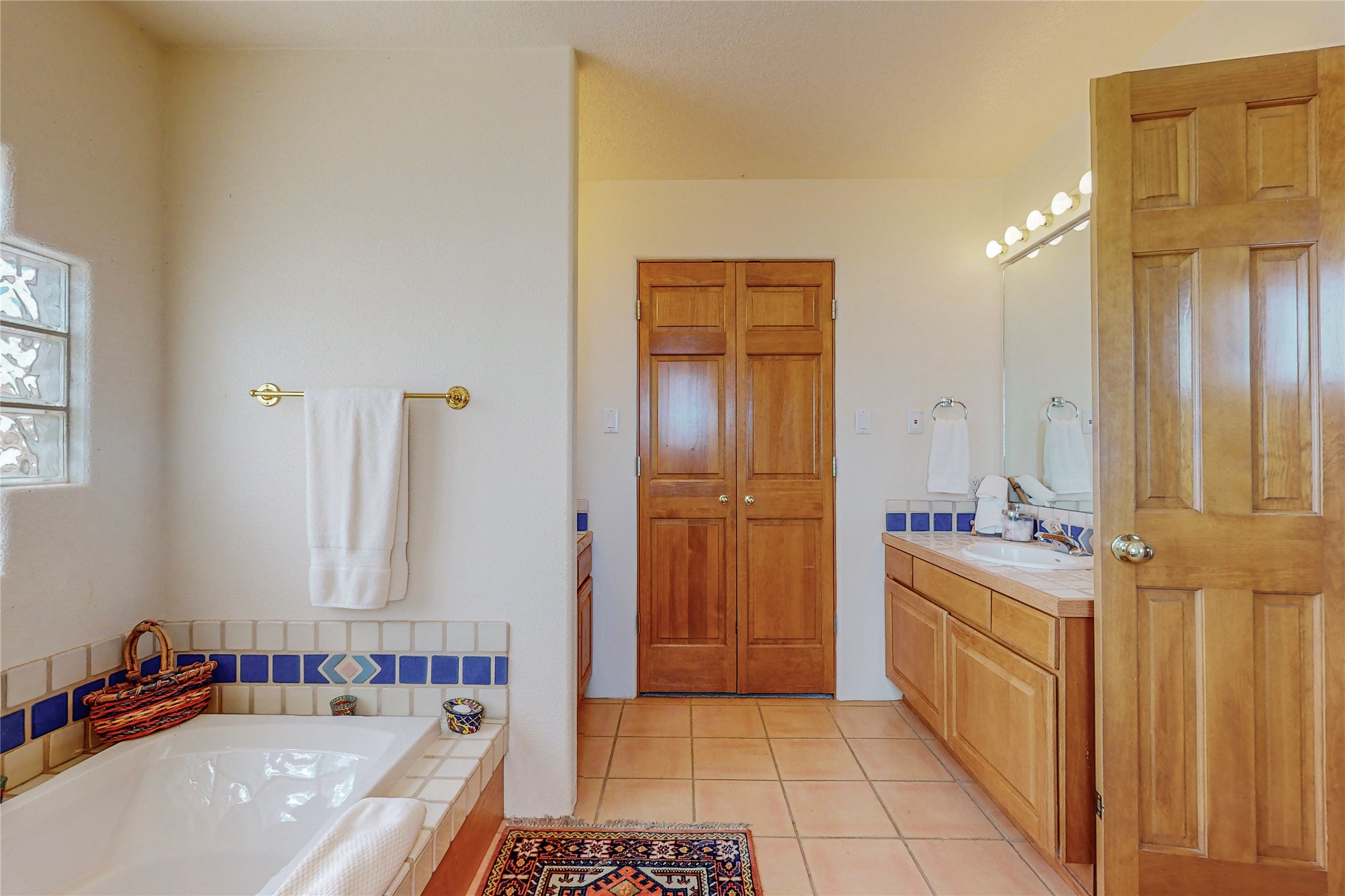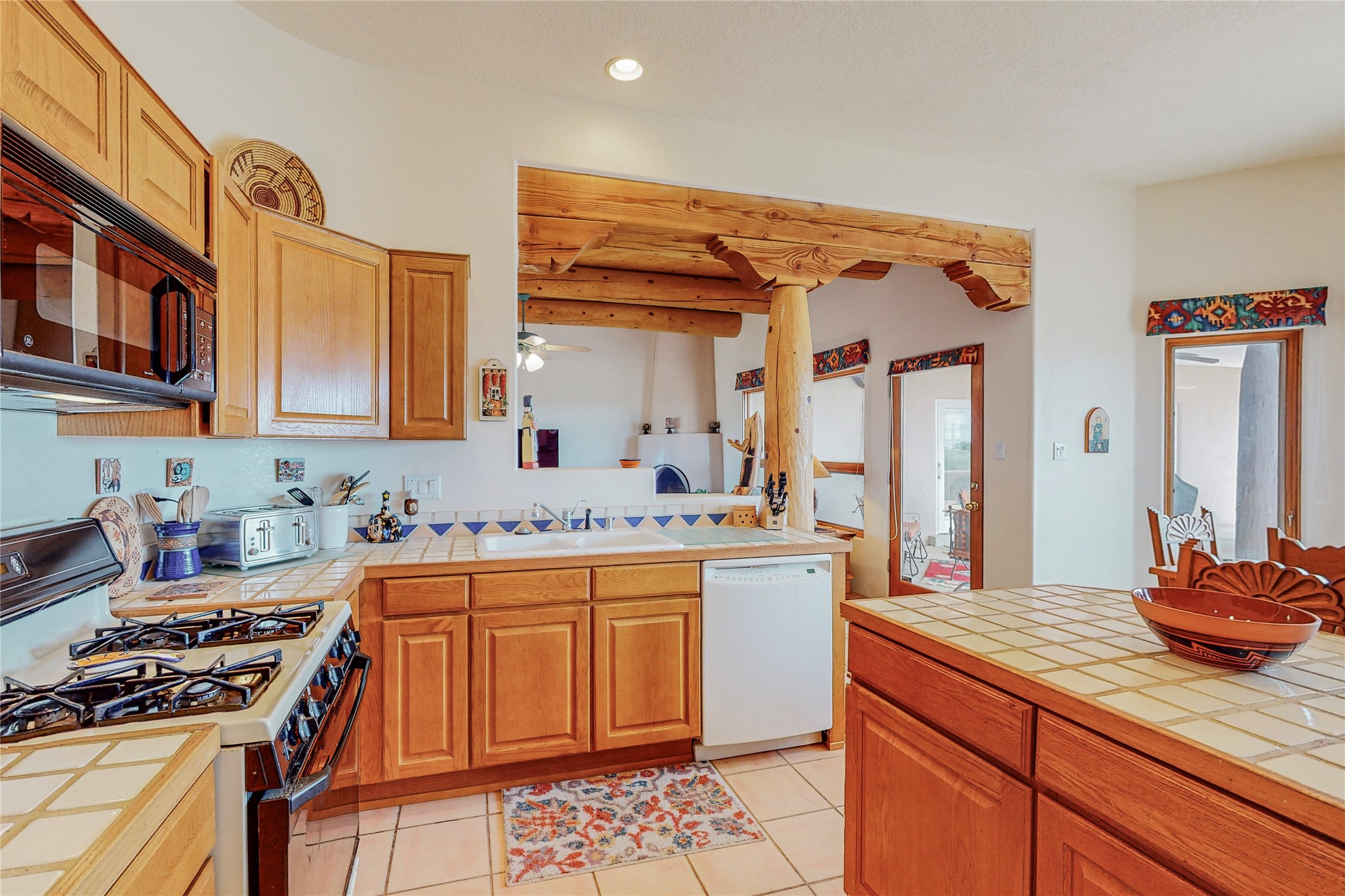 This lovely one owner home was carefully sited and built by Homes by Marie to access expansive mountain views. Lovely light and spacious open plan contemporary pueblo design. The split 3 bedroom design has been enlarged to add a den on one side and an exquisite expansive main bedroom suite with a spa like bathroom and large walk in closet on the other. 3 mini-splits have been added for summer cool, natural gas radiant heating in the original home and gas forced air in the newer wing. A large portal for summer sunset dining overlooking a privately walled garden and an easterly front view portal for early coffee or breakfast. This home is ideally located close to the Eldorado Community Center and amenities, 2 local shopping centers, a school, library and senior center. It is on a paved road close to the exits making it an easy few minutes into Santa Fe or to the train station in historic Lamy village.